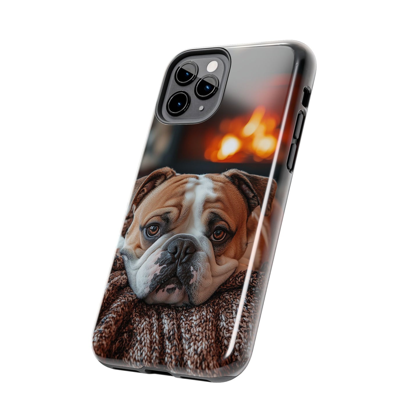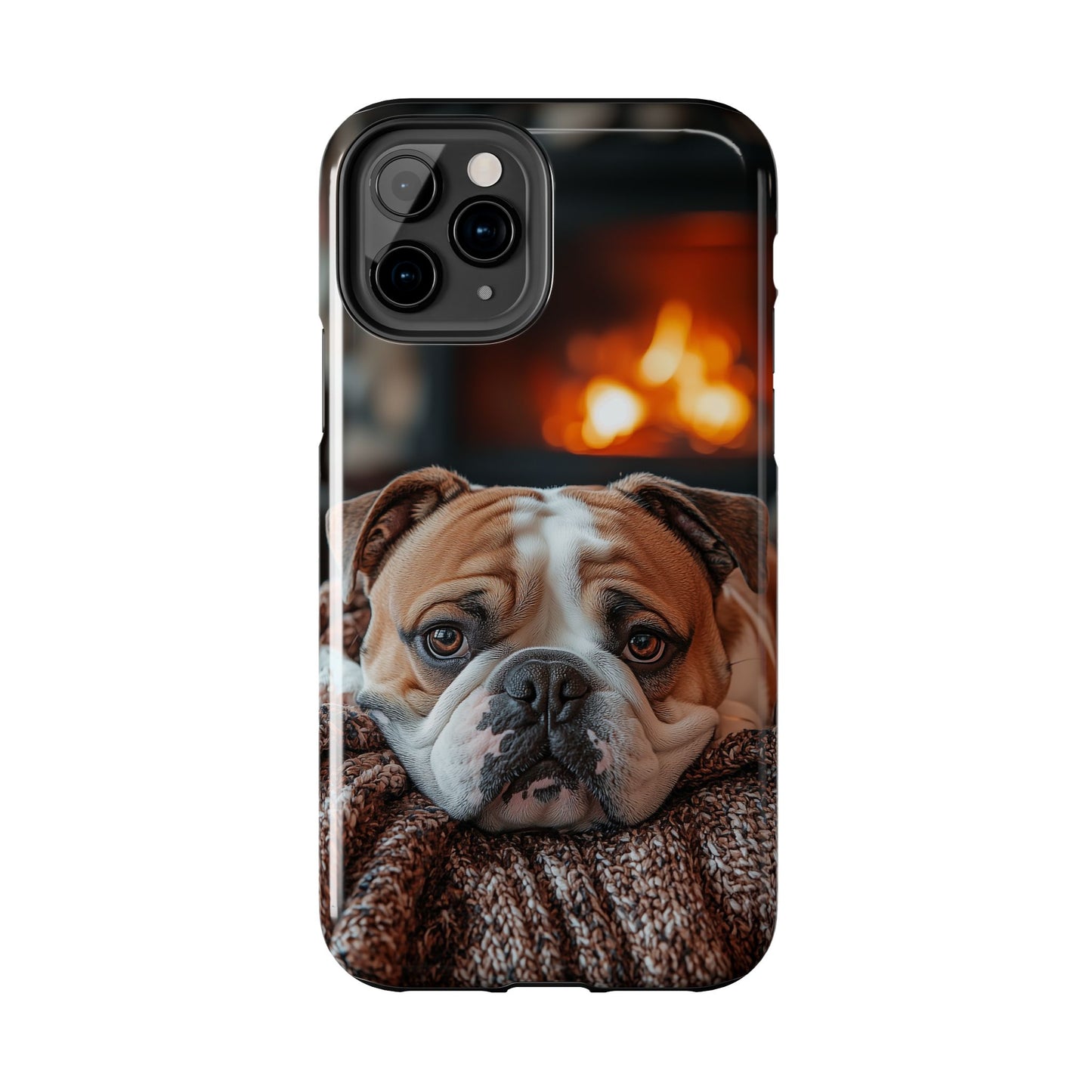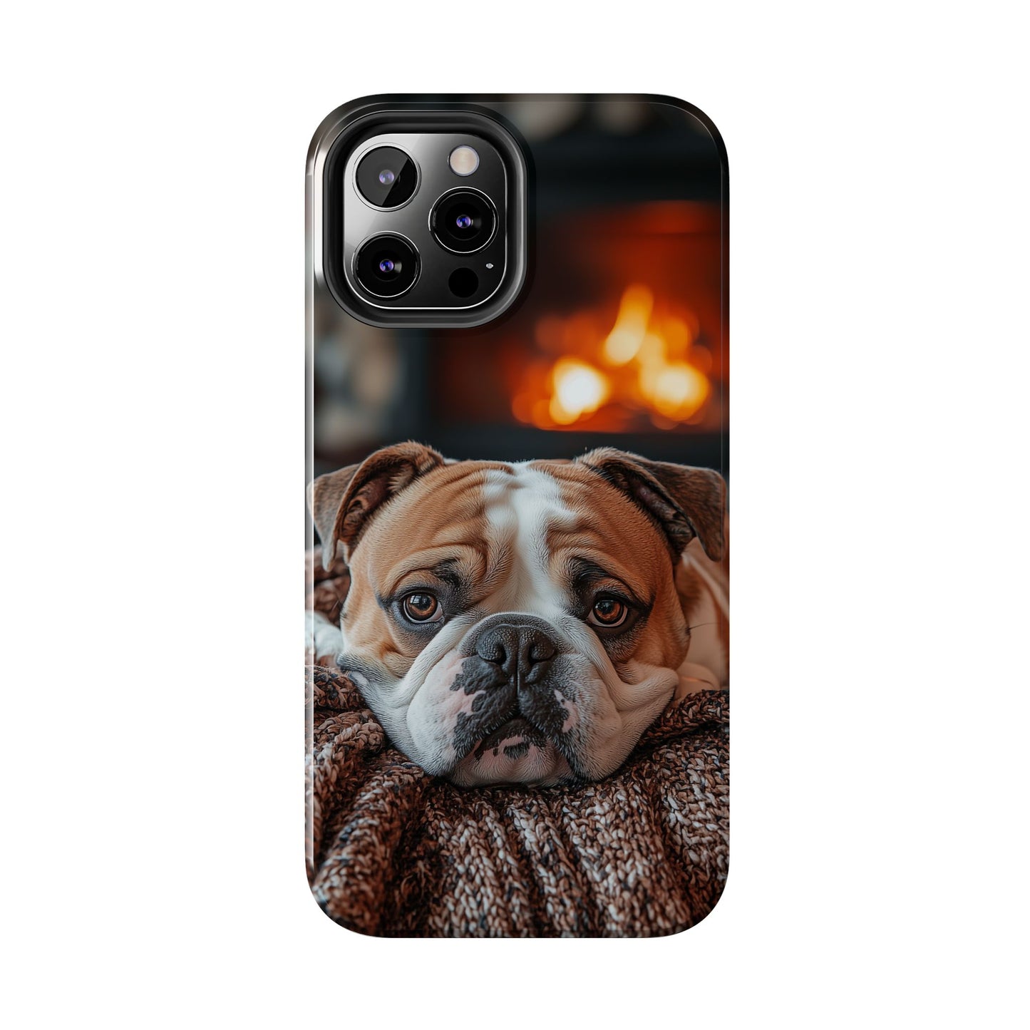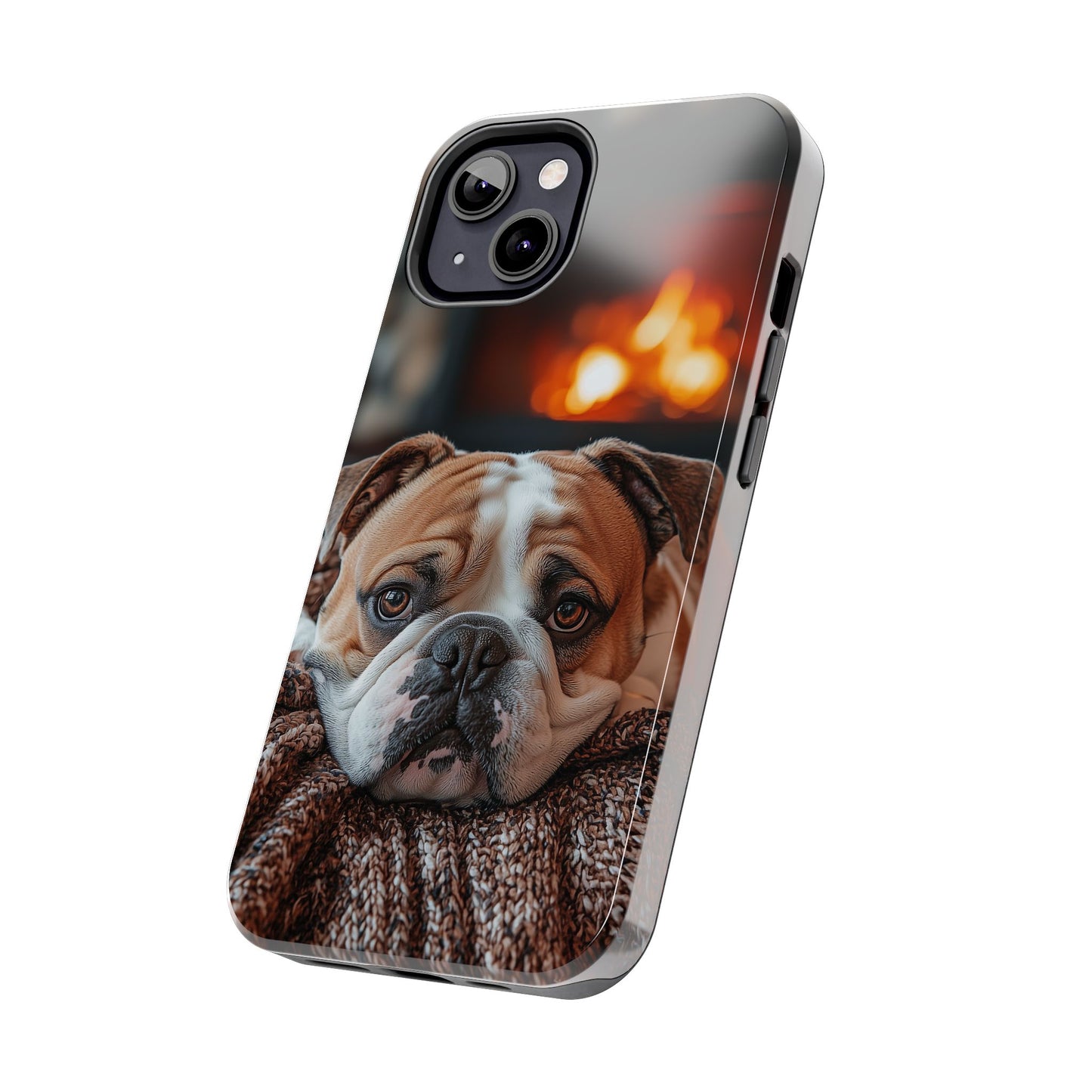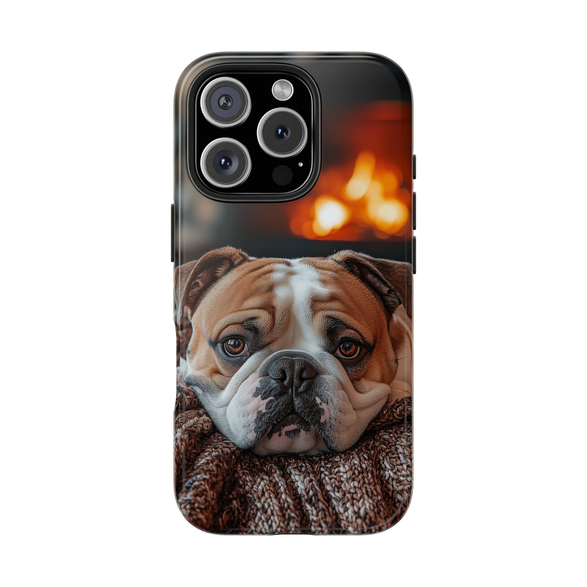 Cozy Bulldog iPhone Case – Fireside-Inspired Protective Cover Description: