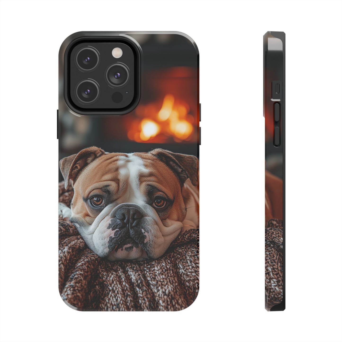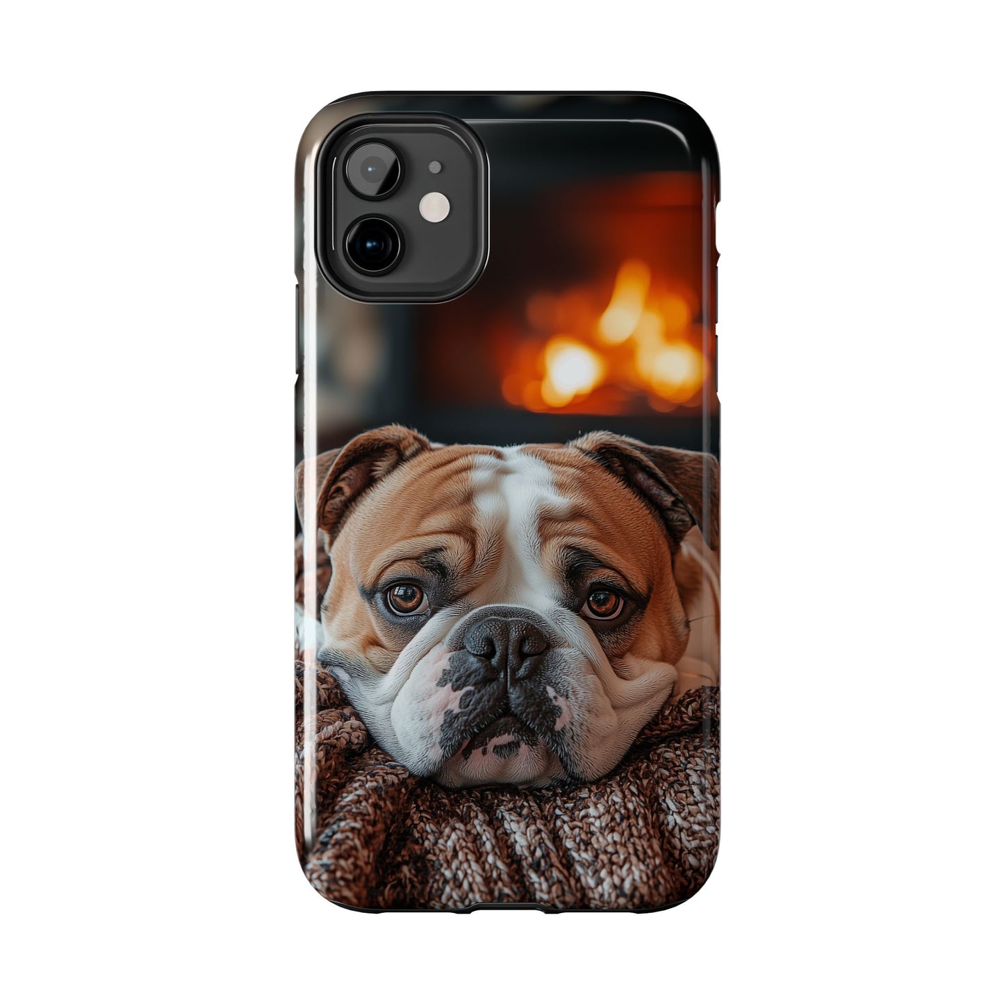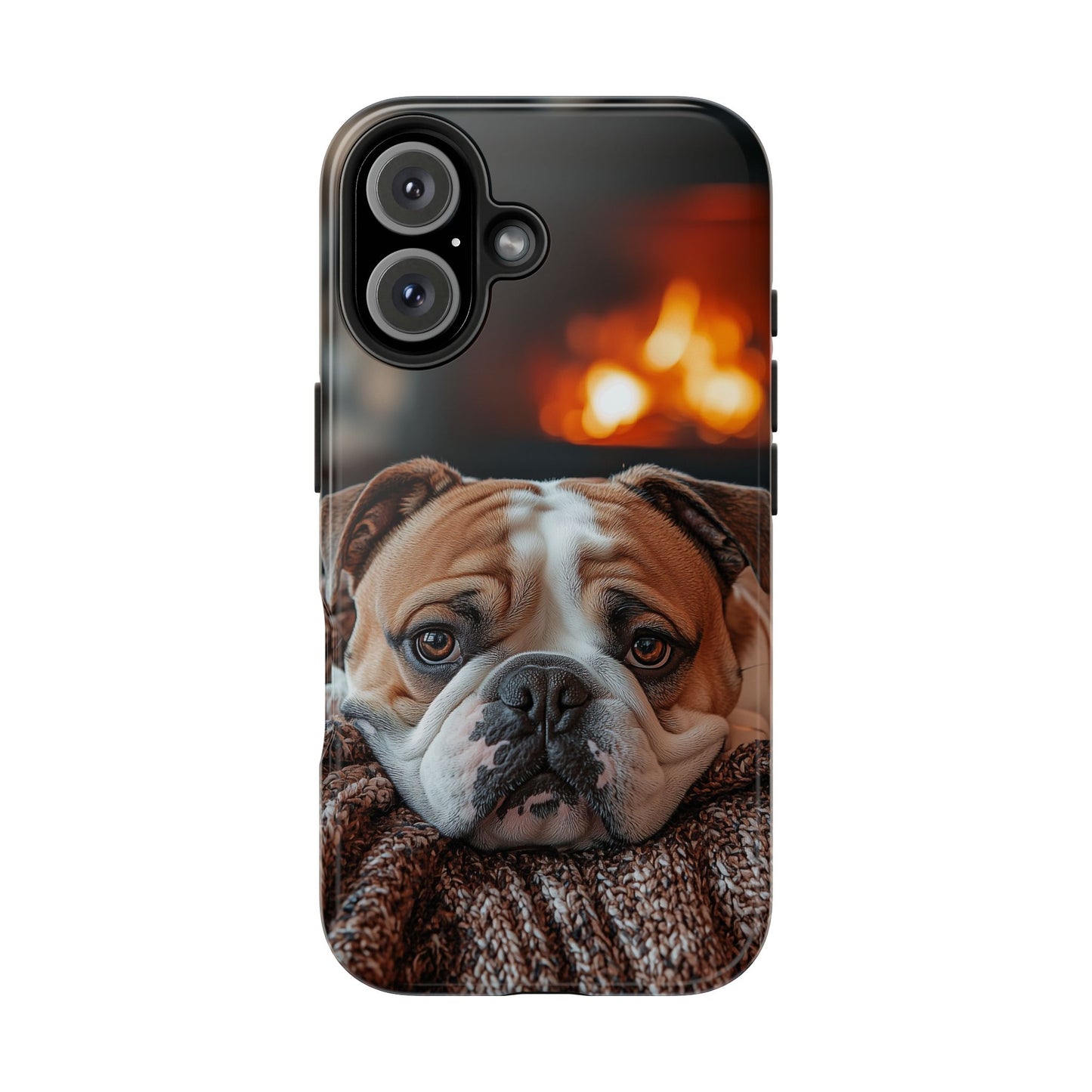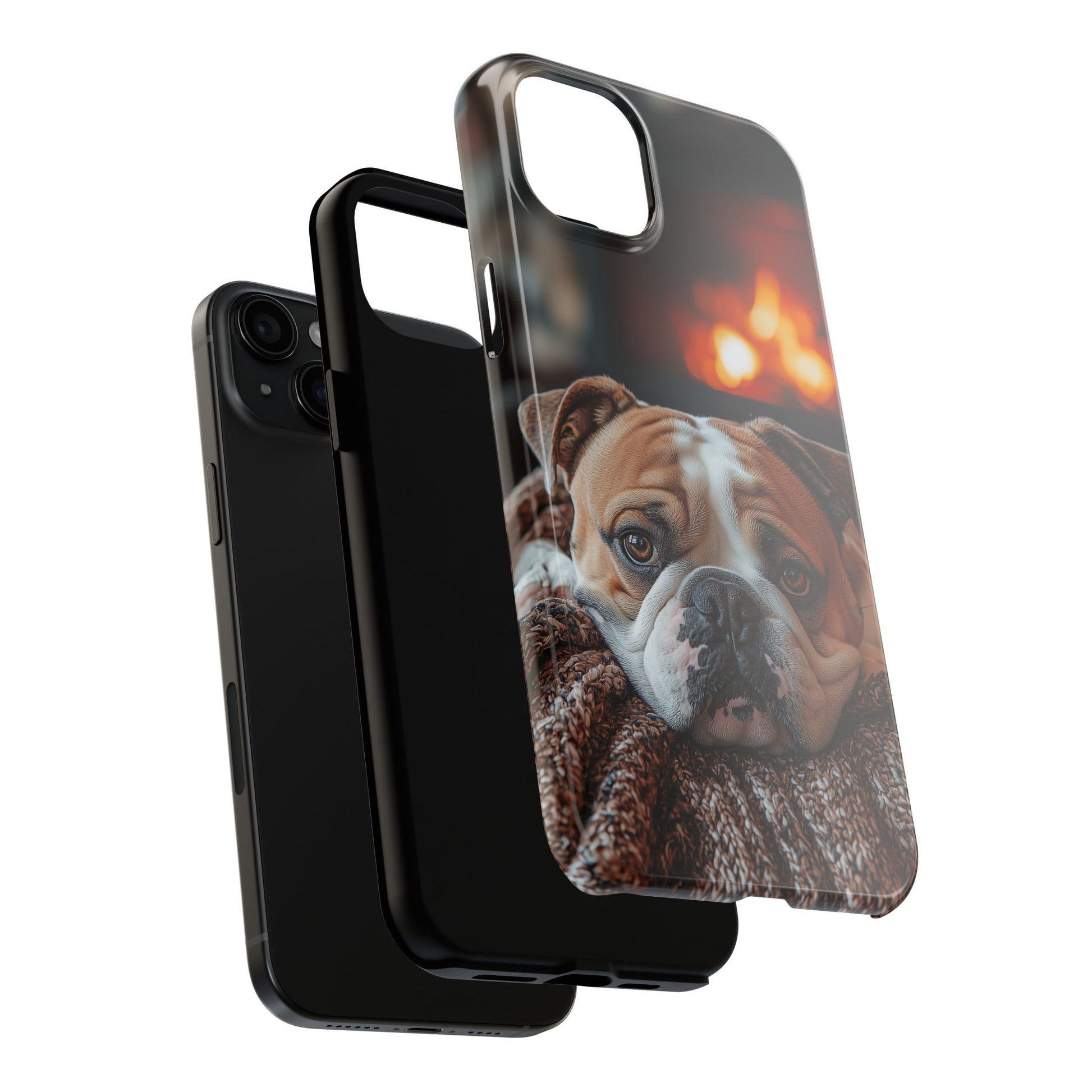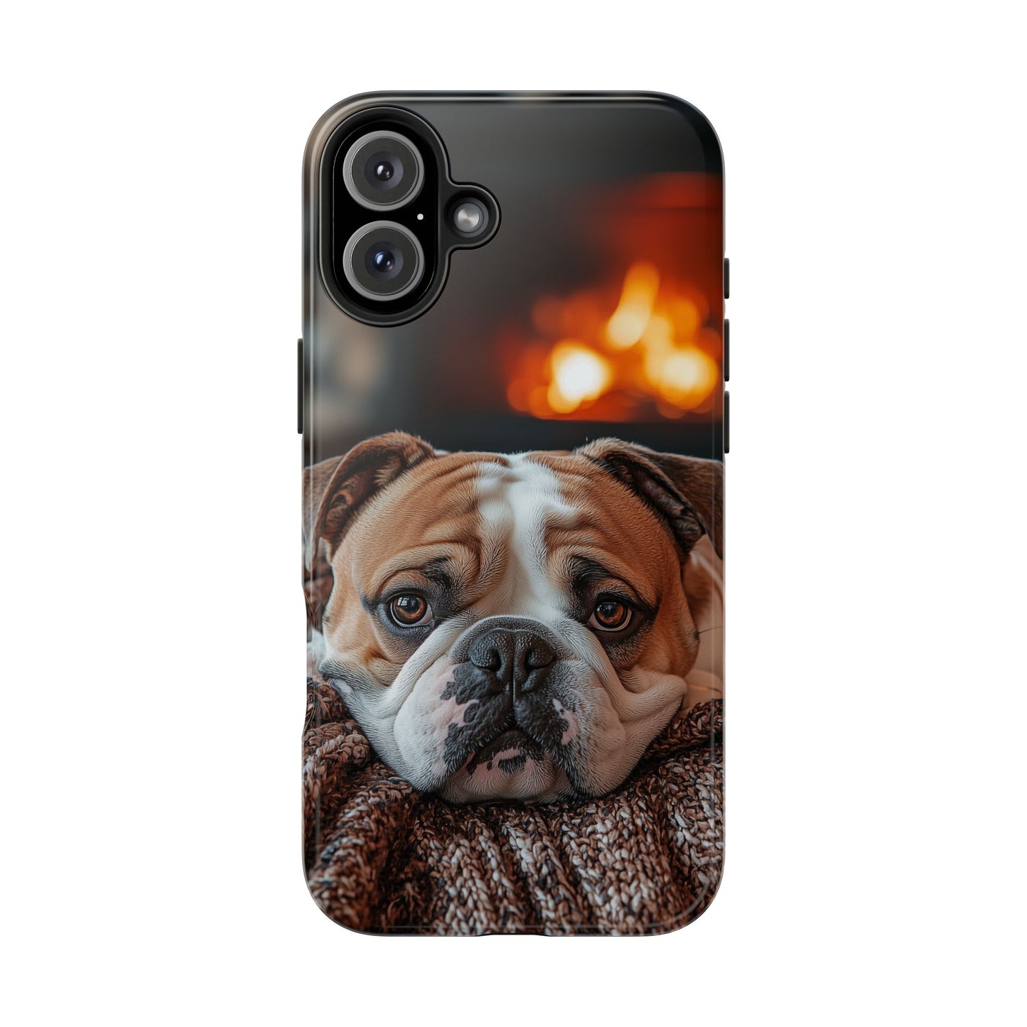 Cozy Bulldog iPhone Case – Fireside-Inspired Protective Cover Description:
