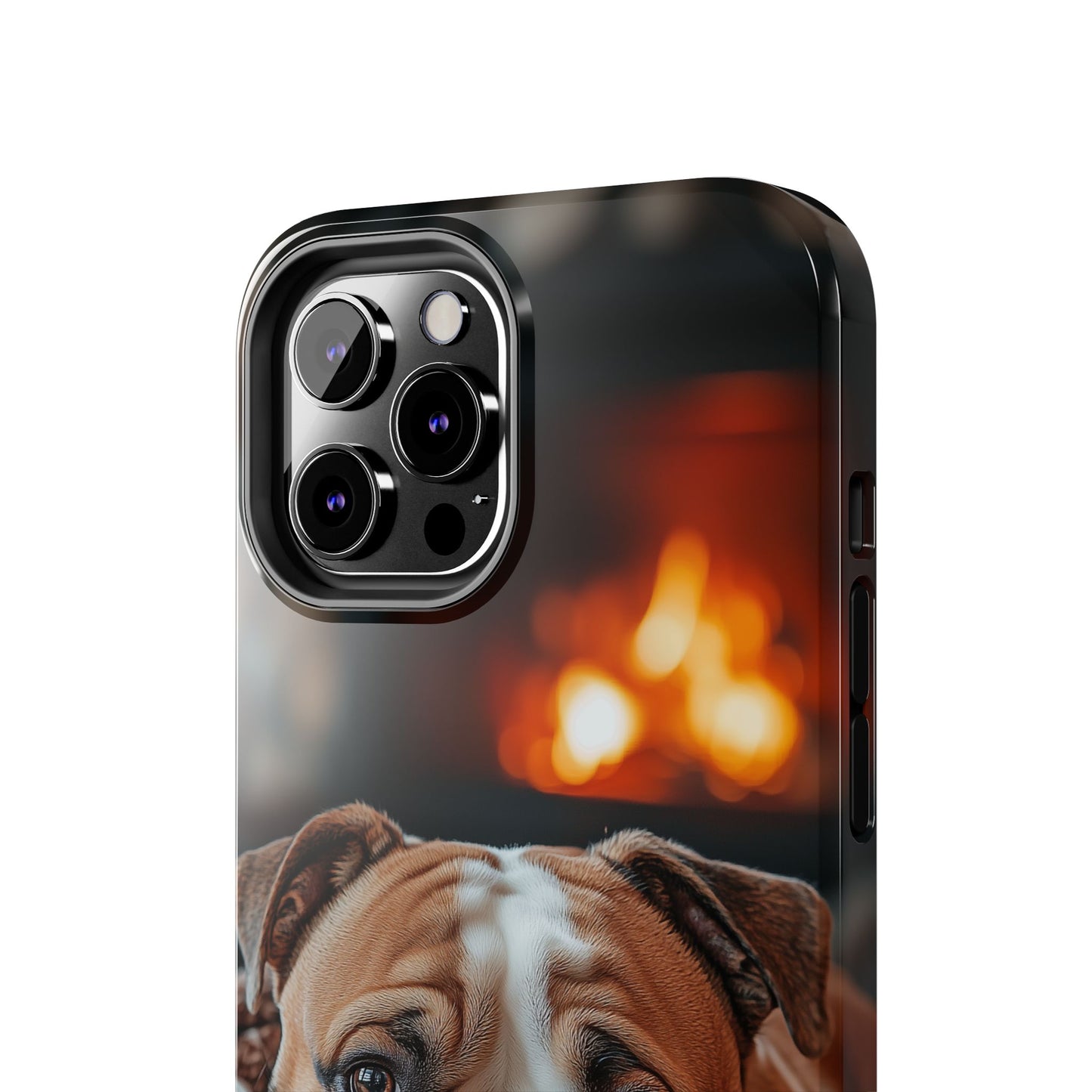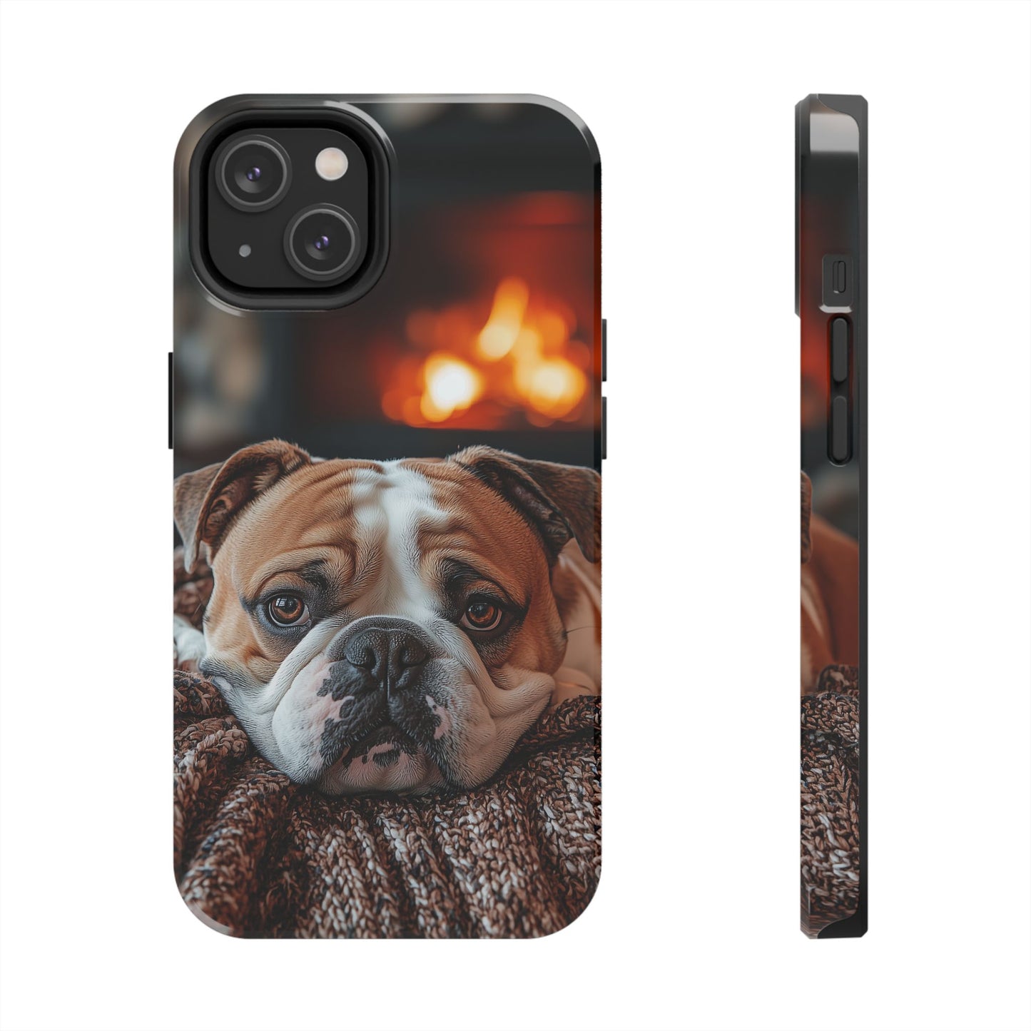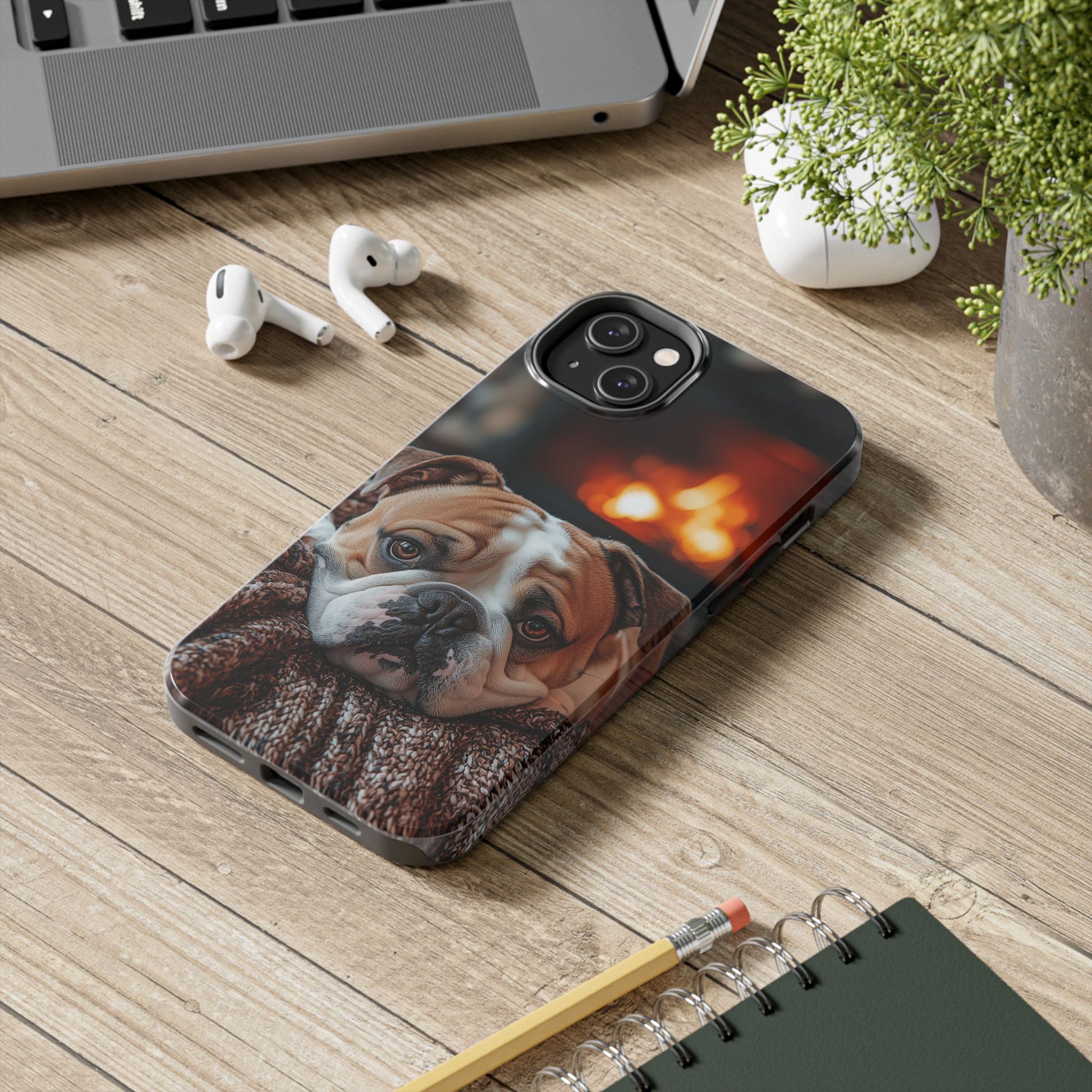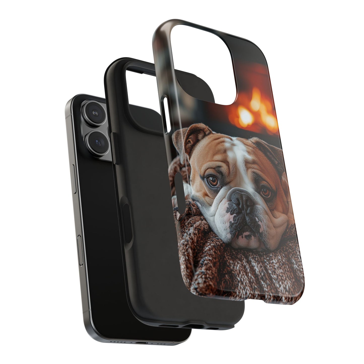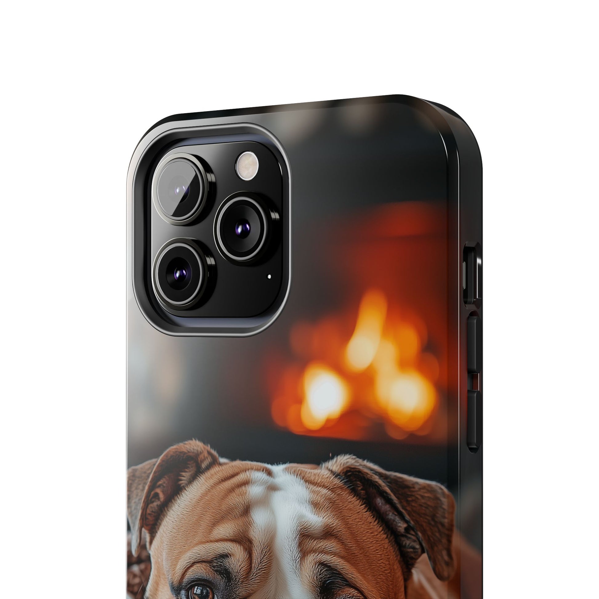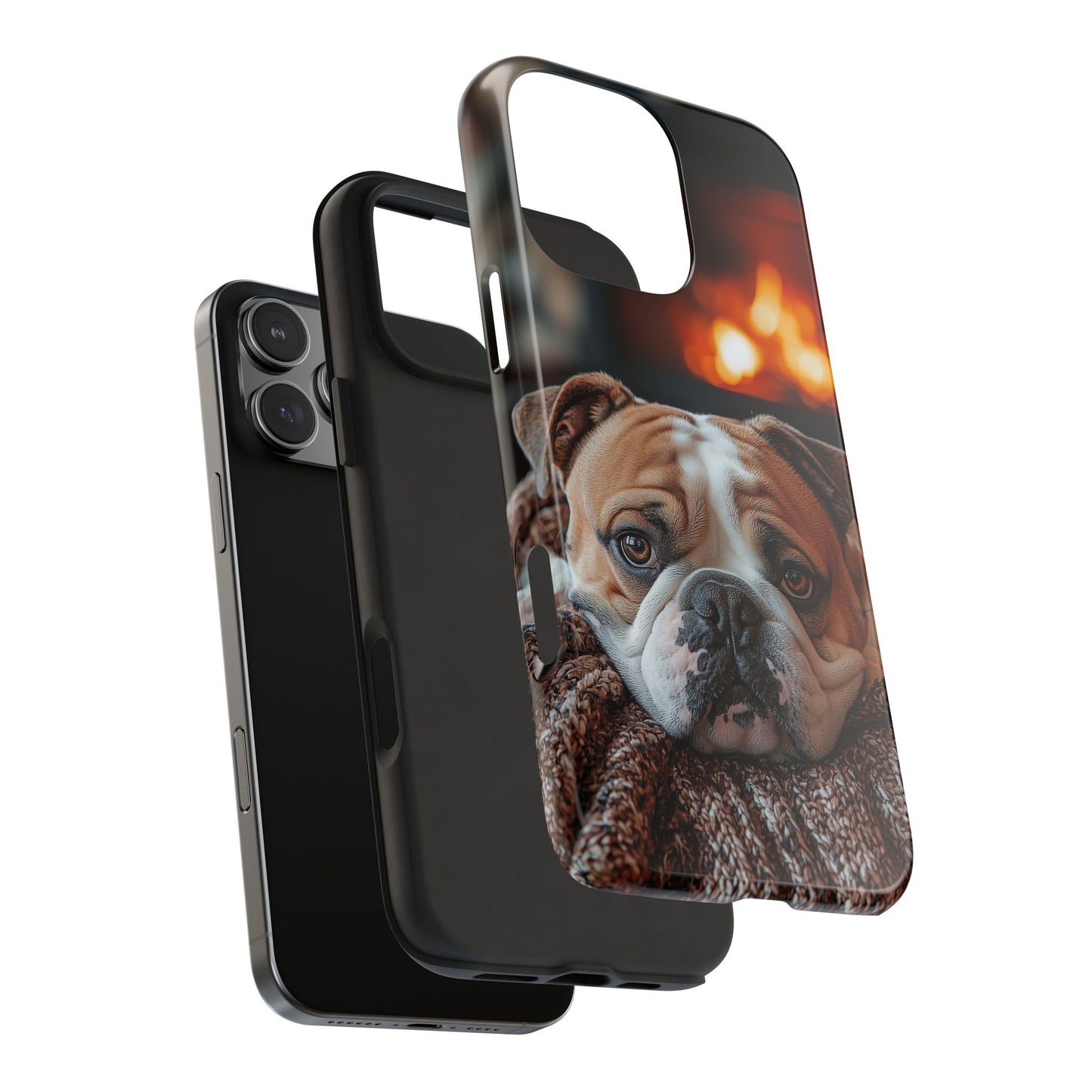 Cozy Bulldog iPhone Case – Fireside-Inspired Protective Cover Description:
