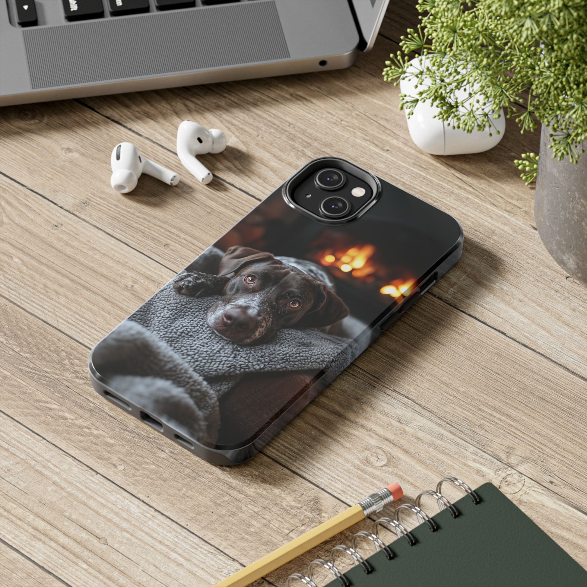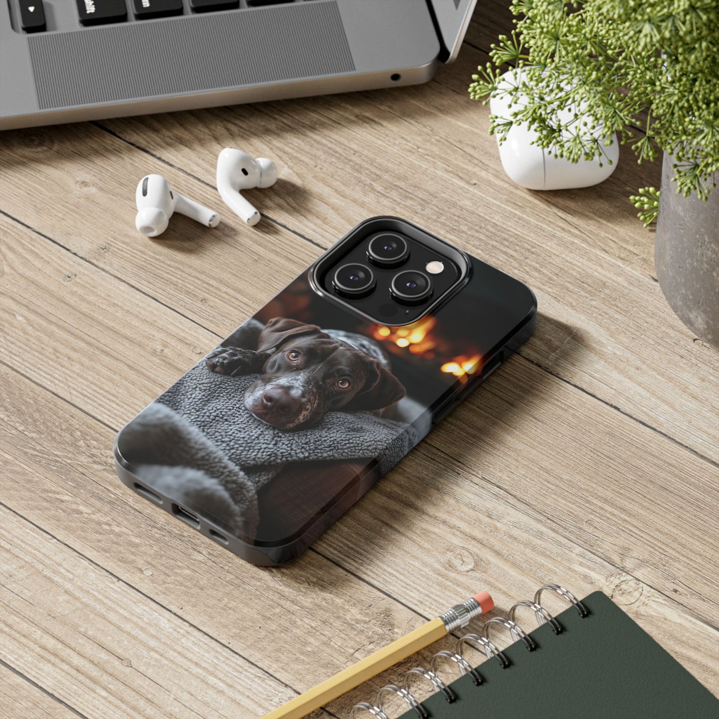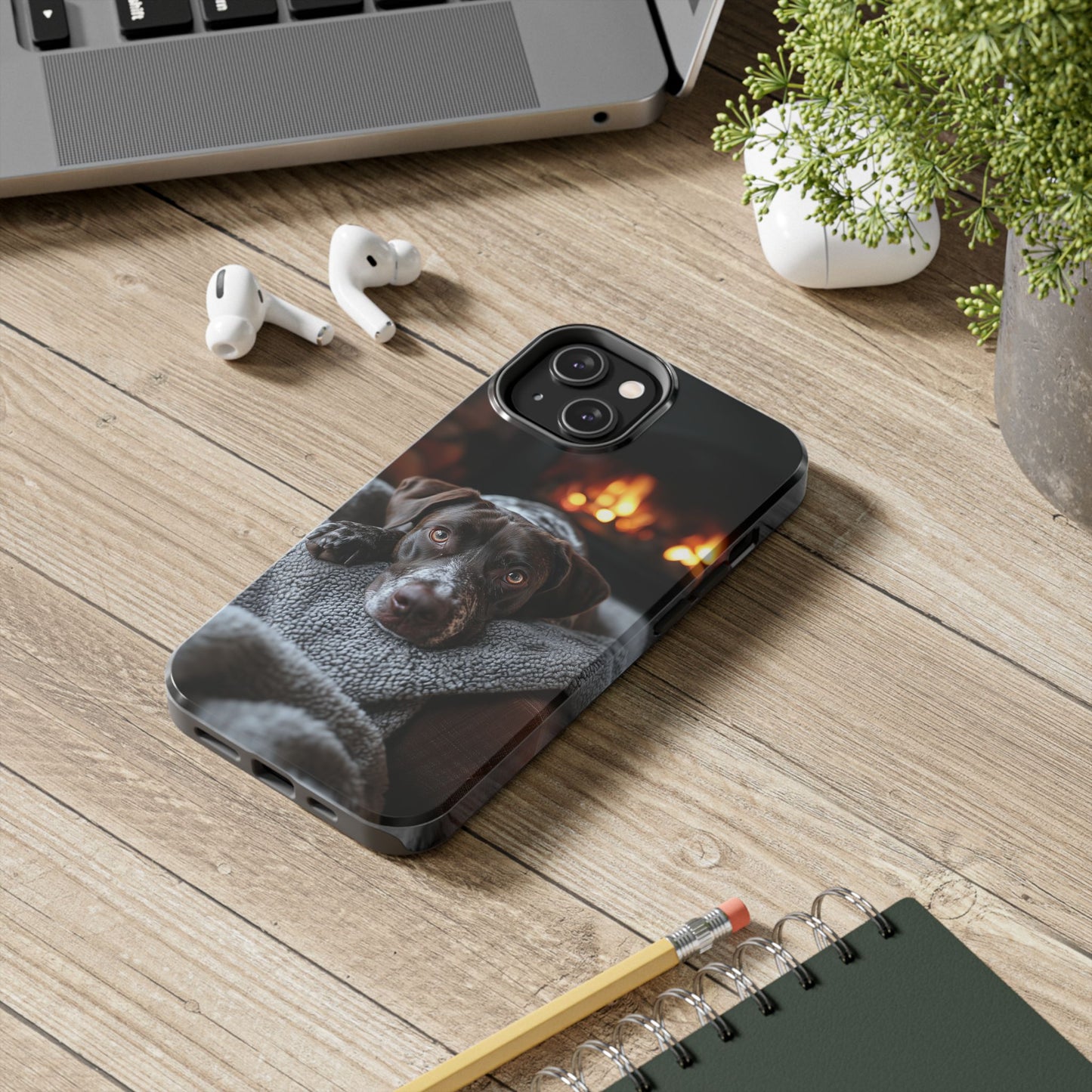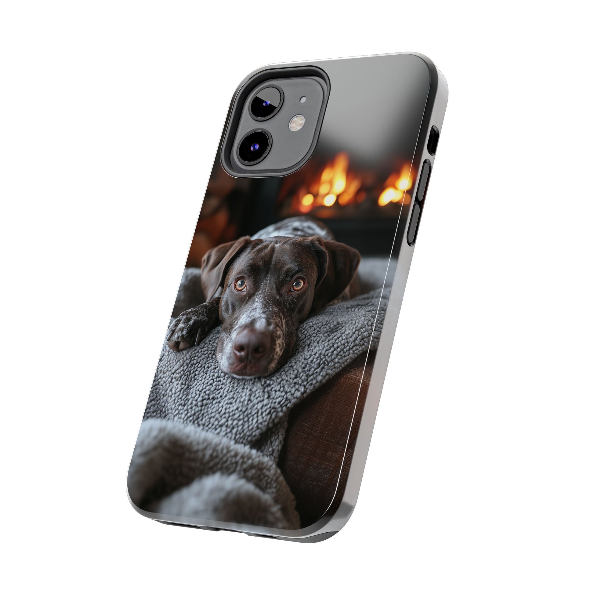 Wrap your iPhone in comfort with our Cozy German Shorthaired Pointer iPhone Case. Featuring a beautiful German Shorthaired Pointer lounging by a flickering fireplace on a soft, gray blanket, this case radiates calm and warmth. Perfect for dog lovers who treasure cozy moments, it’s a stylish an...