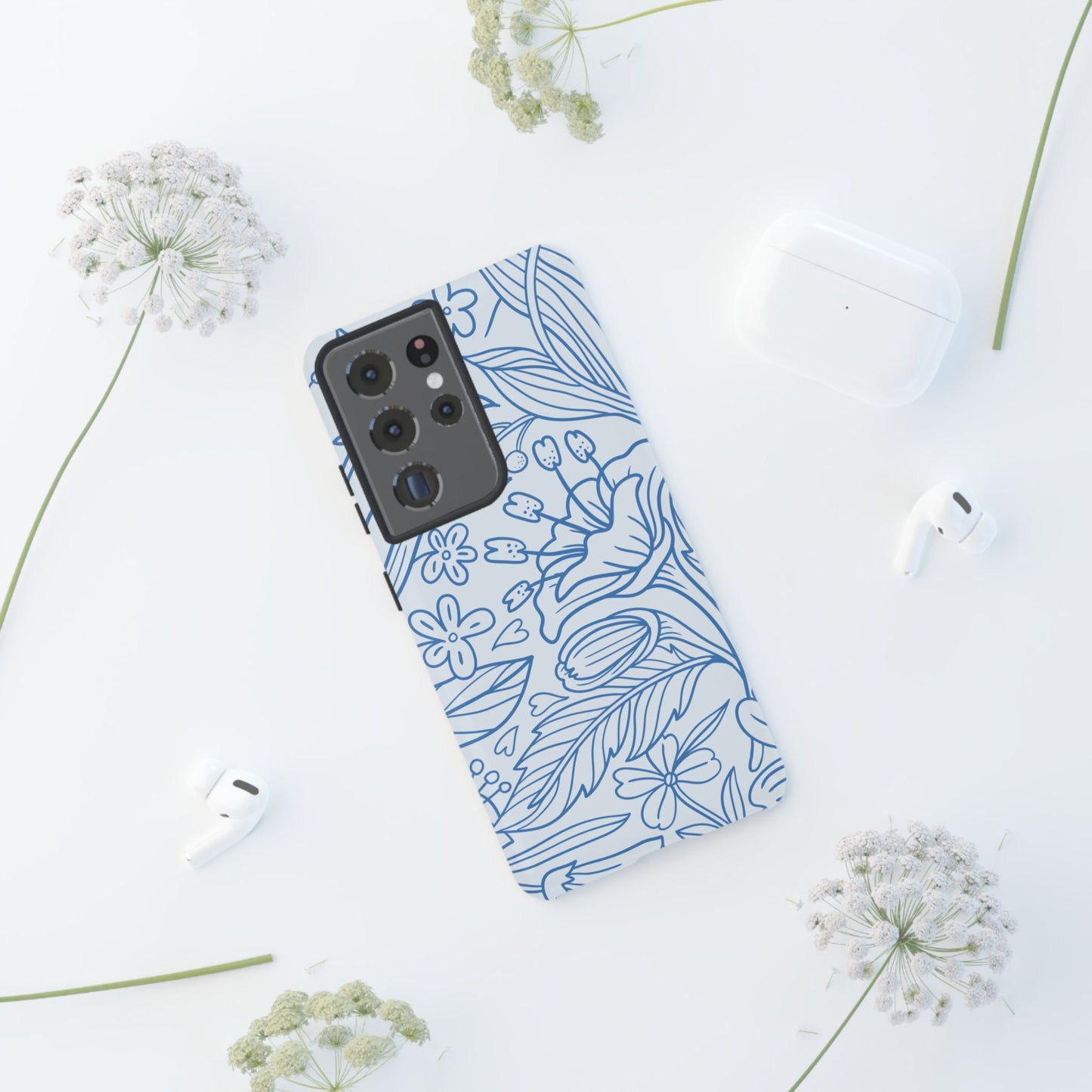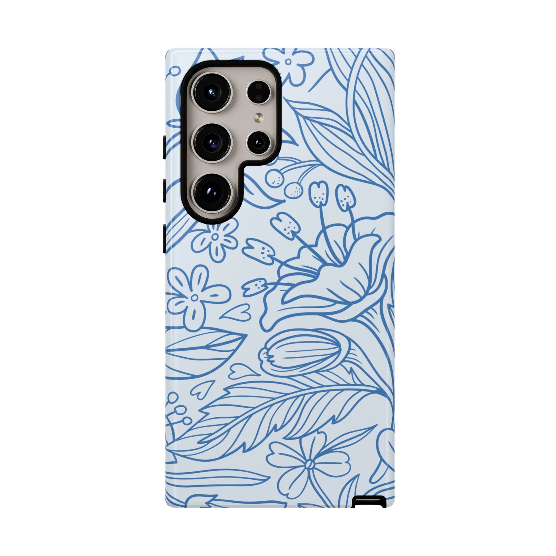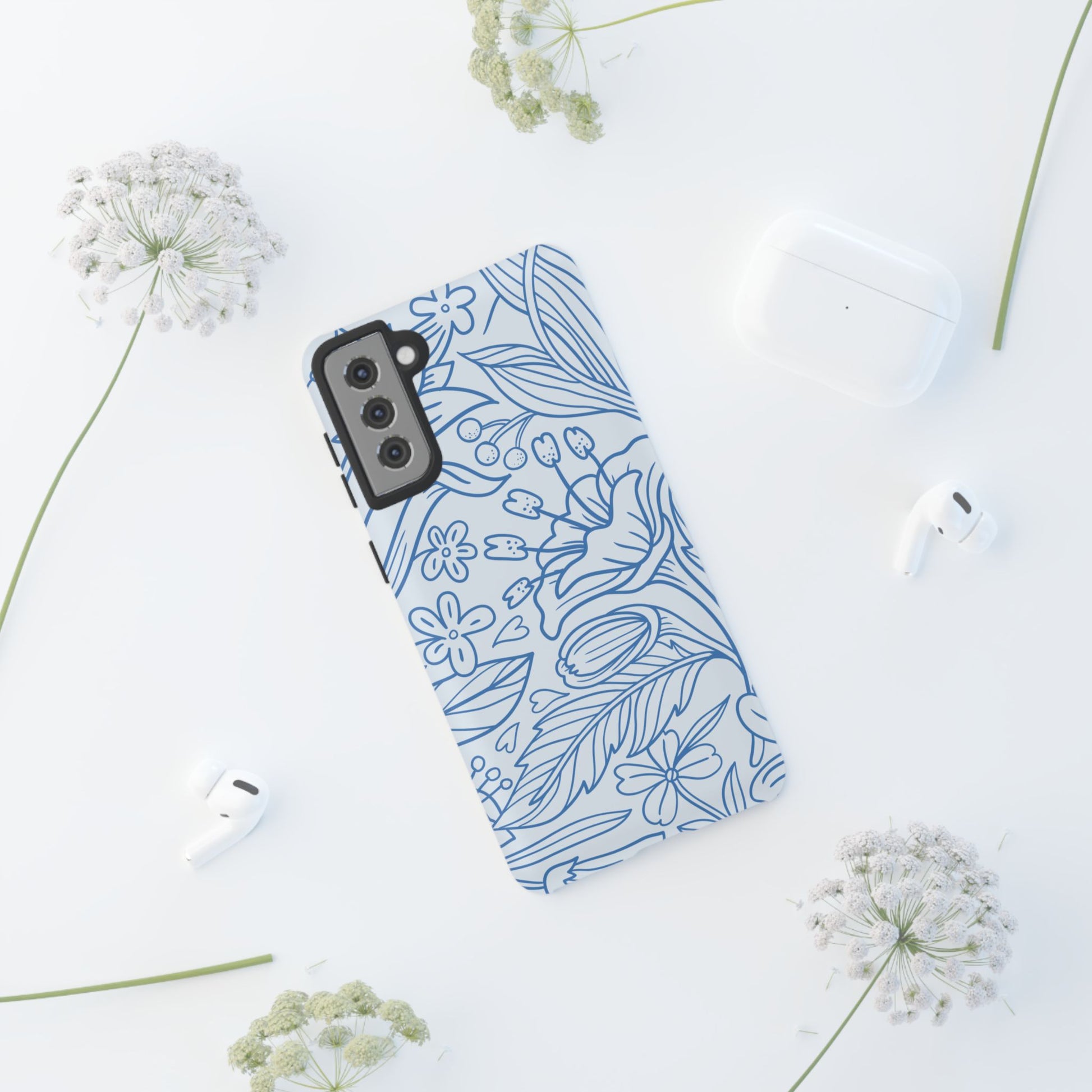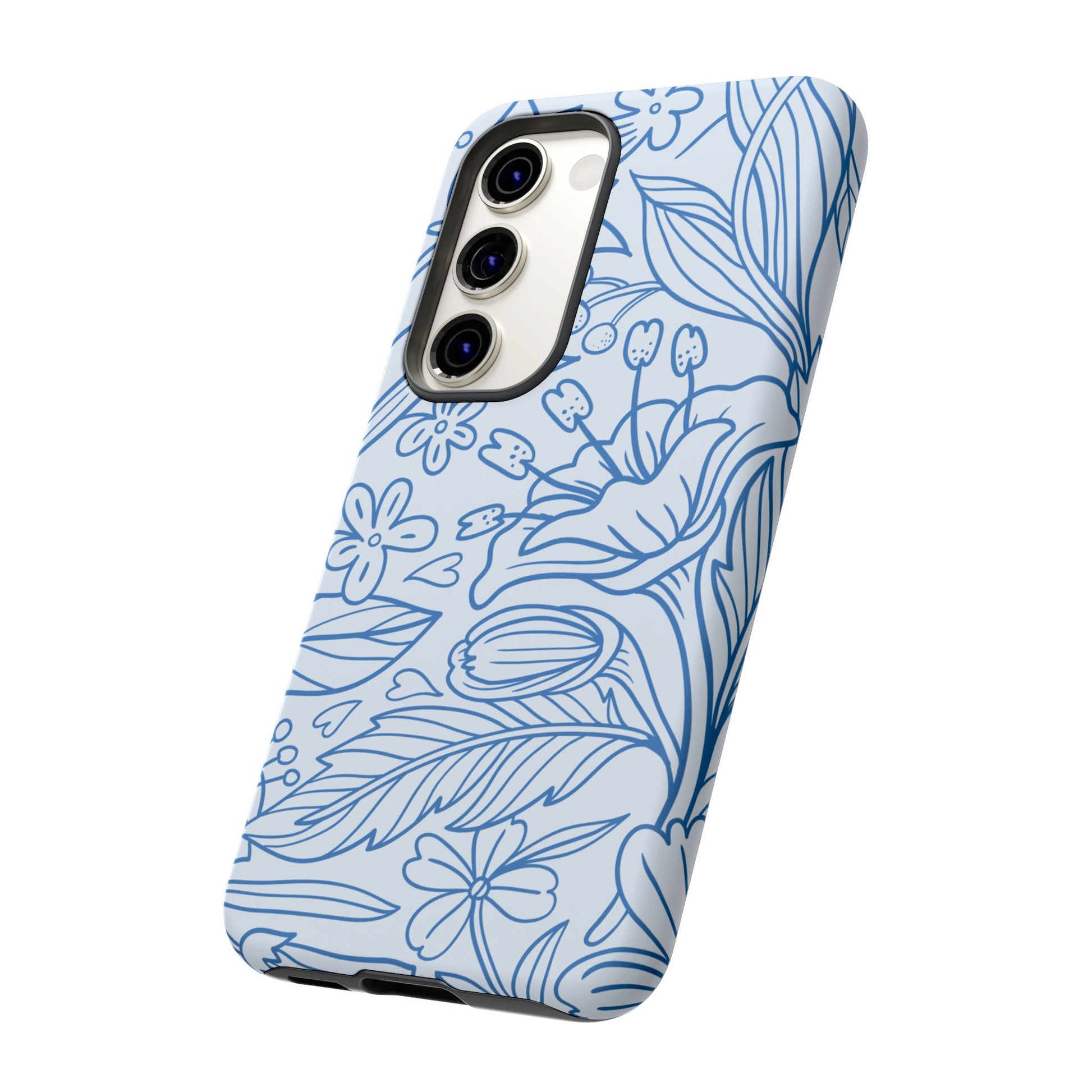 Dusty Blue Floral Line Art Tough Samsung Galaxy Case – Minimalist Botanical Design with Dual-Layer Protection
