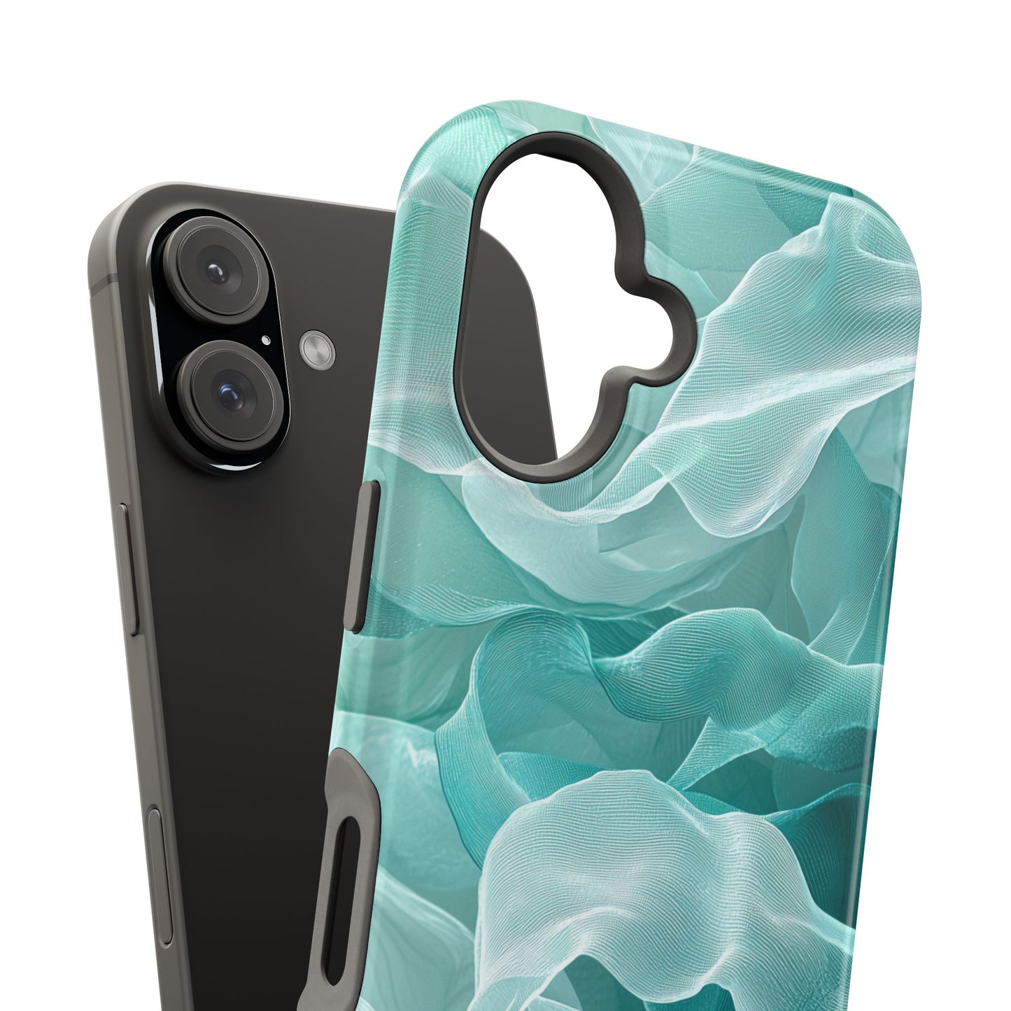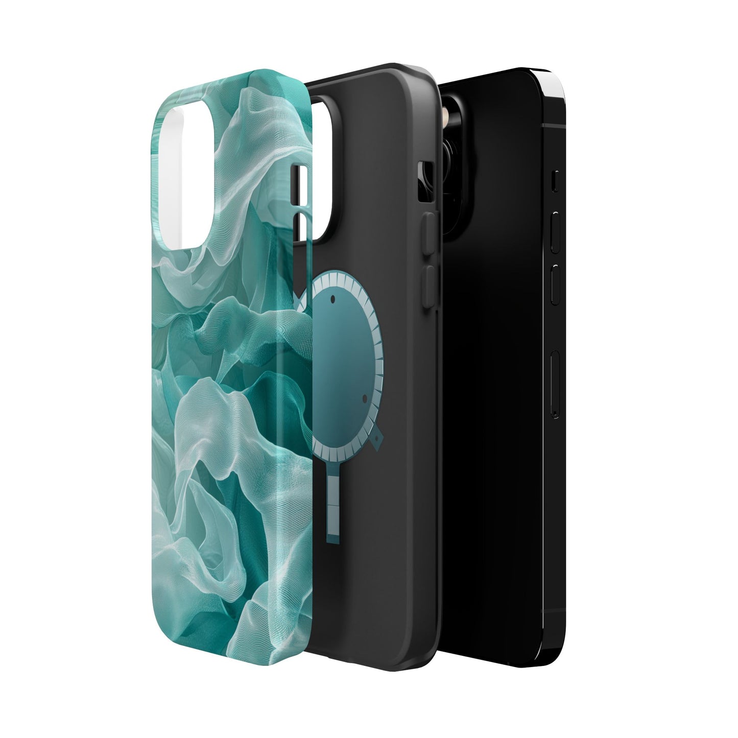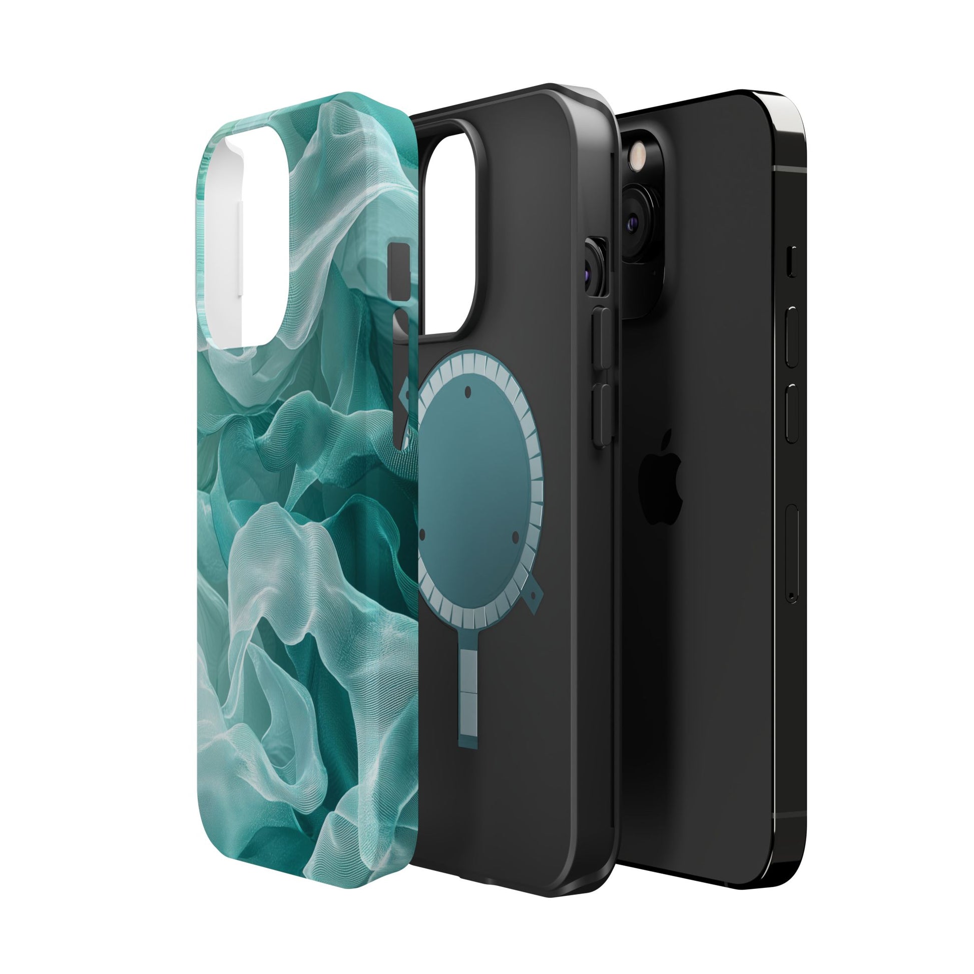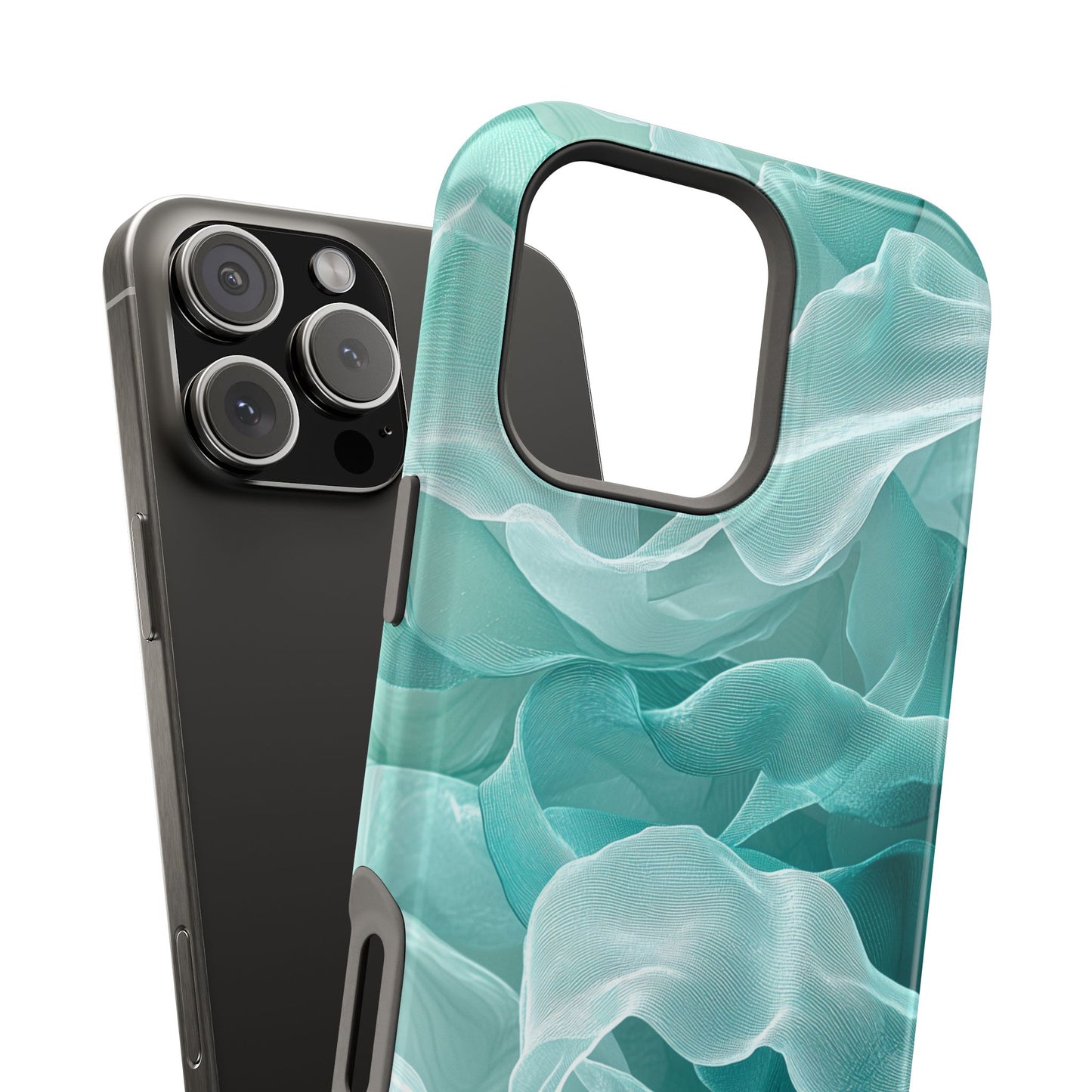 Enhance the elegance of your iPhone with this Elegant Flowing Teal Fabric MagSafe Case, featuring a mesmerizing design that captures the beauty of soft, flowing fabric waves. The graceful, translucent waves in shades of teal and white create a sophisticated, calming aesthetic for your device.