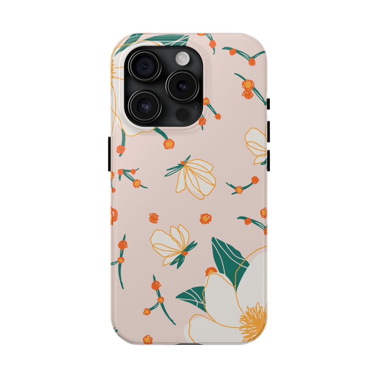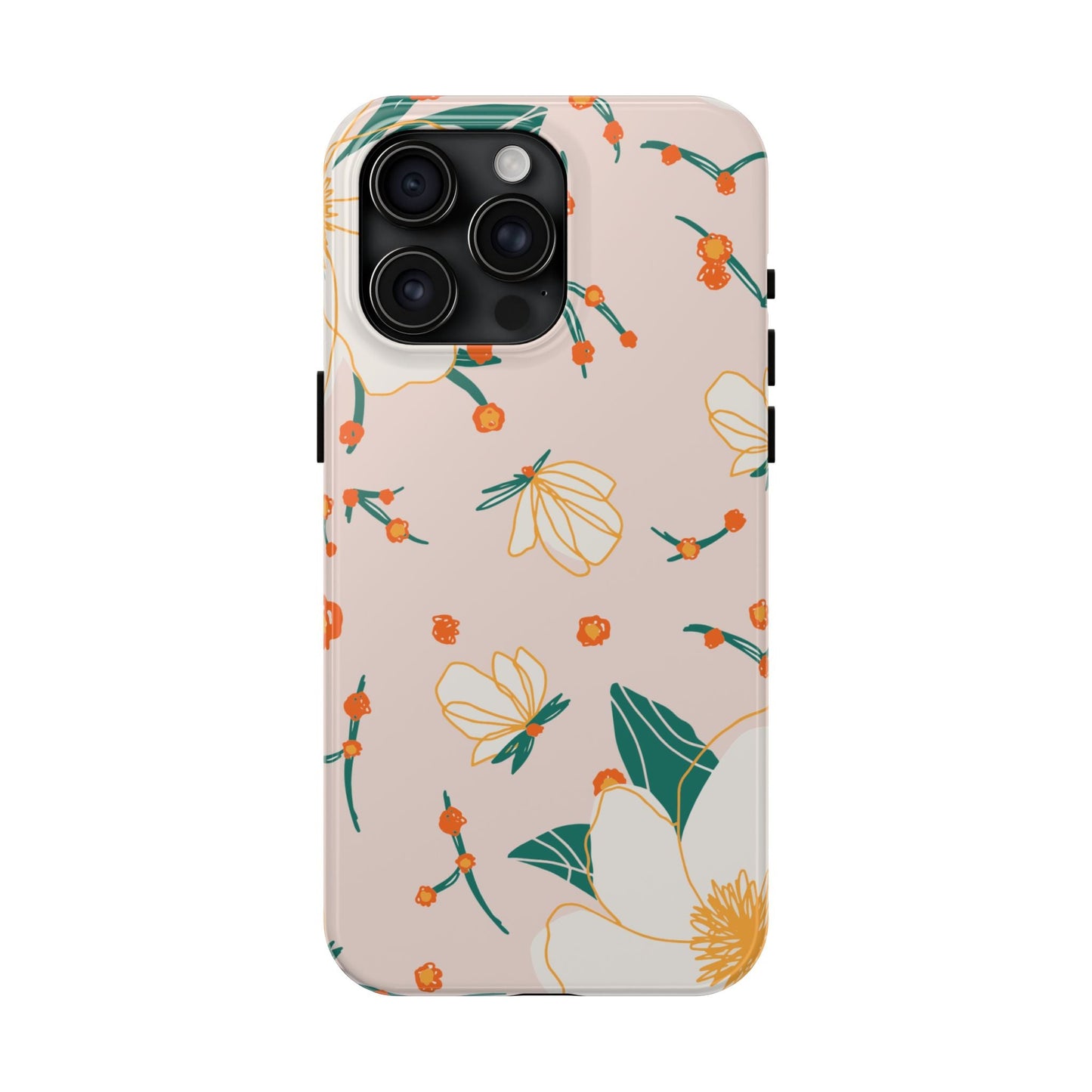 Bring a touch of nature’s beauty to your phone with our Elegant Magnolia Blossom Tough iPhone Case. Featuring a graceful floral design with large magnolia blooms in soft cream and gold, complemented by delicate orange accents on a blush pink background, this case adds an elegant, feminine cha...