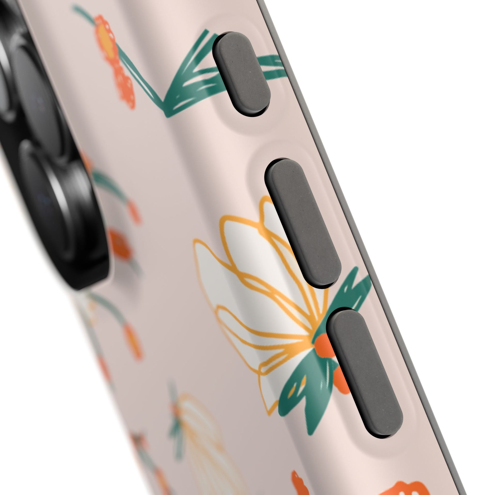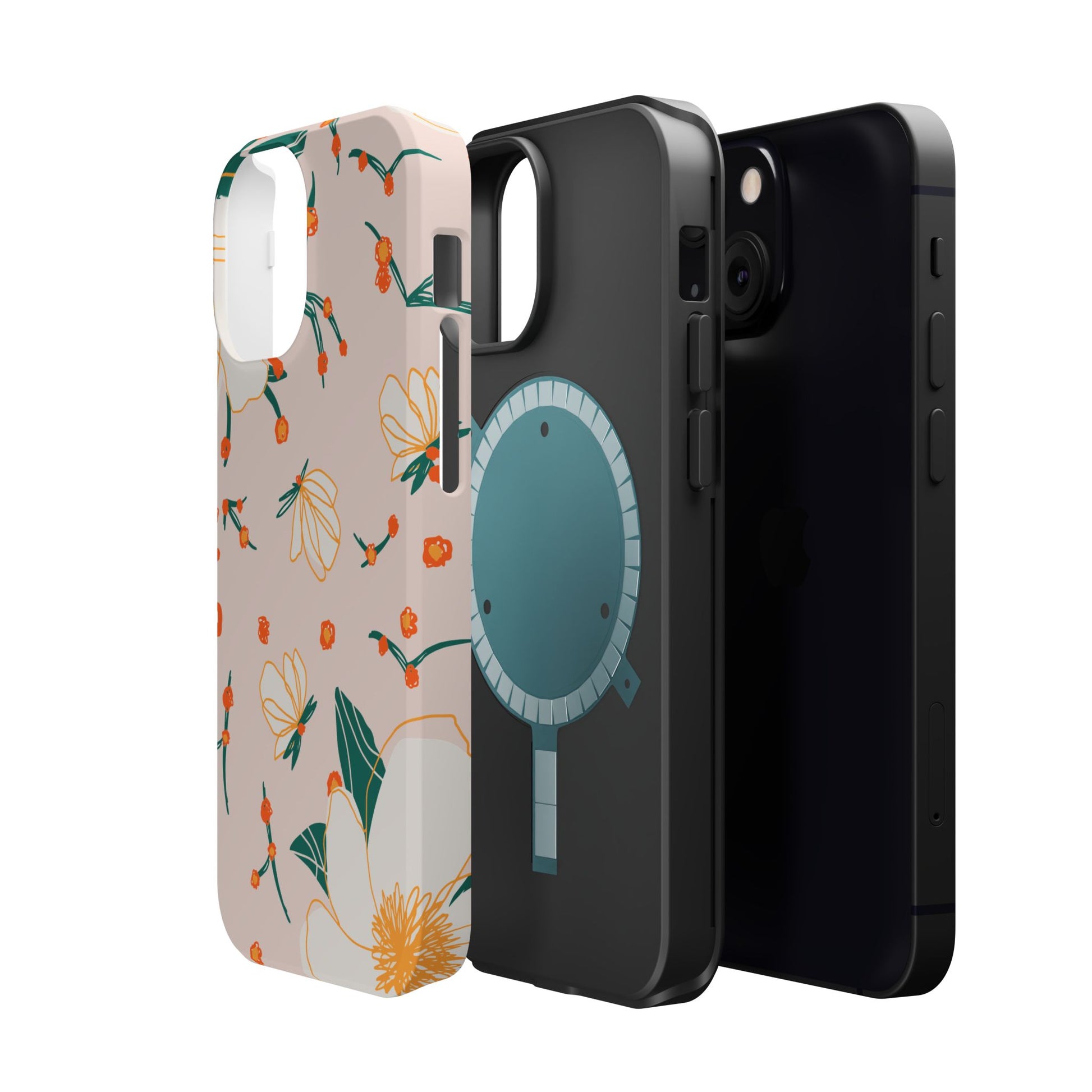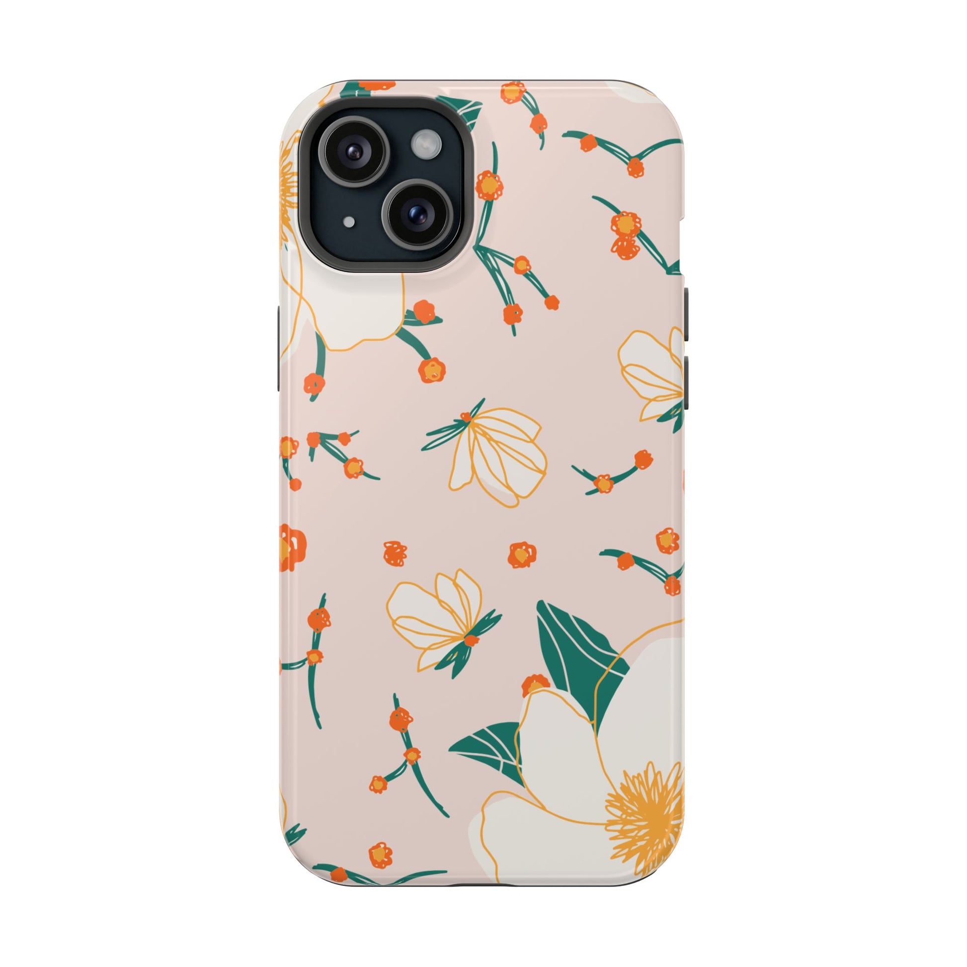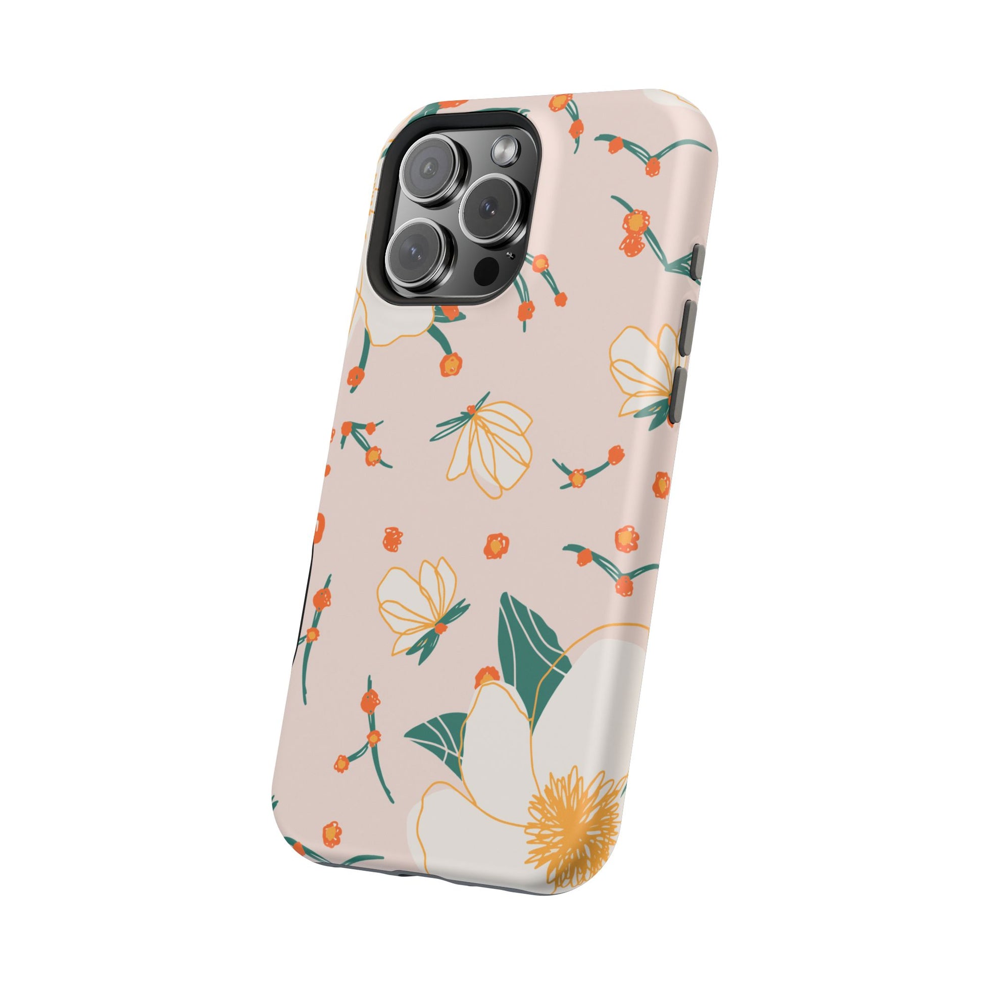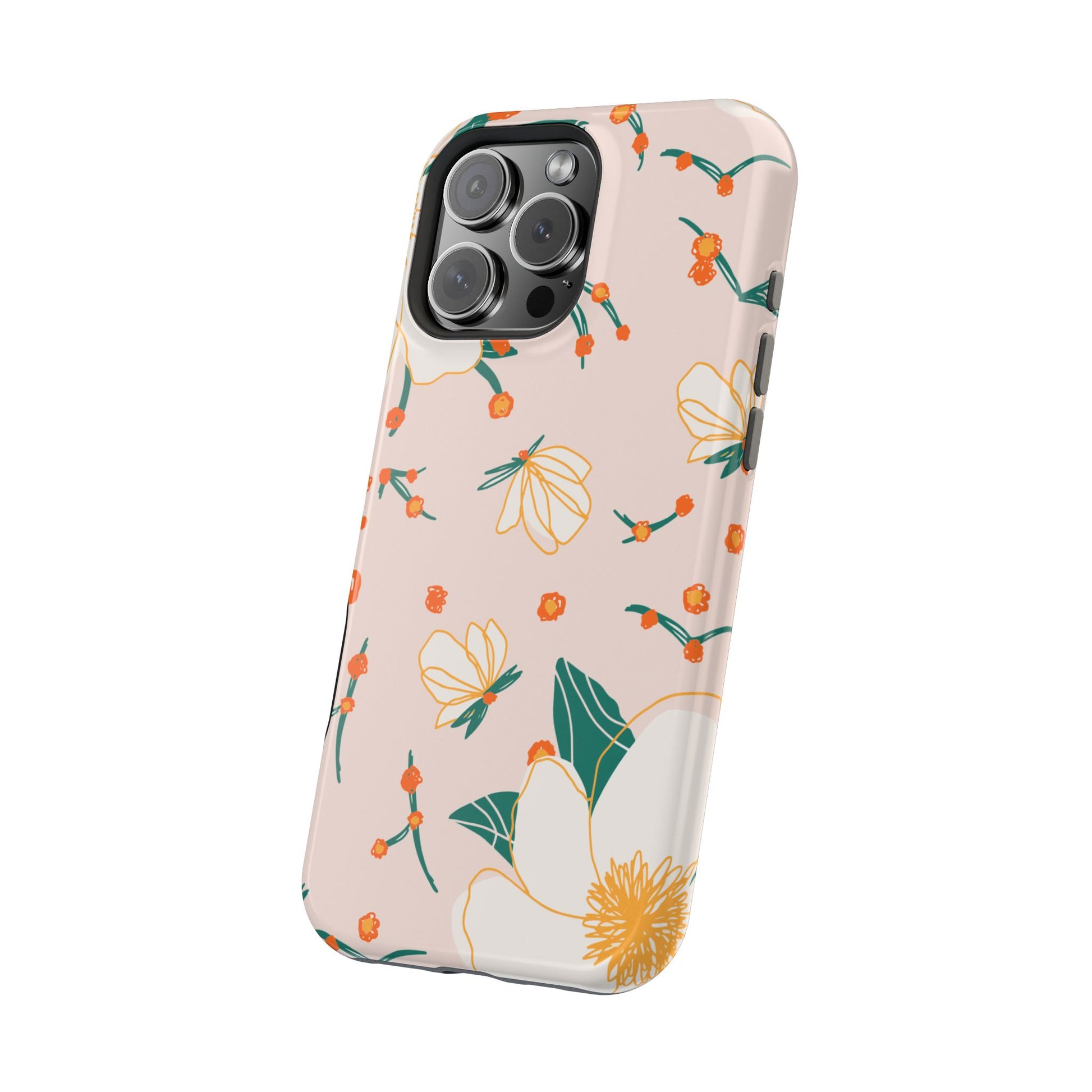 Bring a touch of nature’s beauty to your phone with our Elegant Magnolia Blossom Tough MagSafe iPhone Case. Featuring a graceful floral design with large magnolia blooms in soft cream and gold, complemented by delicate orange accents on a blush pink background, this case adds an elegant, femi...