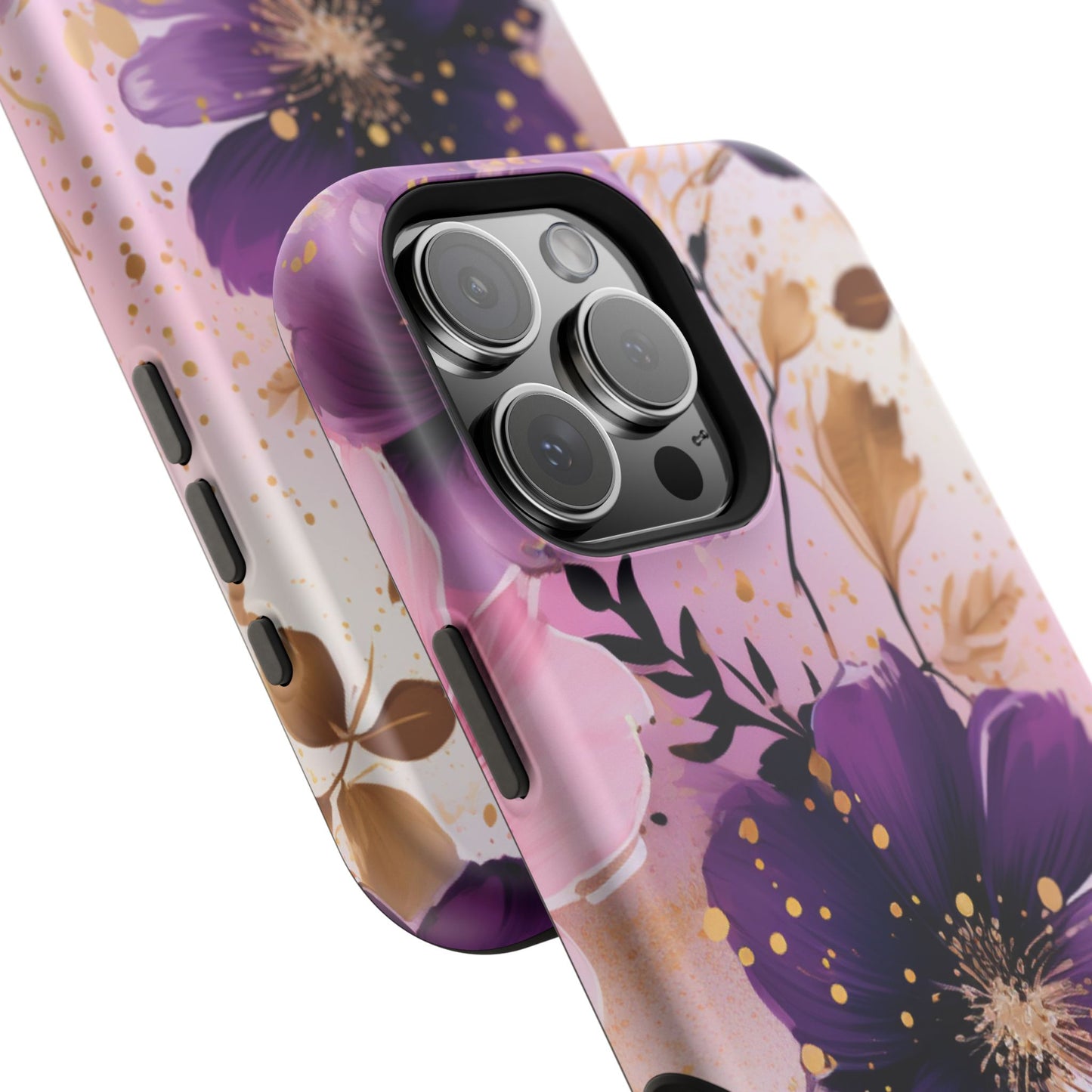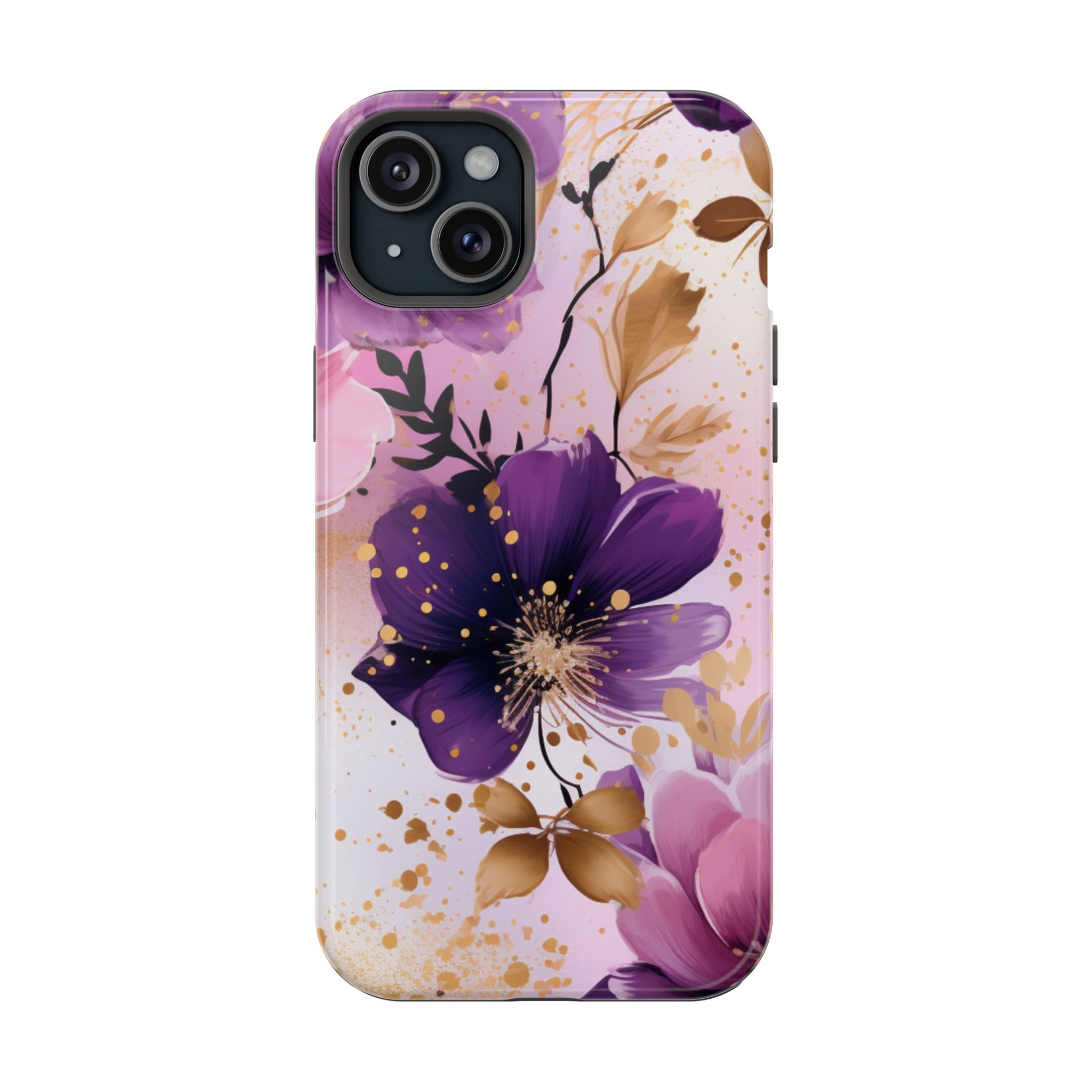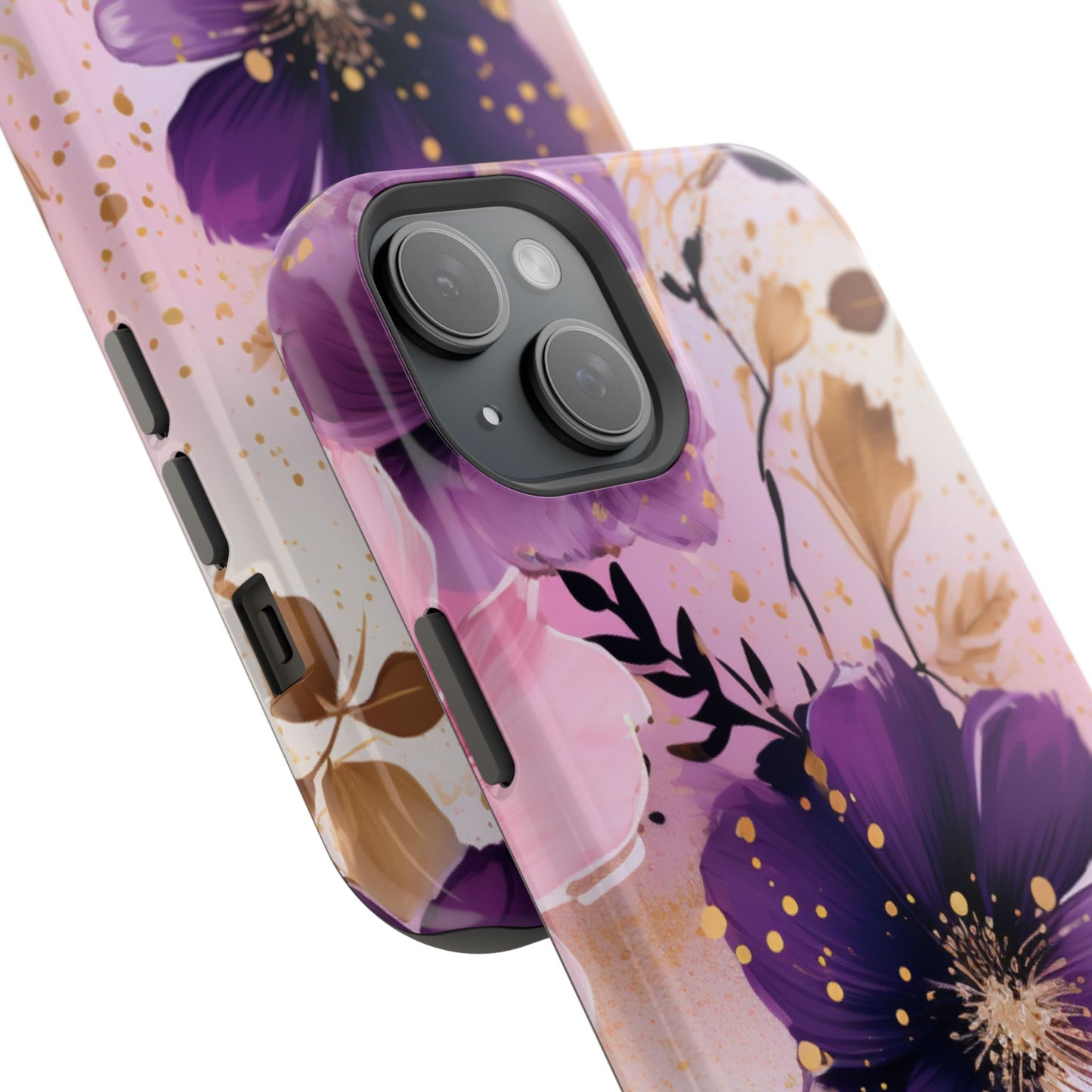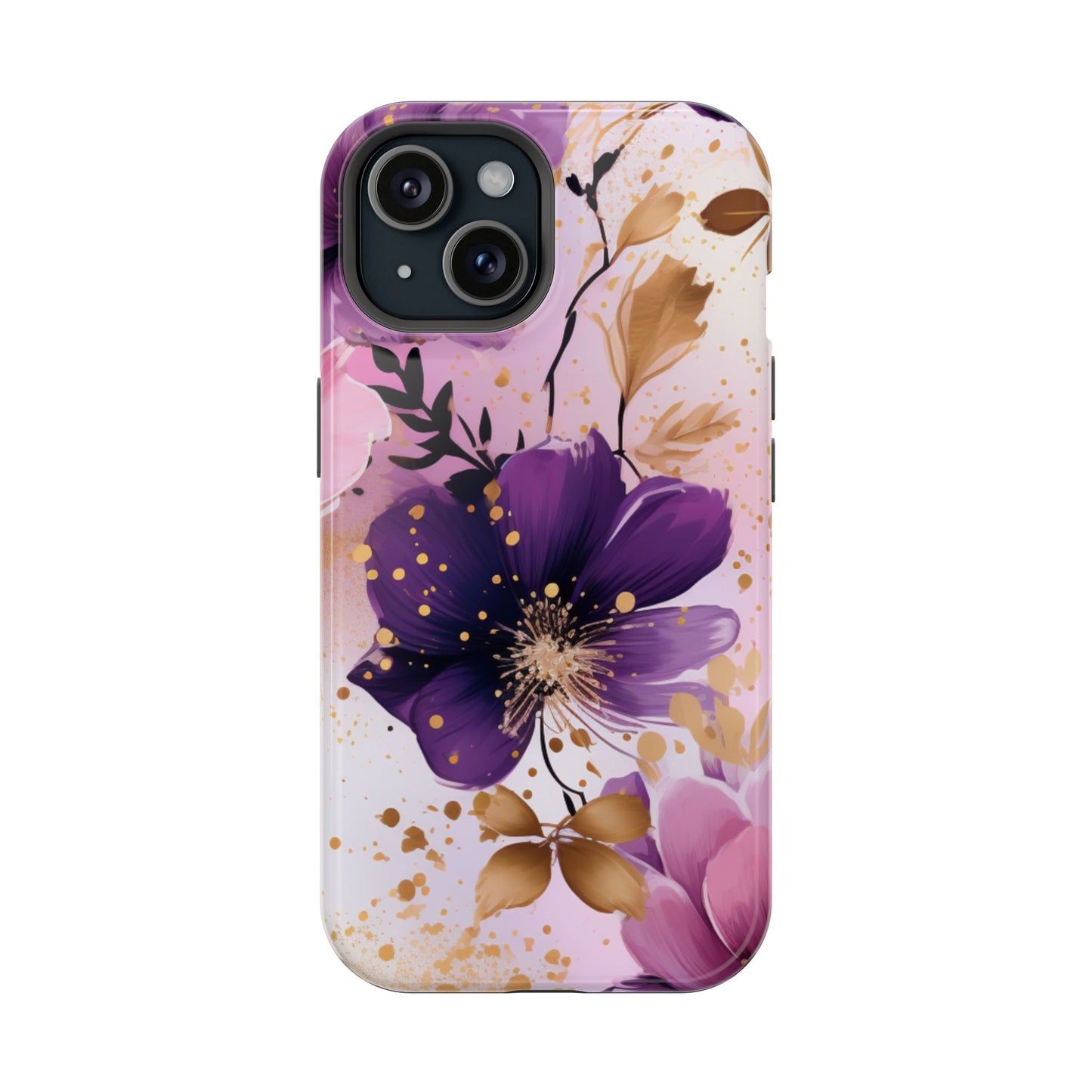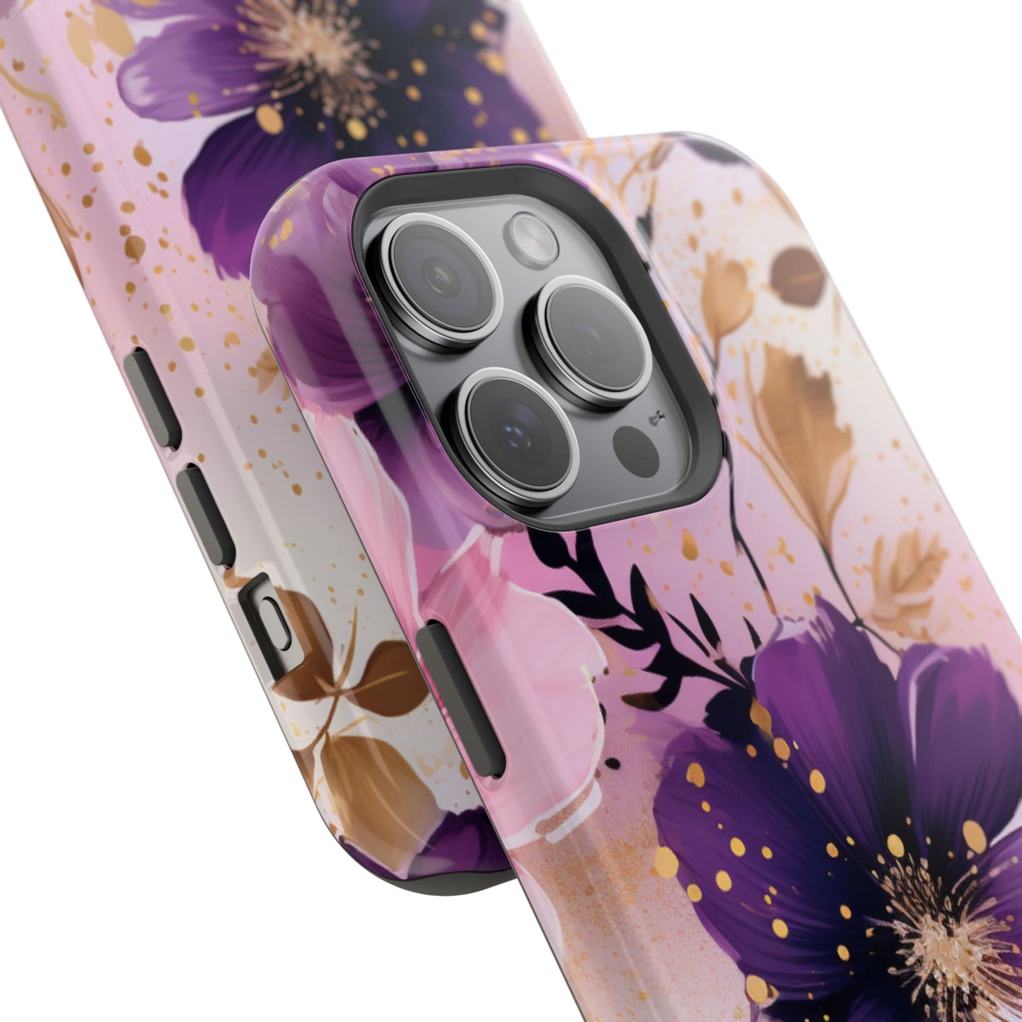 Elegant Purple & Gold Floral MagSafe iPhone Case - Luxe Flower Design