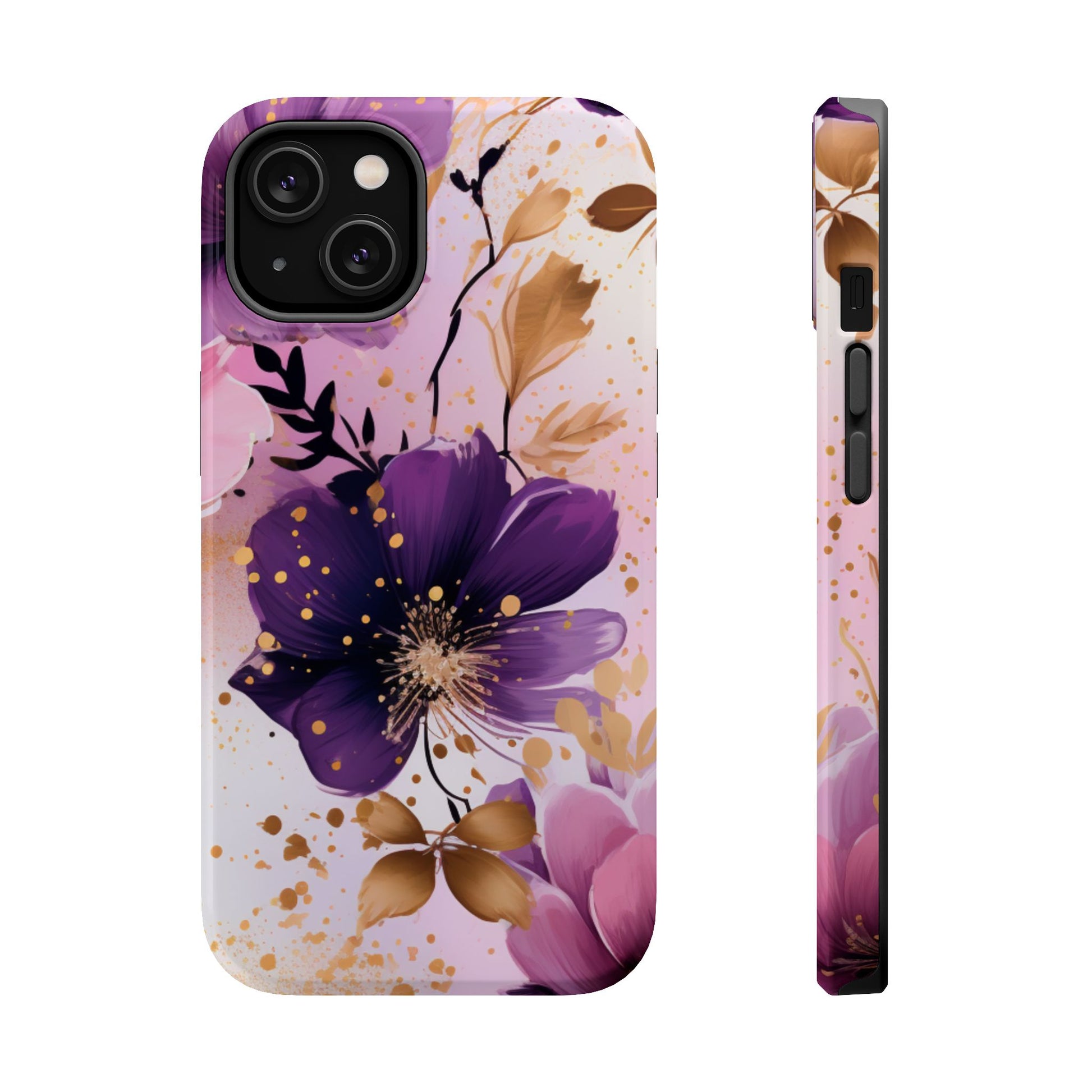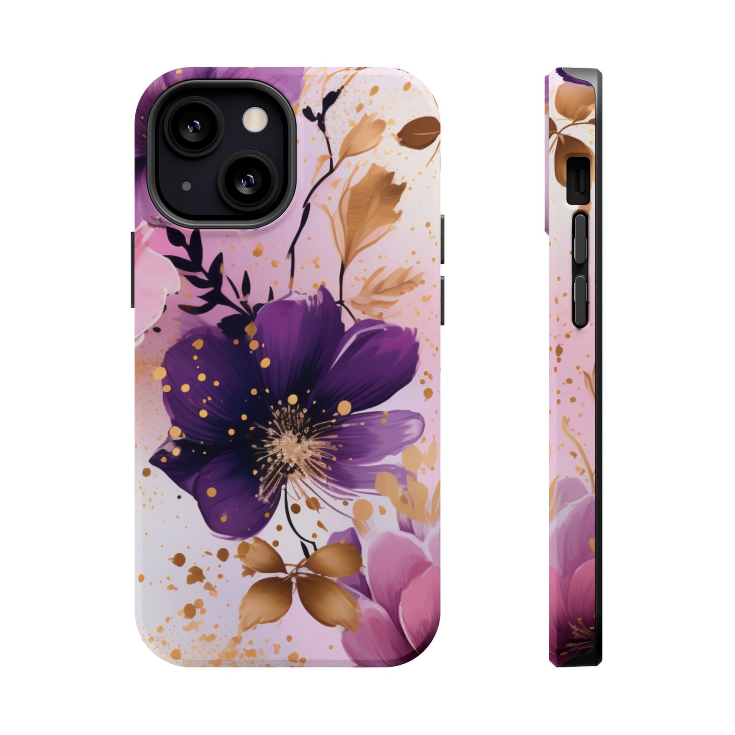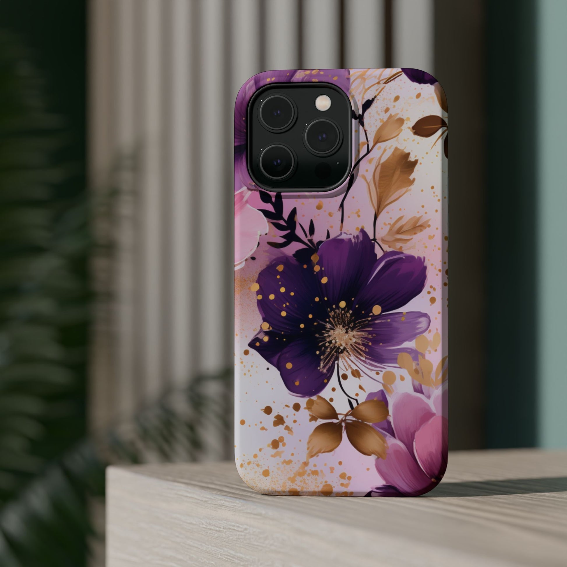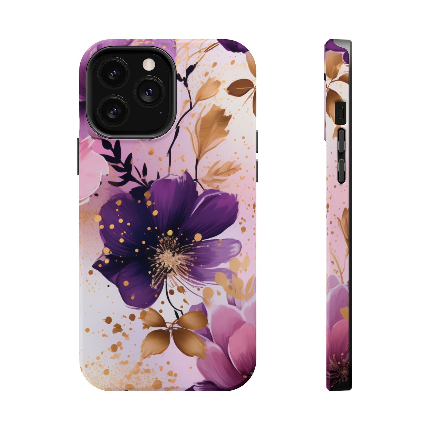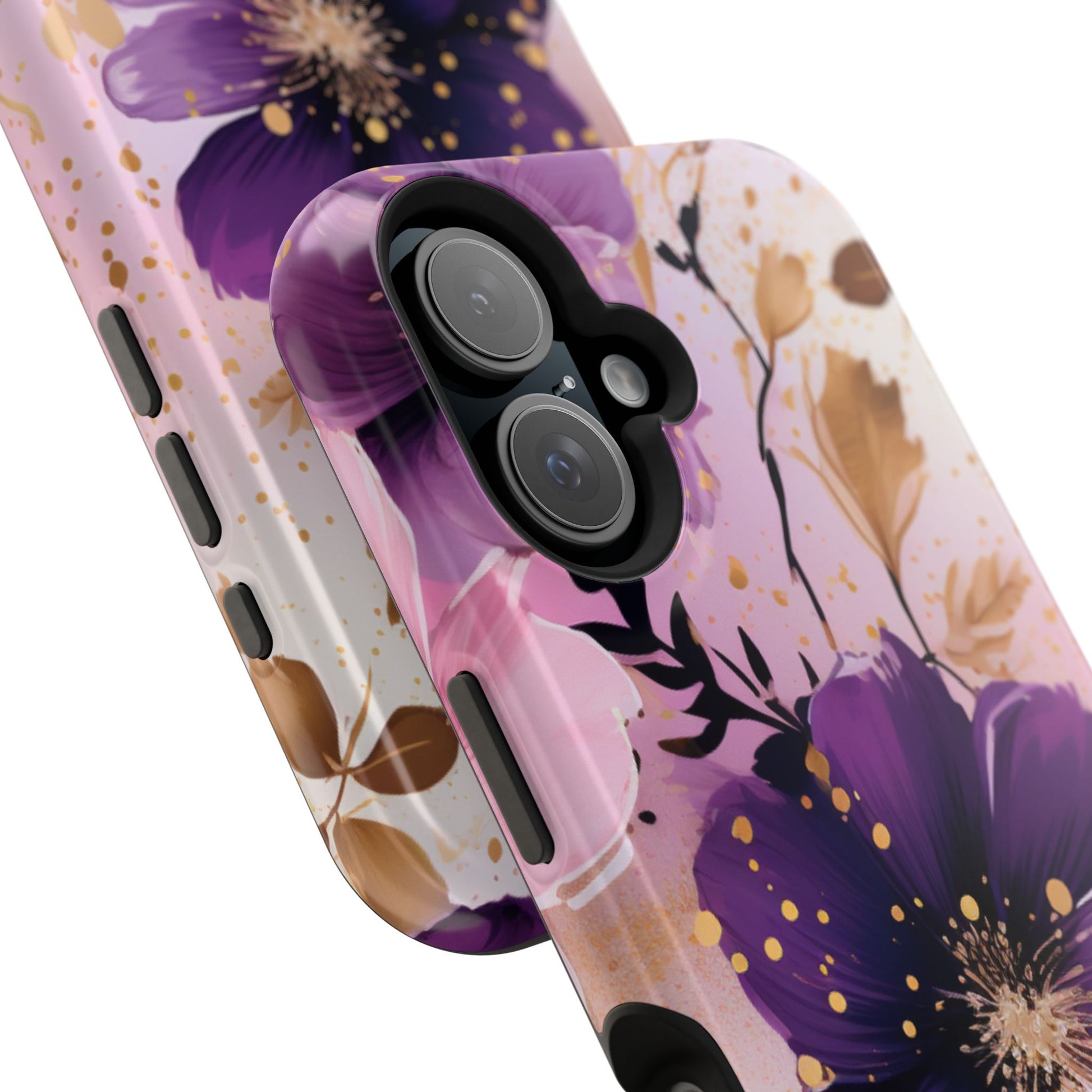 Elegant Purple & Gold Floral MagSafe iPhone Case - Luxe Flower Design