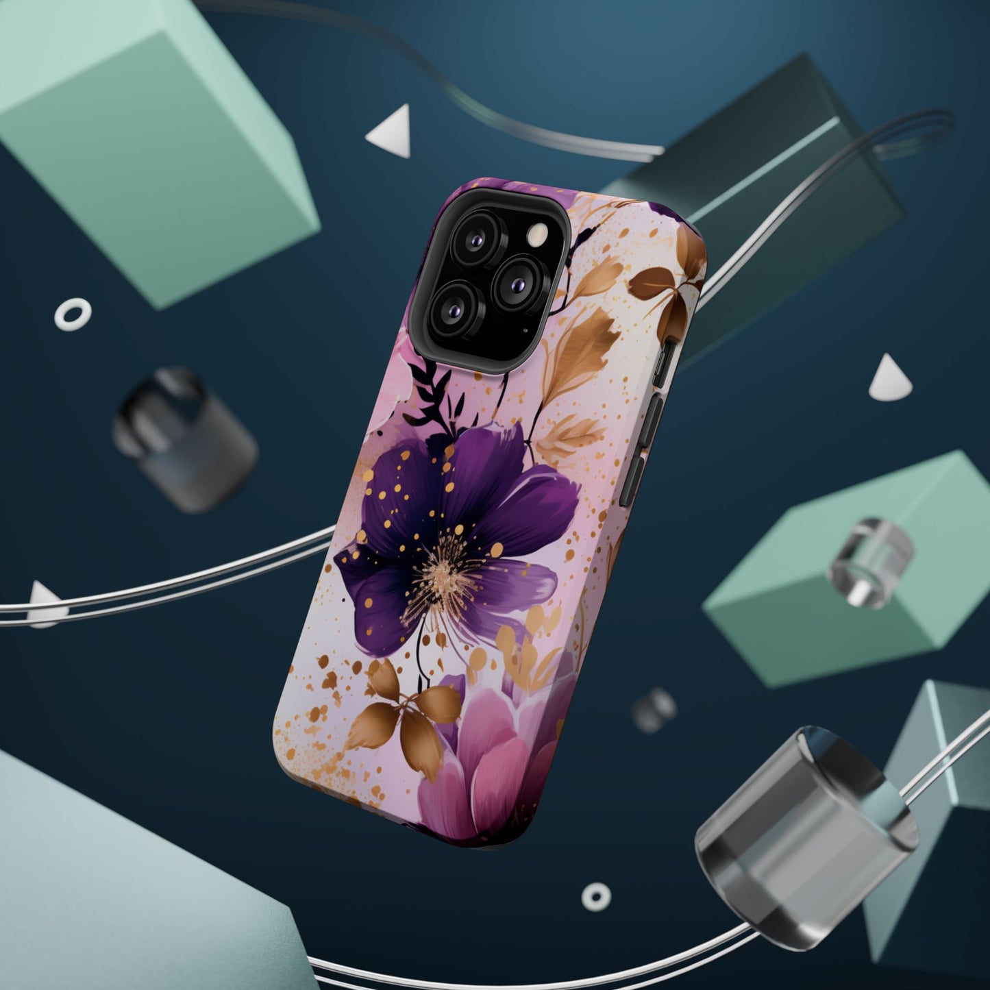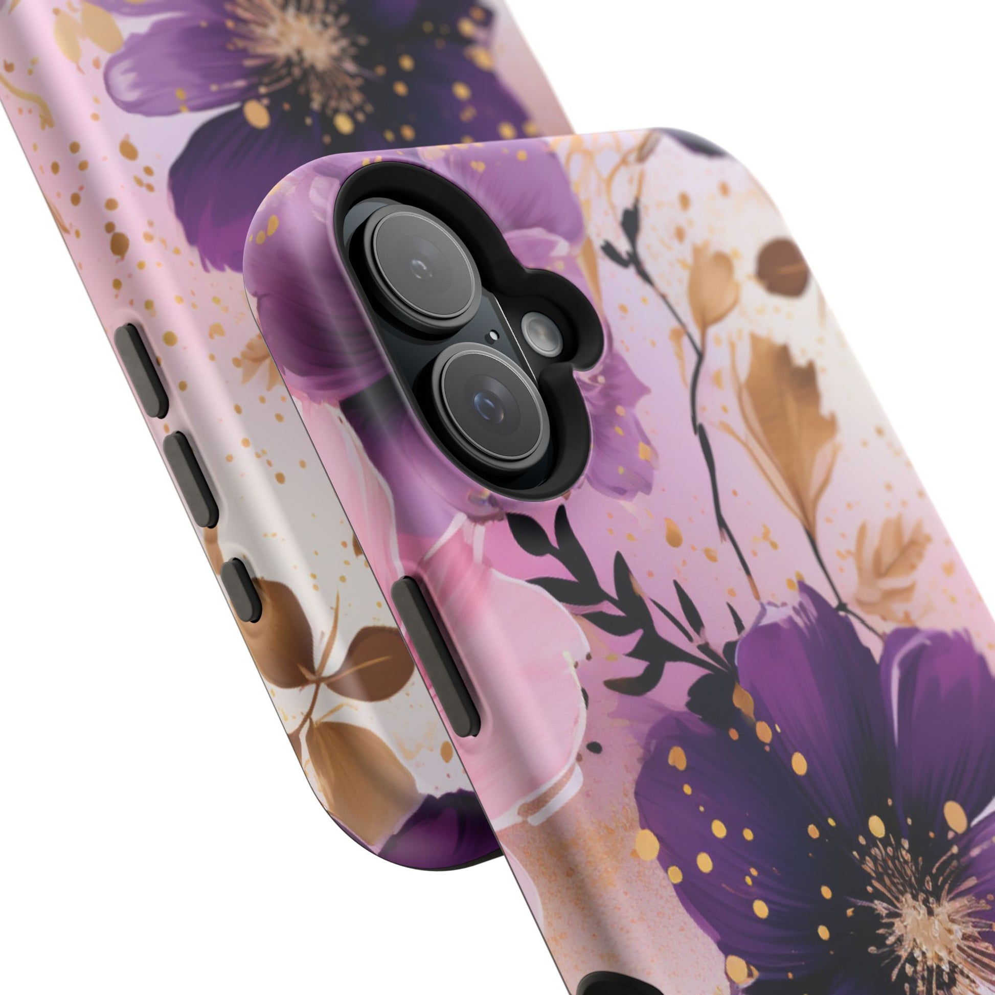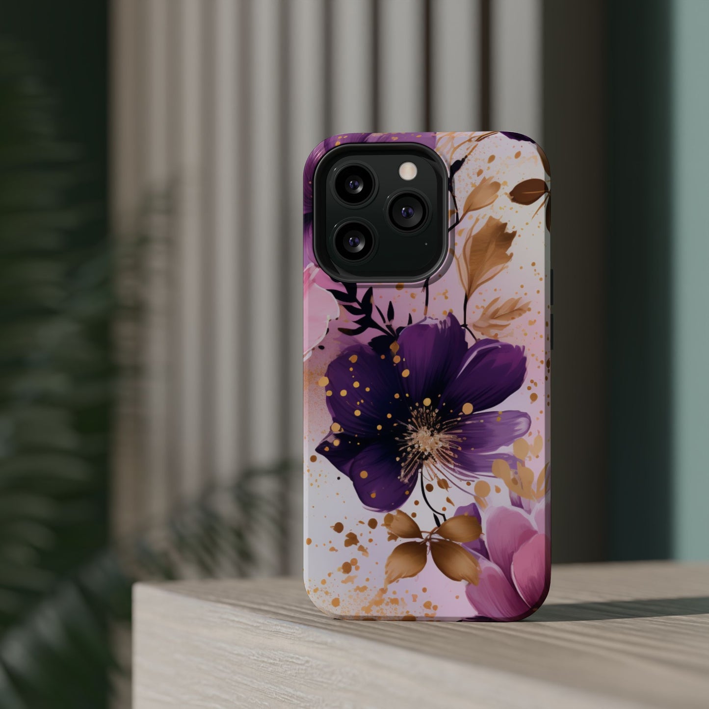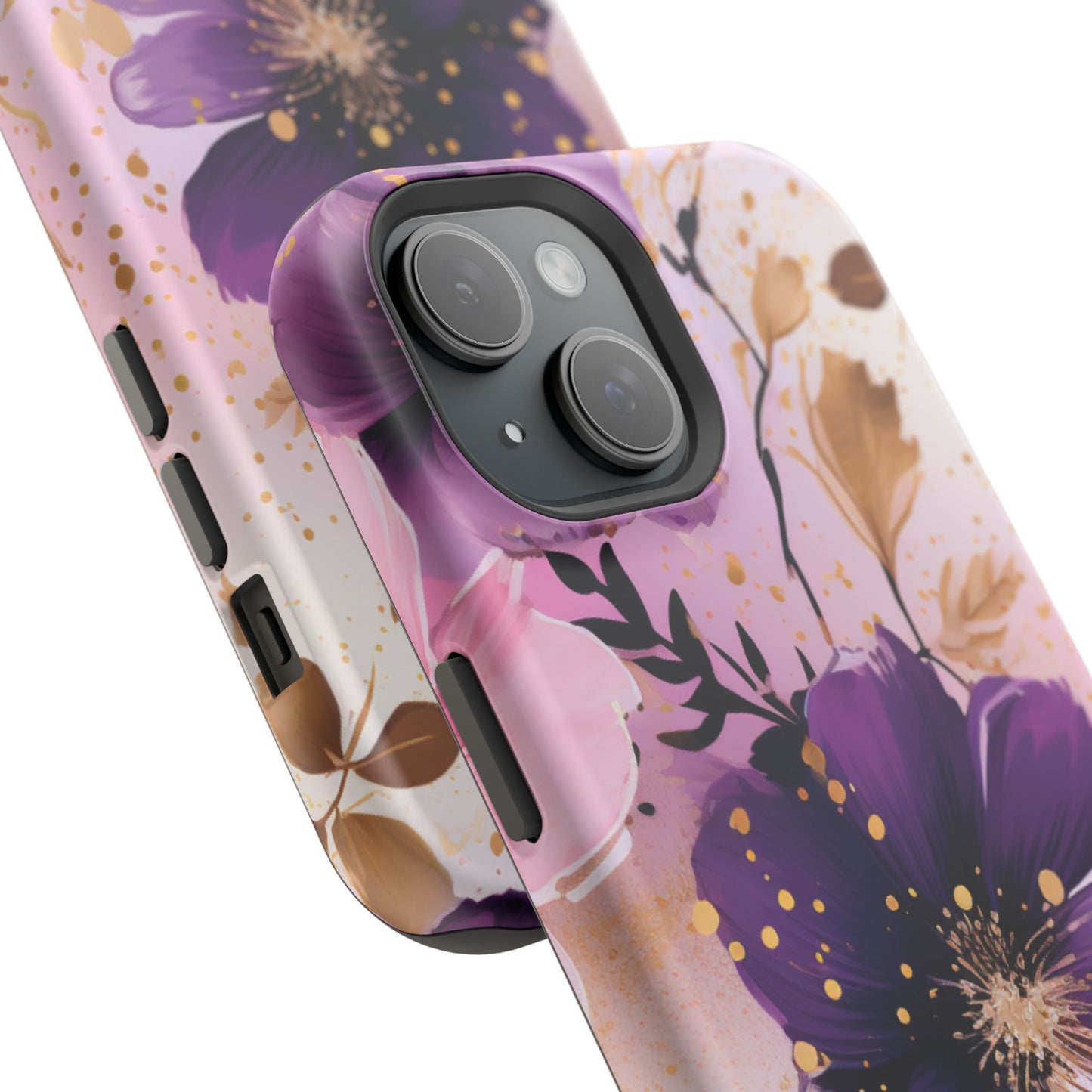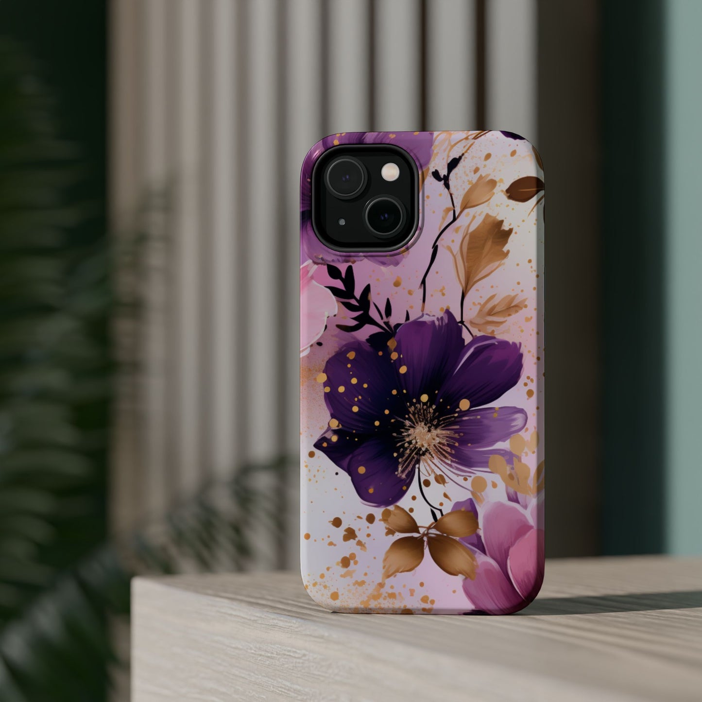 Elegant Purple & Gold Floral MagSafe iPhone Case - Luxe Flower Design