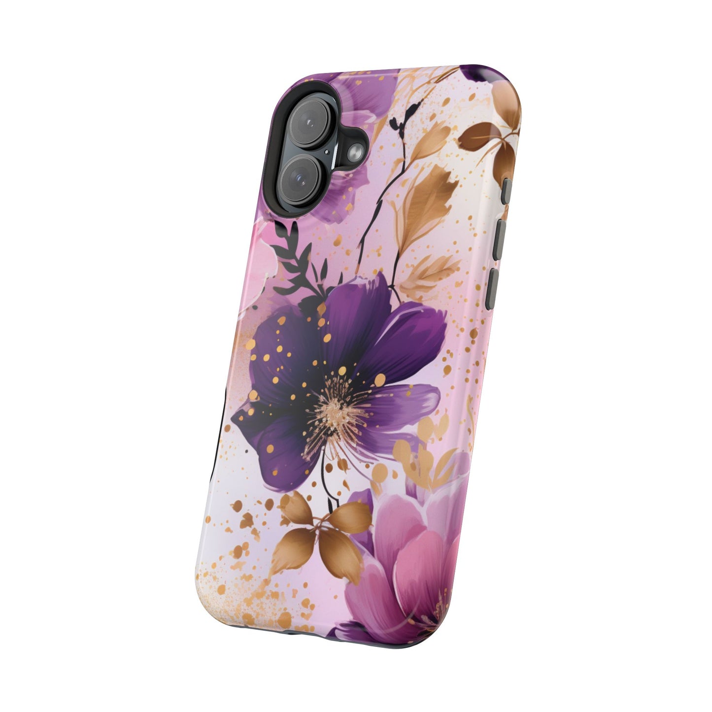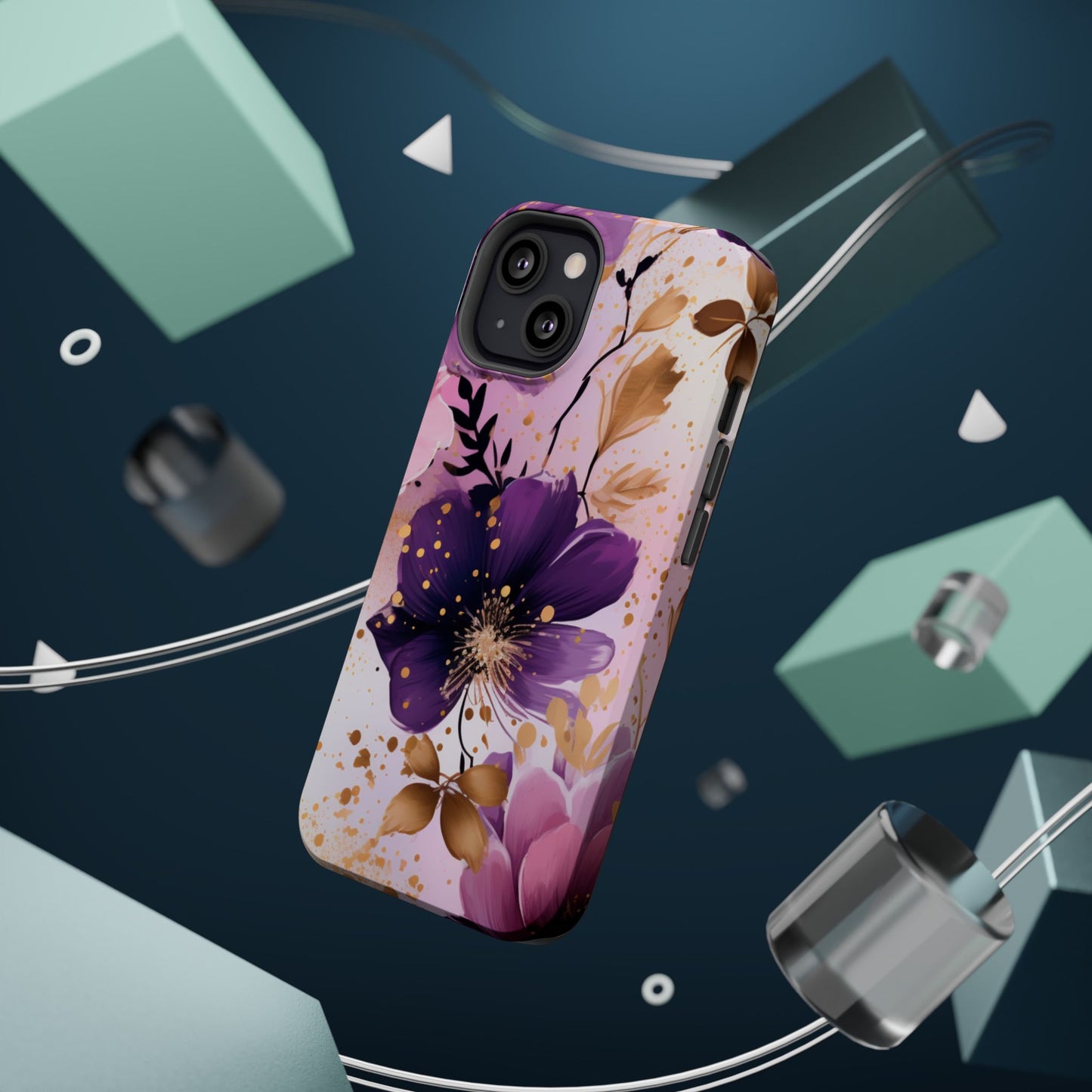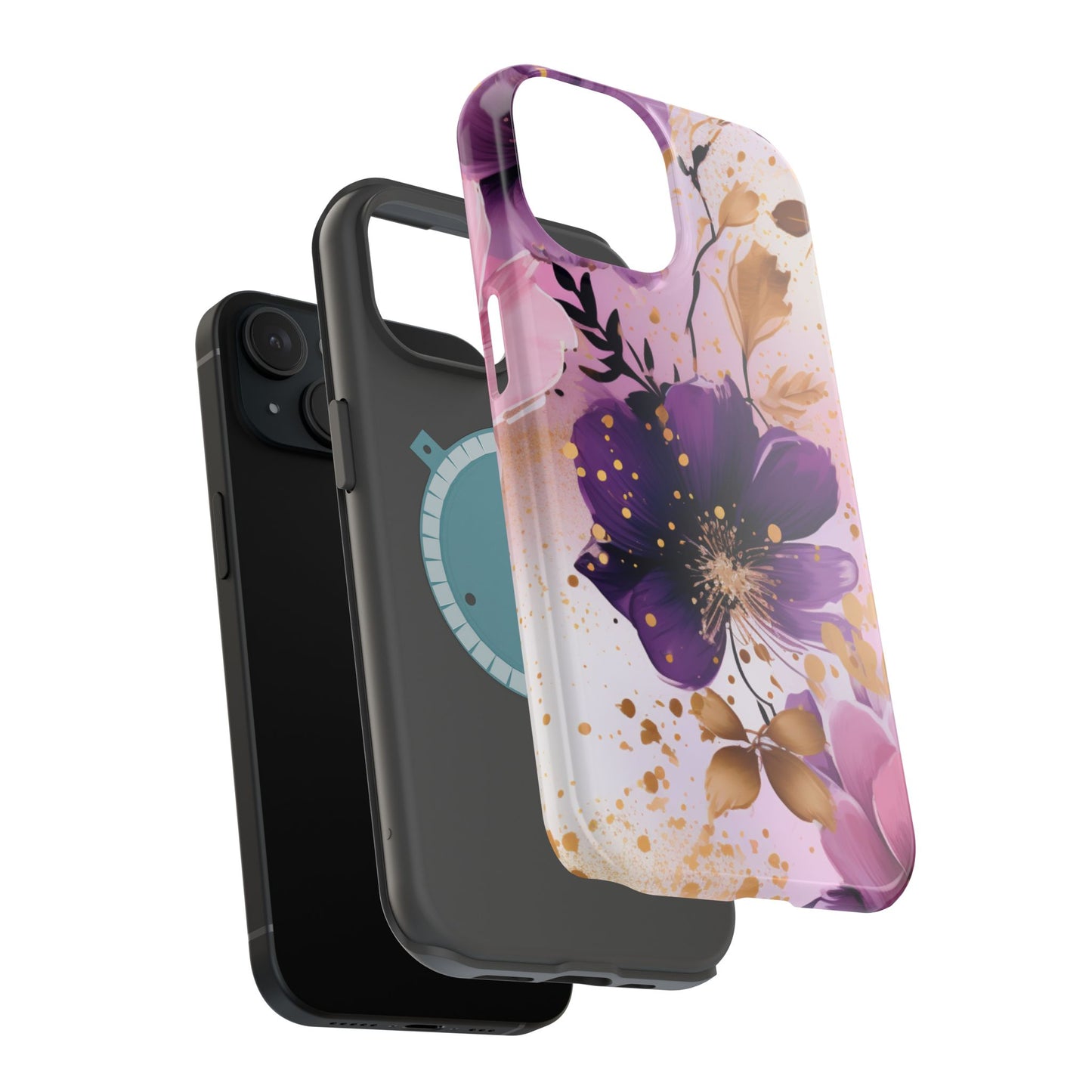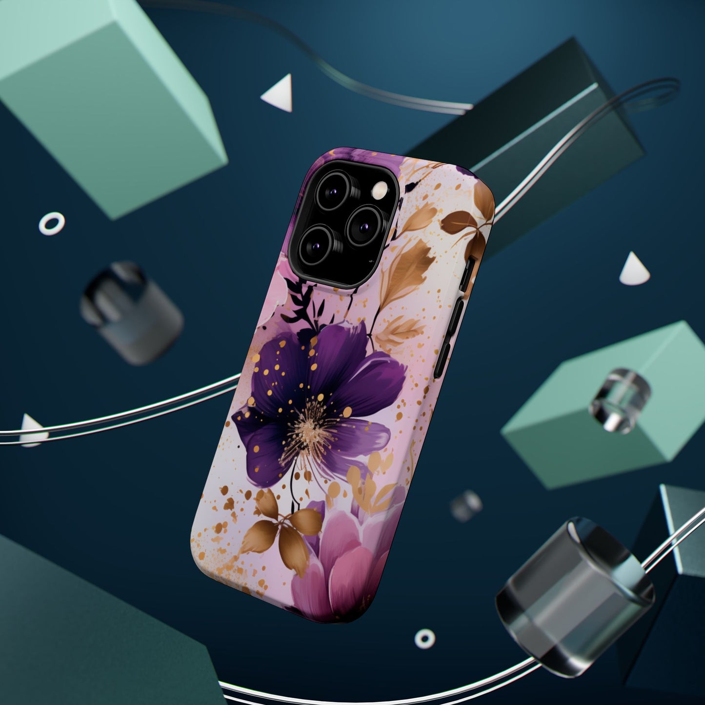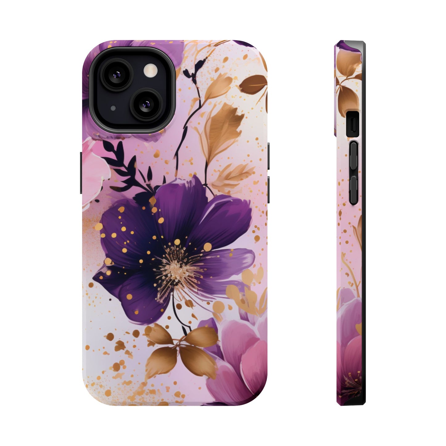 Elegant Purple & Gold Floral MagSafe iPhone Case - Luxe Flower Design