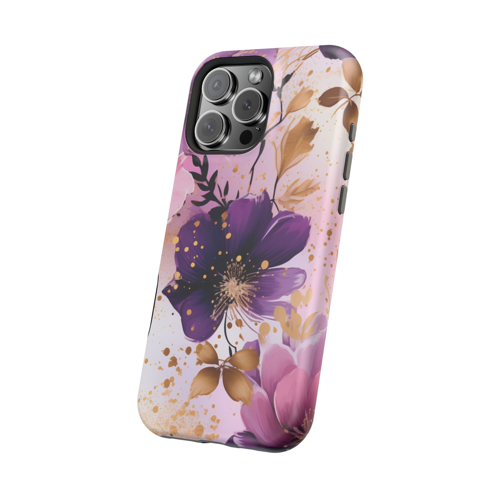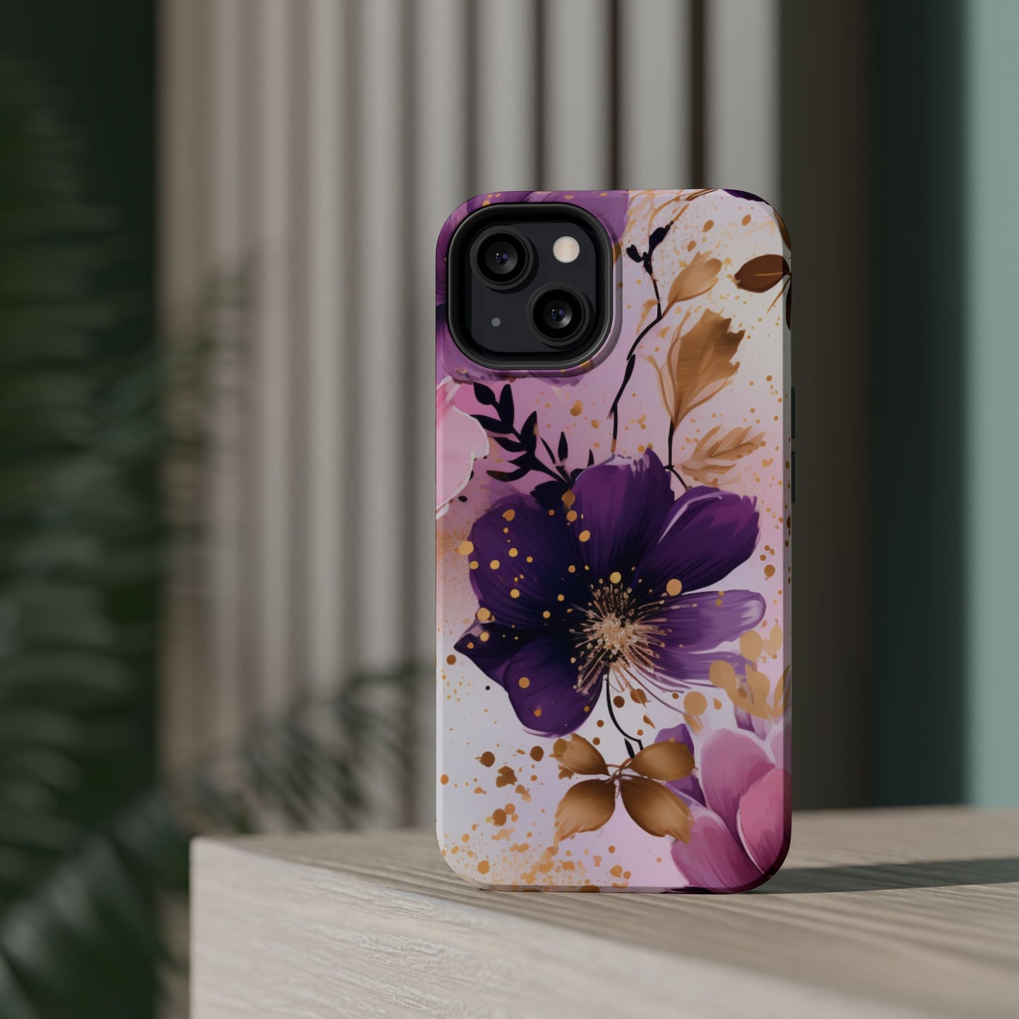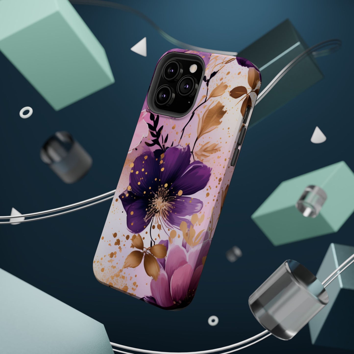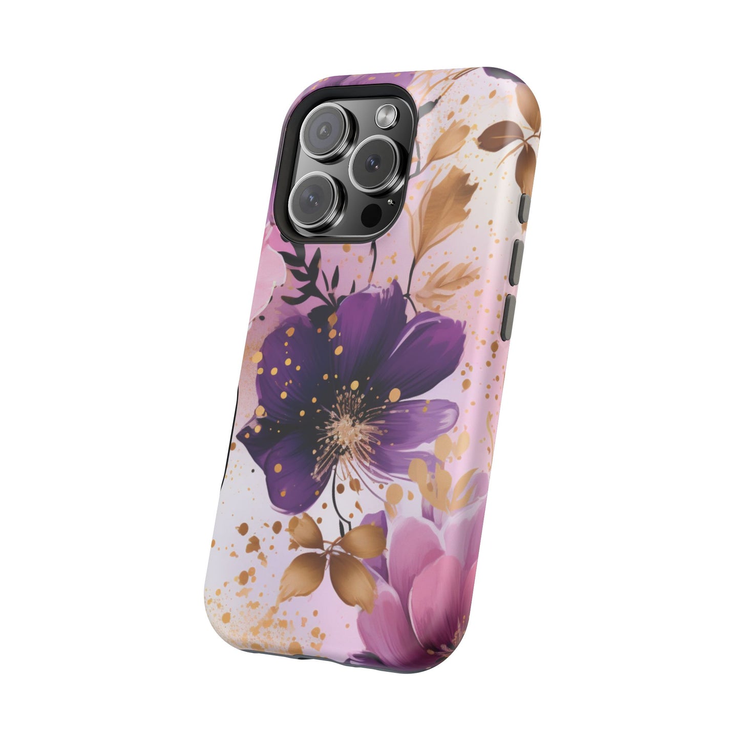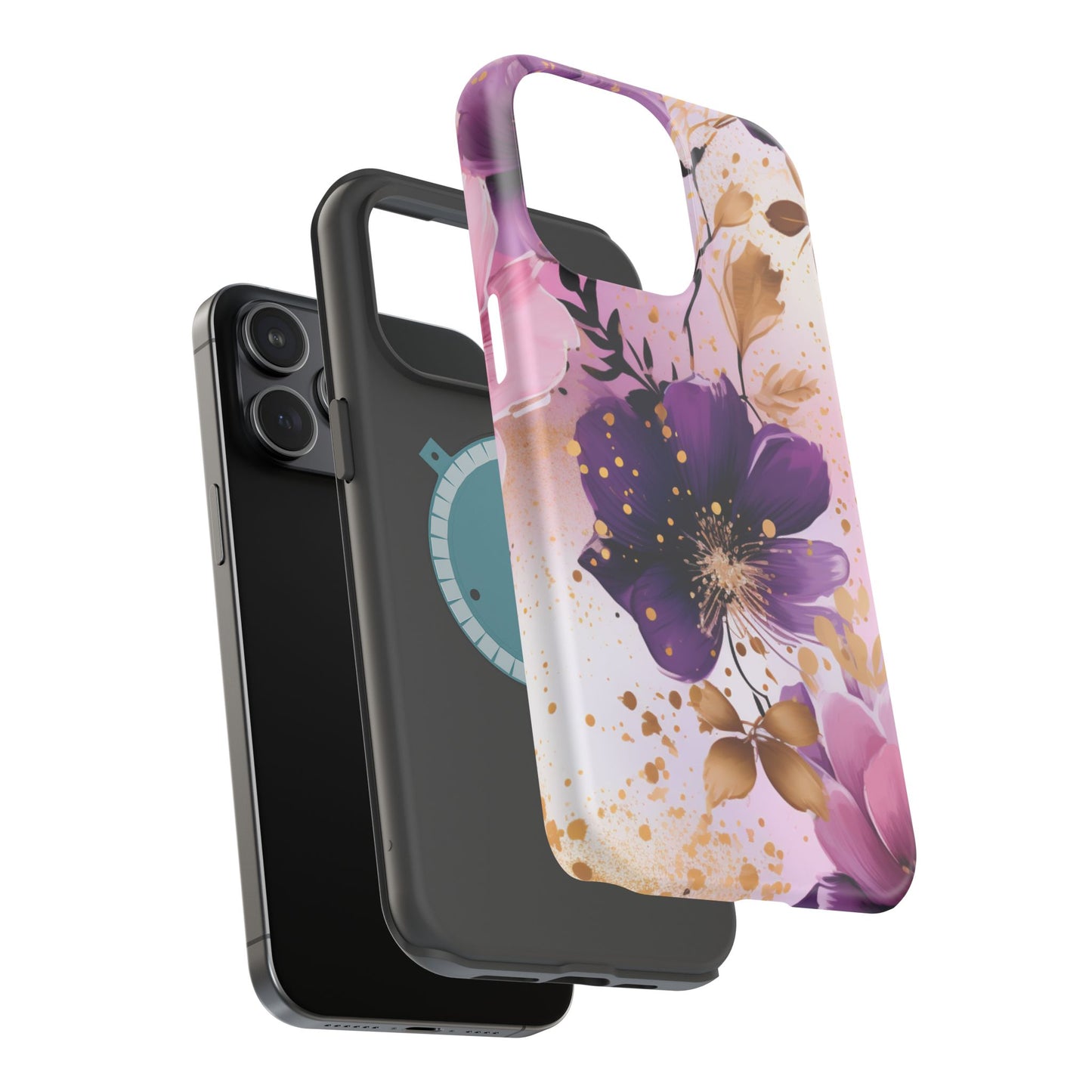 Elegant Purple & Gold Floral MagSafe iPhone Case - Luxe Flower Design
