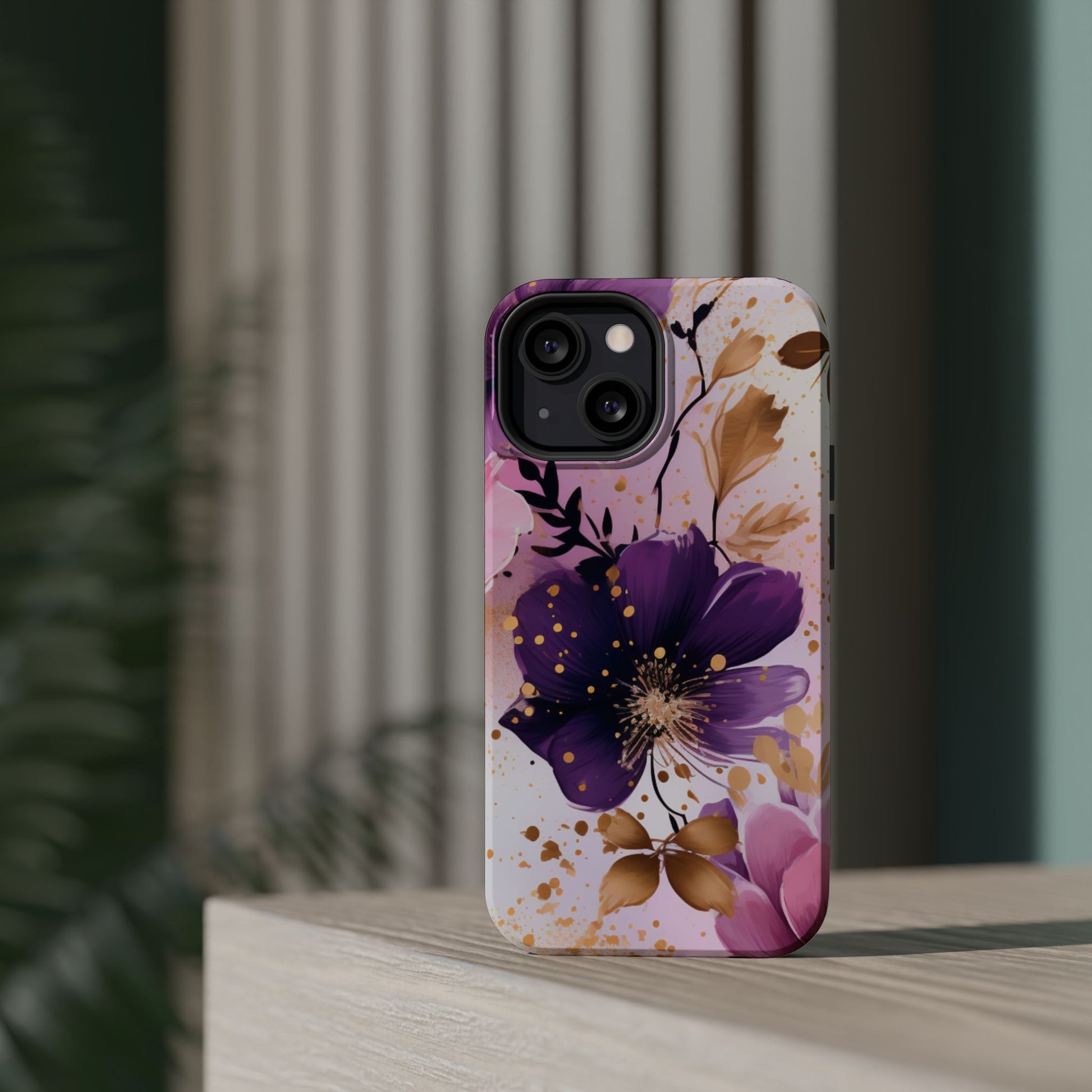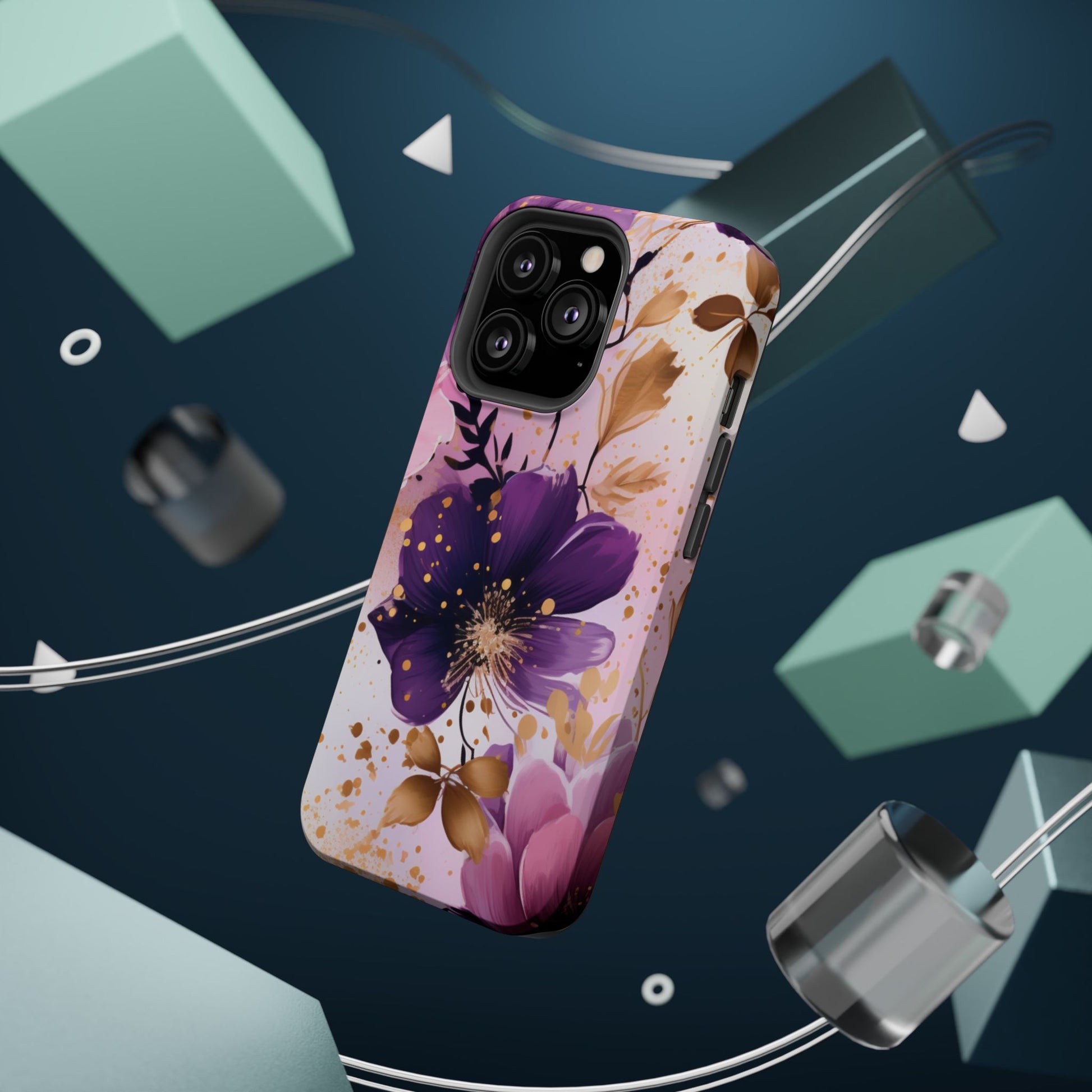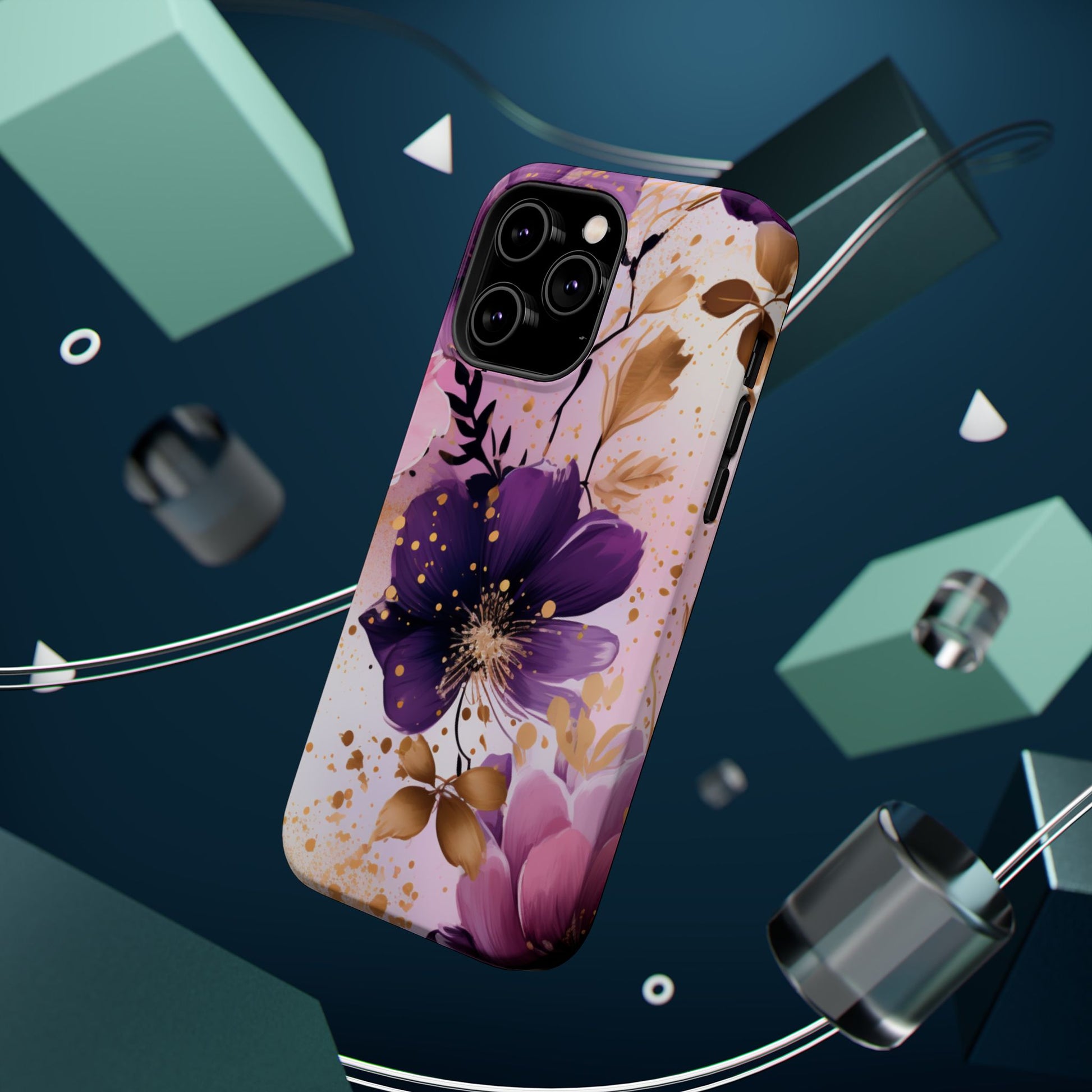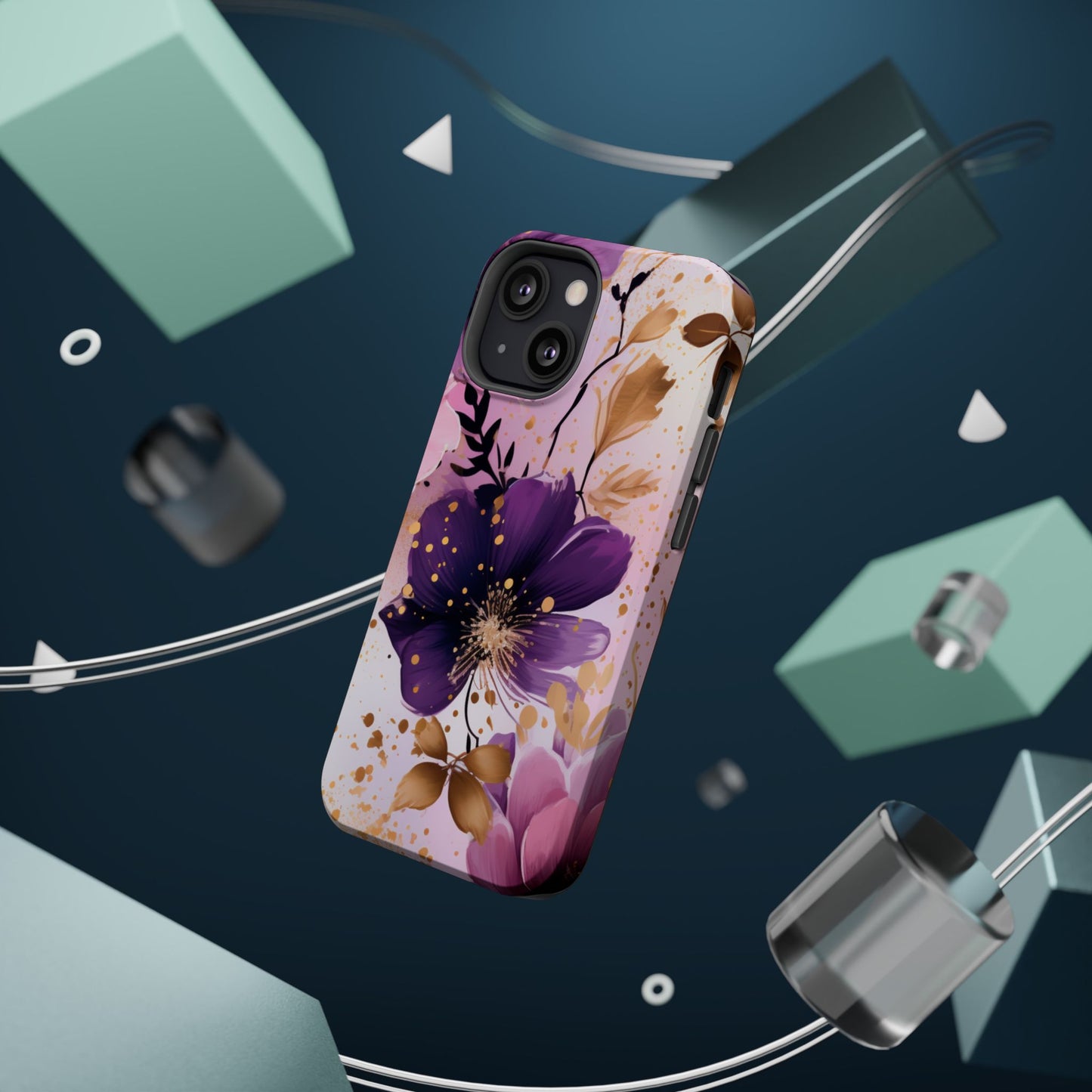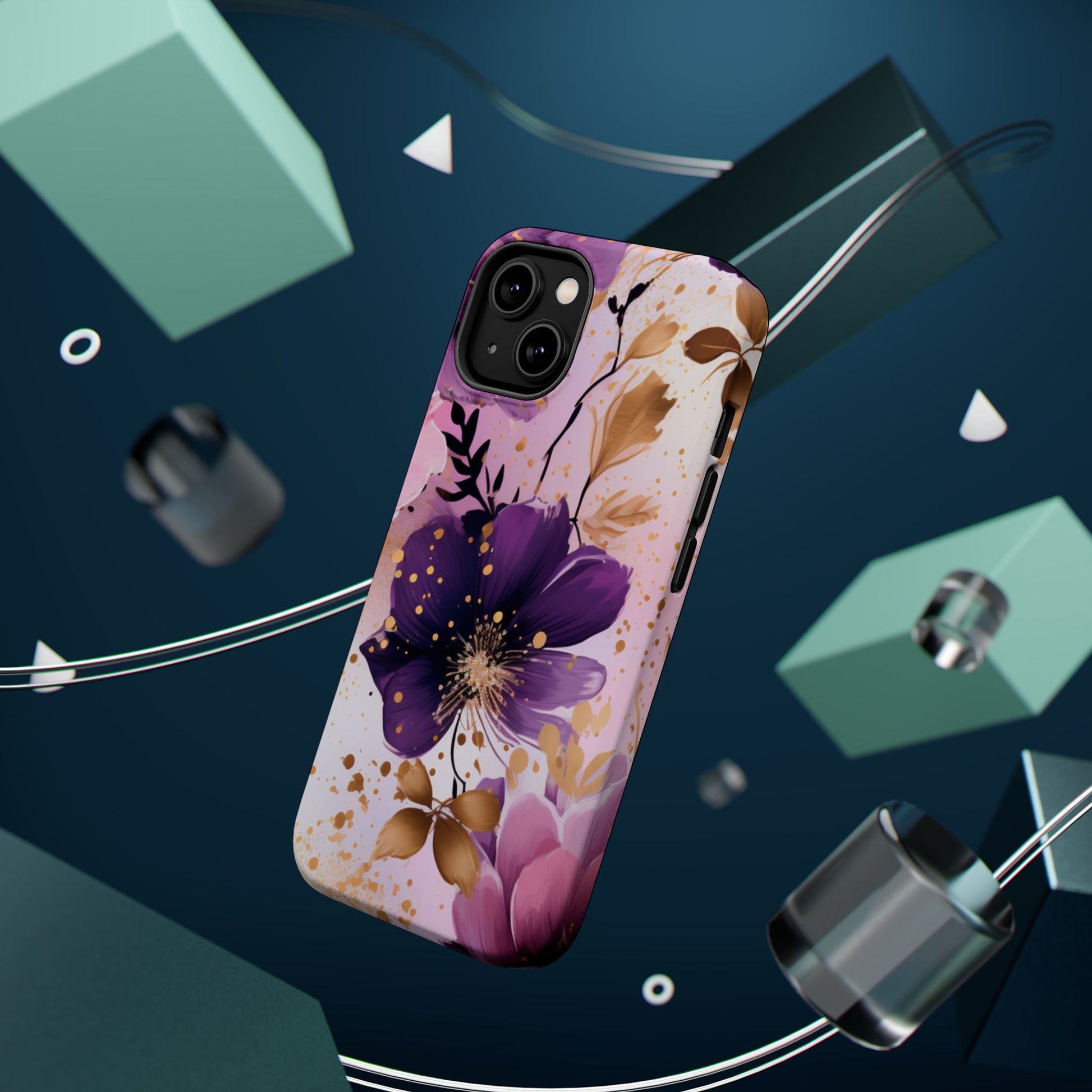 Elegant Purple & Gold Floral MagSafe iPhone Case - Luxe Flower Design