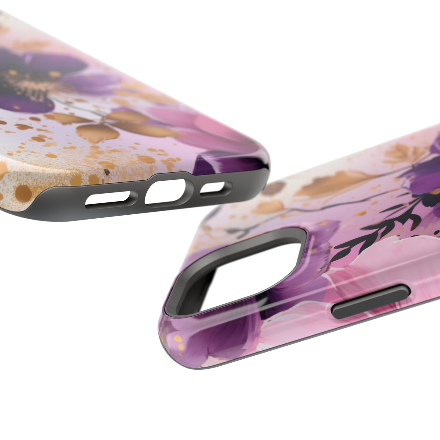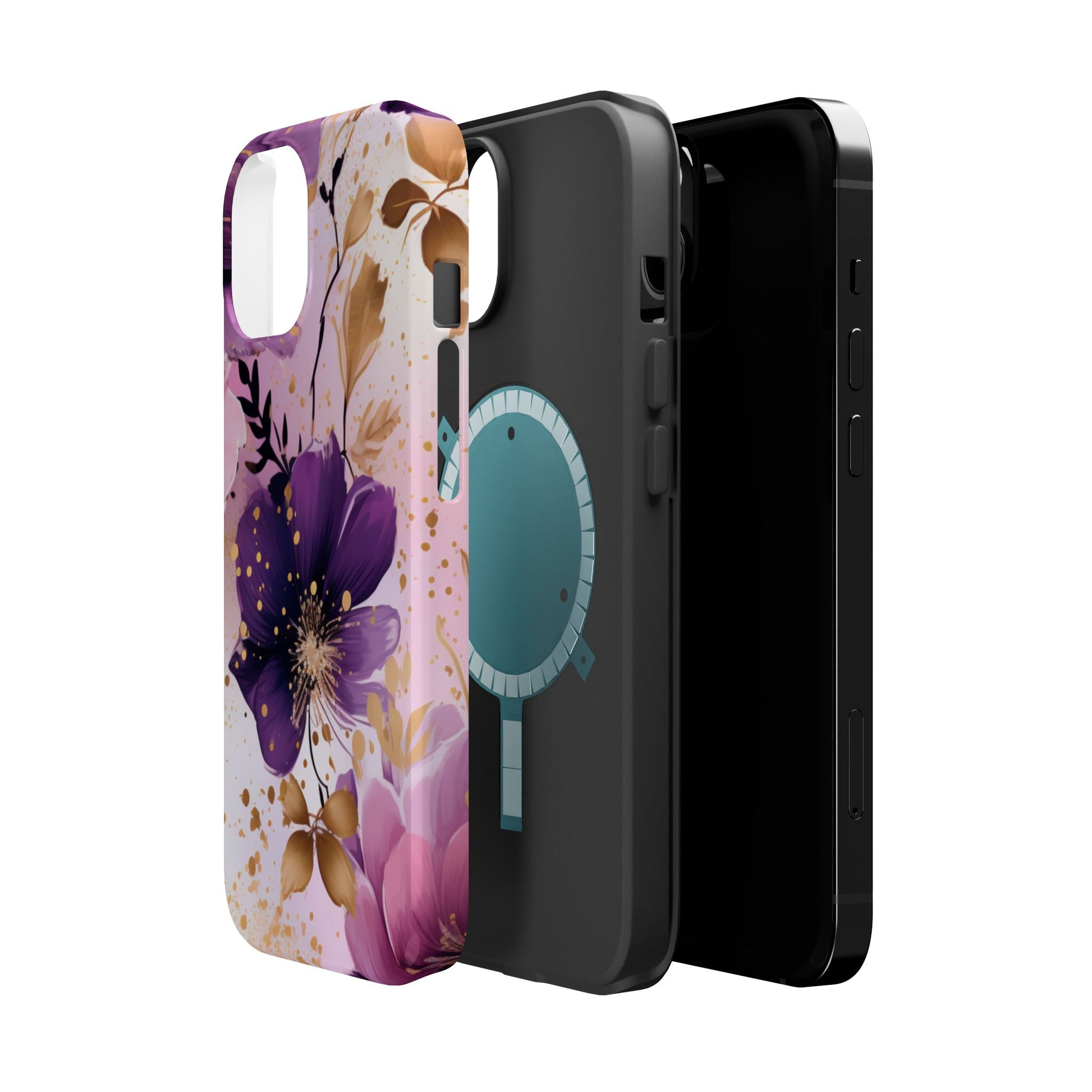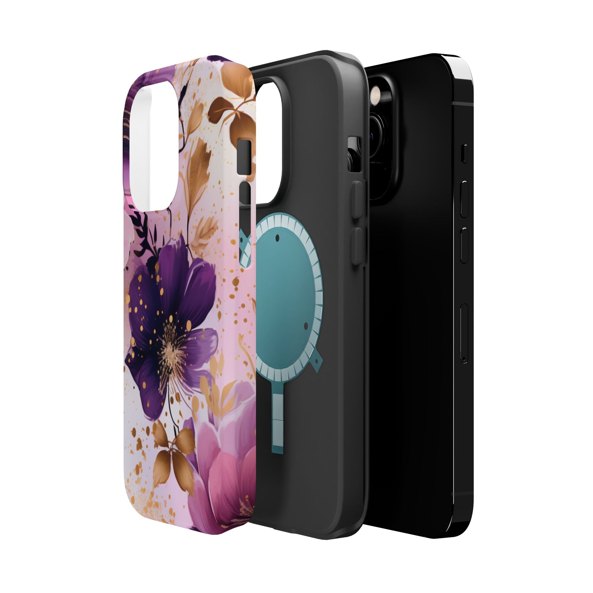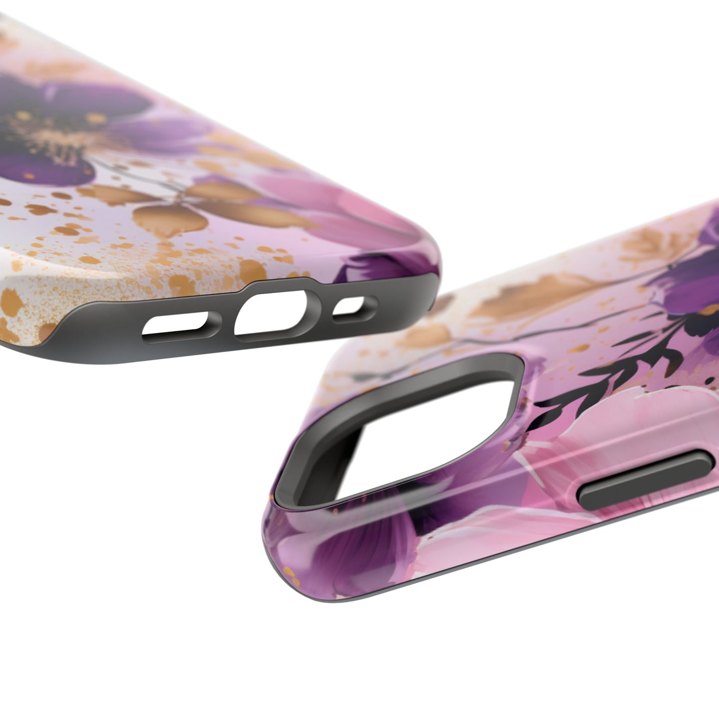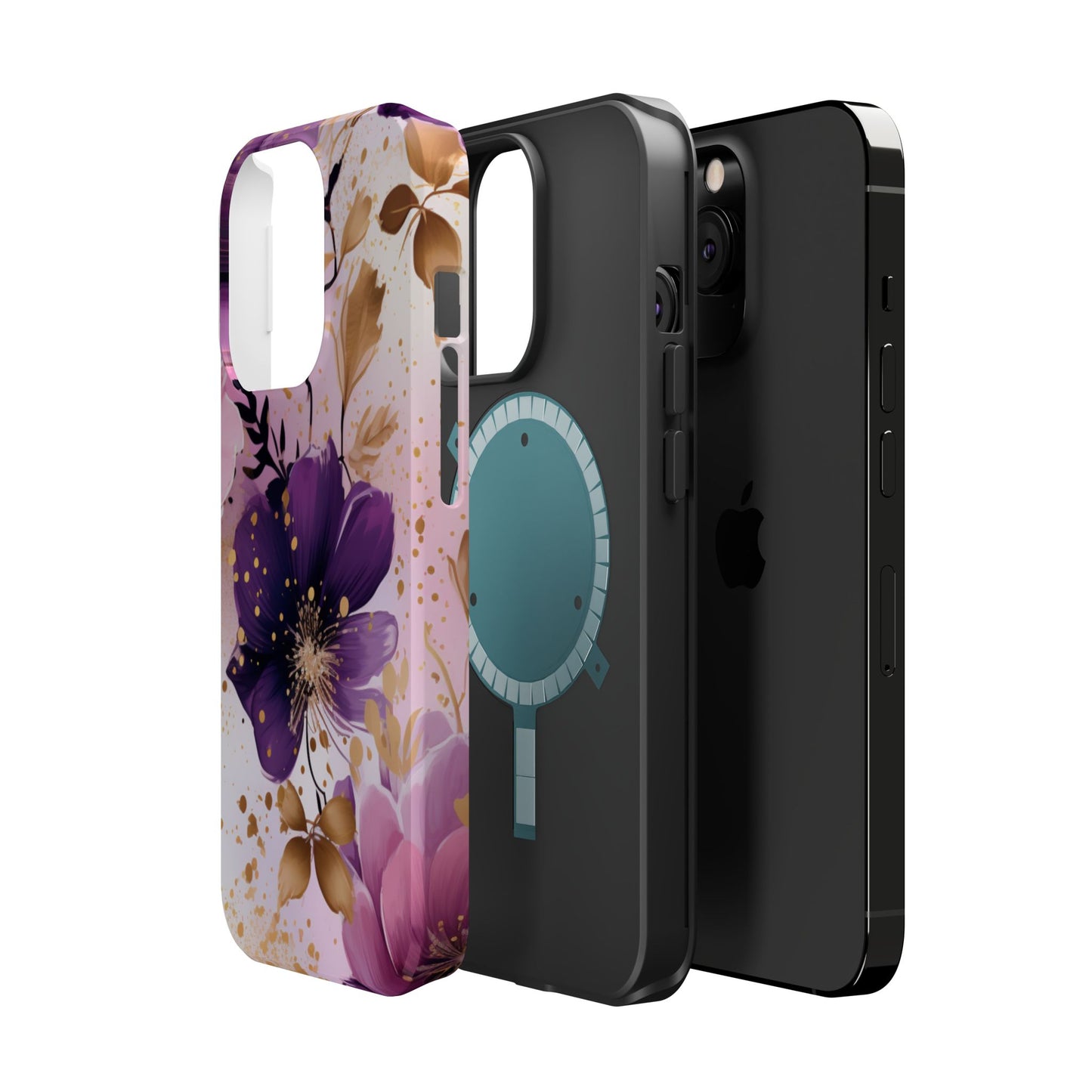 Elegant Purple & Gold Floral MagSafe iPhone Case - Luxe Flower Design