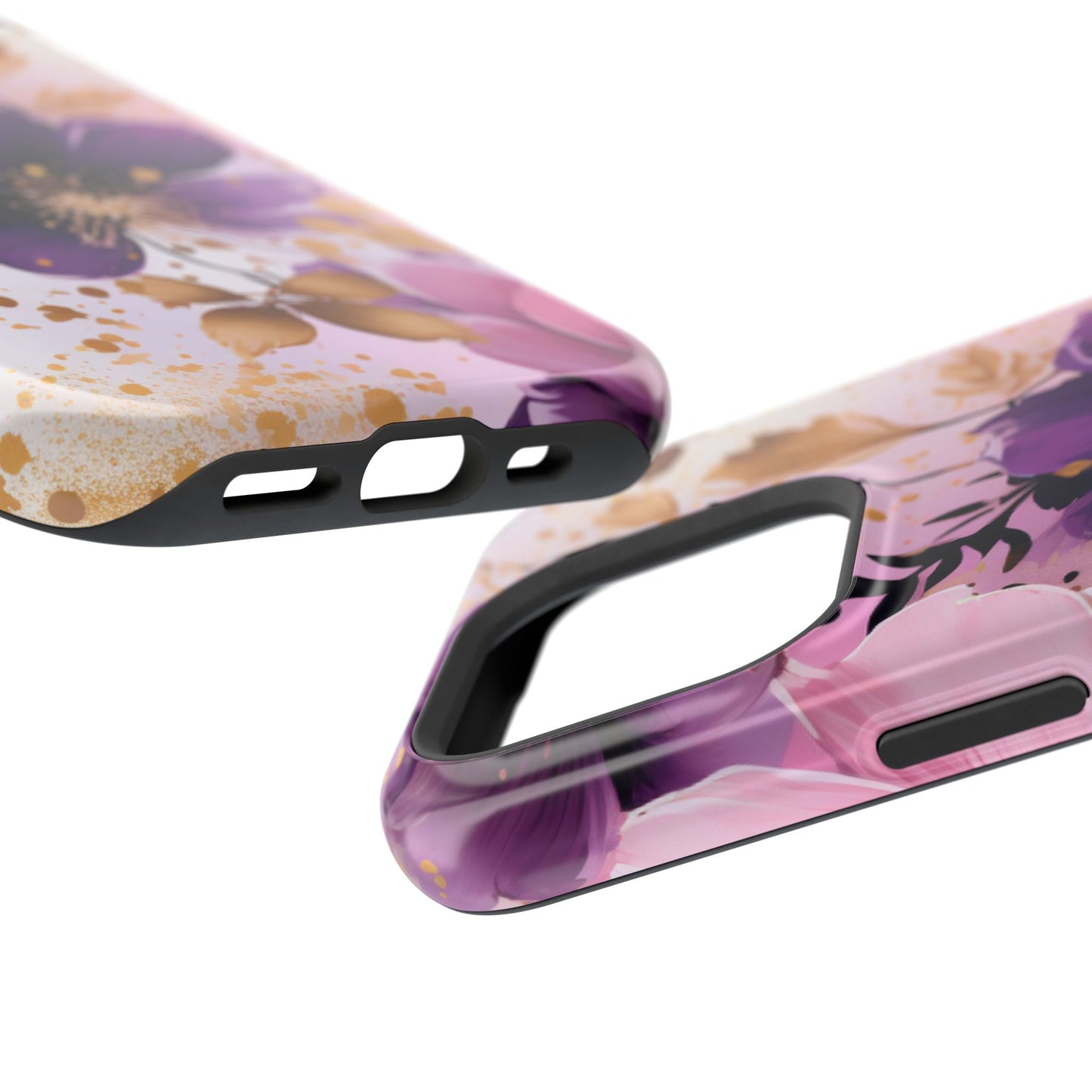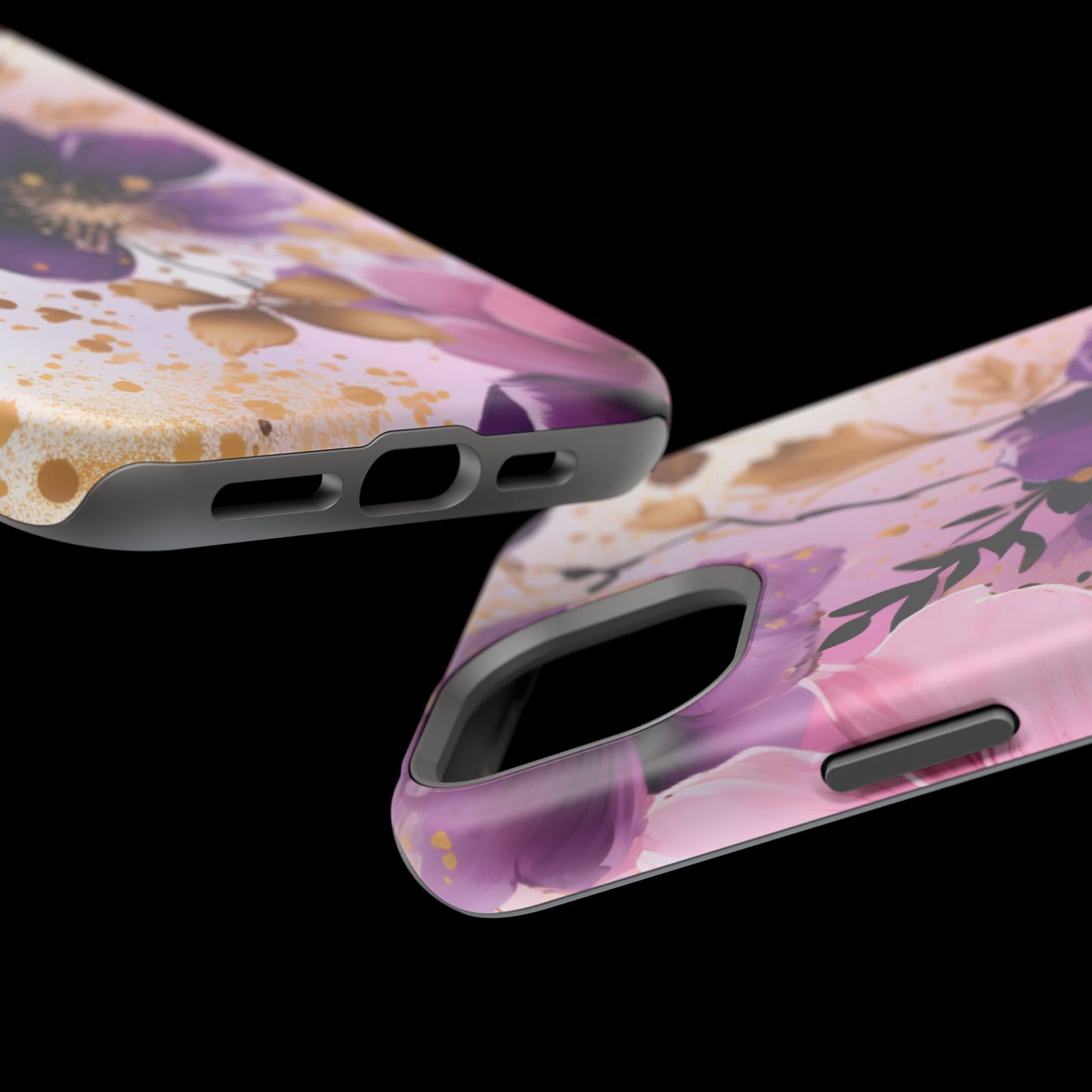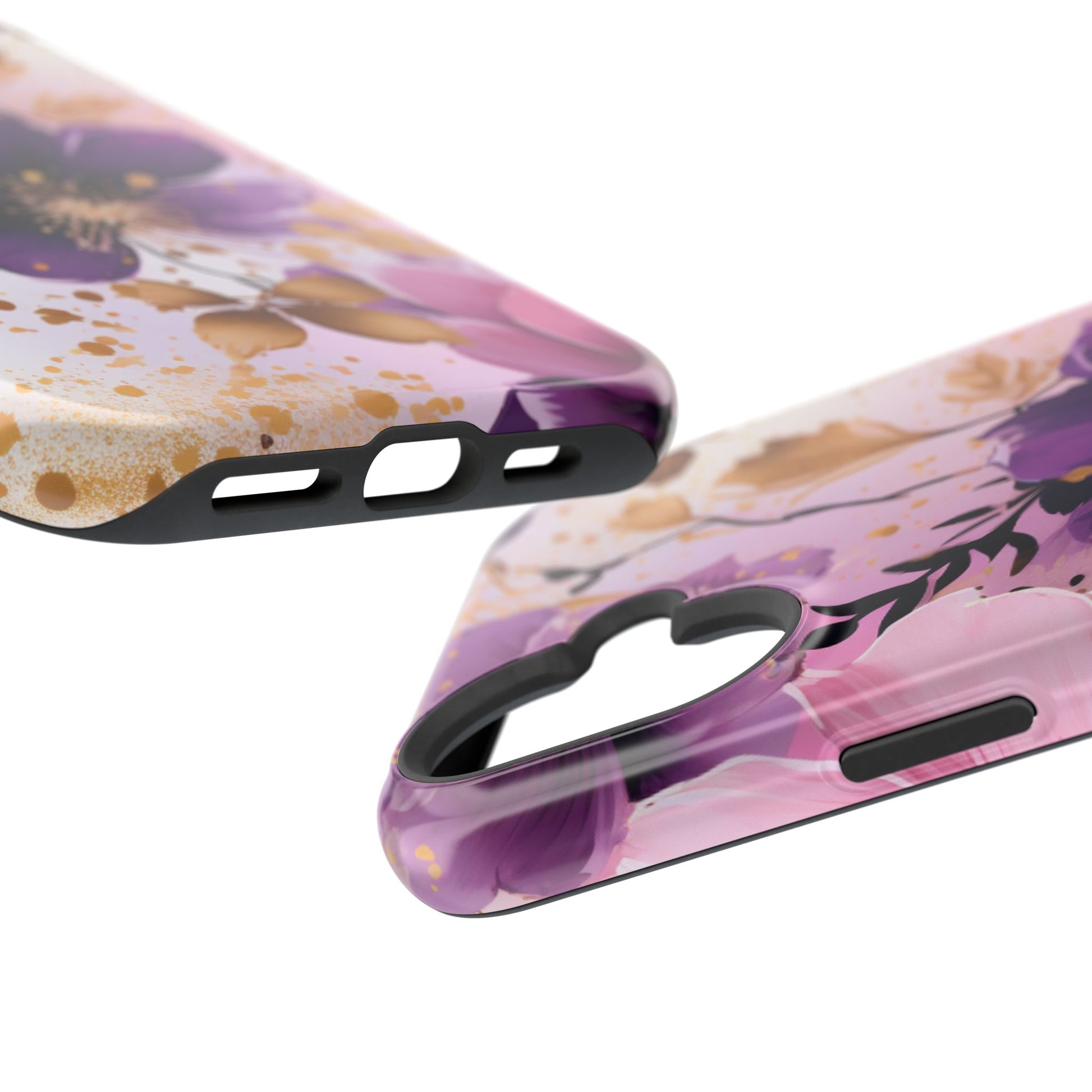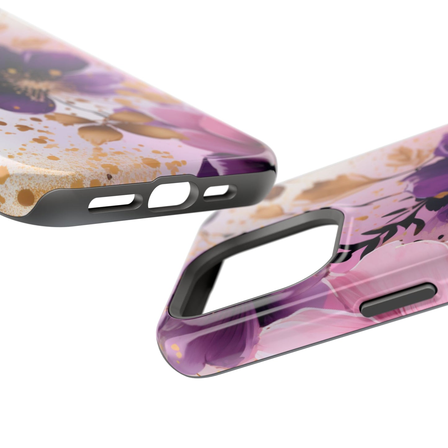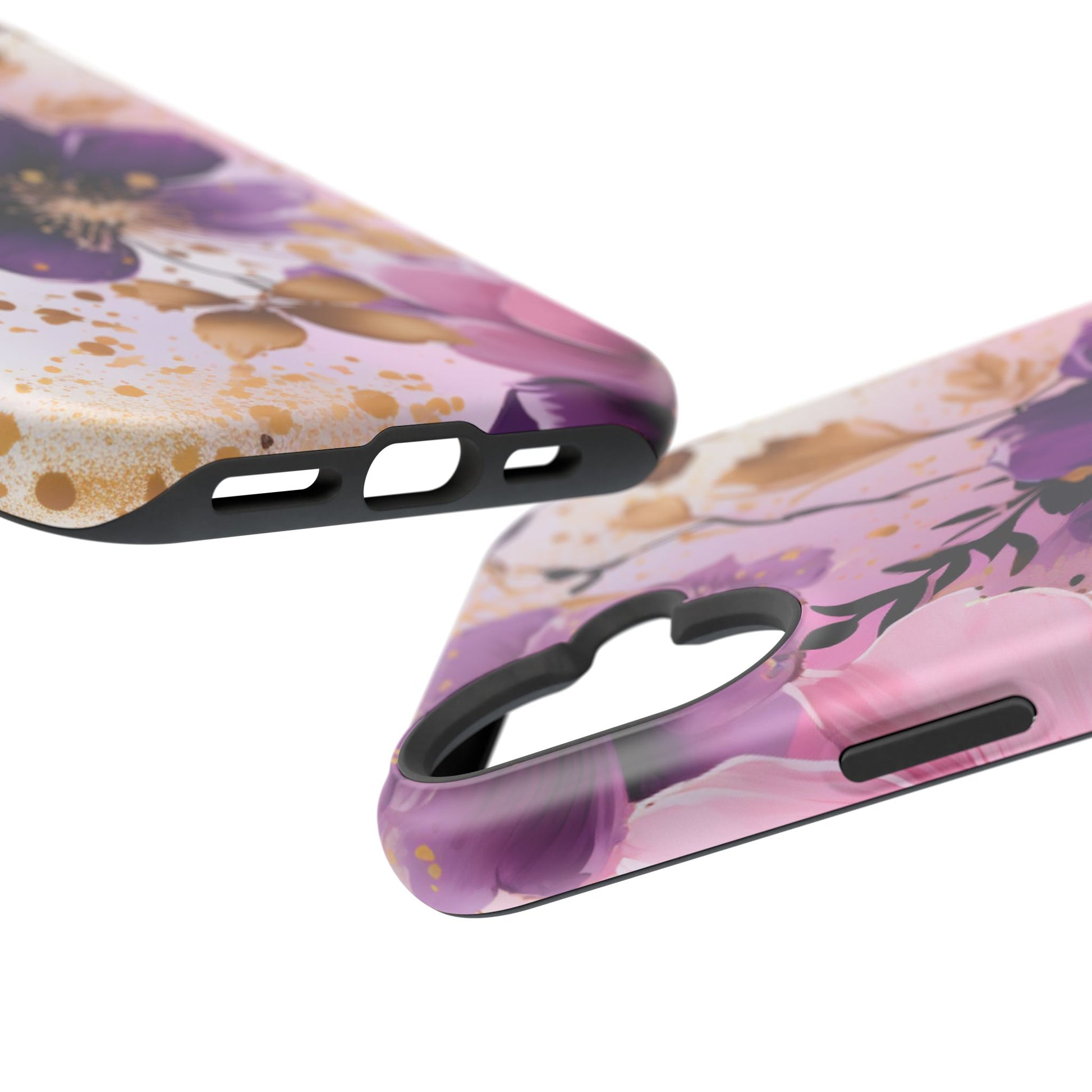 Elegant Purple & Gold Floral MagSafe iPhone Case - Luxe Flower Design