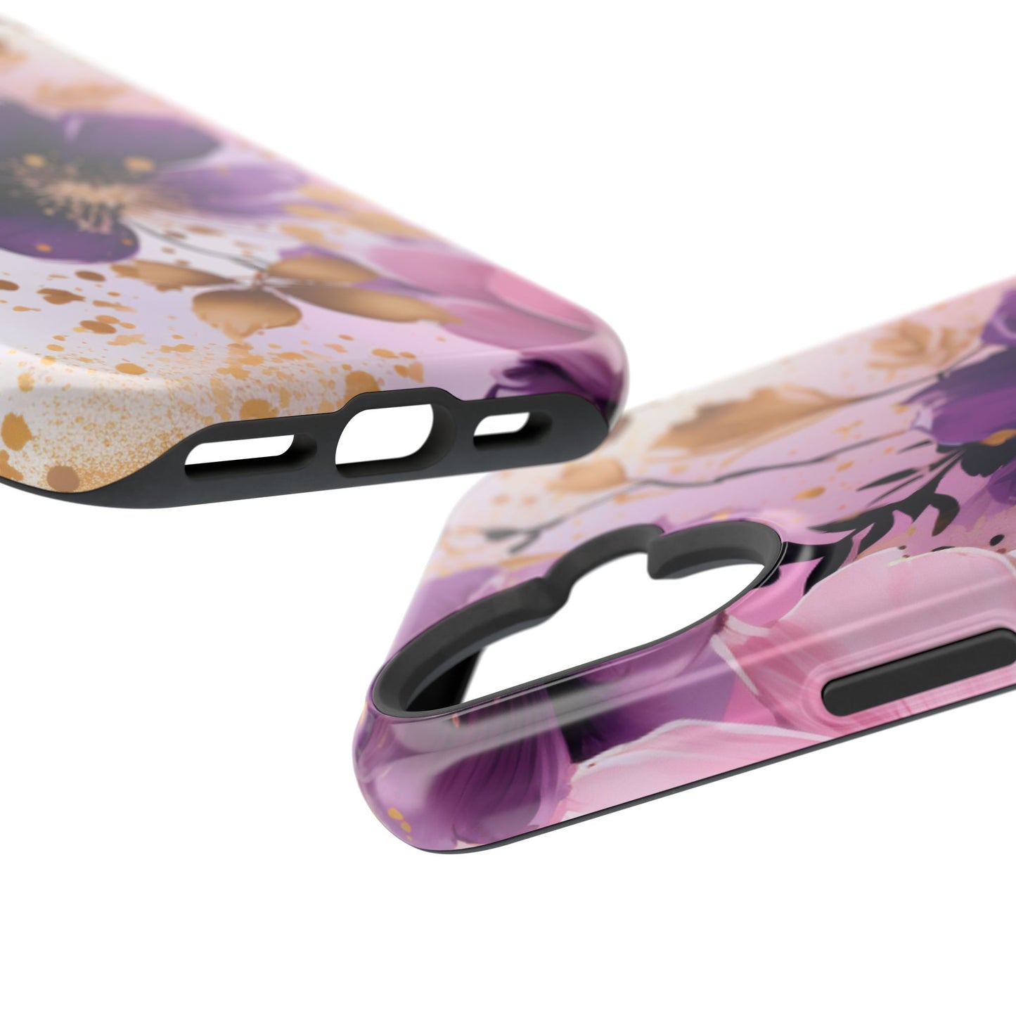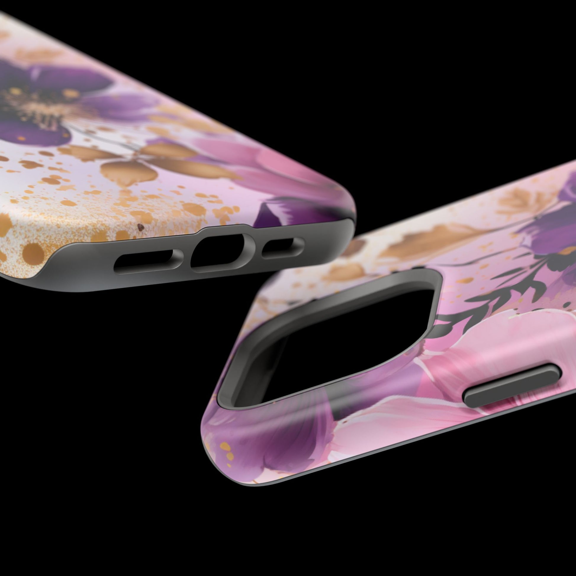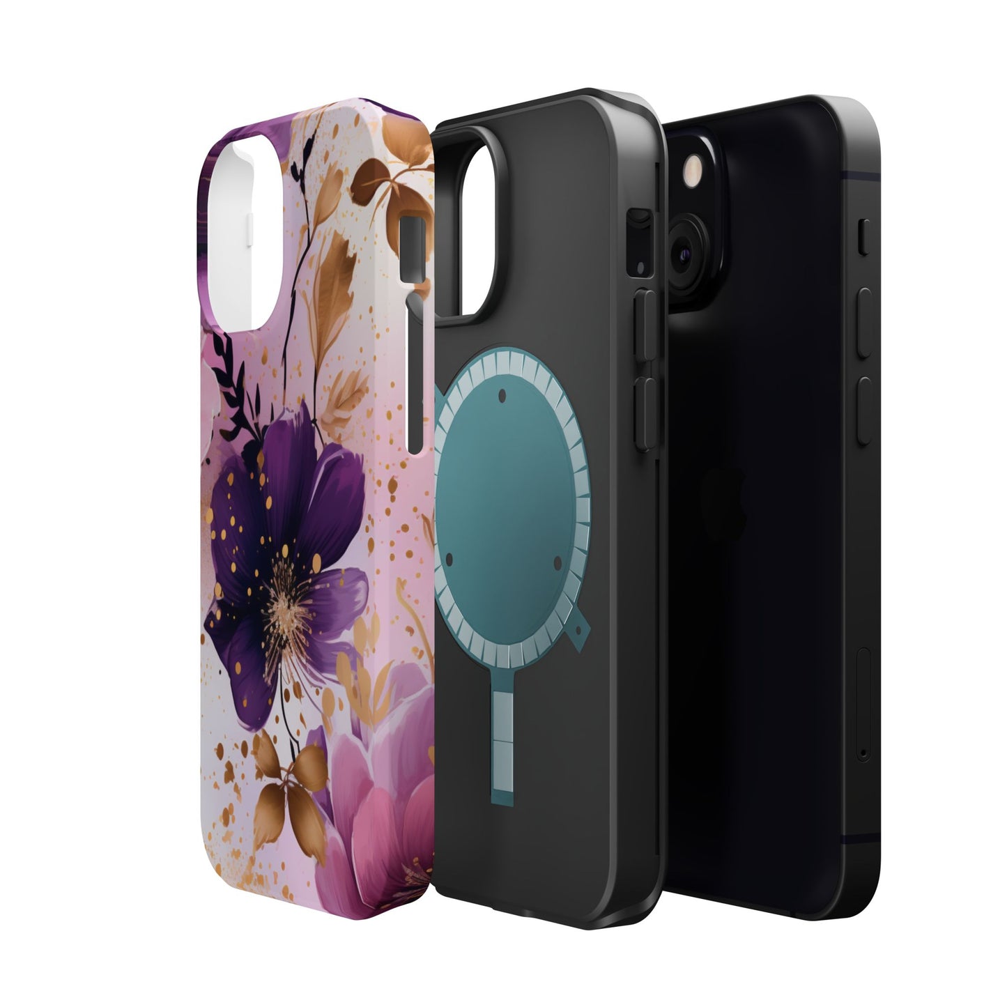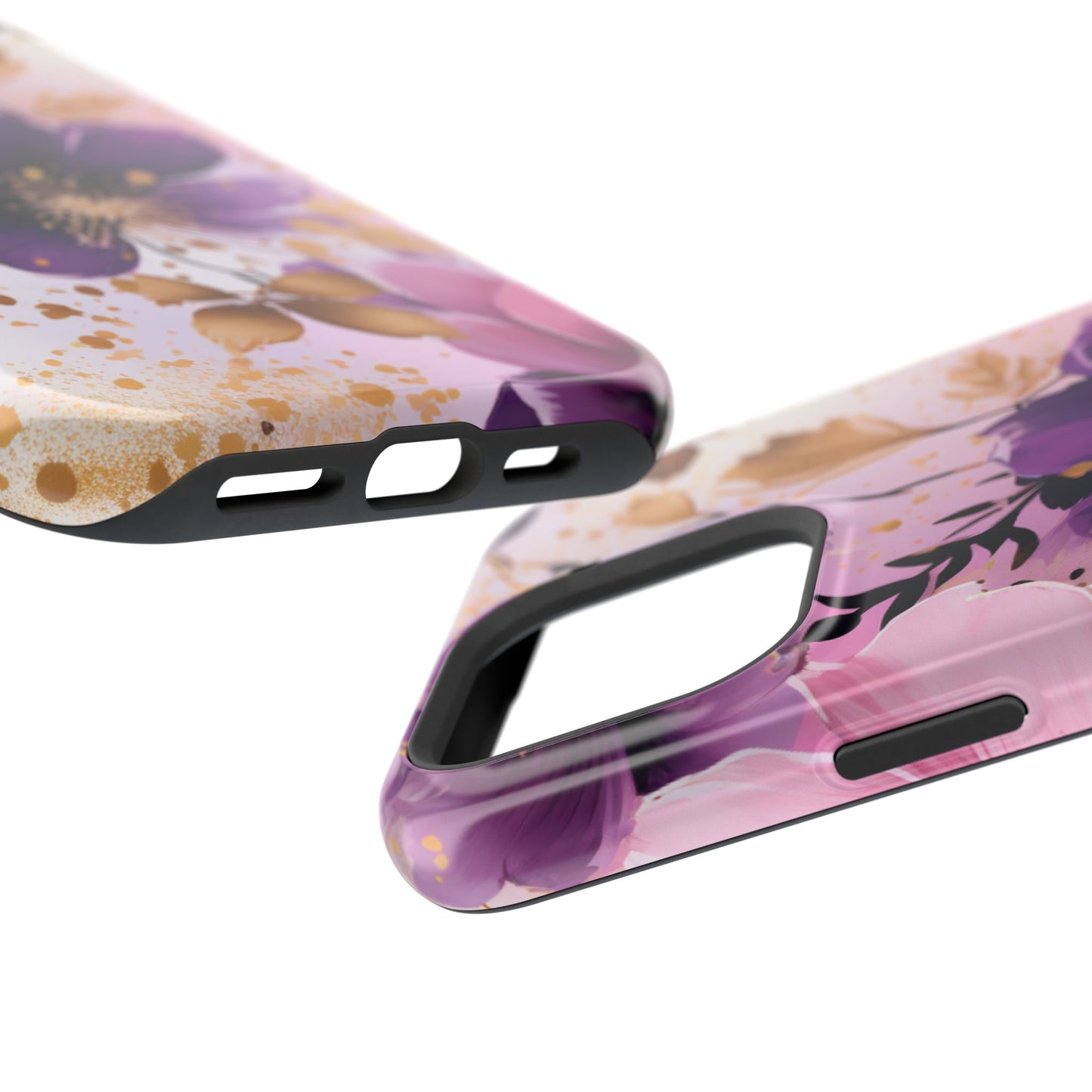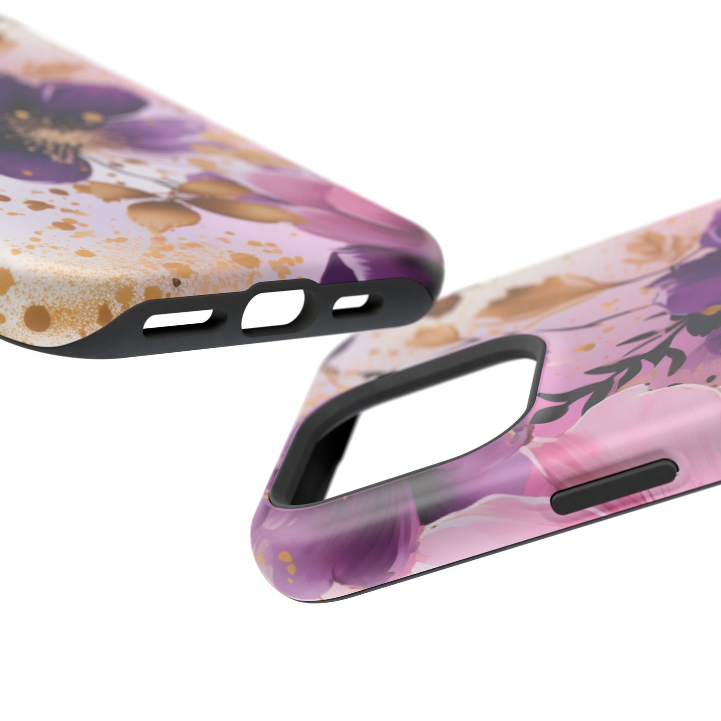 Elegant Purple & Gold Floral MagSafe iPhone Case - Luxe Flower Design
