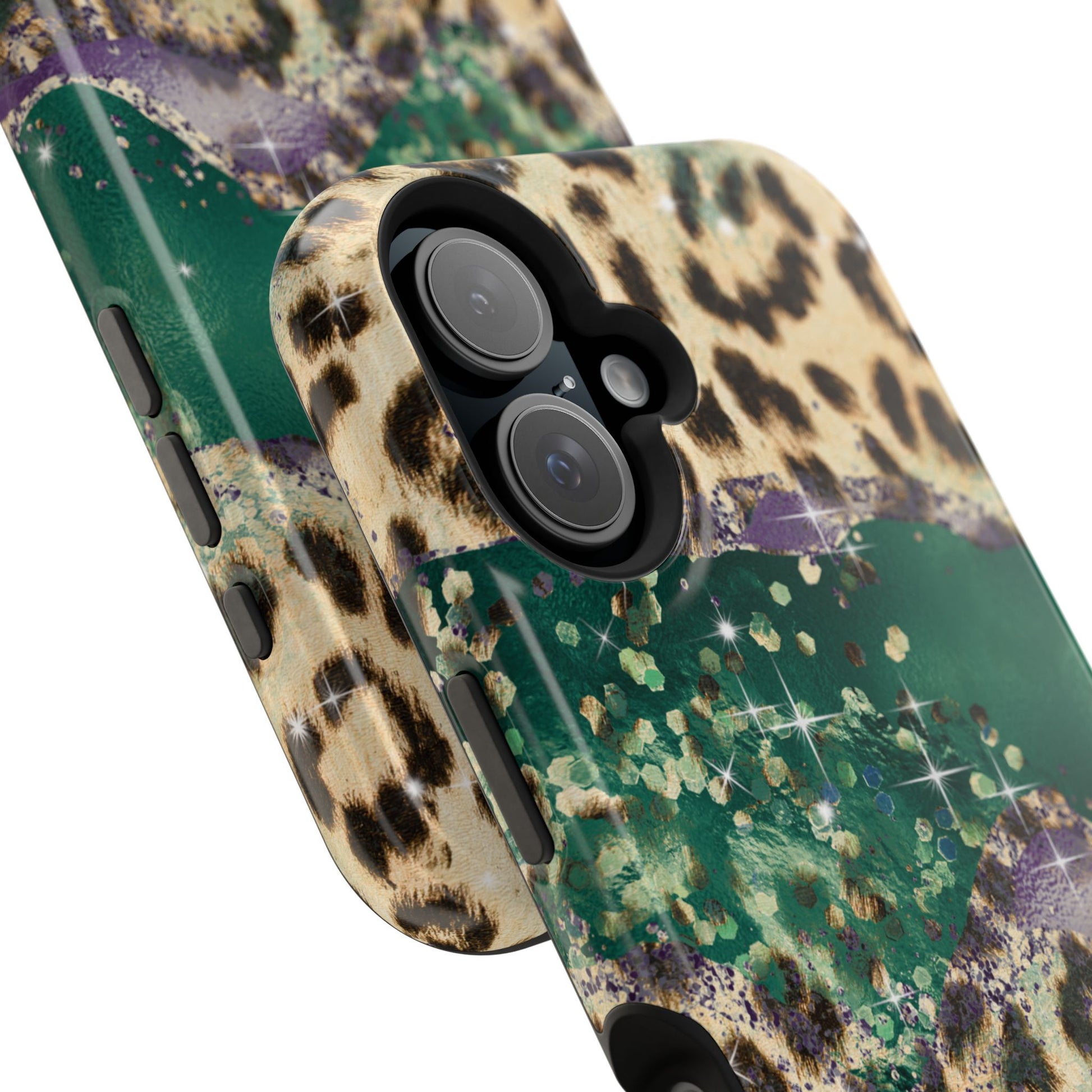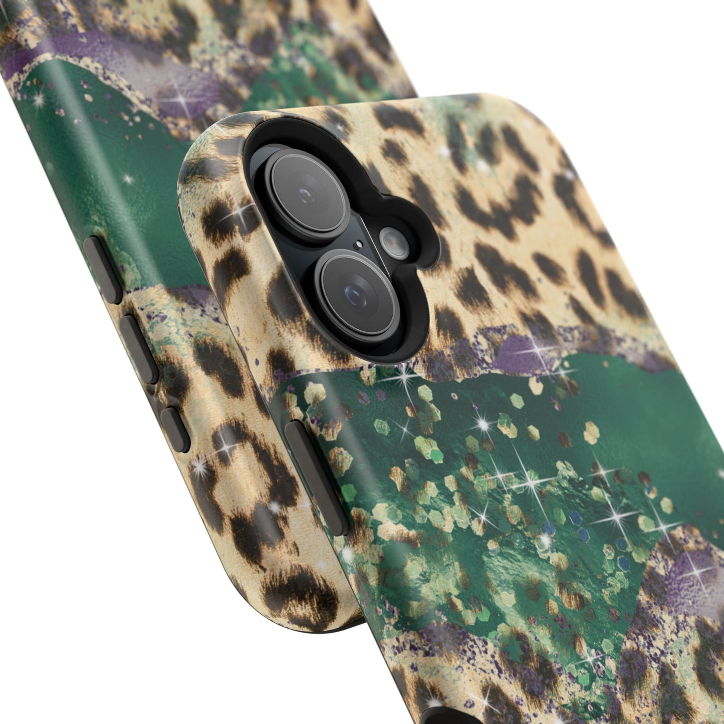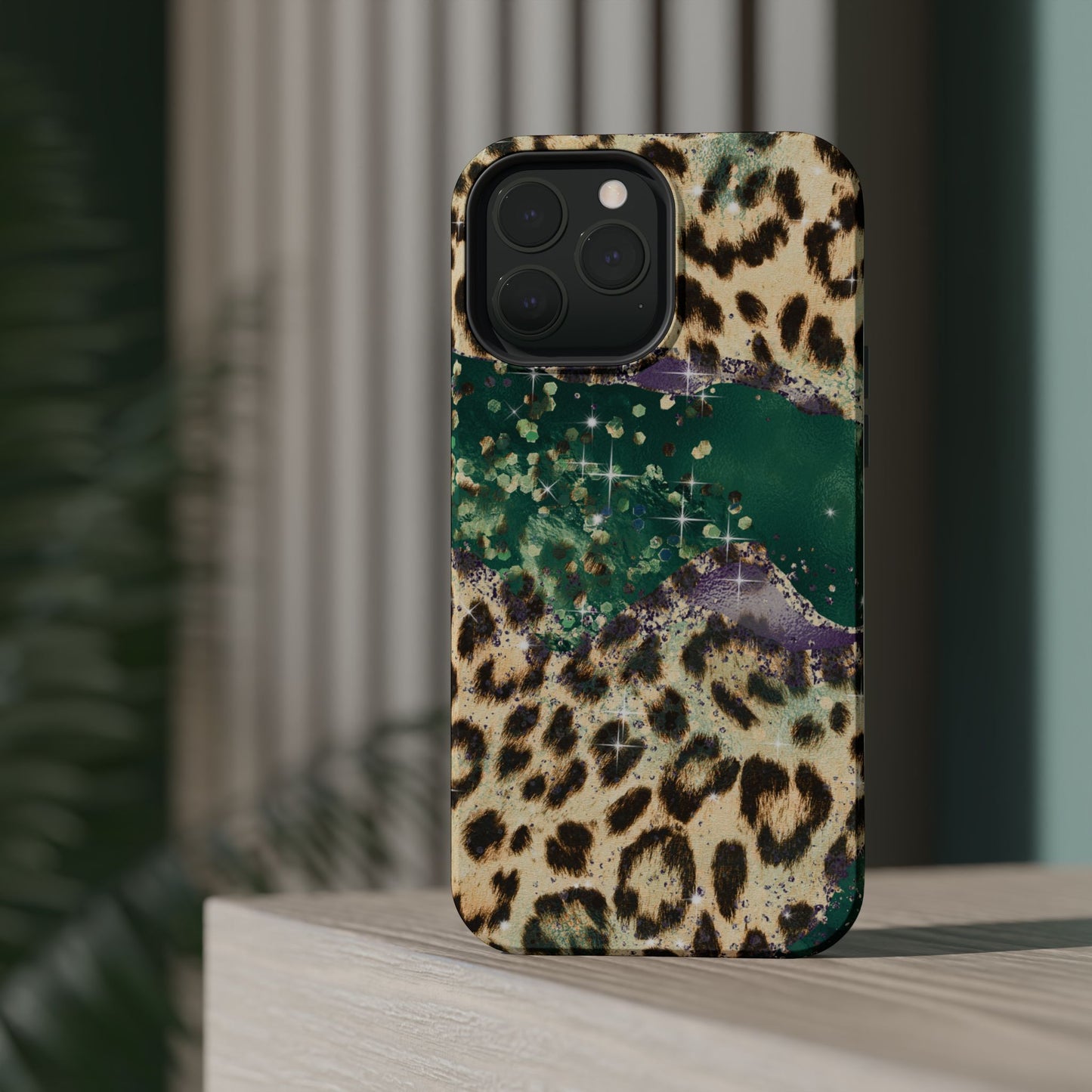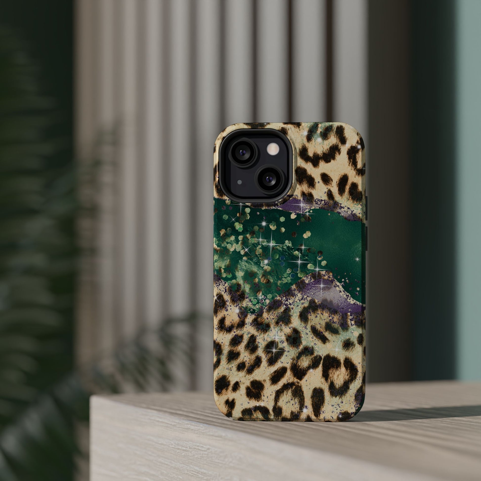 Unleash your wild side with our Emerald Glitter Leopard Print MagSafe iPhone Case! This fierce design features a chic mix of gold and black leopard spots overlaid with a shimmering emerald and purple glitter background. Perfect for those who love bold style, this case brings together animal pr...