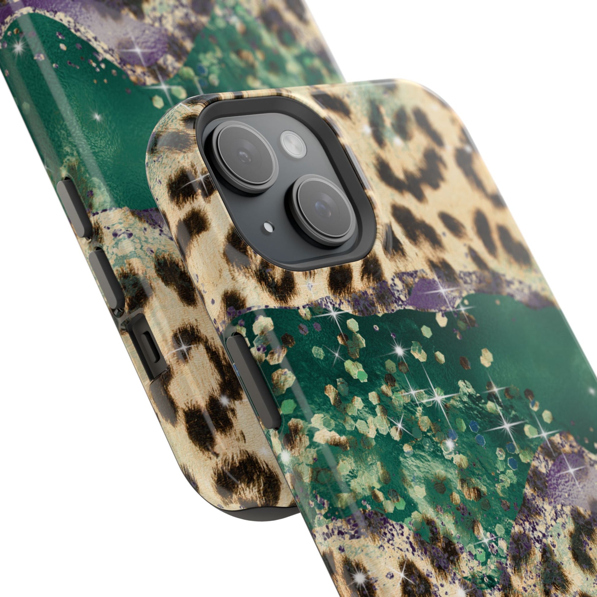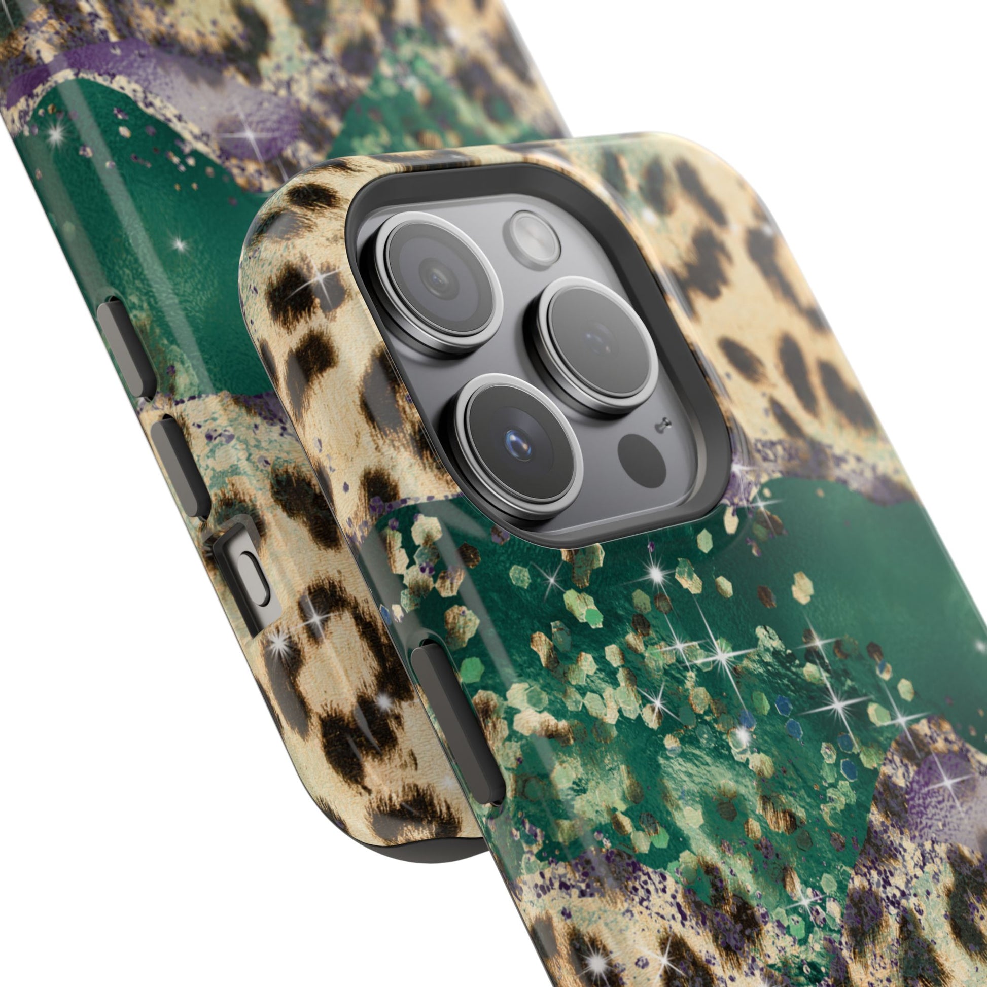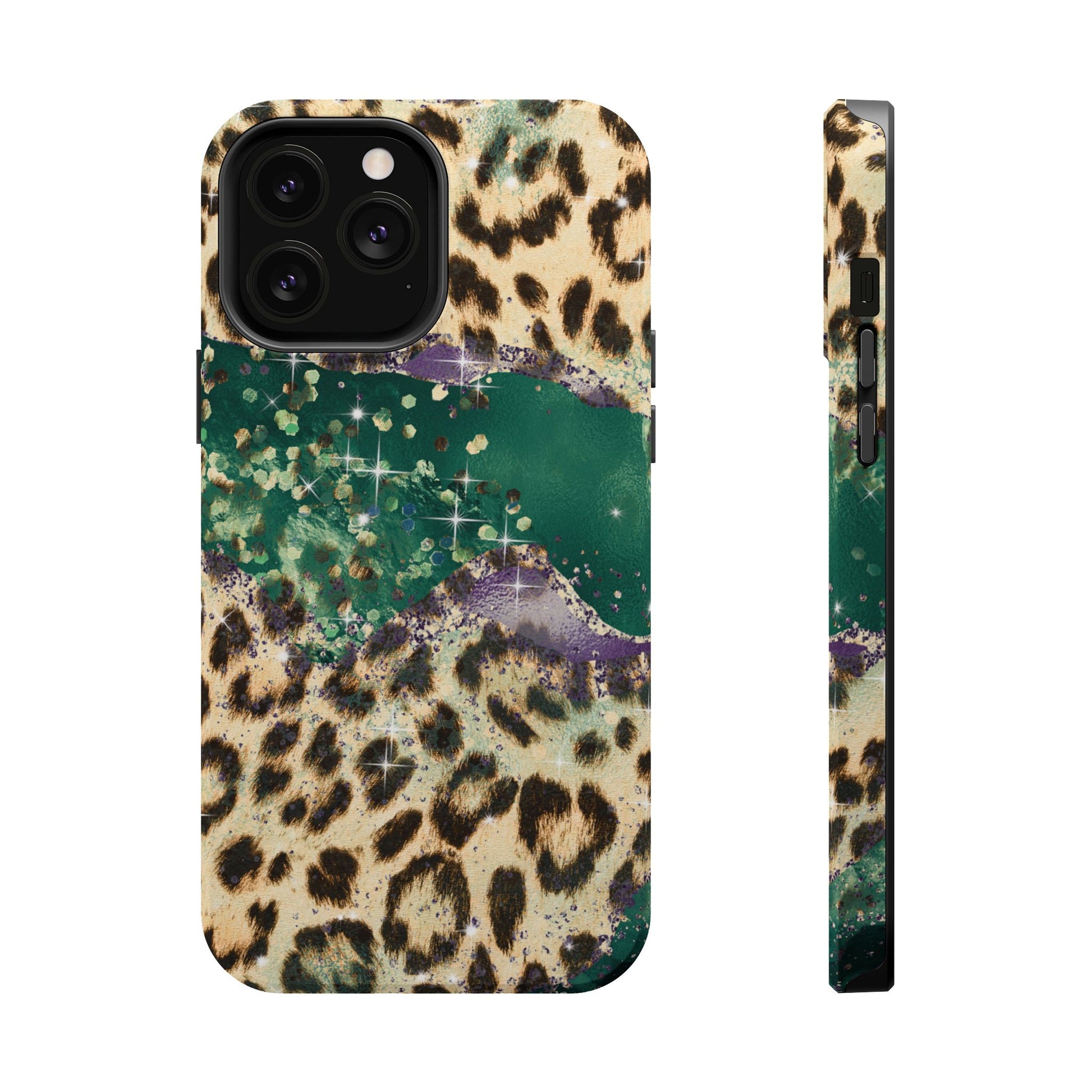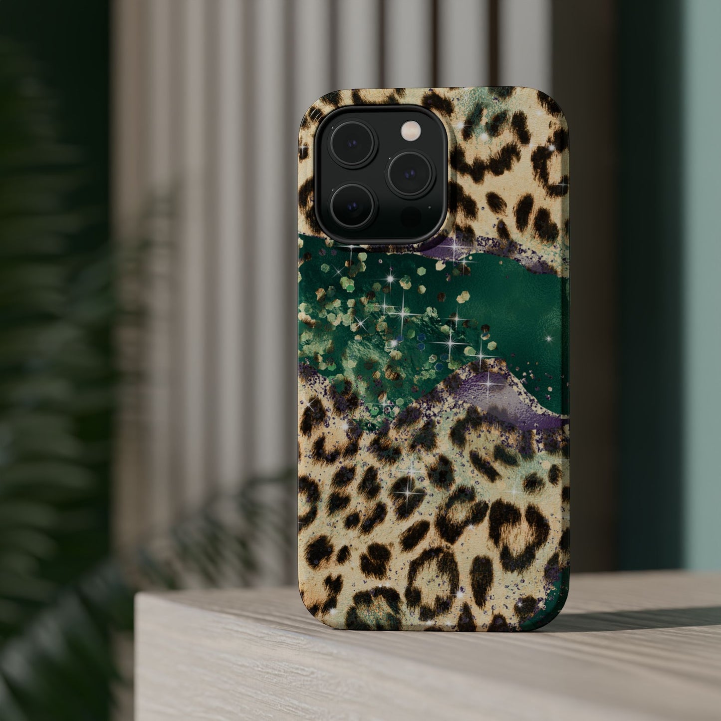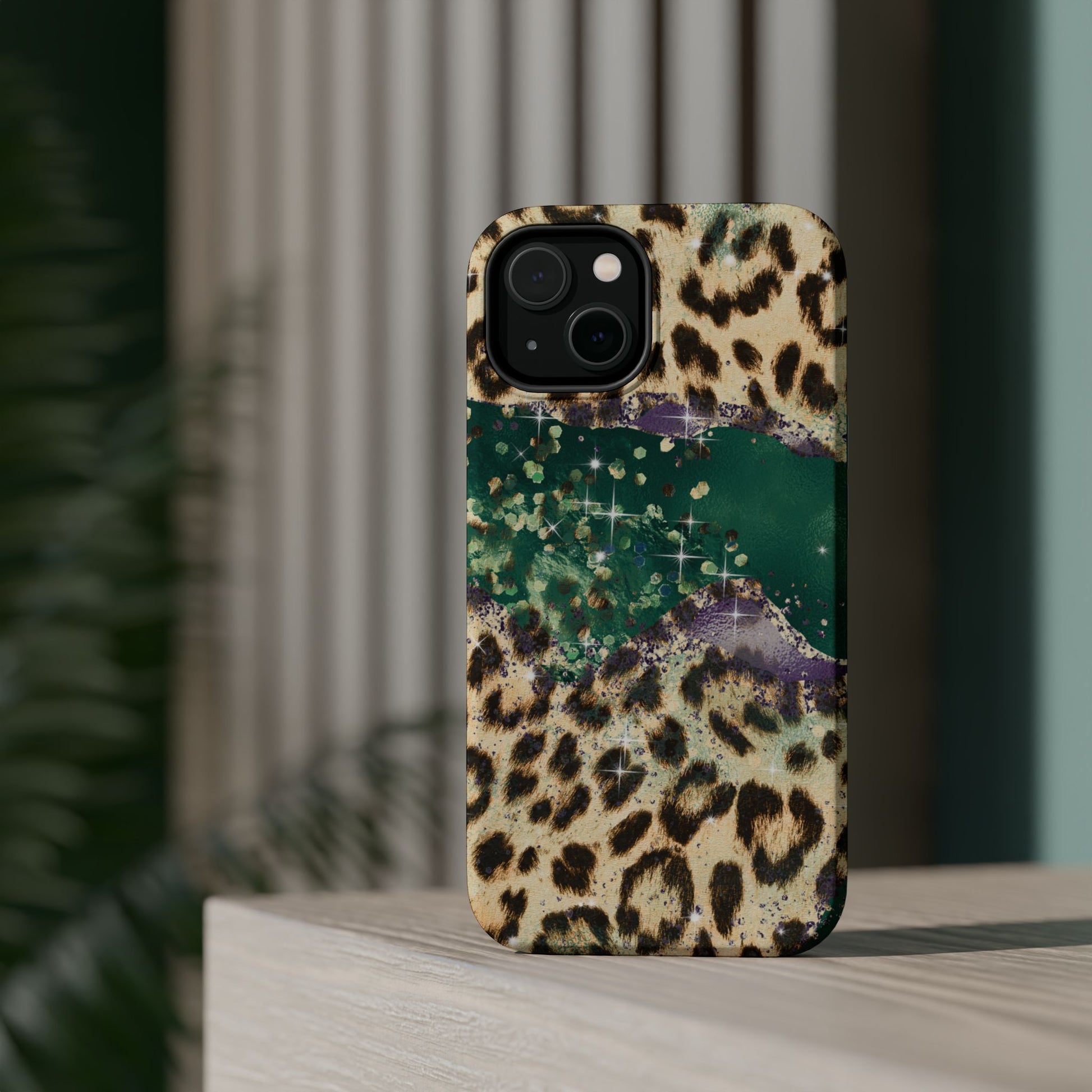 Unleash your wild side with our Emerald Glitter Leopard Print MagSafe iPhone Case! This fierce design features a chic mix of gold and black leopard spots overlaid with a shimmering emerald and purple glitter background. Perfect for those who love bold style, this case brings together animal pr...