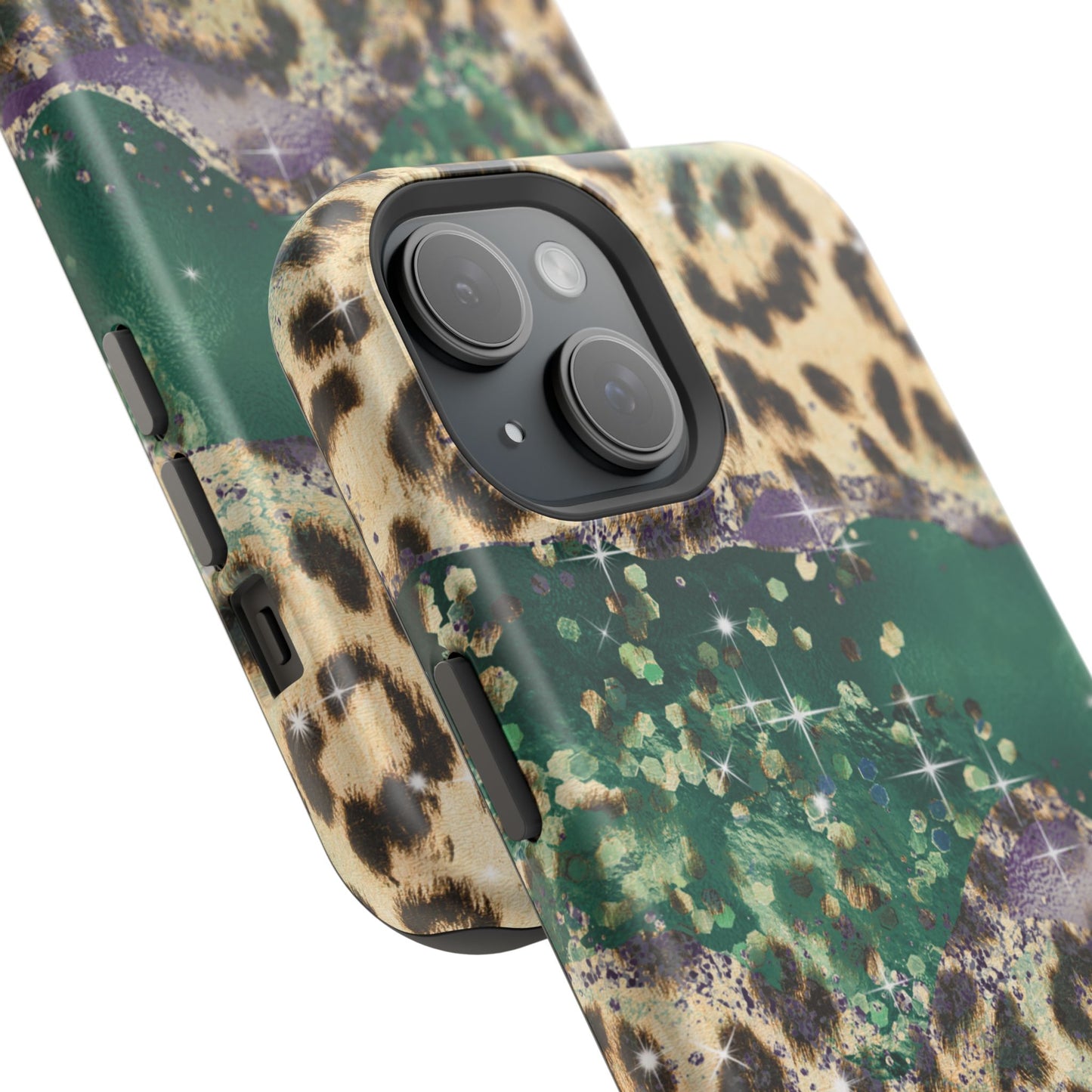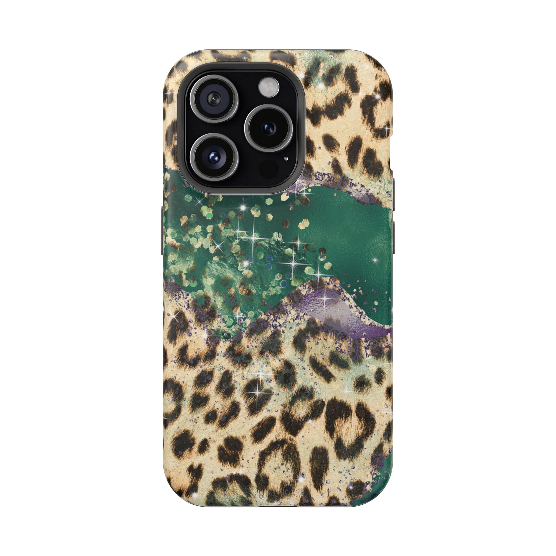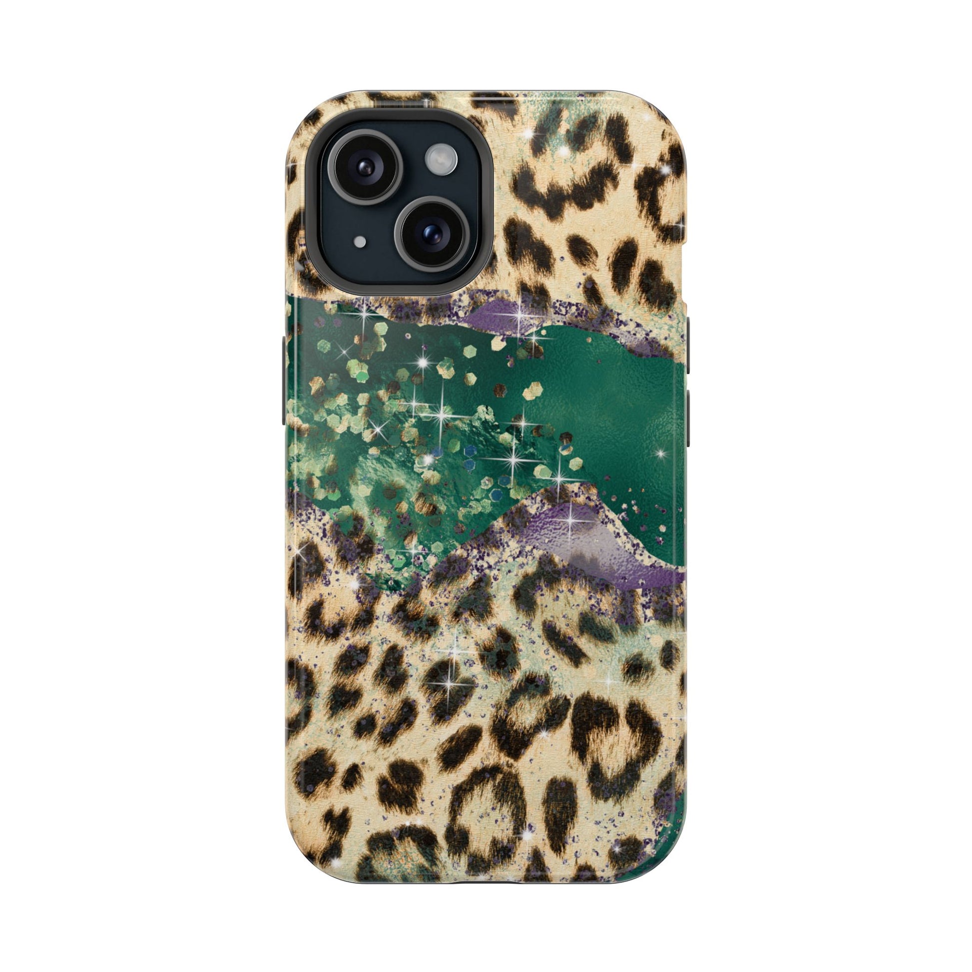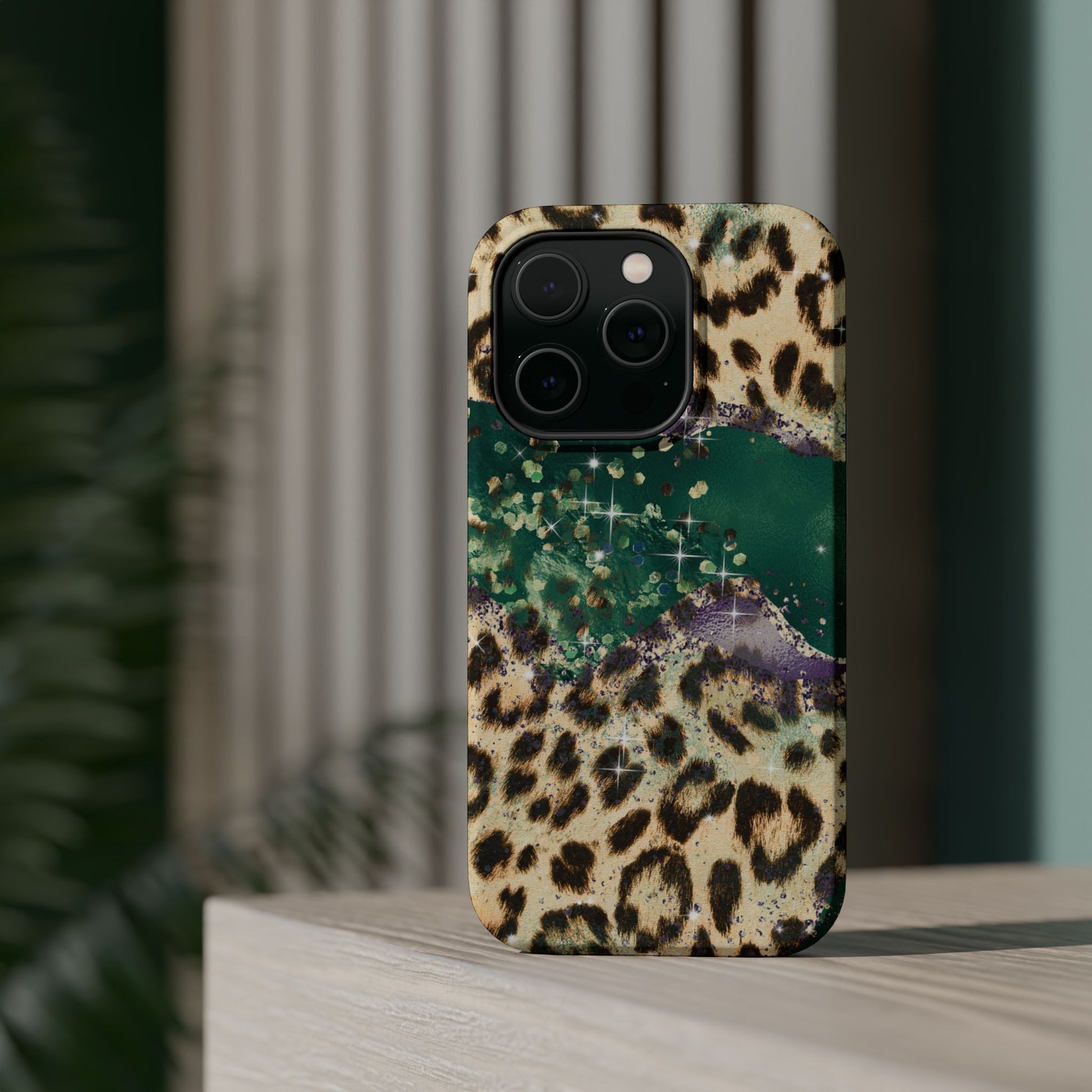 Unleash your wild side with our Emerald Glitter Leopard Print MagSafe iPhone Case! This fierce design features a chic mix of gold and black leopard spots overlaid with a shimmering emerald and purple glitter background. Perfect for those who love bold style, this case brings together animal pr...