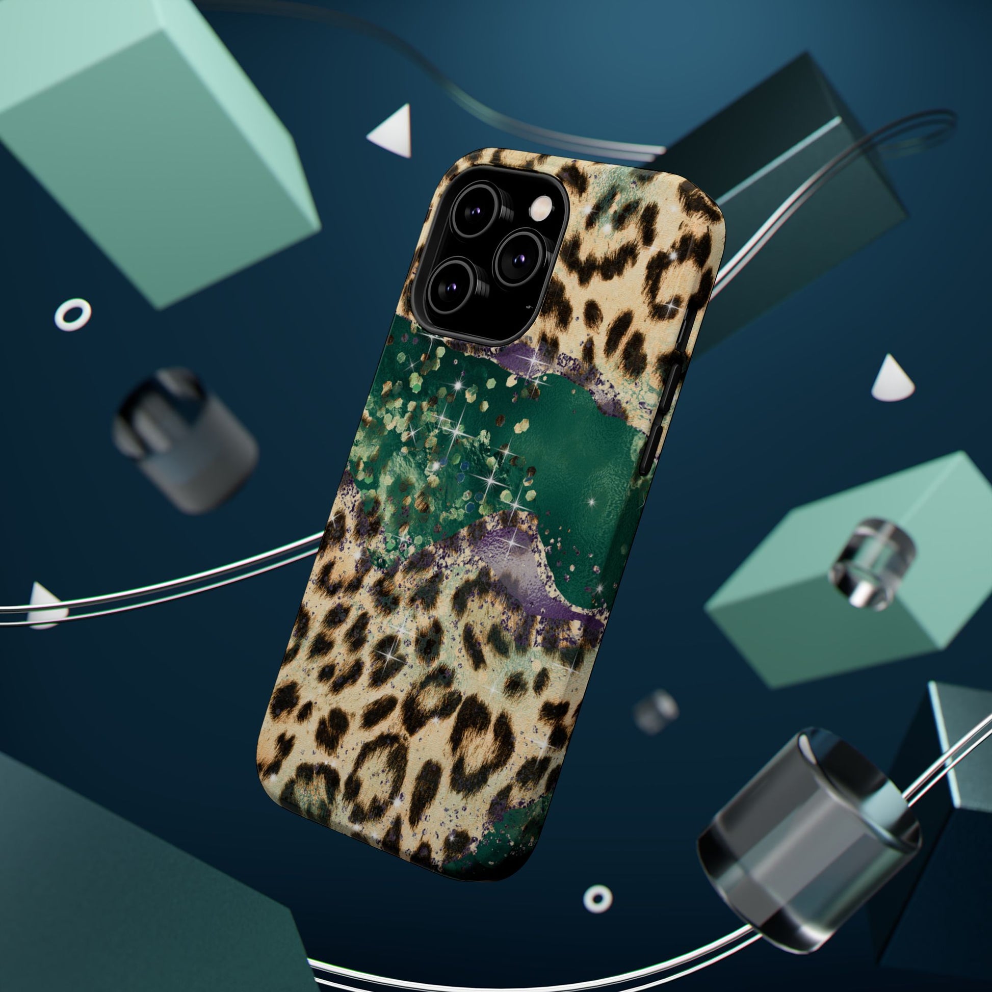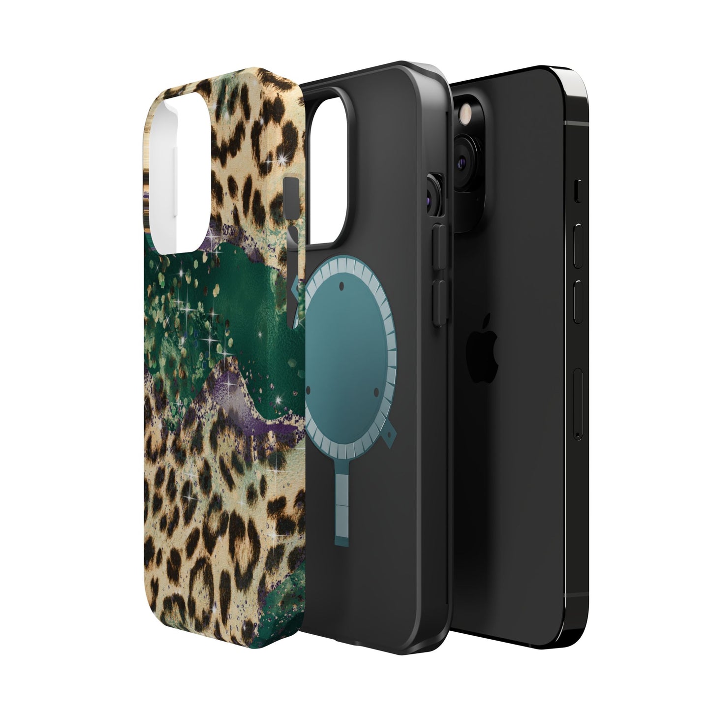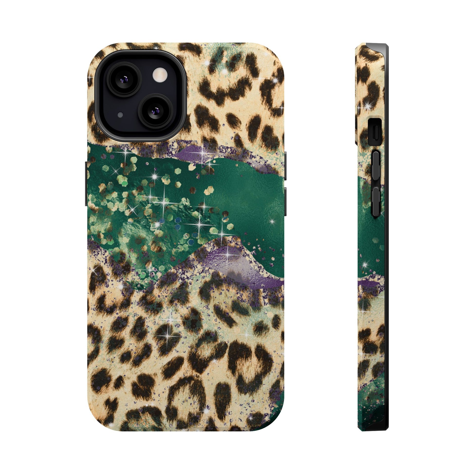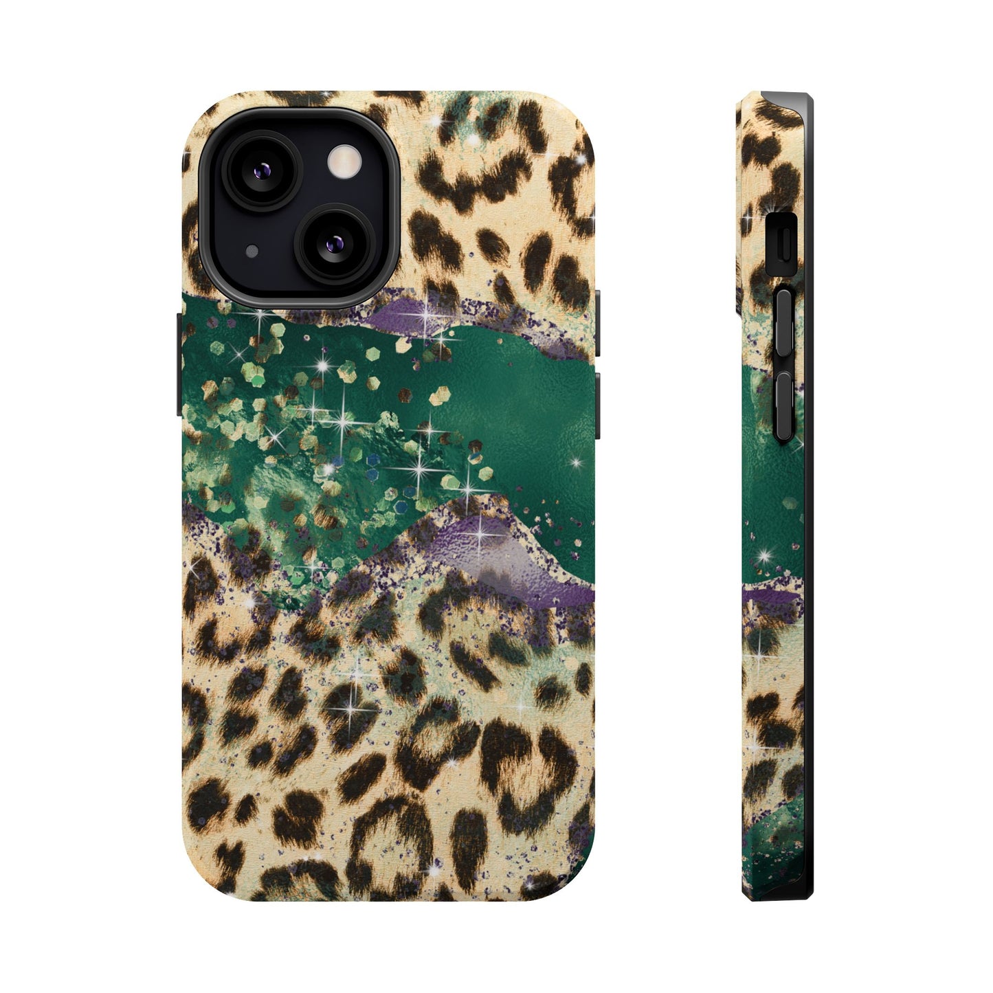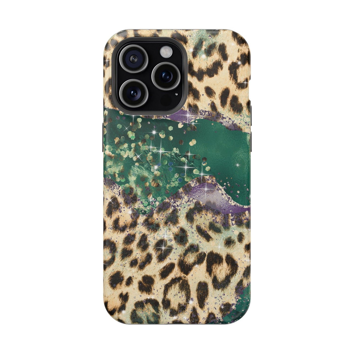 Unleash your wild side with our Emerald Glitter Leopard Print MagSafe iPhone Case! This fierce design features a chic mix of gold and black leopard spots overlaid with a shimmering emerald and purple glitter background. Perfect for those who love bold style, this case brings together animal pr...