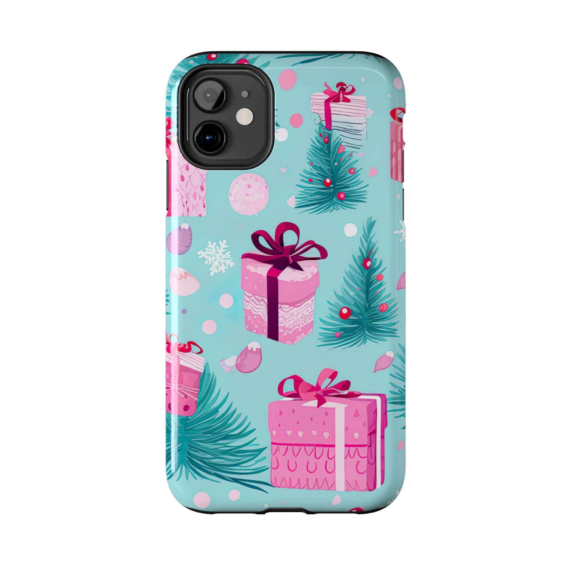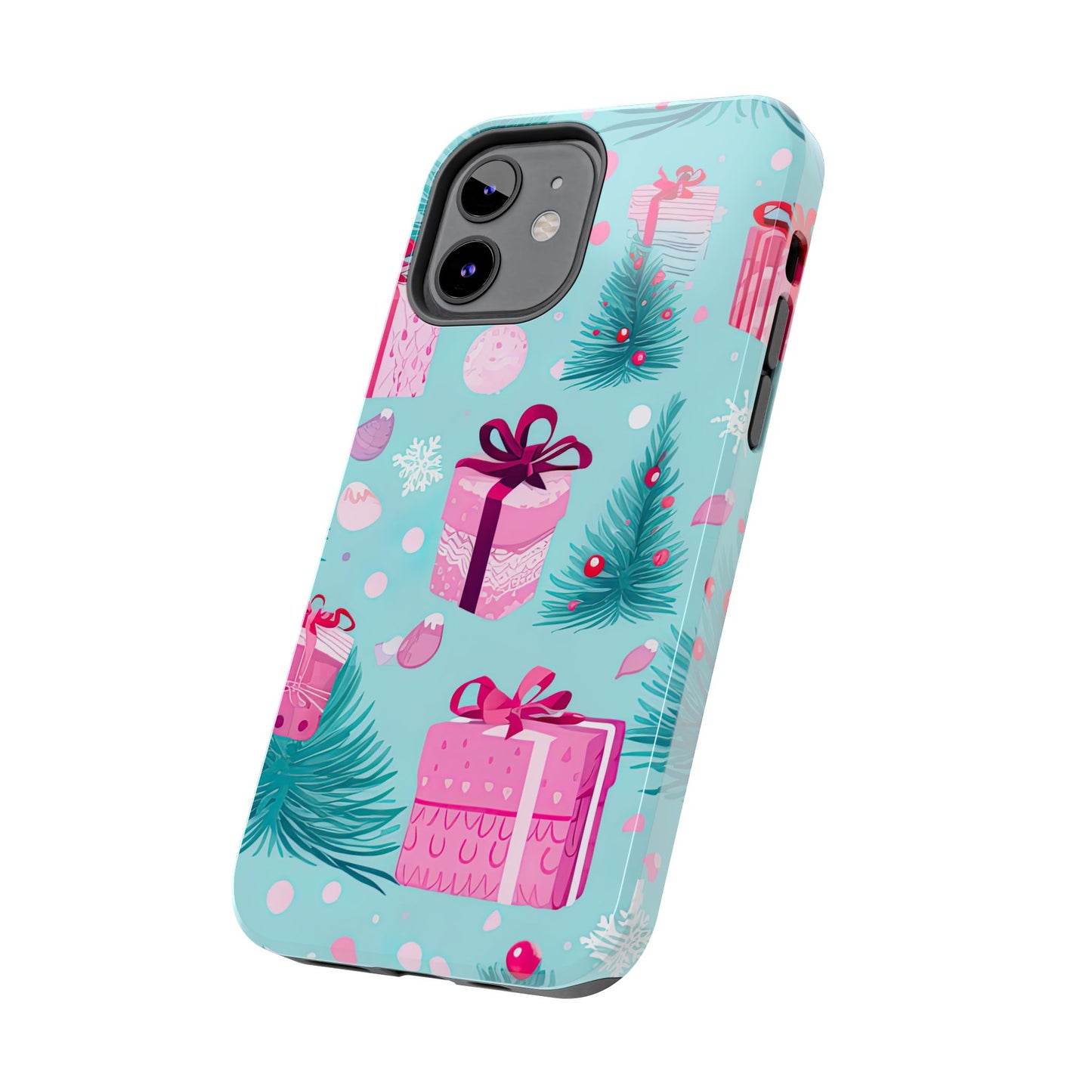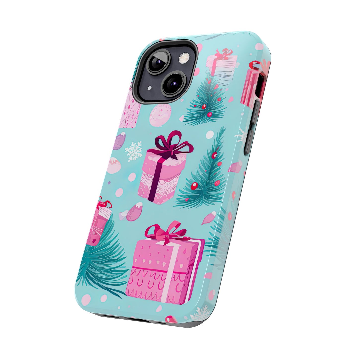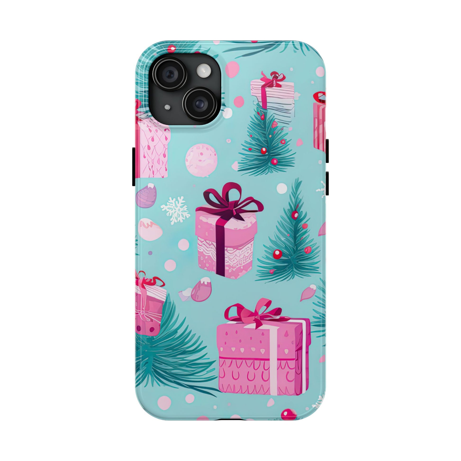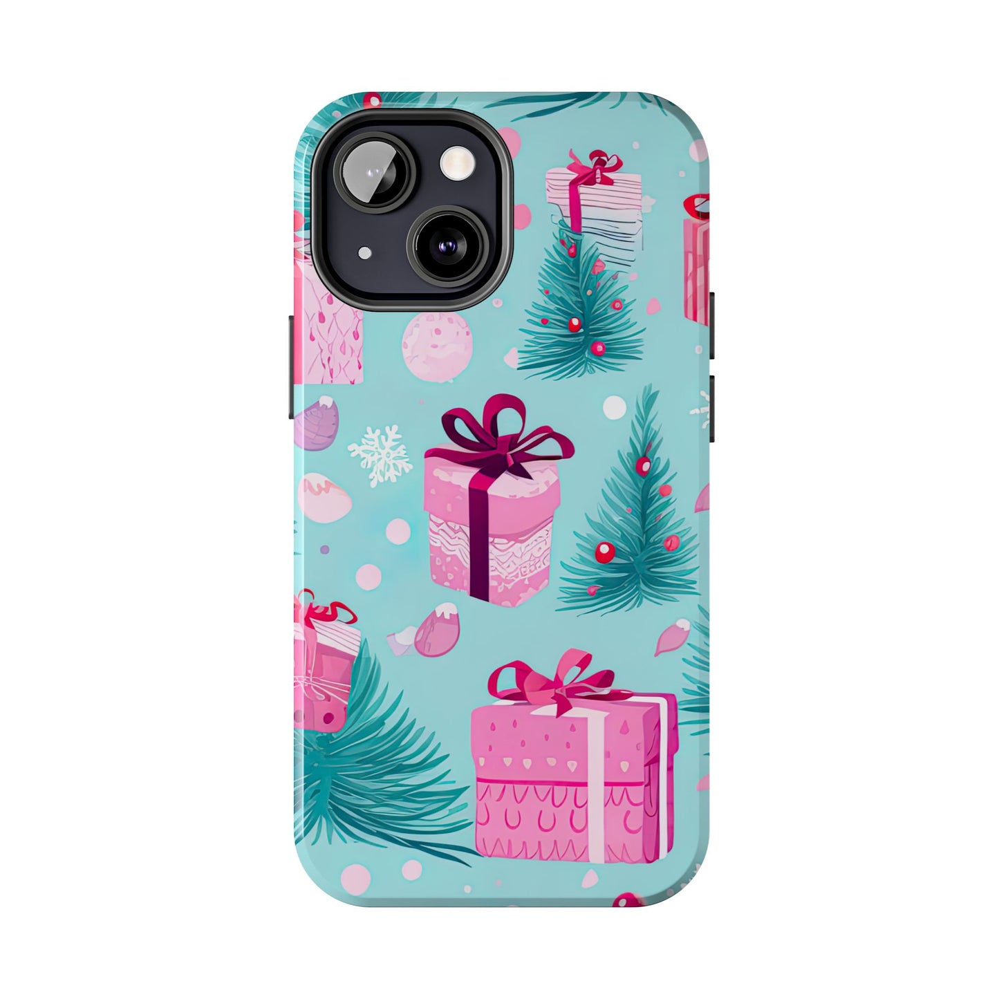 Get into the holiday spirit with this charming Festive Pink Christmas Gifts and Evergreen iPhone Case! Featuring a delightful pattern of pink-wrapped presents, lush green fir branches, and wintery snowflakes on a bright turquoise background, this case brings a touch of festive cheer to your phone. Perfect for adding a seasonal vibe to your everyday tech, it offers durable protection while showcasing a playful holiday aesthetic. Ideal for Christmas lovers who want to keep their holiday spirit close, even on the go!