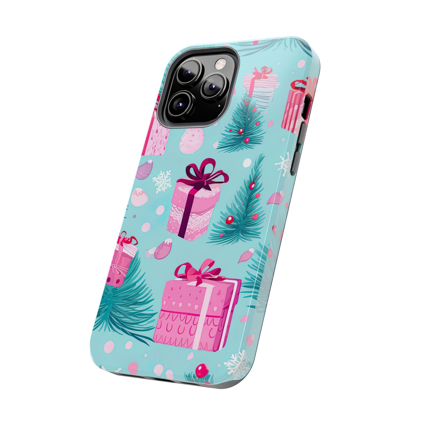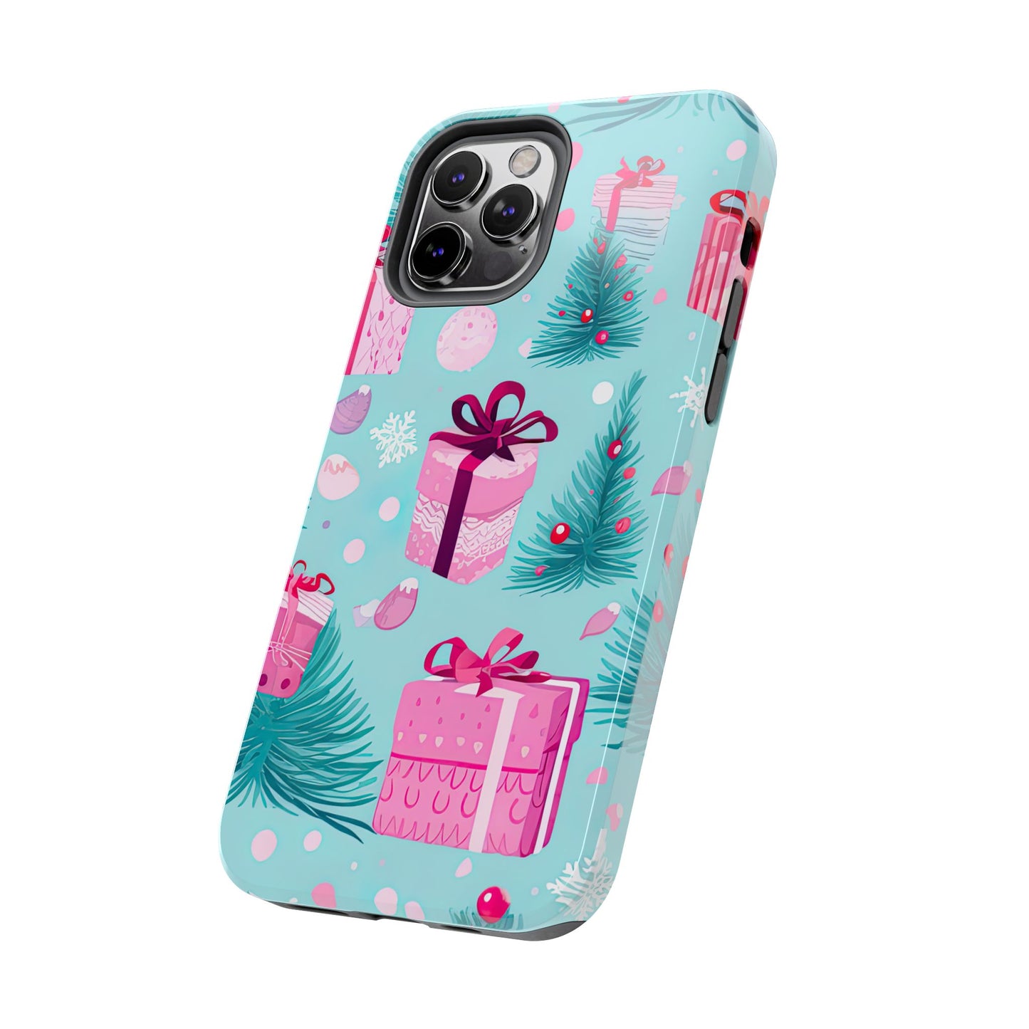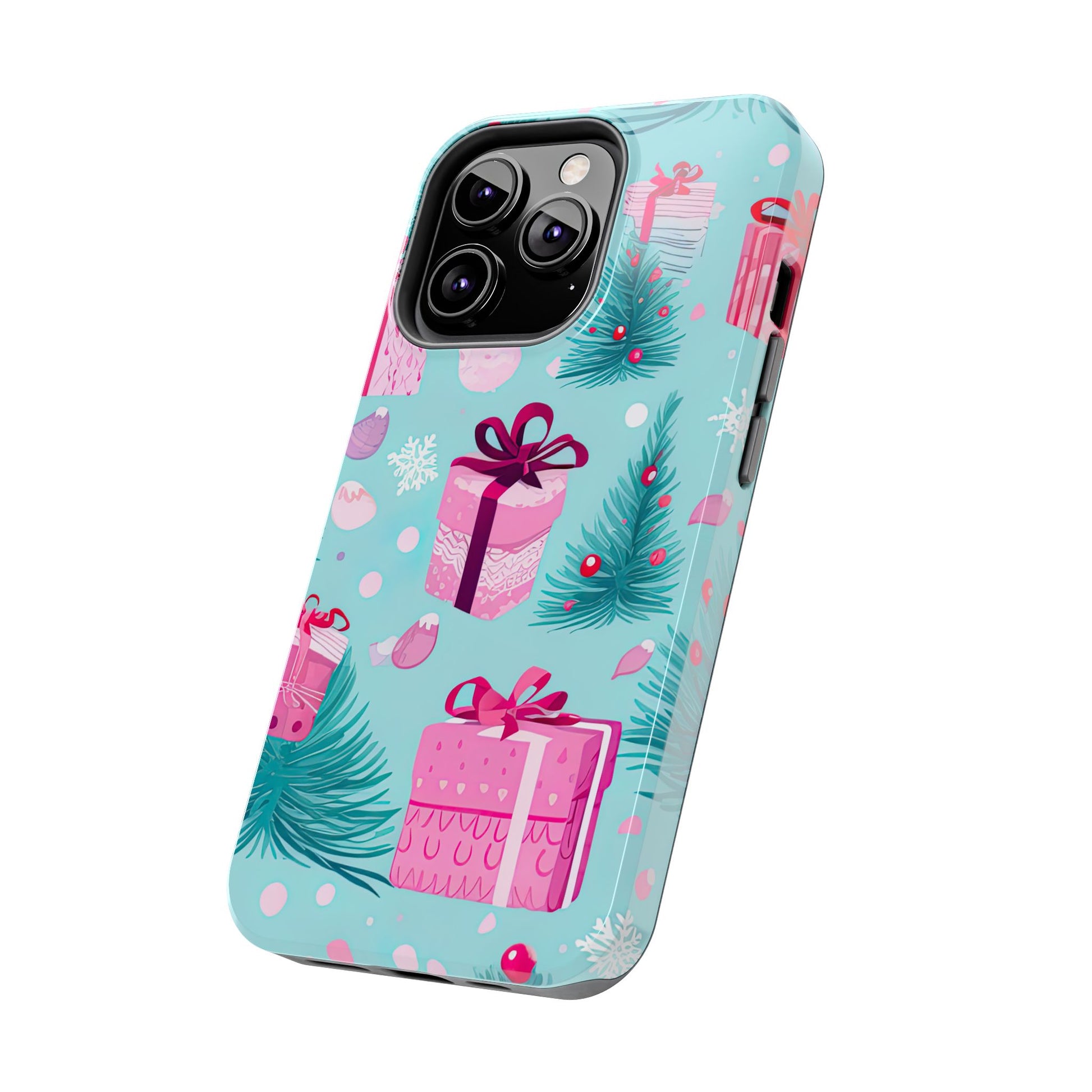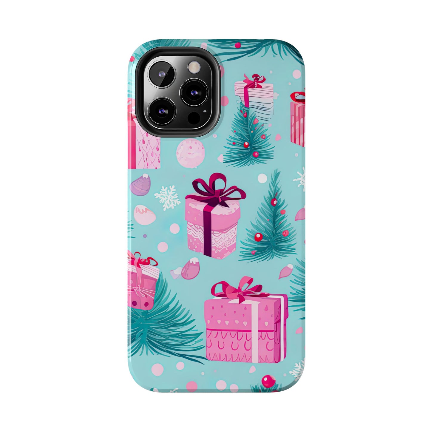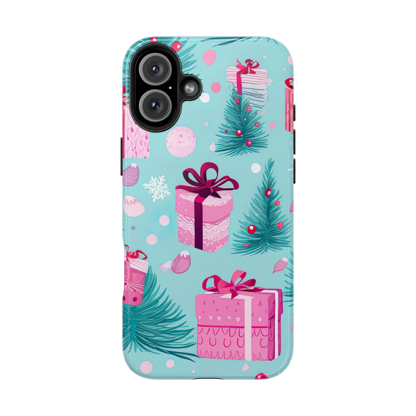 Get into the holiday spirit with this charming Festive Pink Christmas Gifts and Evergreen iPhone Case! Featuring a delightful pattern of pink-wrapped presents, lush green fir branches, and wintery snowflakes on a bright turquoise background, this case brings a touch of festive cheer to your phone. Perfect for adding a seasonal vibe to your everyday tech, it offers durable protection while showcasing a playful holiday aesthetic. Ideal for Christmas lovers who want to keep their holiday spirit close, even on the go!