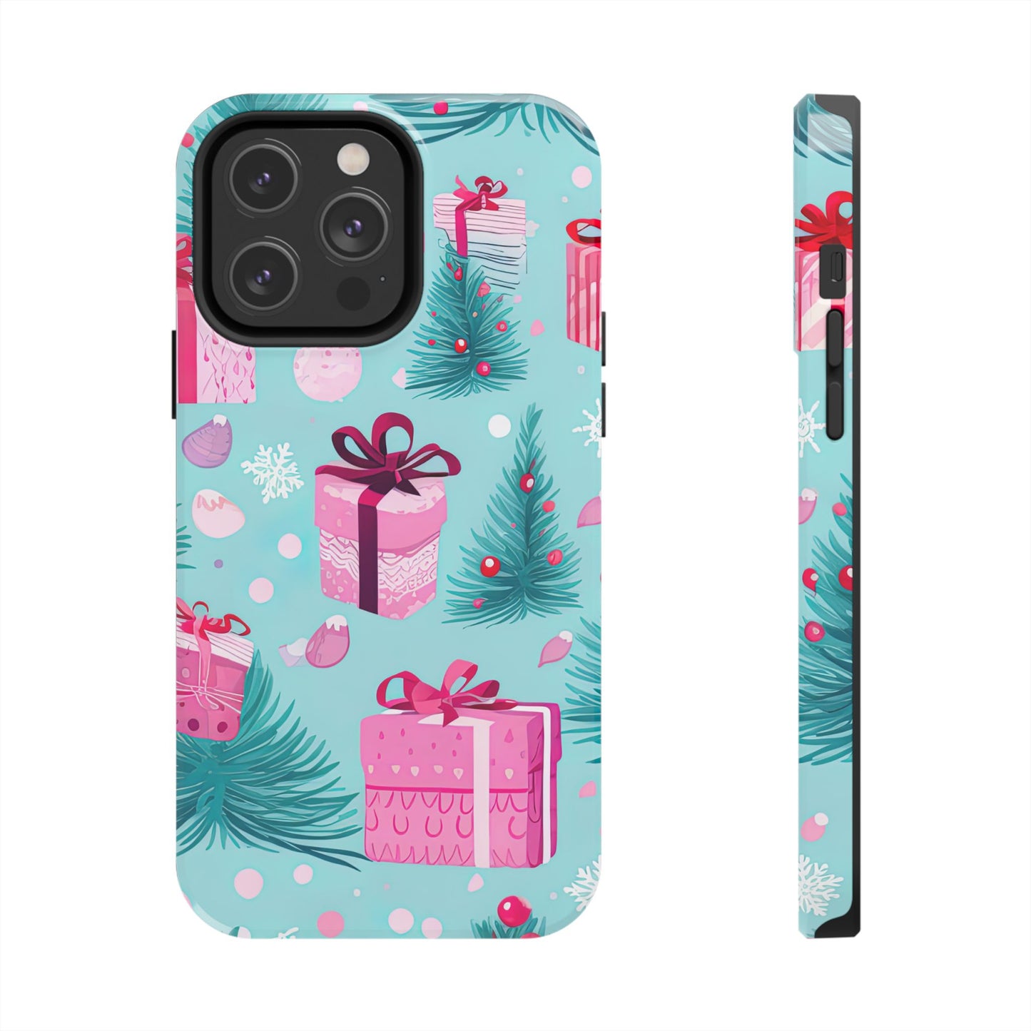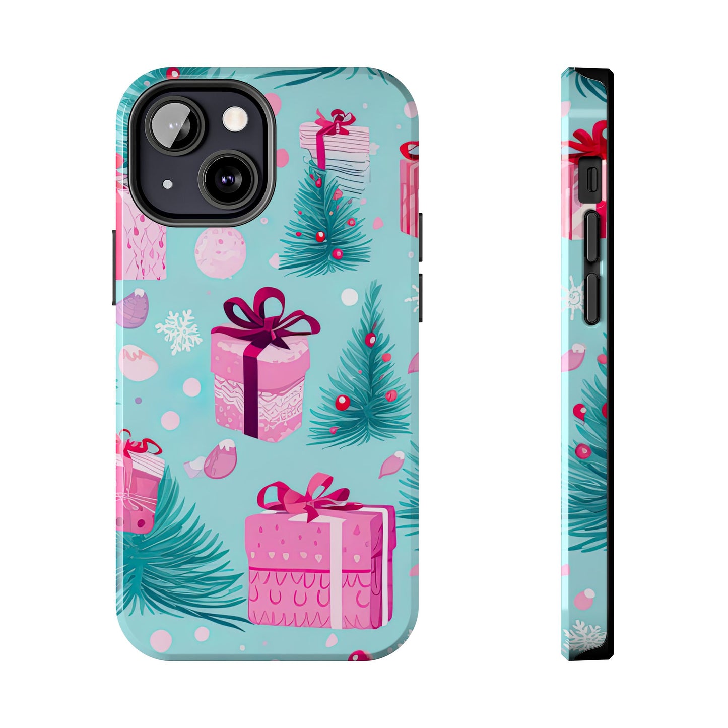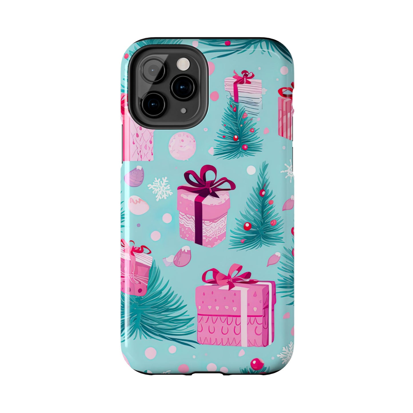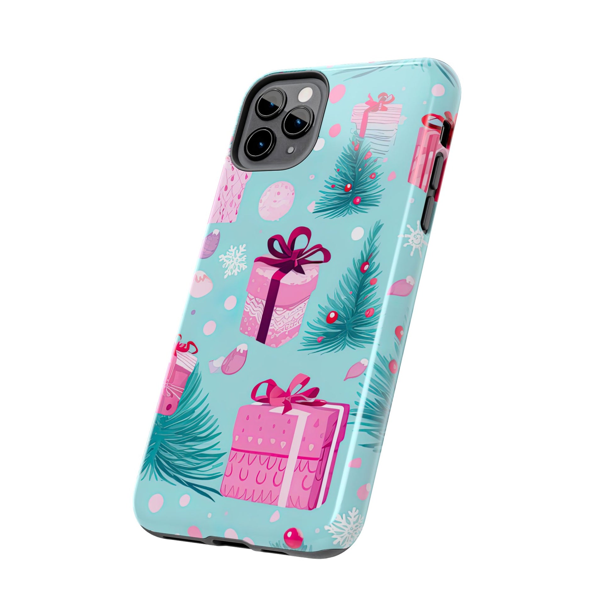 Get into the holiday spirit with this charming Festive Pink Christmas Gifts and Evergreen iPhone Case! Featuring a delightful pattern of pink-wrapped presents, lush green fir branches, and wintery snowflakes on a bright turquoise background, this case brings a touch of festive cheer to your phone. Perfect for adding a seasonal vibe to your everyday tech, it offers durable protection while showcasing a playful holiday aesthetic. Ideal for Christmas lovers who want to keep their holiday spirit close, even on the go!
