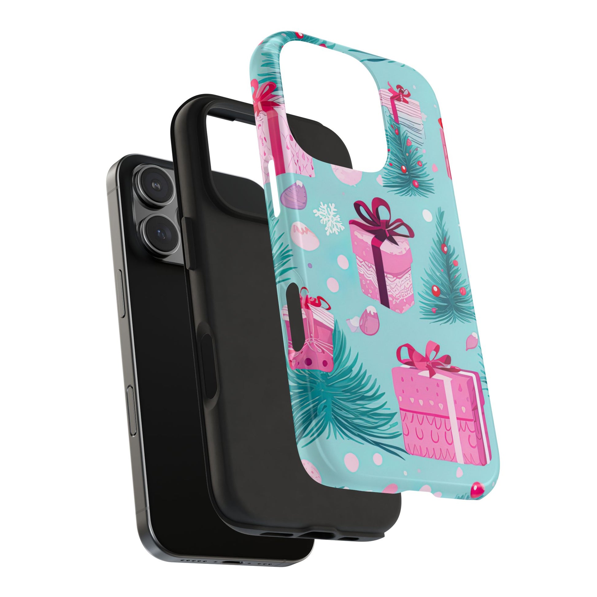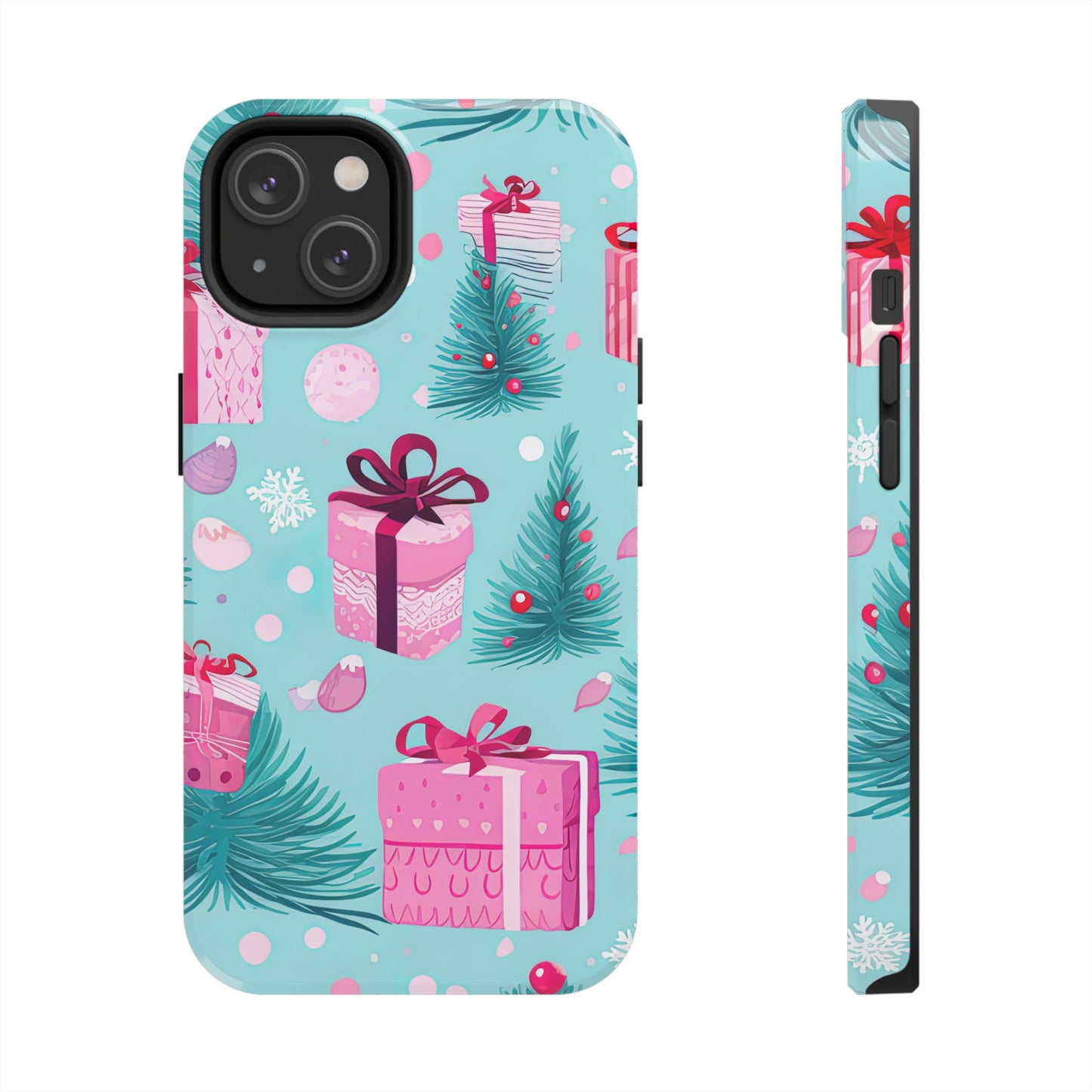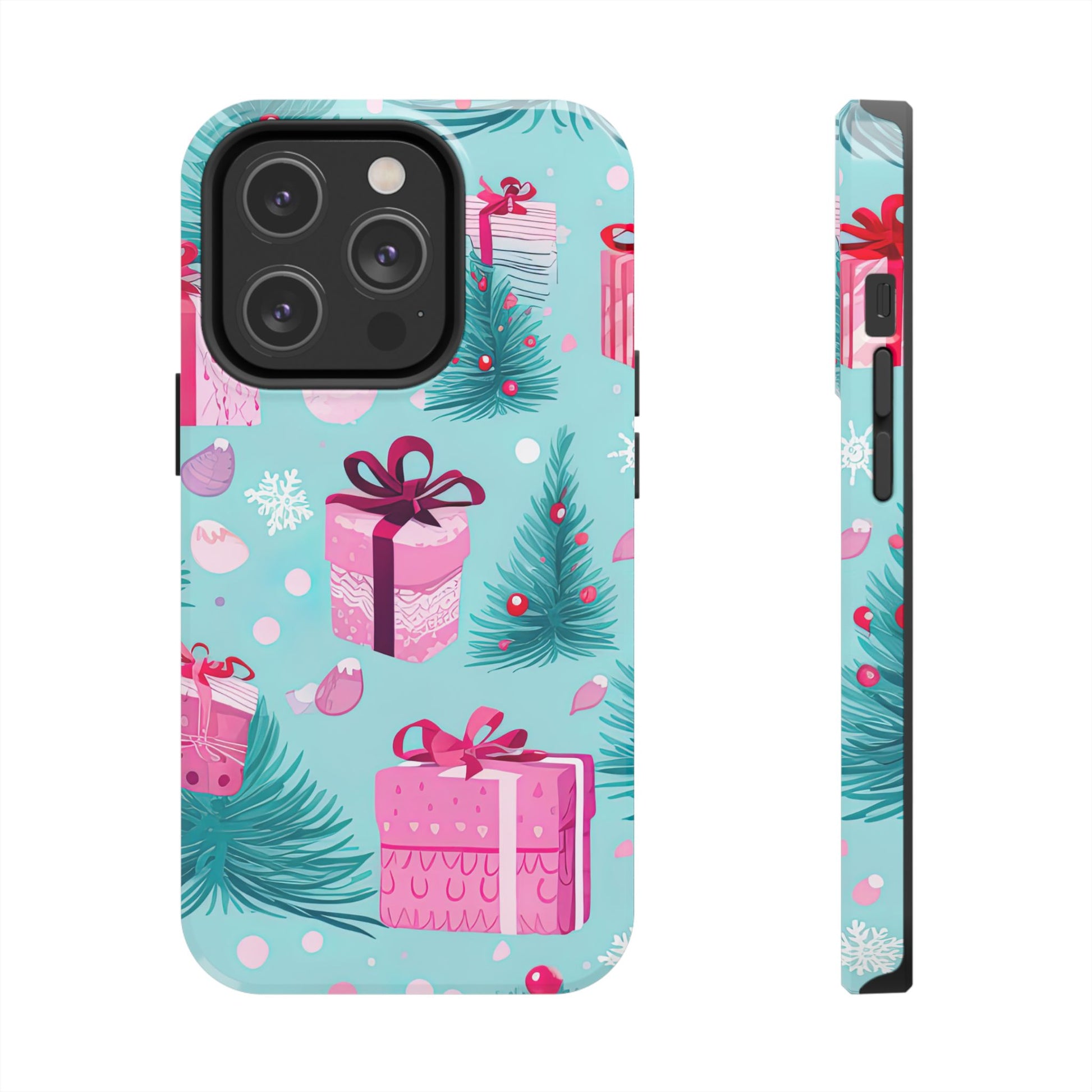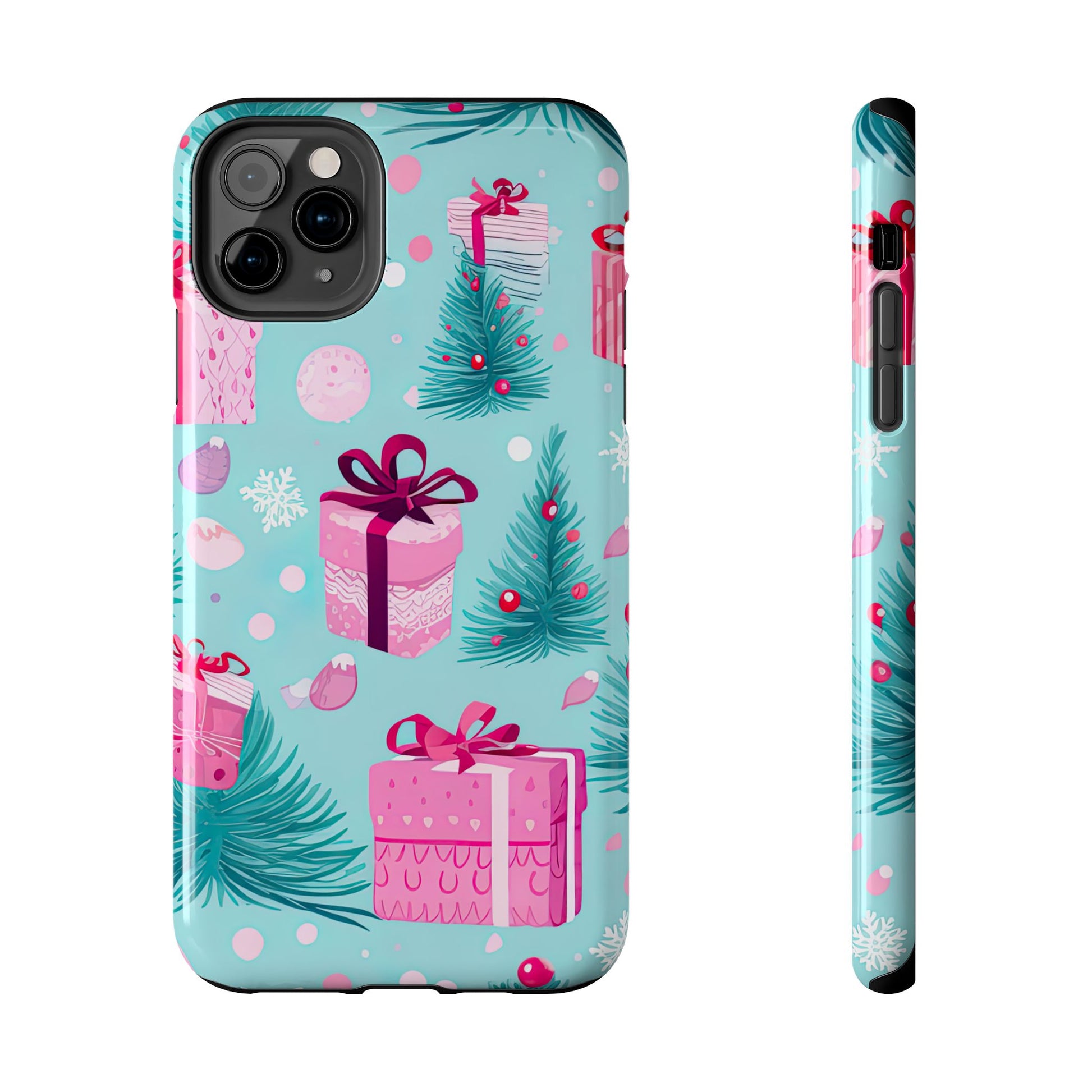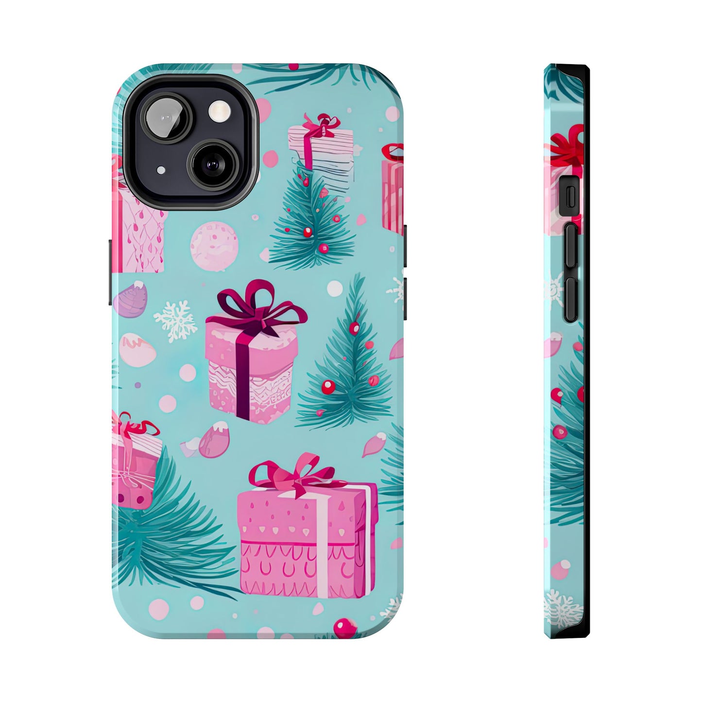 Get into the holiday spirit with this charming Festive Pink Christmas Gifts and Evergreen iPhone Case! Featuring a delightful pattern of pink-wrapped presents, lush green fir branches, and wintery snowflakes on a bright turquoise background, this case brings a touch of festive cheer to your phone. Perfect for adding a seasonal vibe to your everyday tech, it offers durable protection while showcasing a playful holiday aesthetic. Ideal for Christmas lovers who want to keep their holiday spirit close, even on the go!