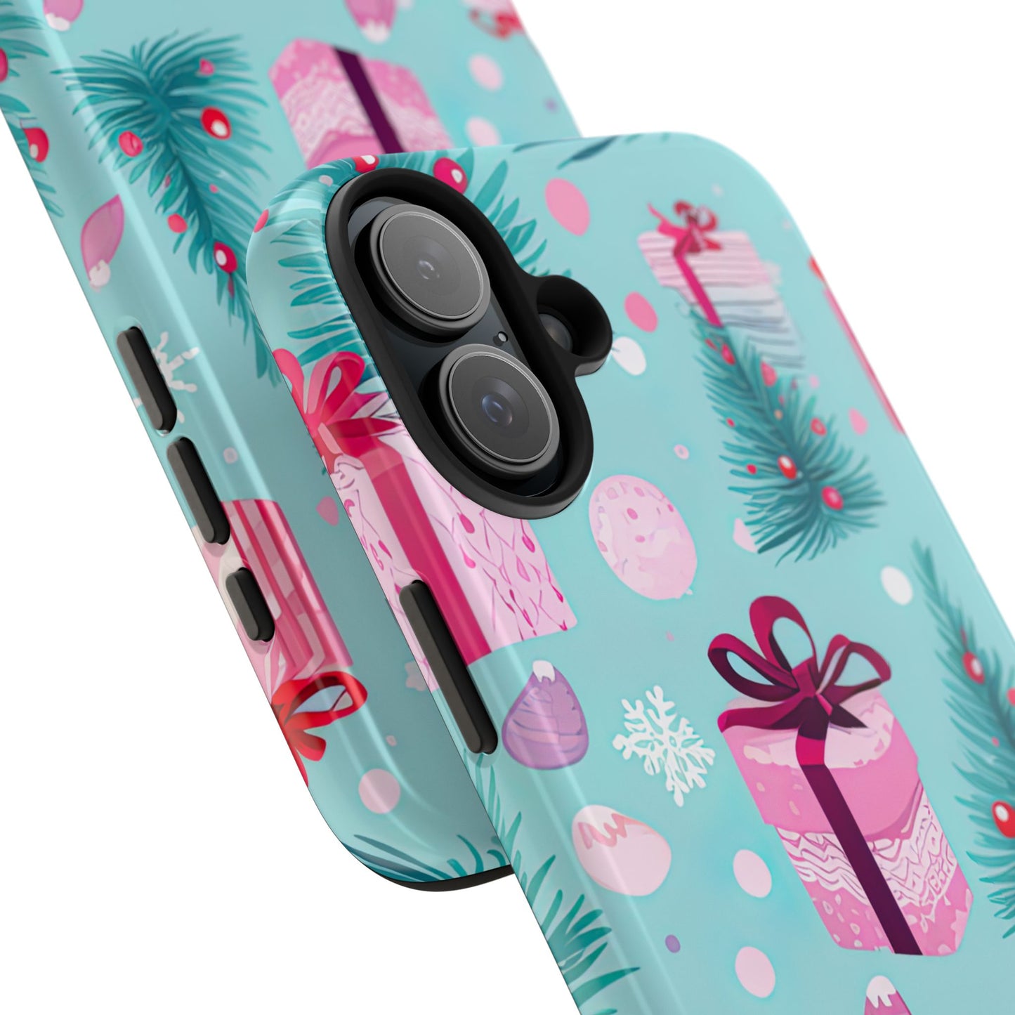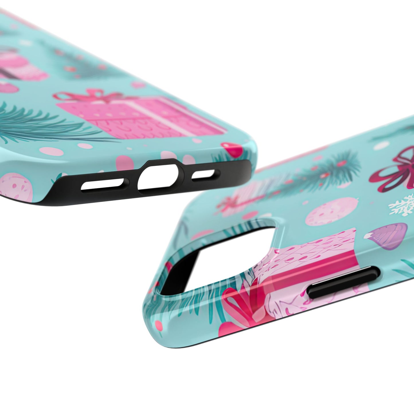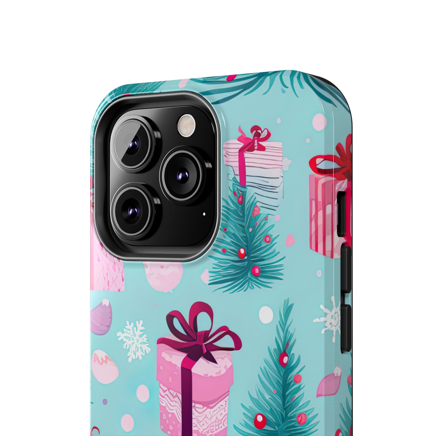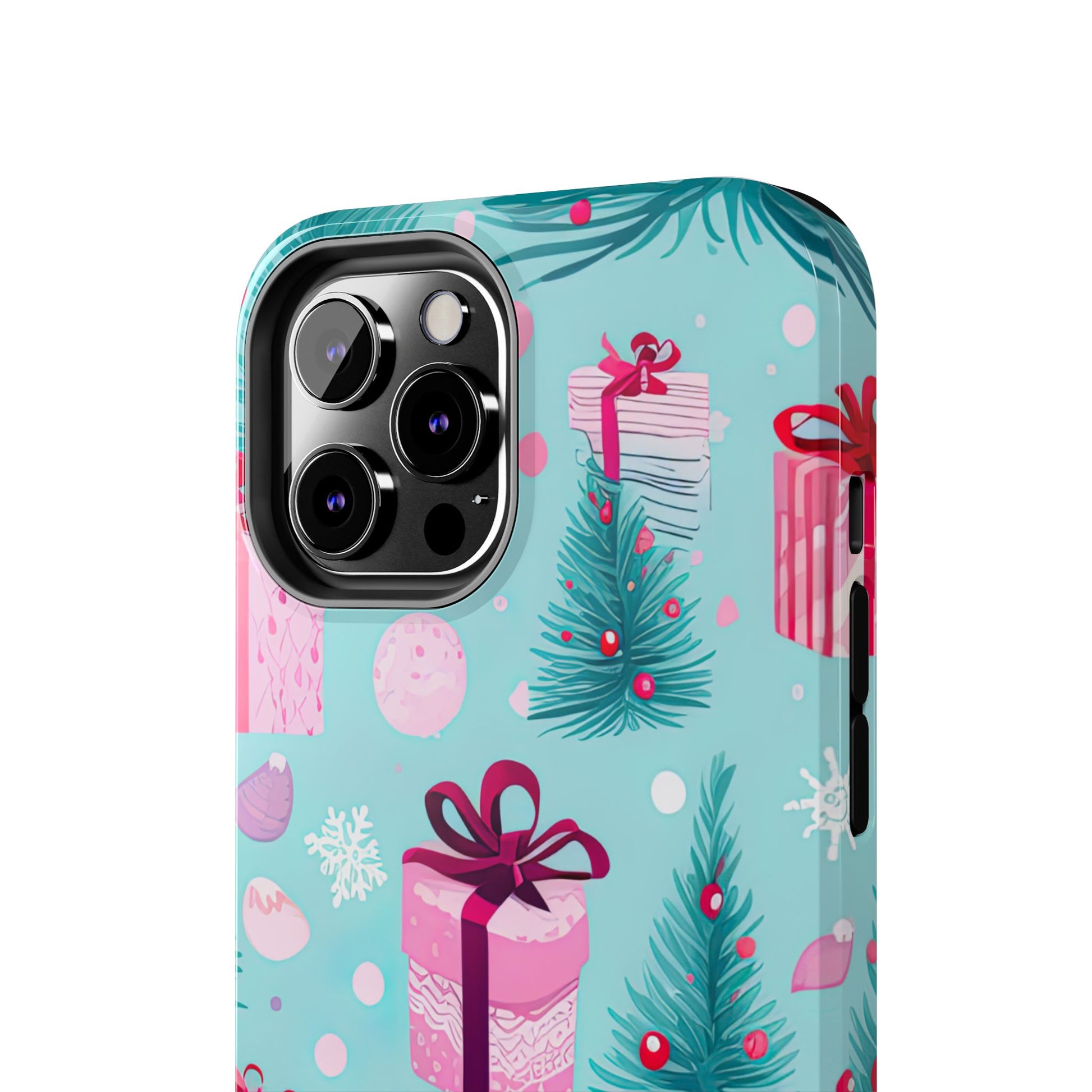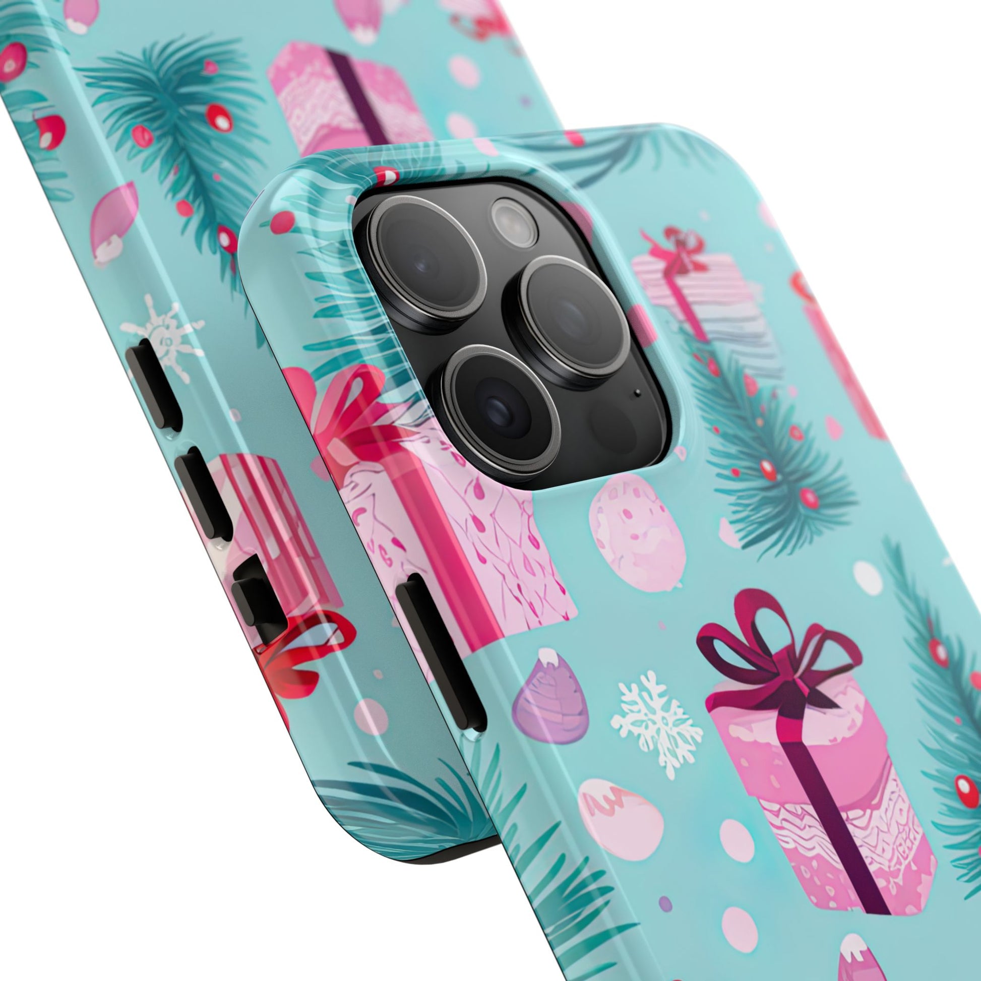 Get into the holiday spirit with this charming Festive Pink Christmas Gifts and Evergreen iPhone Case! Featuring a delightful pattern of pink-wrapped presents, lush green fir branches, and wintery snowflakes on a bright turquoise background, this case brings a touch of festive cheer to your phone. Perfect for adding a seasonal vibe to your everyday tech, it offers durable protection while showcasing a playful holiday aesthetic. Ideal for Christmas lovers who want to keep their holiday spirit close, even on the go!