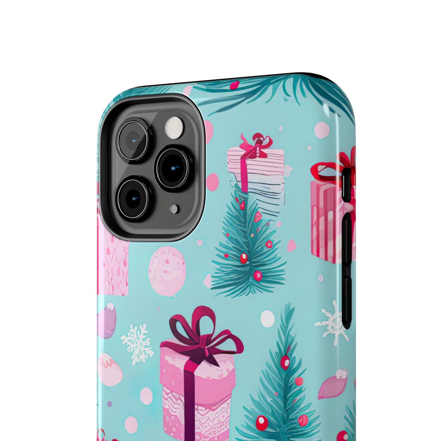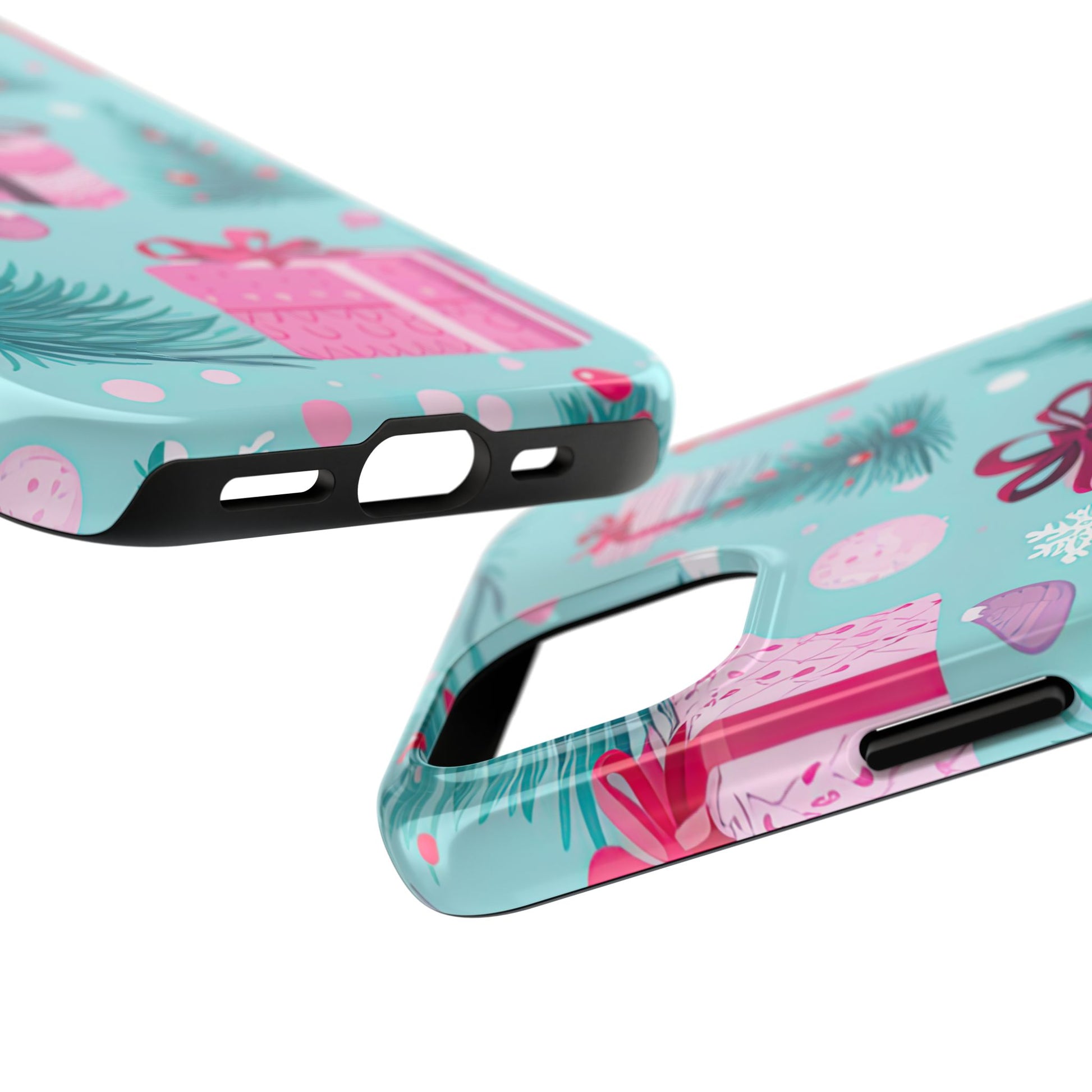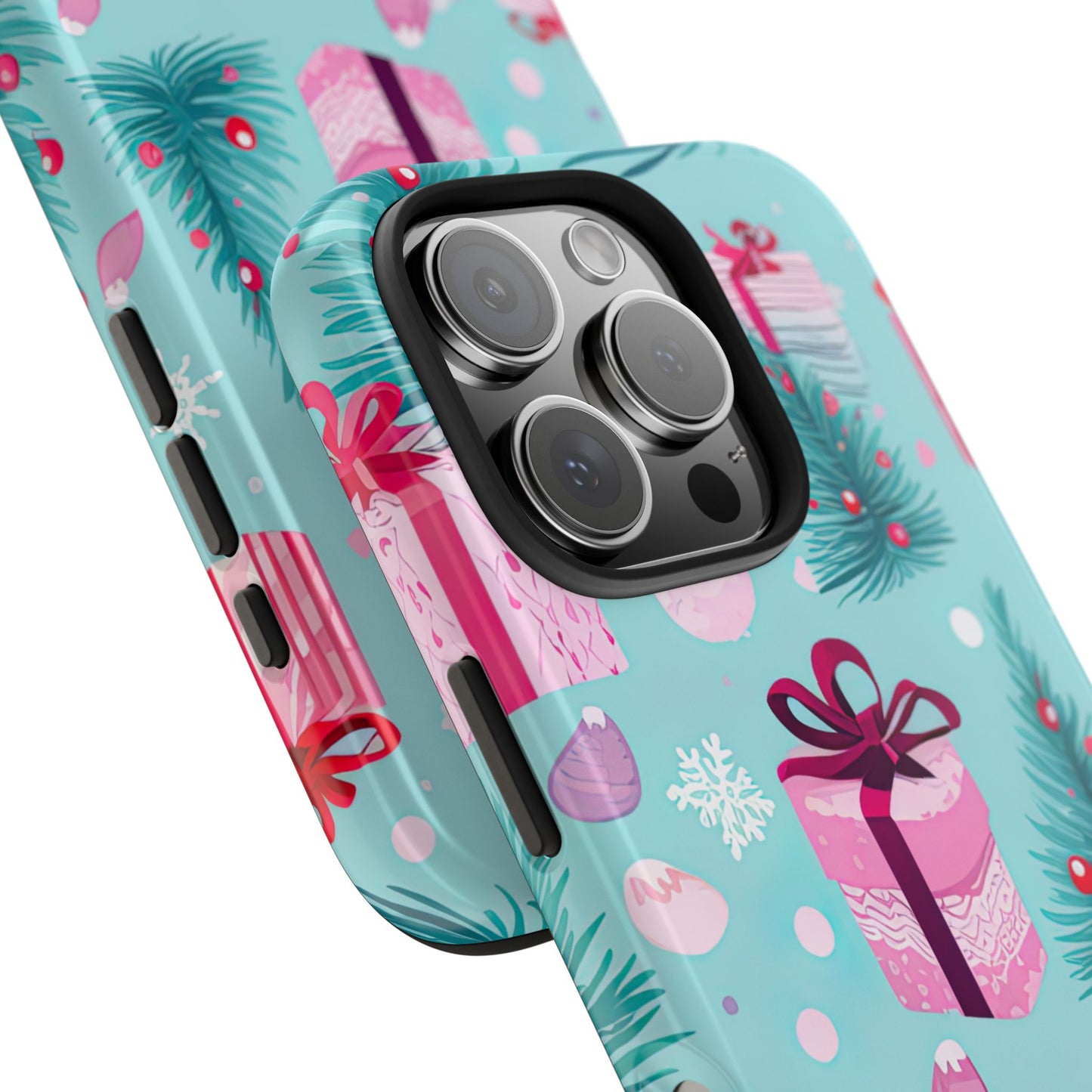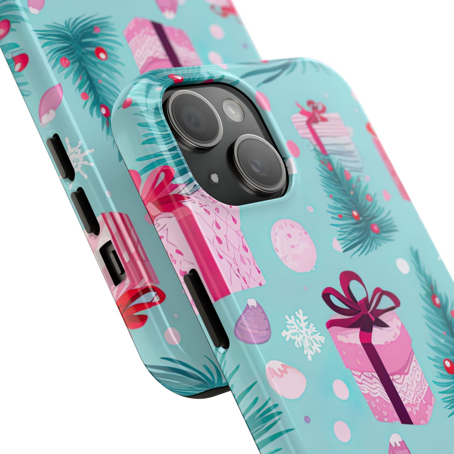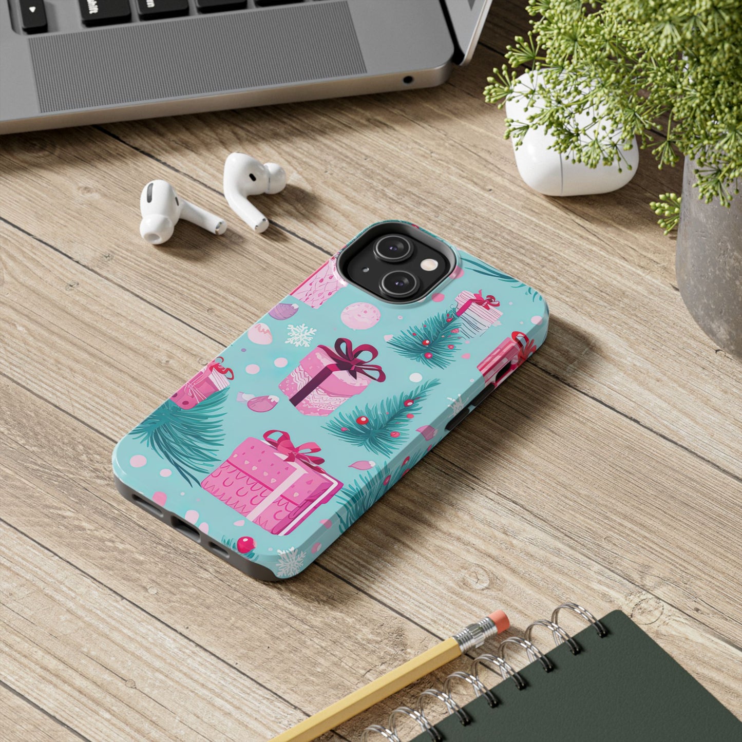 Get into the holiday spirit with this charming Festive Pink Christmas Gifts and Evergreen iPhone Case! Featuring a delightful pattern of pink-wrapped presents, lush green fir branches, and wintery snowflakes on a bright turquoise background, this case brings a touch of festive cheer to your phone. Perfect for adding a seasonal vibe to your everyday tech, it offers durable protection while showcasing a playful holiday aesthetic. Ideal for Christmas lovers who want to keep their holiday spirit close, even on the go!