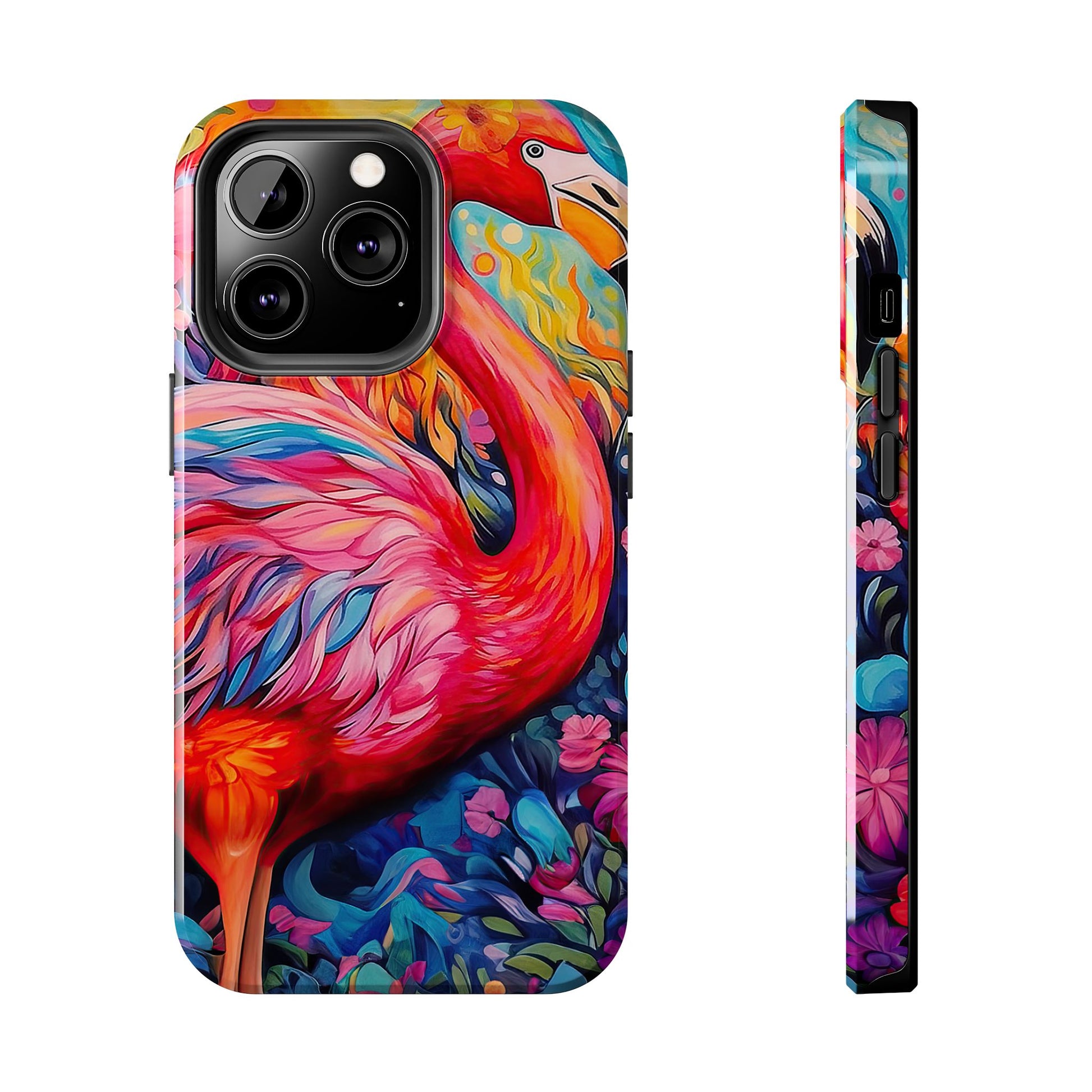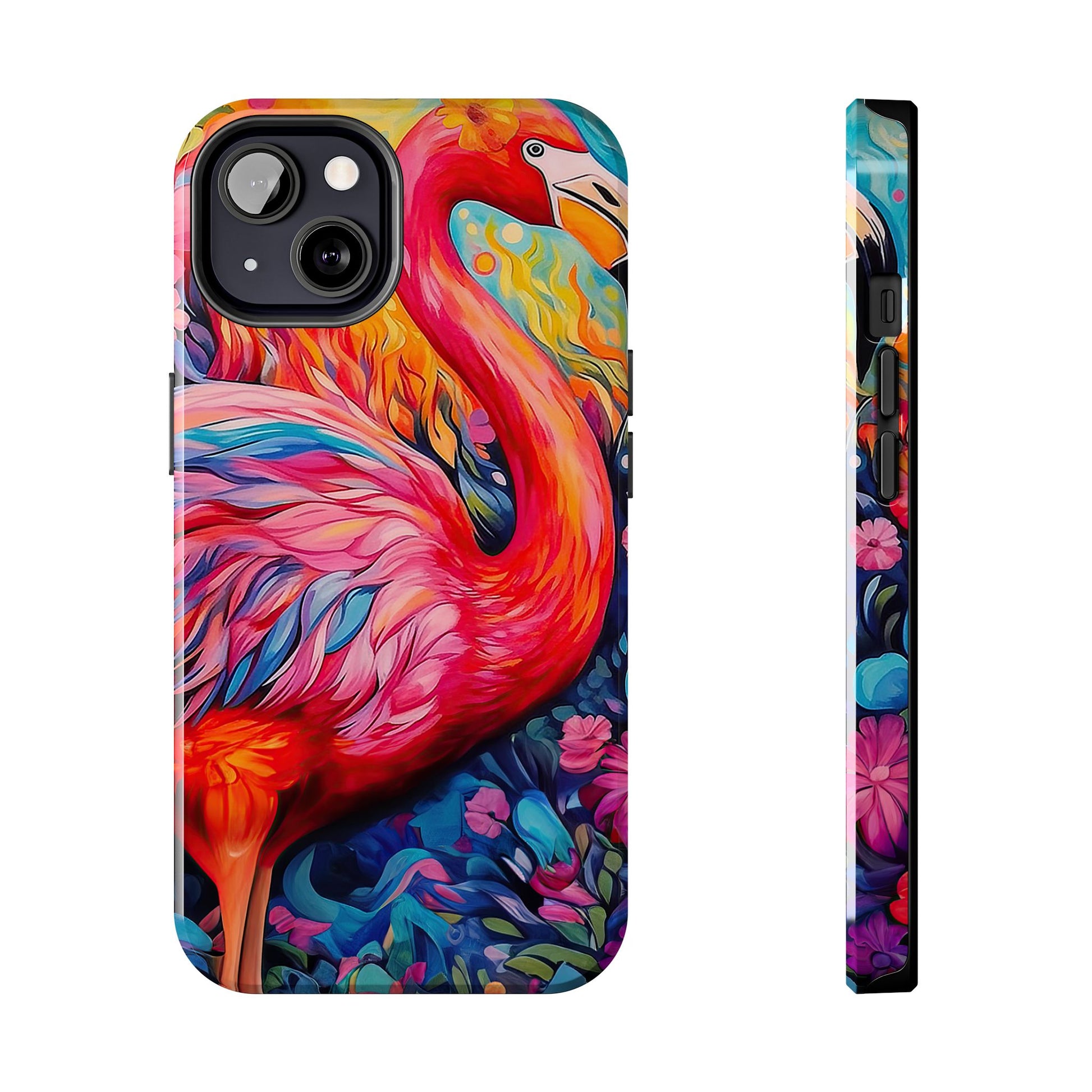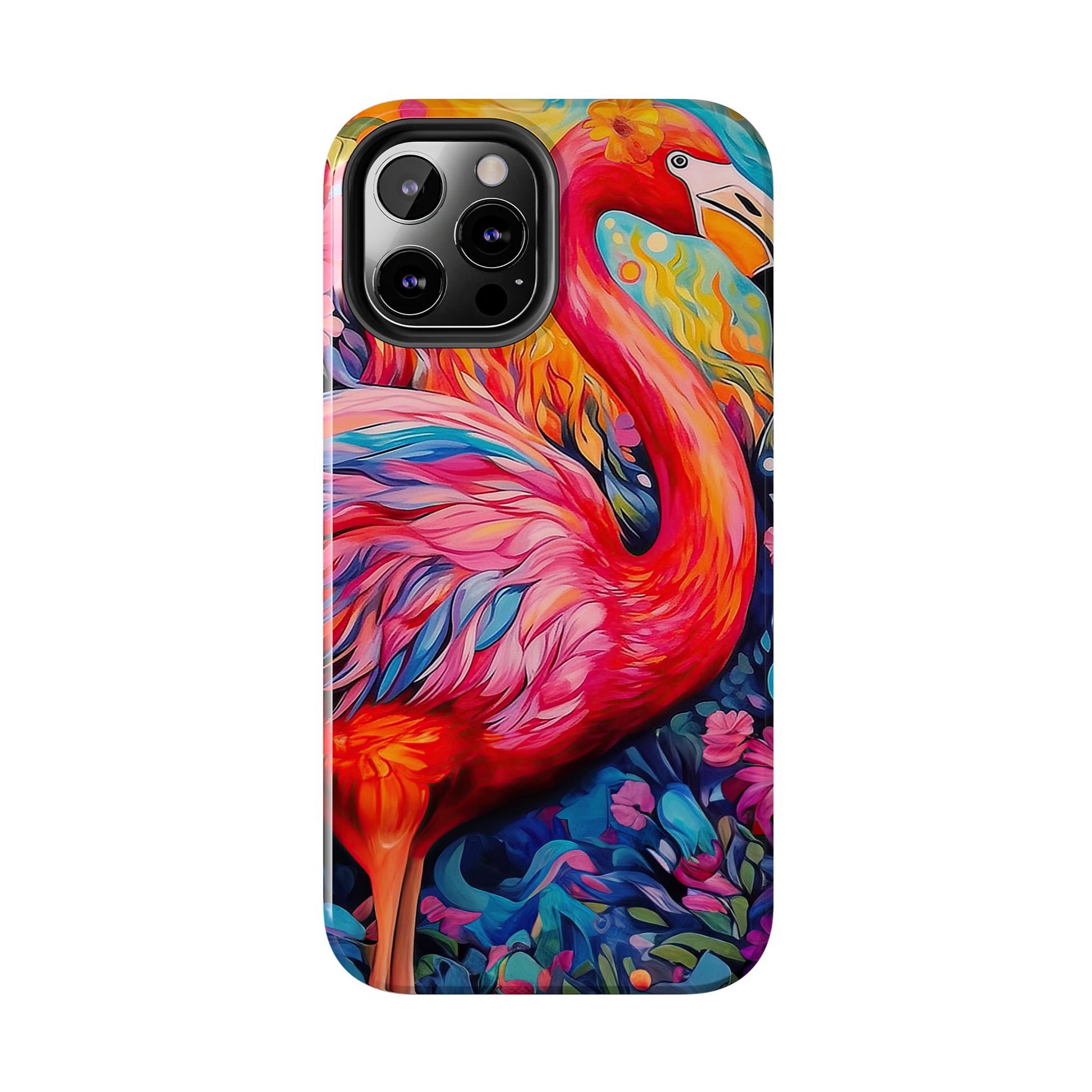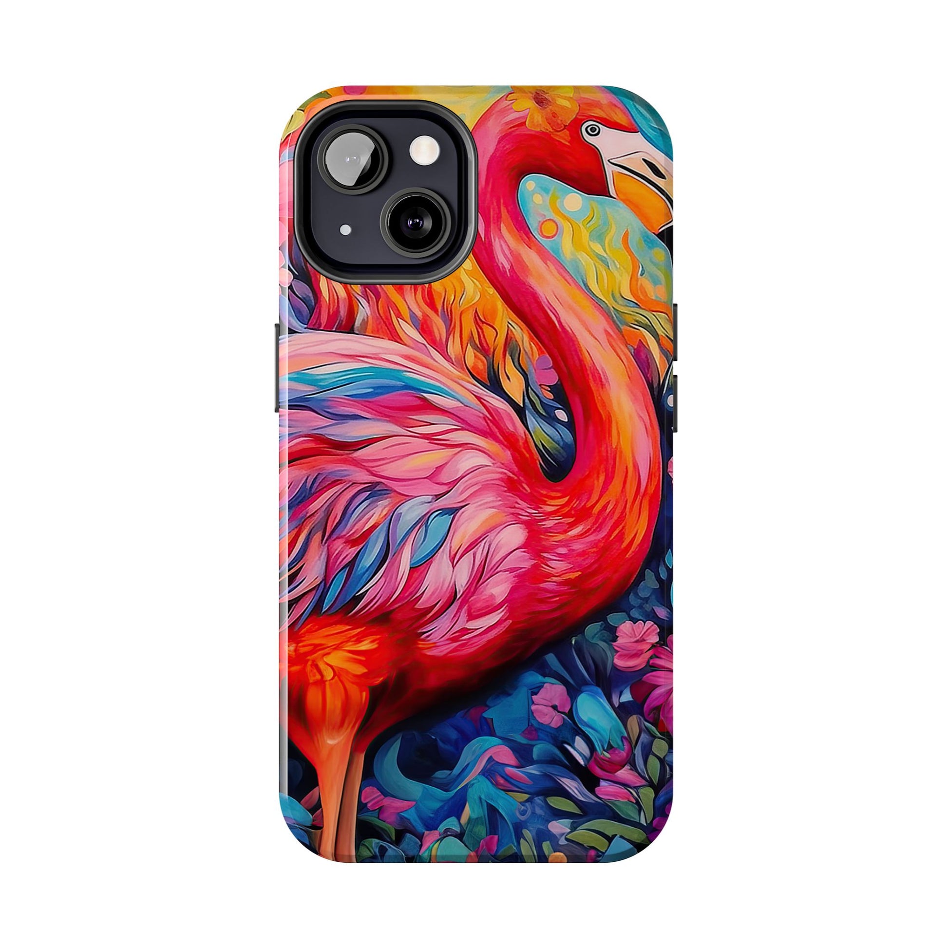 Turn heads with the Flamingo Fiesta iPhone Cases. Bursting with tropical vibes, this artistic design features a flamboyant flamingo amidst a garden of bold and colorful flowers.