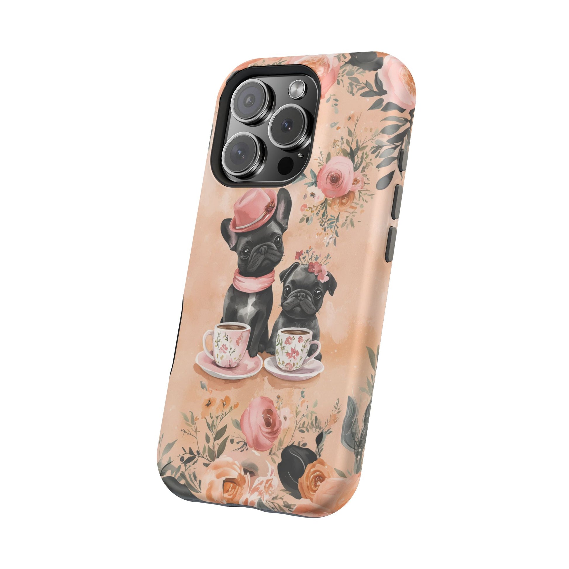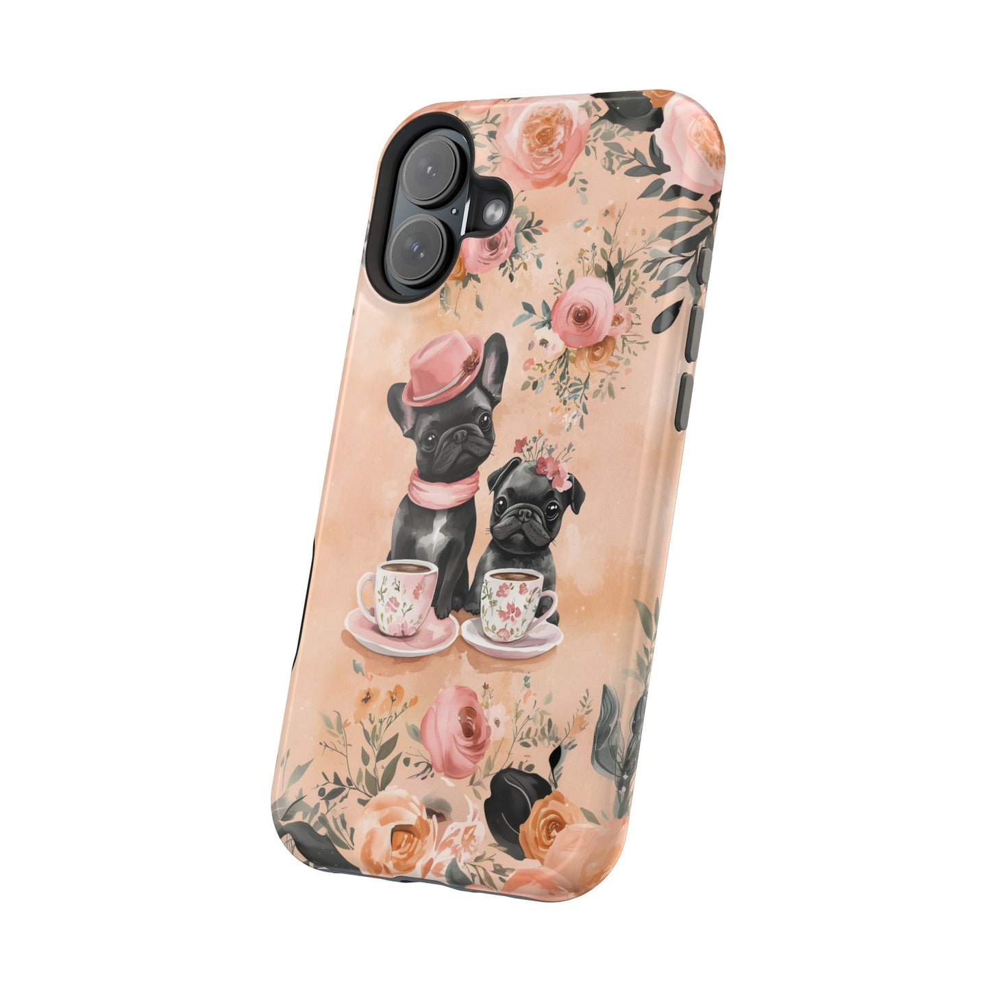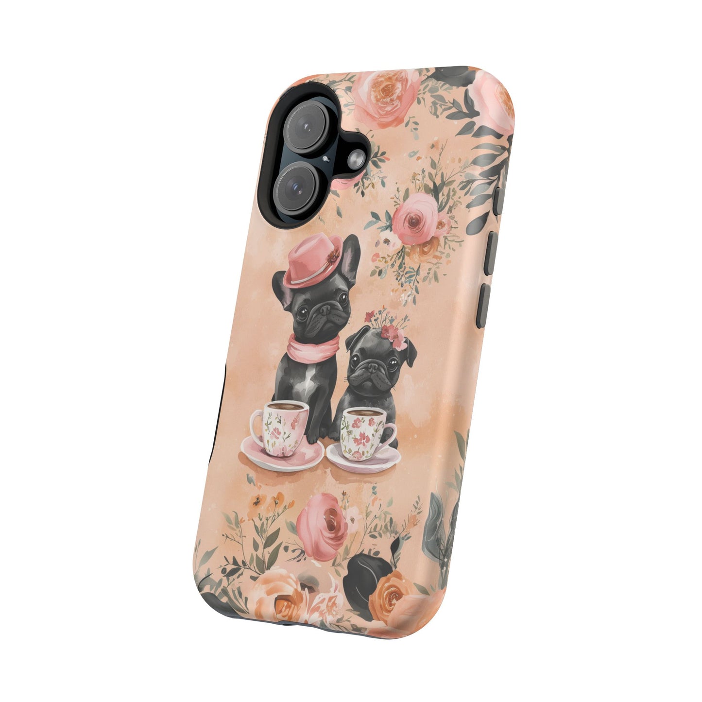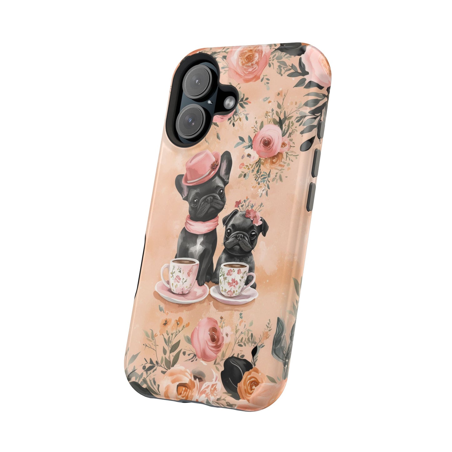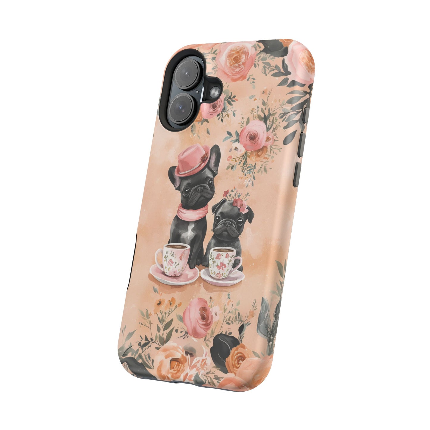 Floral French Bulldogs MagSafe iPhone Case – Elegant Dog Design with Tea Cups & Roses, Shockproof Protection