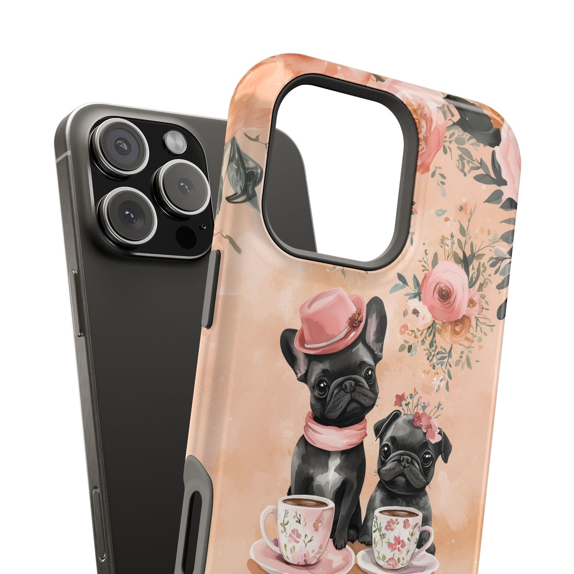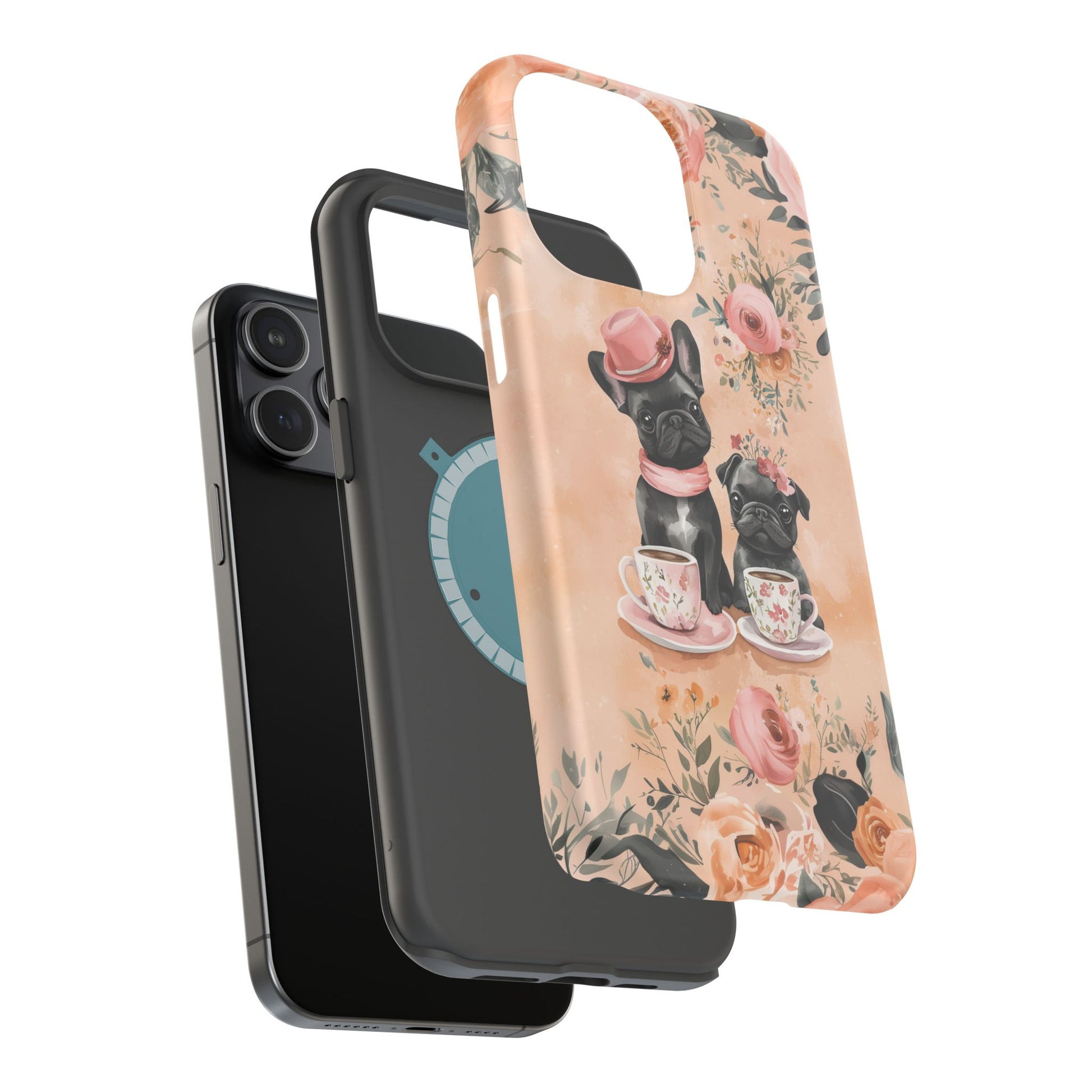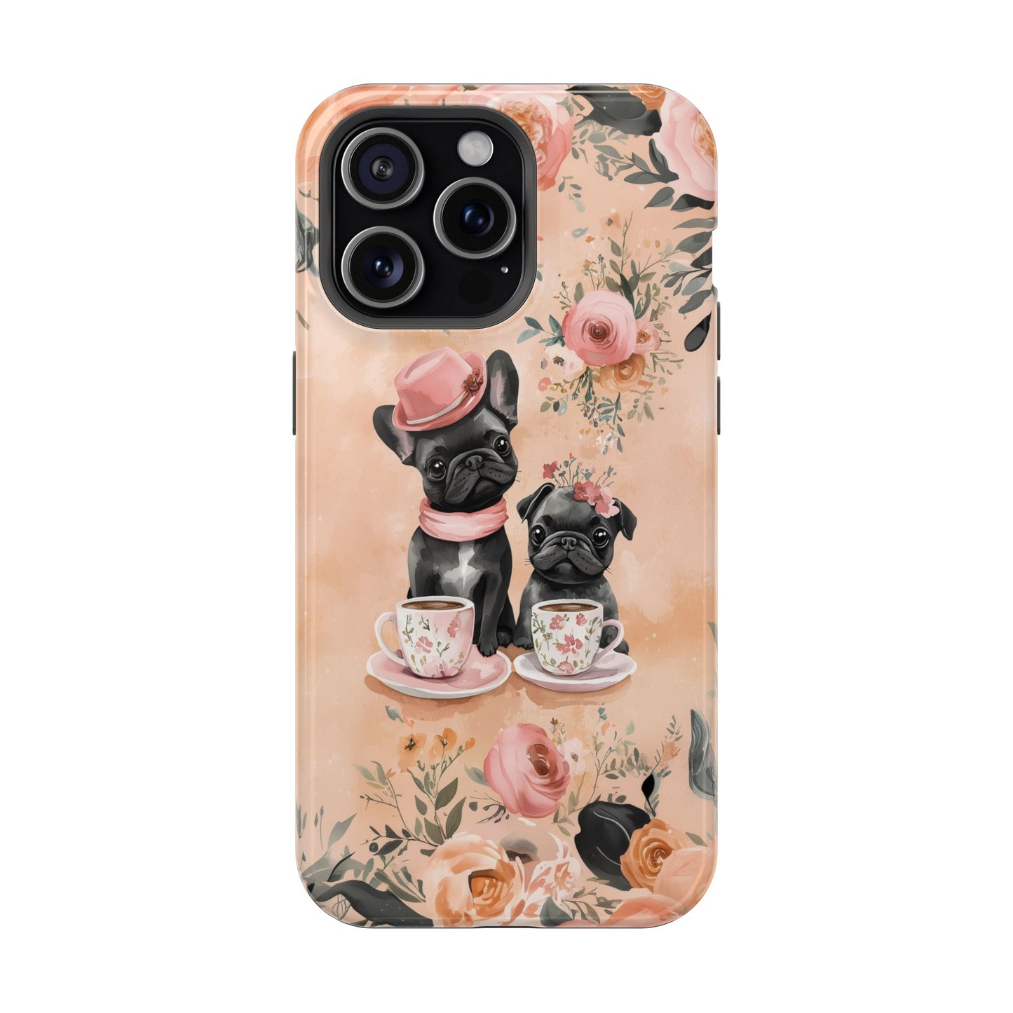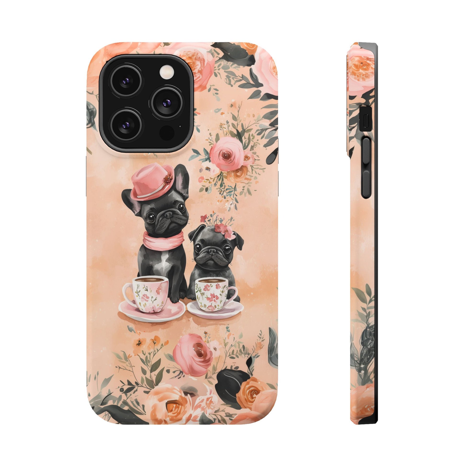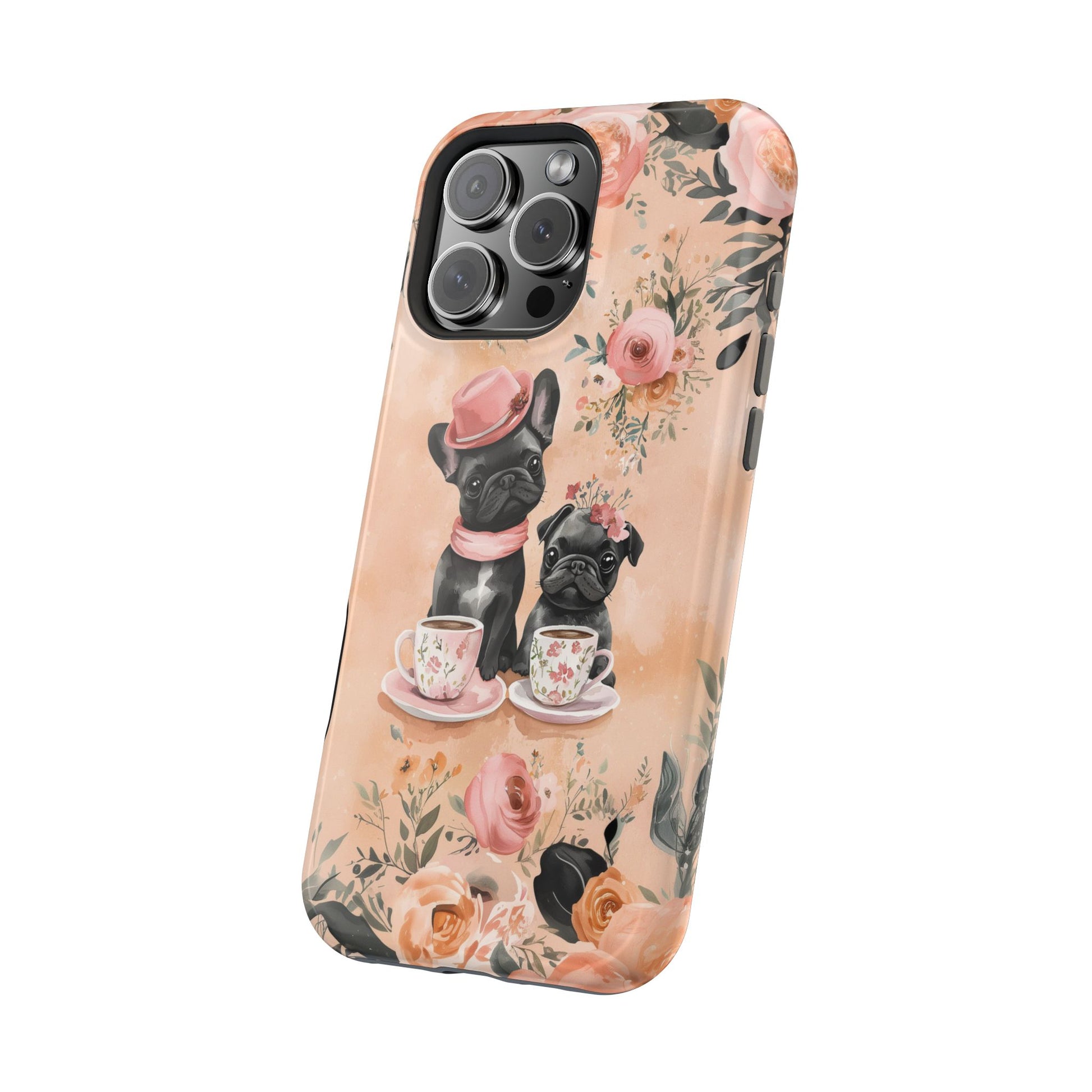Floral French Bulldogs MagSafe iPhone Case – Elegant Dog Design with Tea Cups & Roses, Shockproof Protection