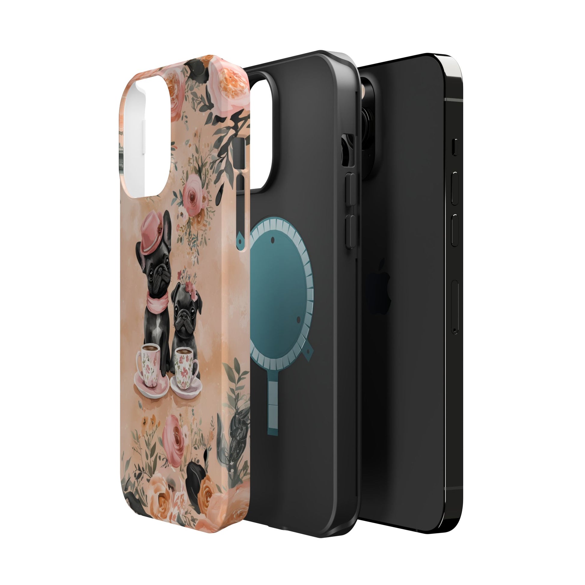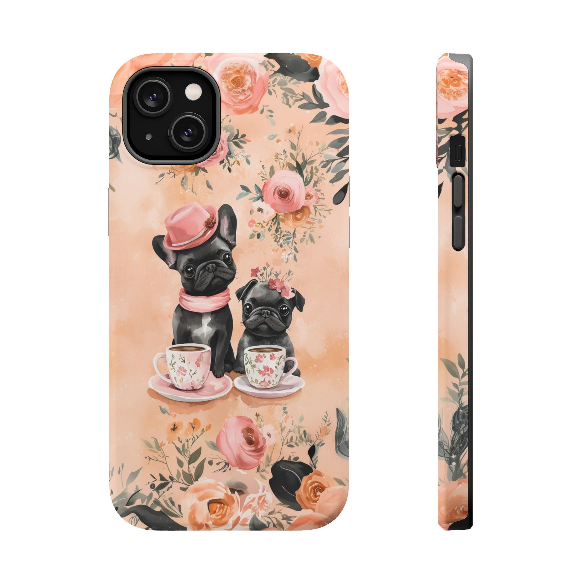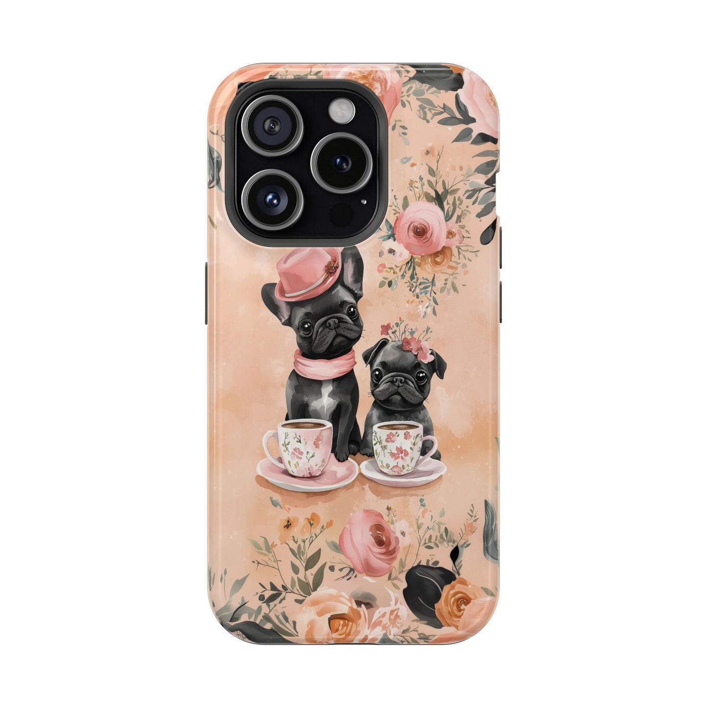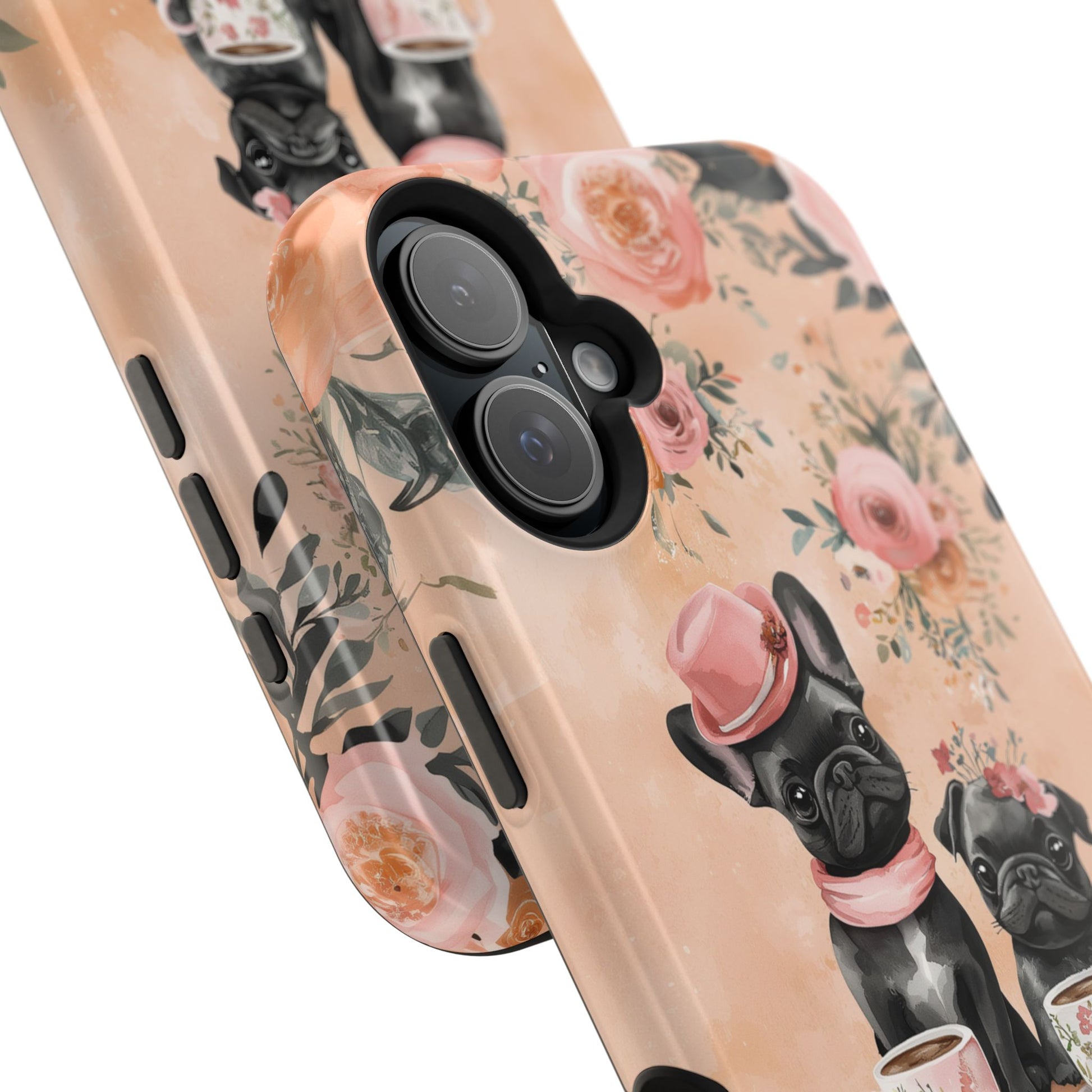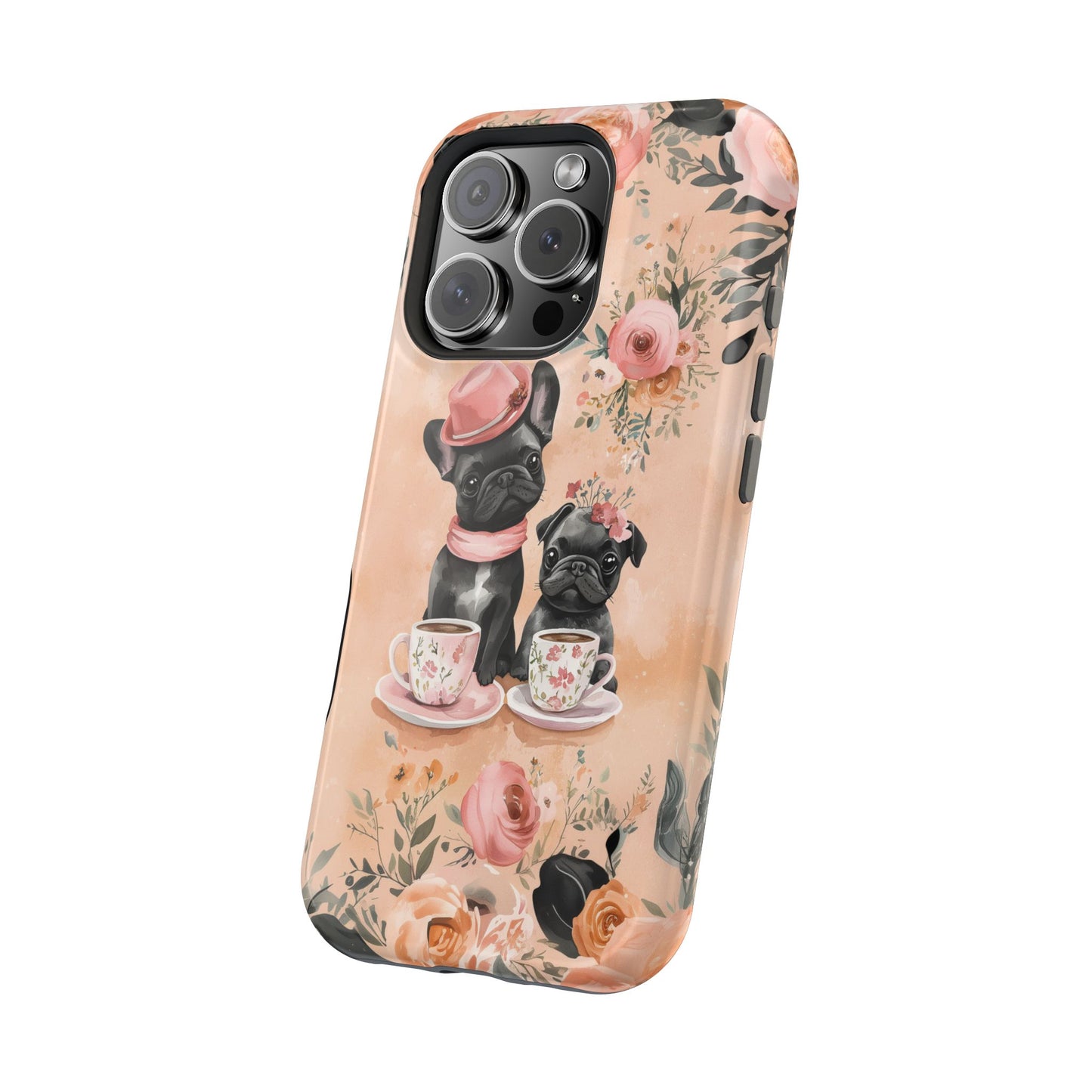 Floral French Bulldogs MagSafe iPhone Case – Elegant Dog Design with Tea Cups & Roses, Shockproof Protection