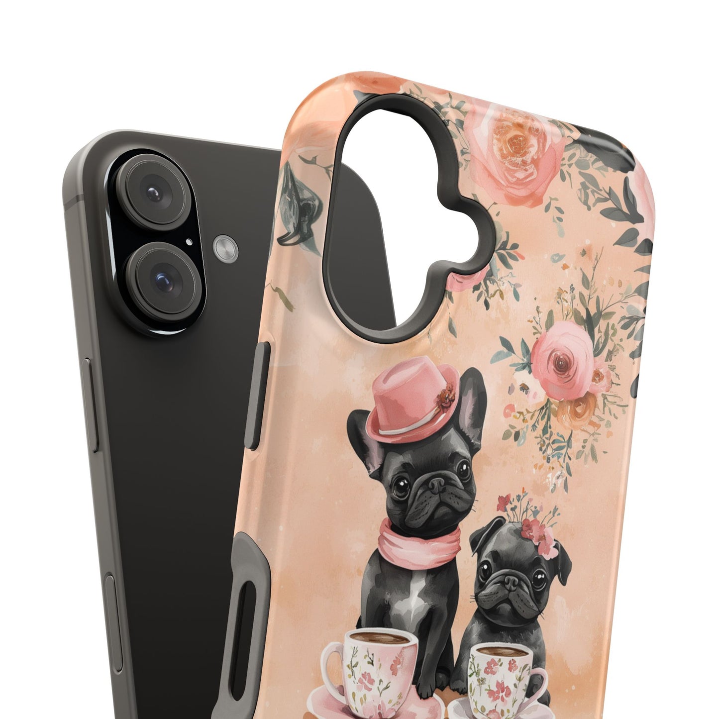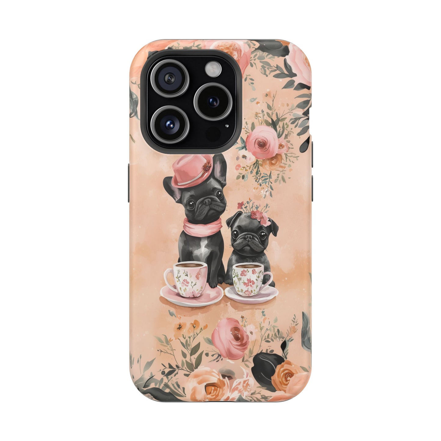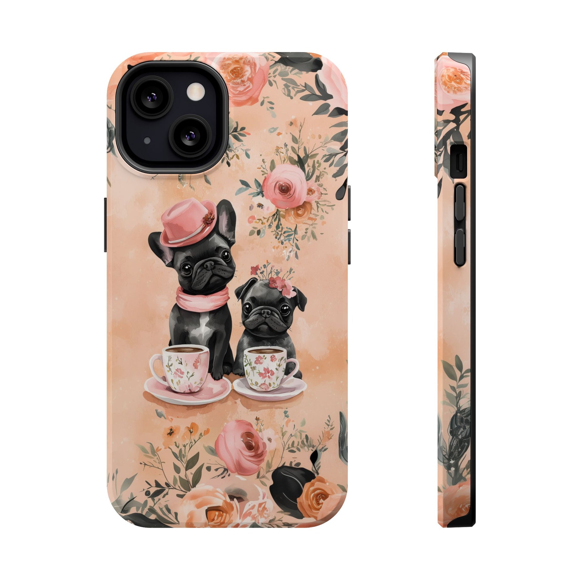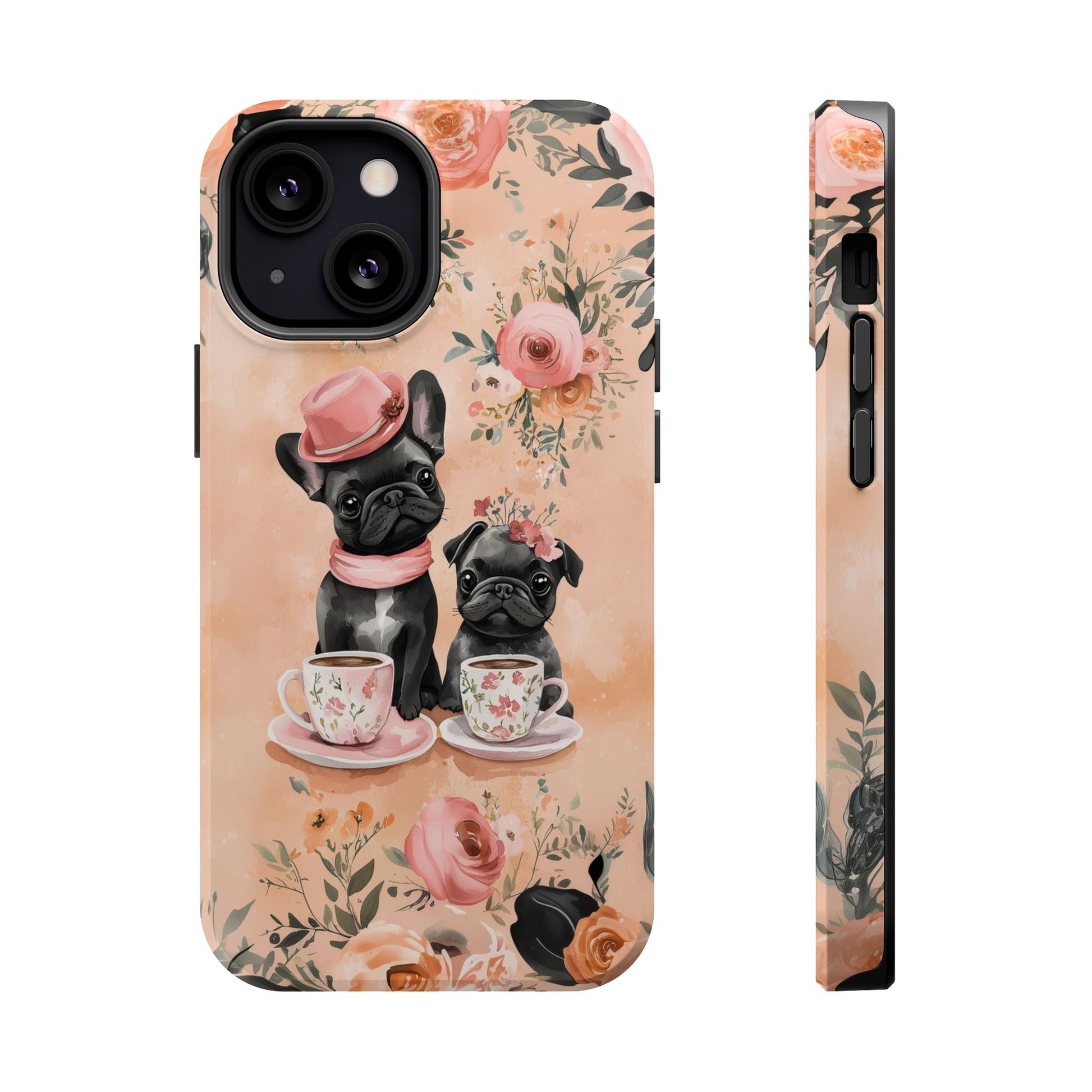 Floral French Bulldogs MagSafe iPhone Case – Elegant Dog Design with Tea Cups & Roses, Shockproof Protection