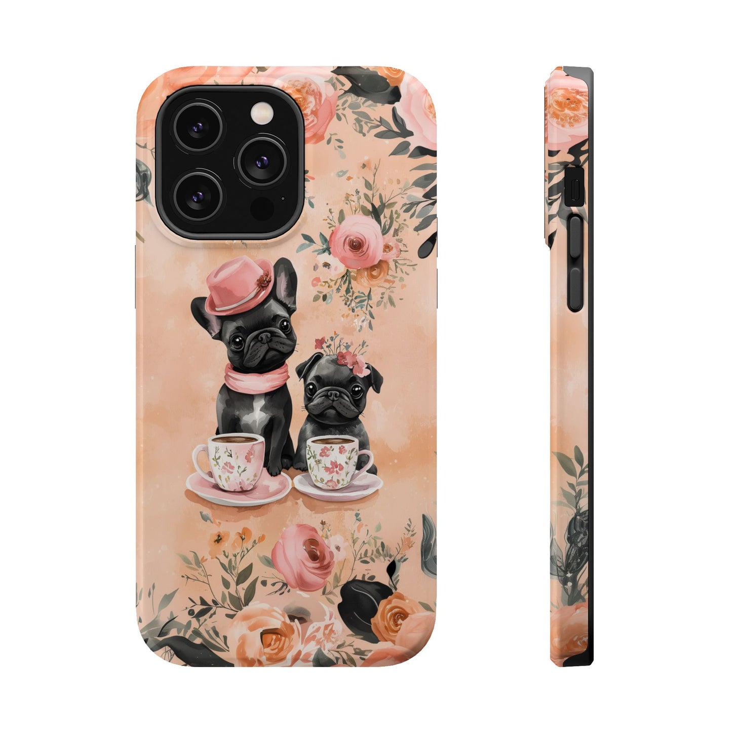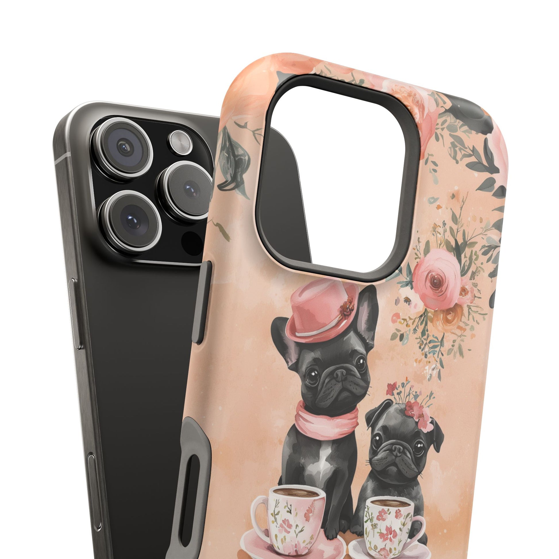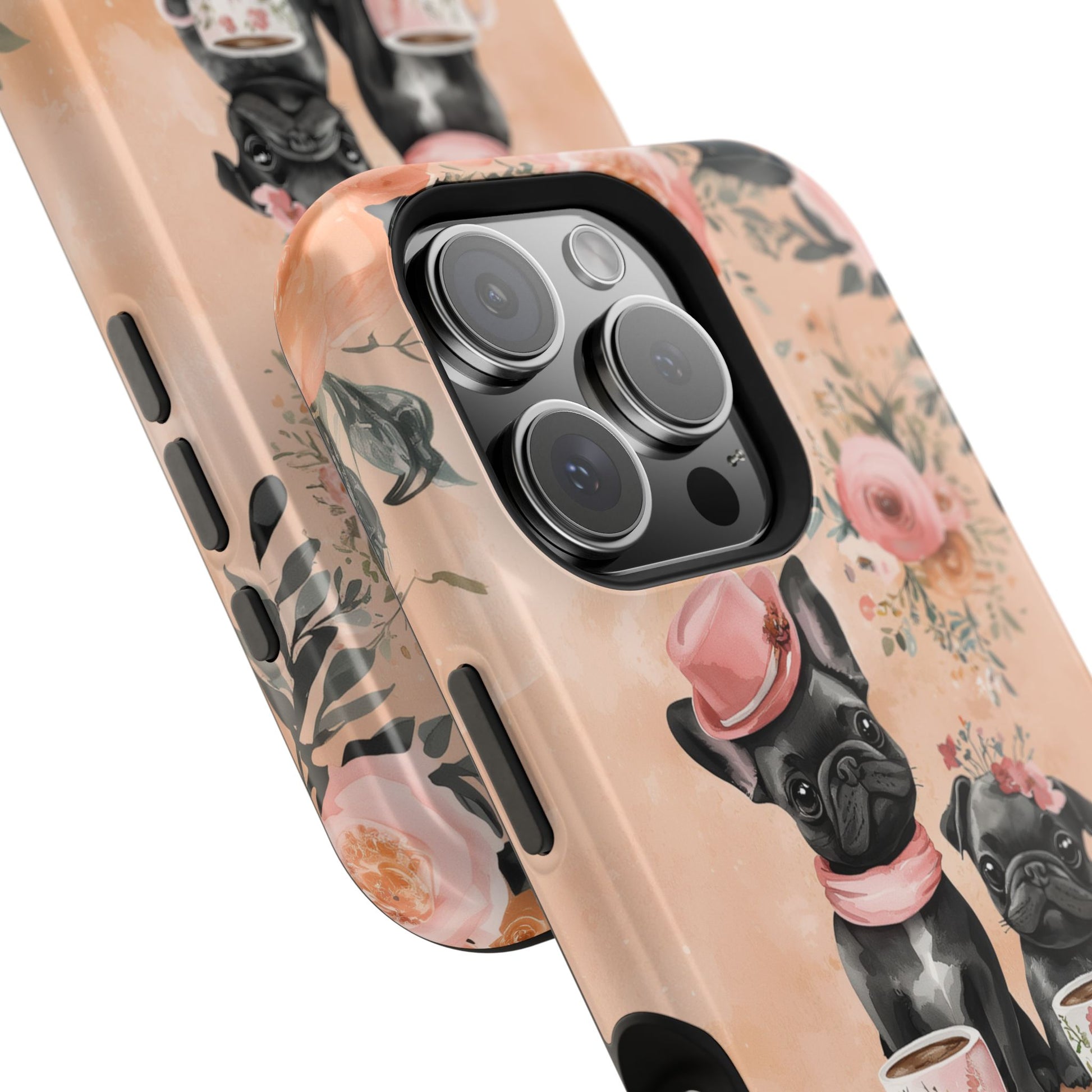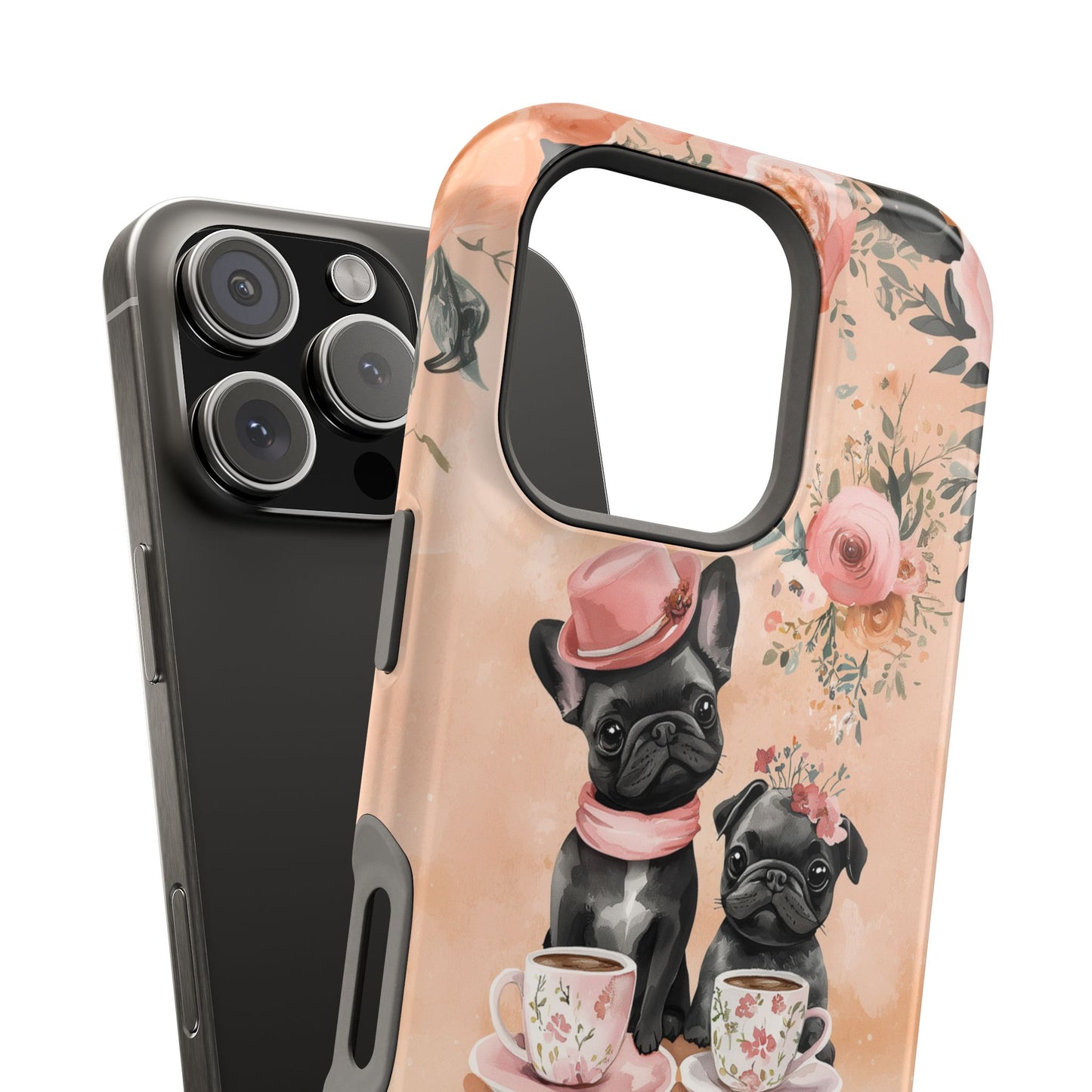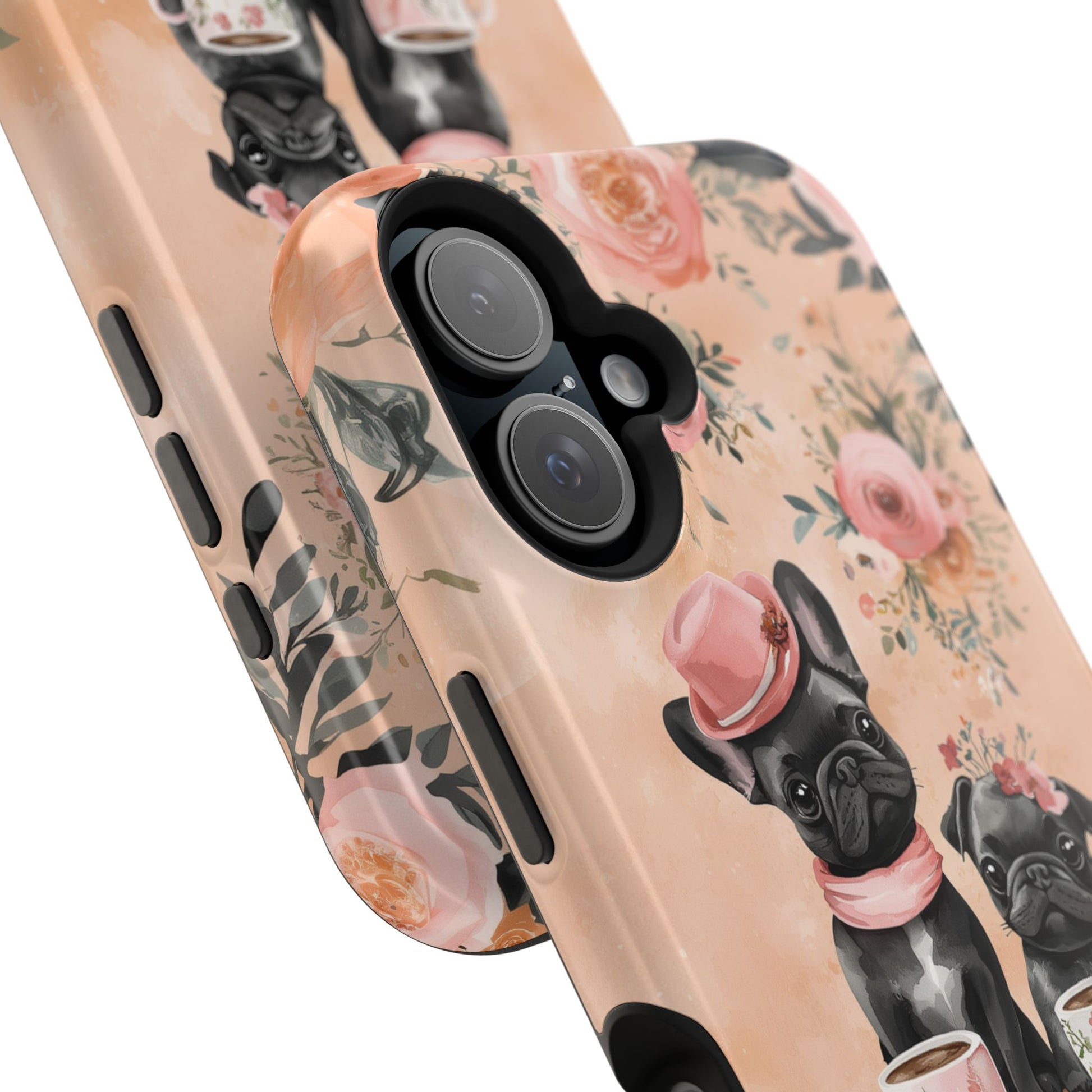 Floral French Bulldogs MagSafe iPhone Case – Elegant Dog Design with Tea Cups & Roses, Shockproof Protection