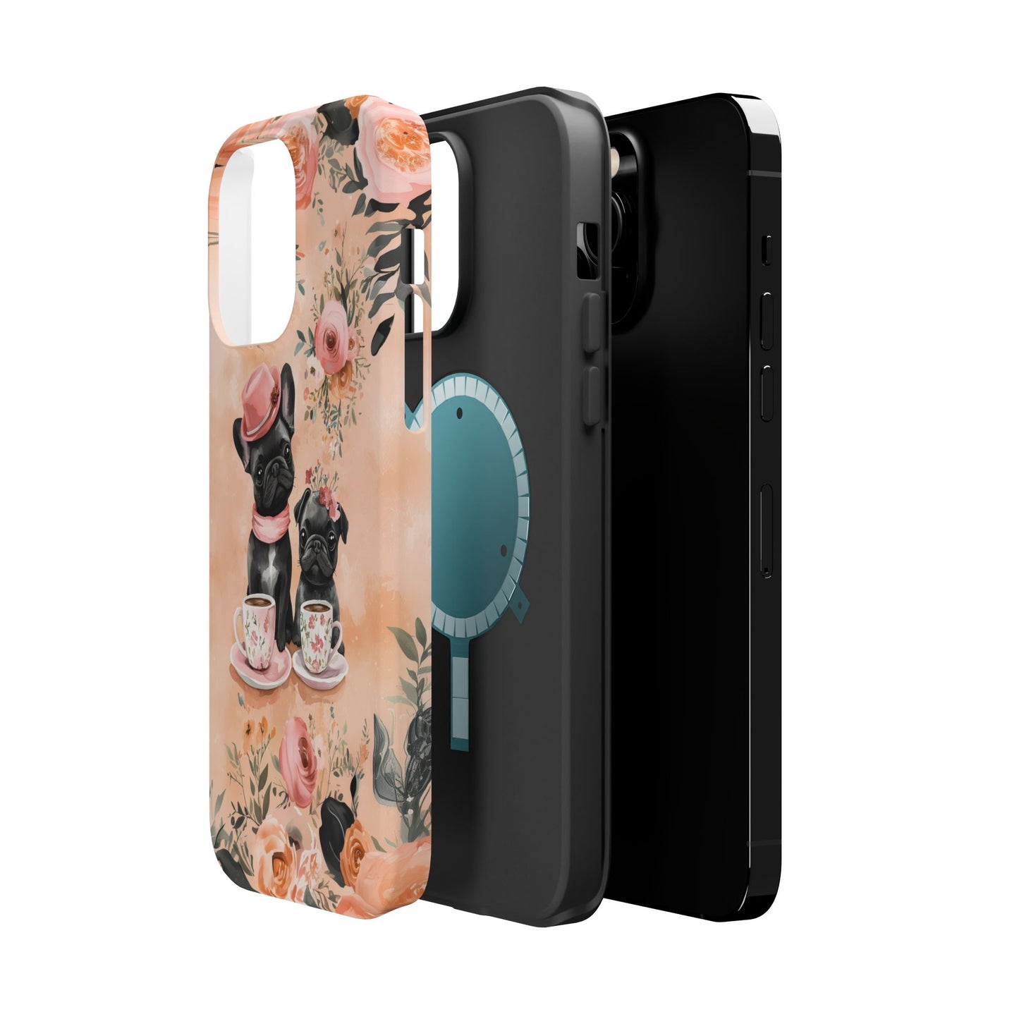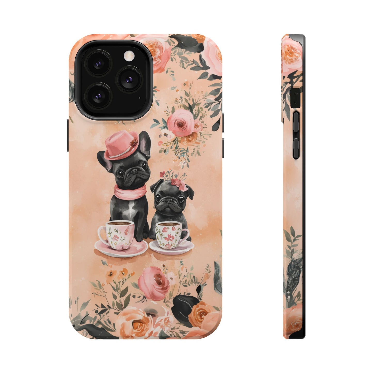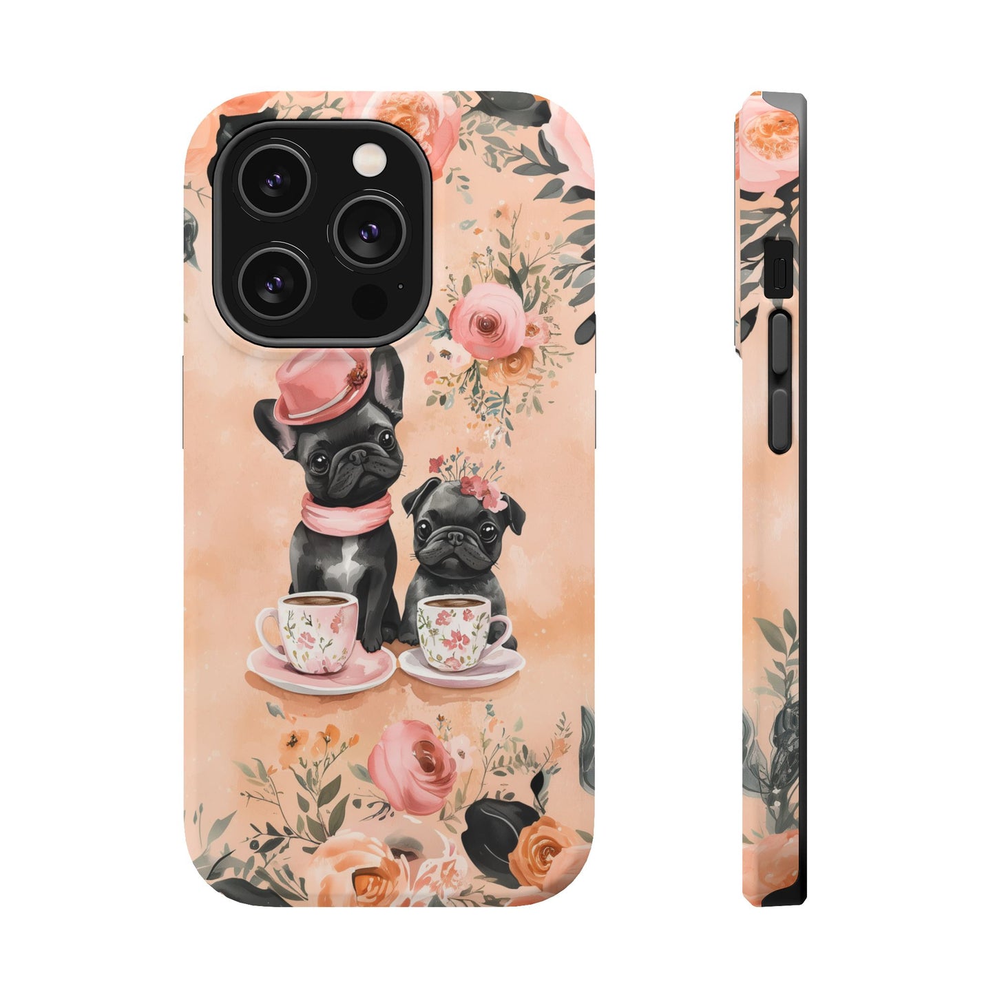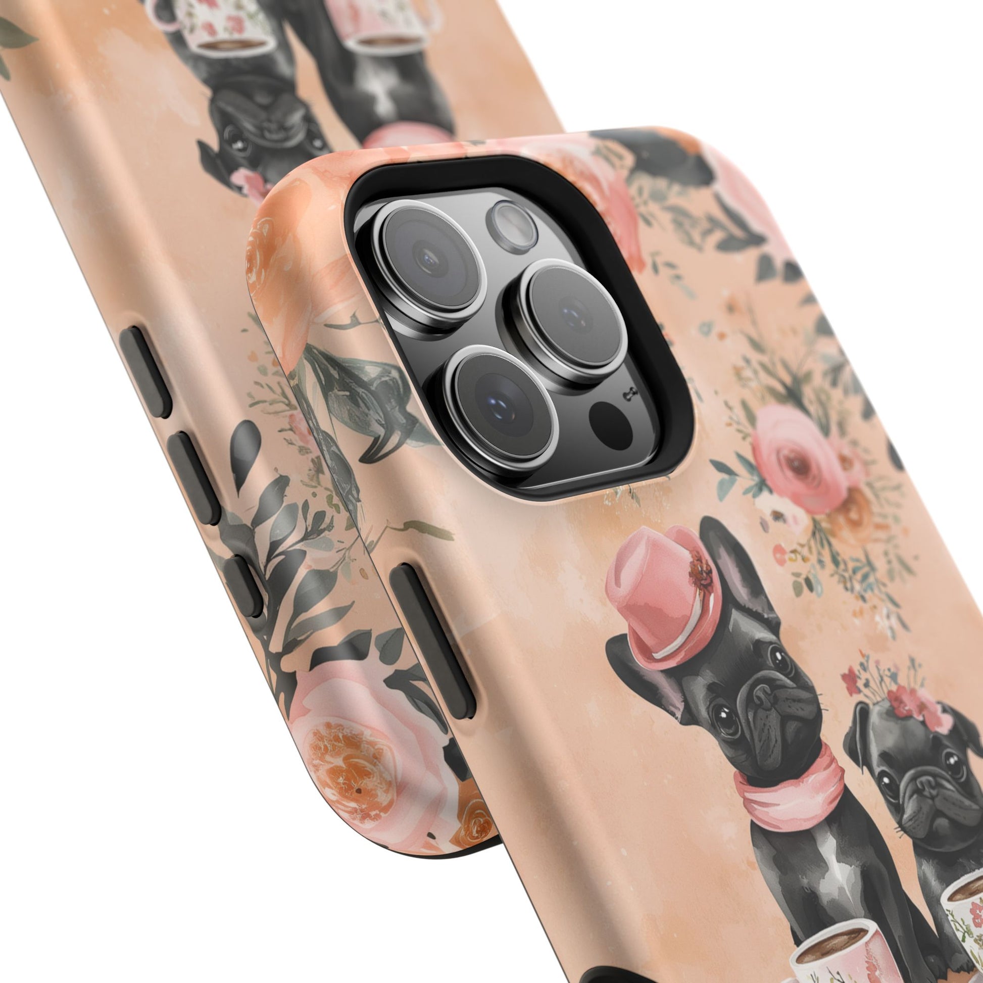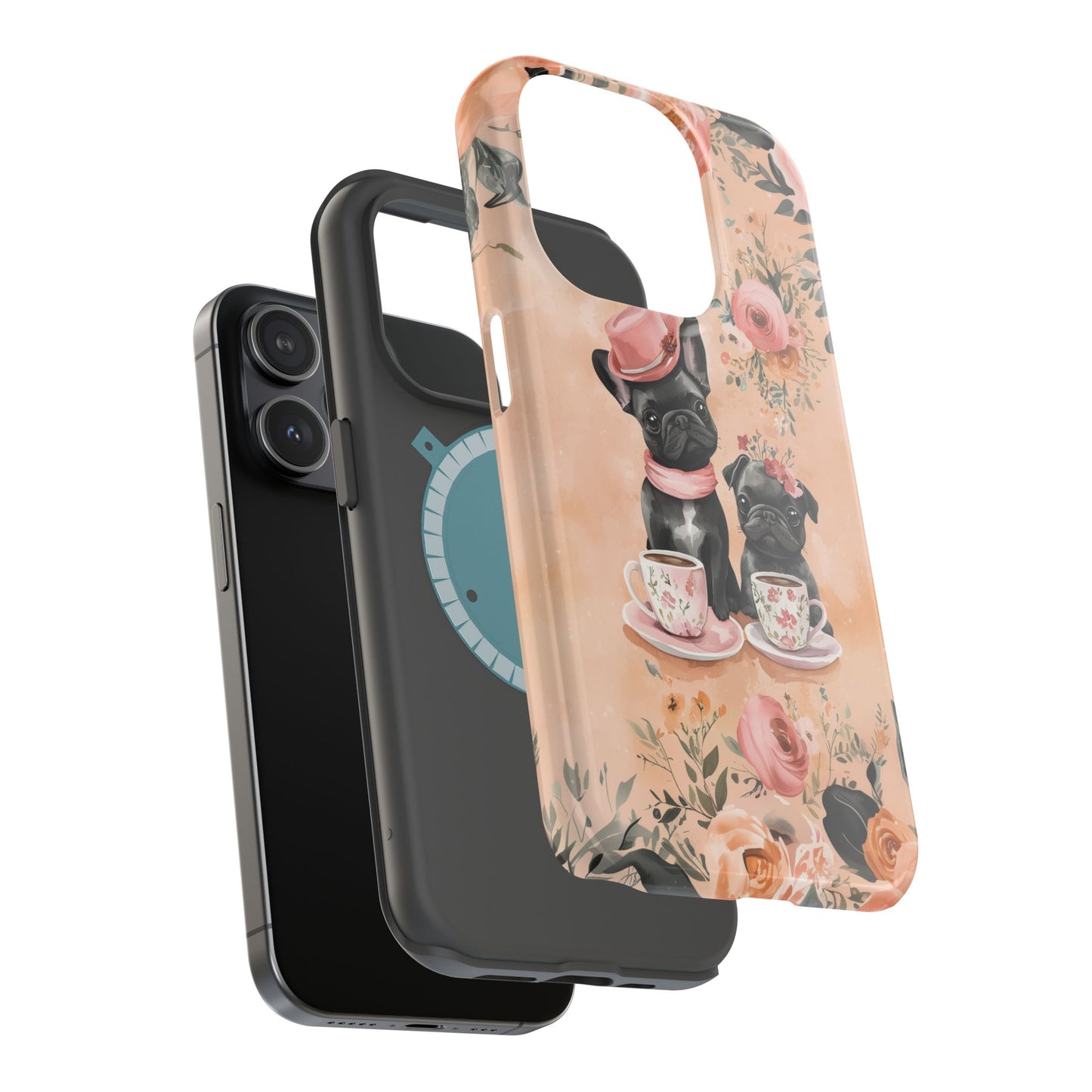 Floral French Bulldogs MagSafe iPhone Case – Elegant Dog Design with Tea Cups & Roses, Shockproof Protection