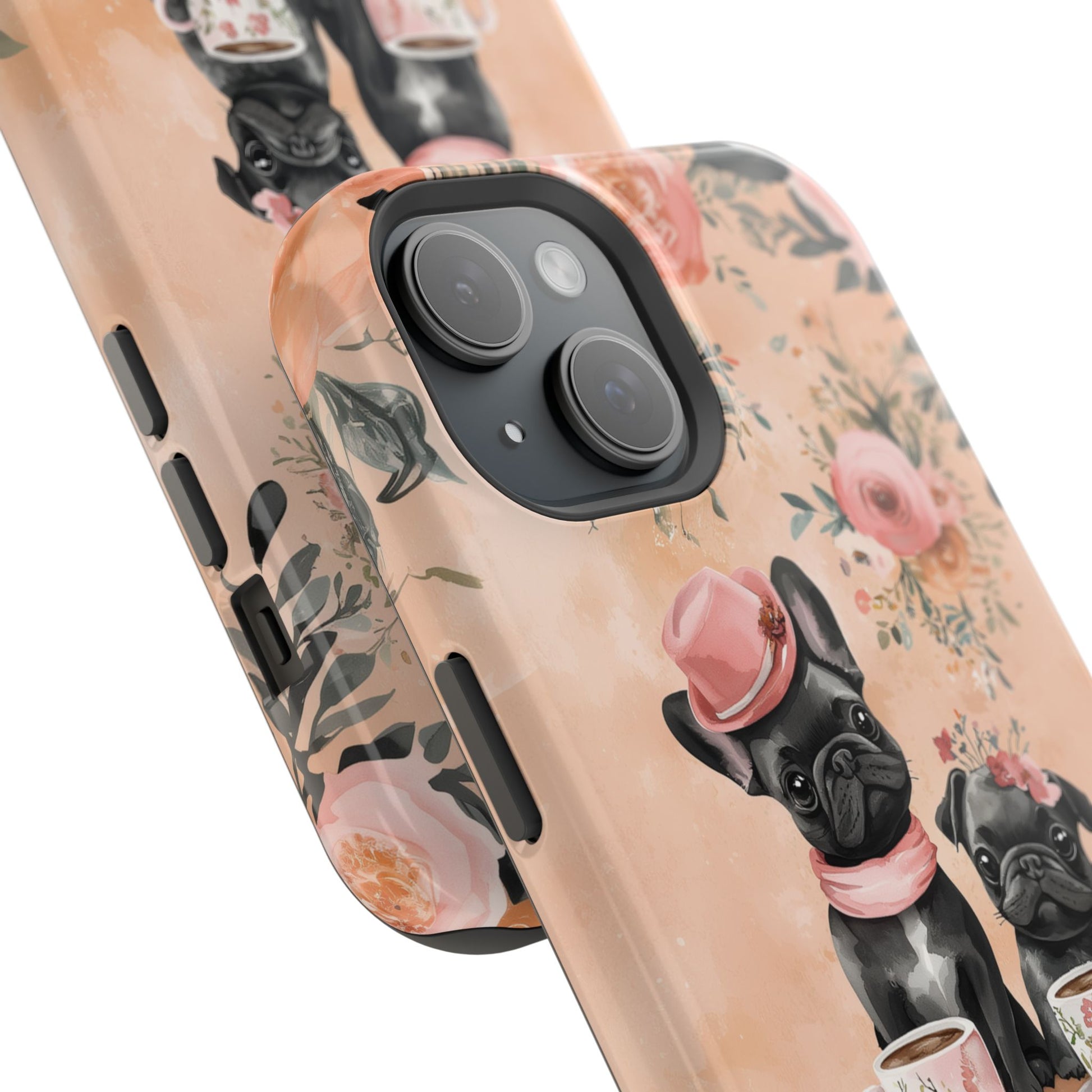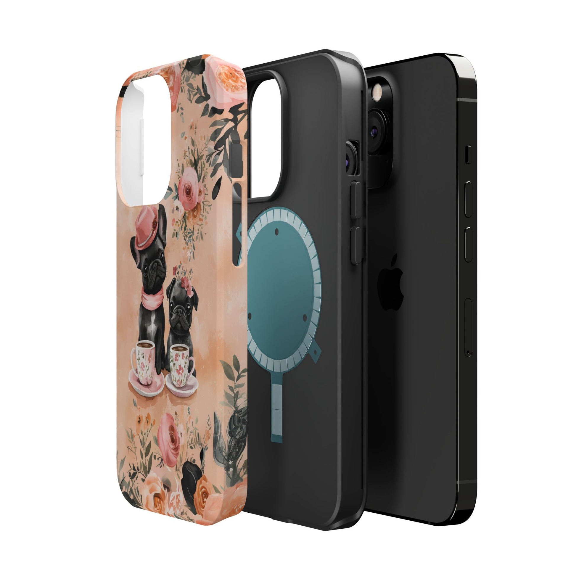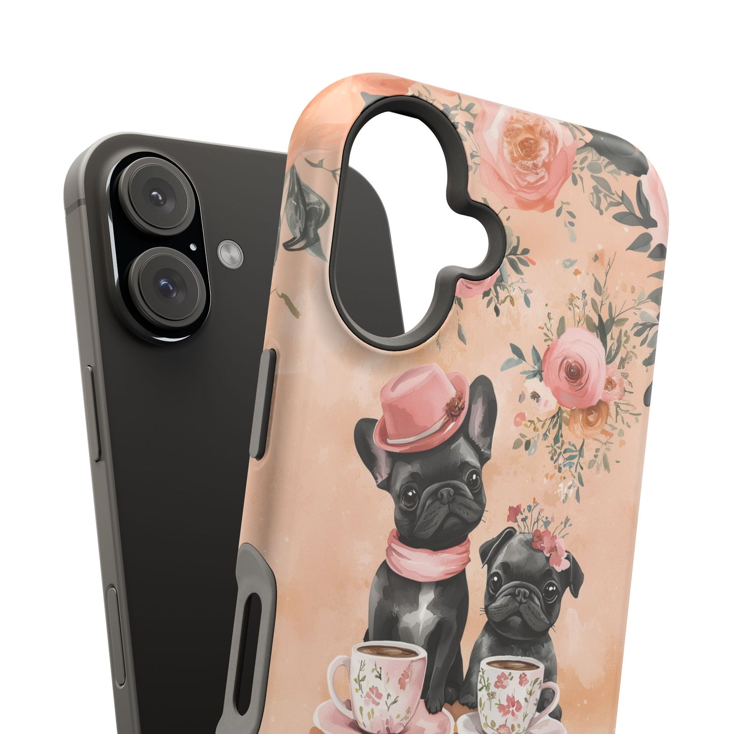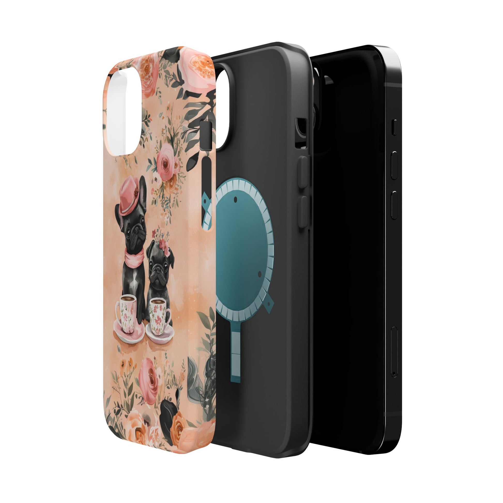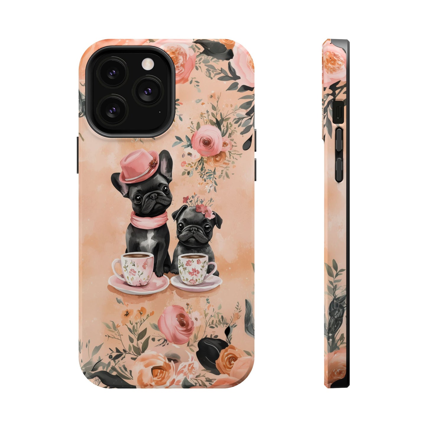 Floral French Bulldogs MagSafe iPhone Case – Elegant Dog Design with Tea Cups & Roses, Shockproof Protection
