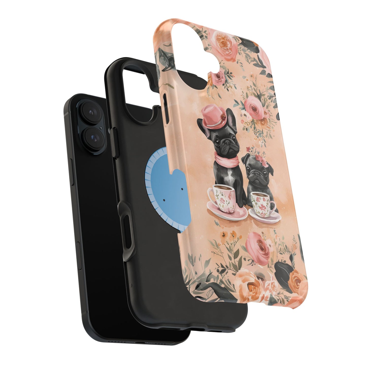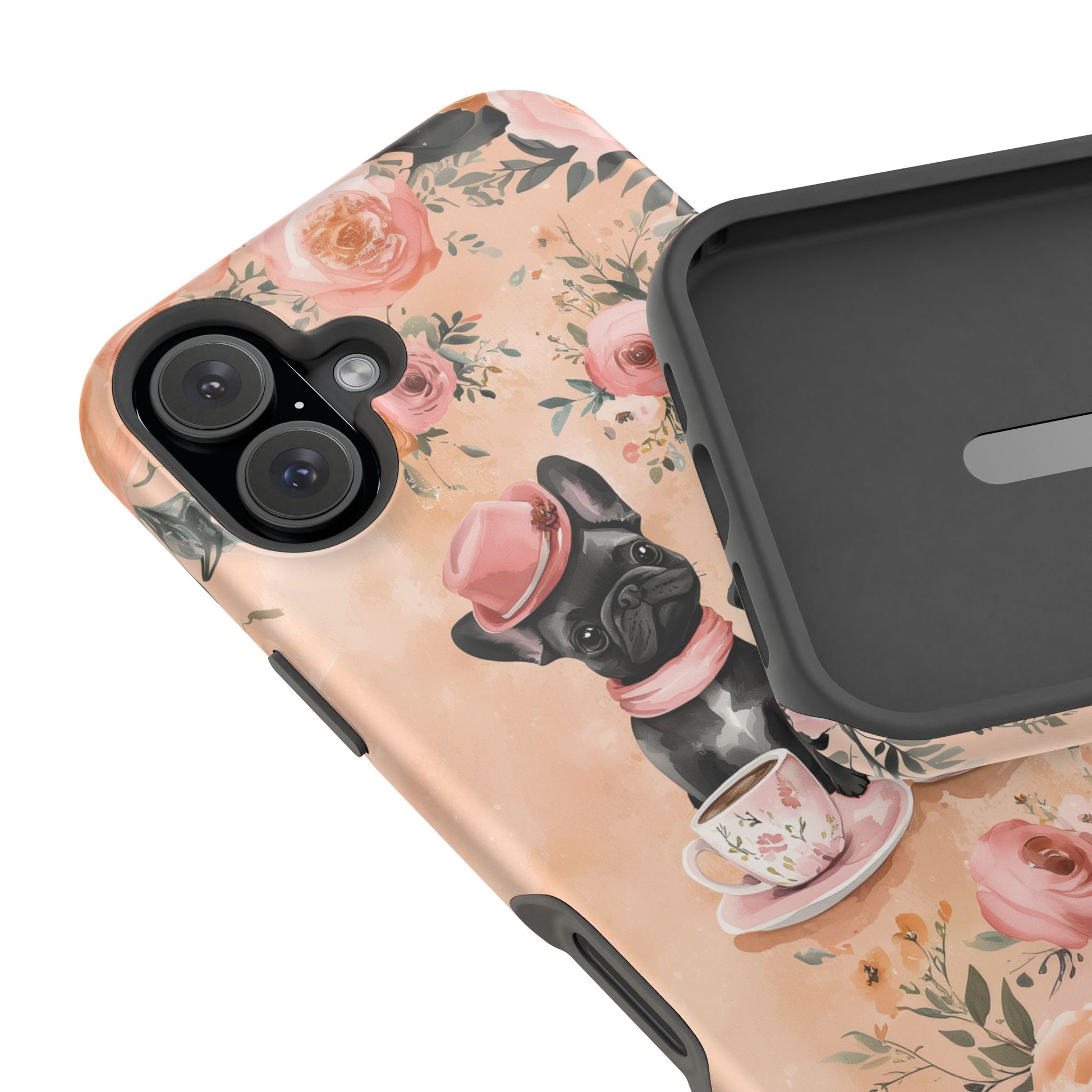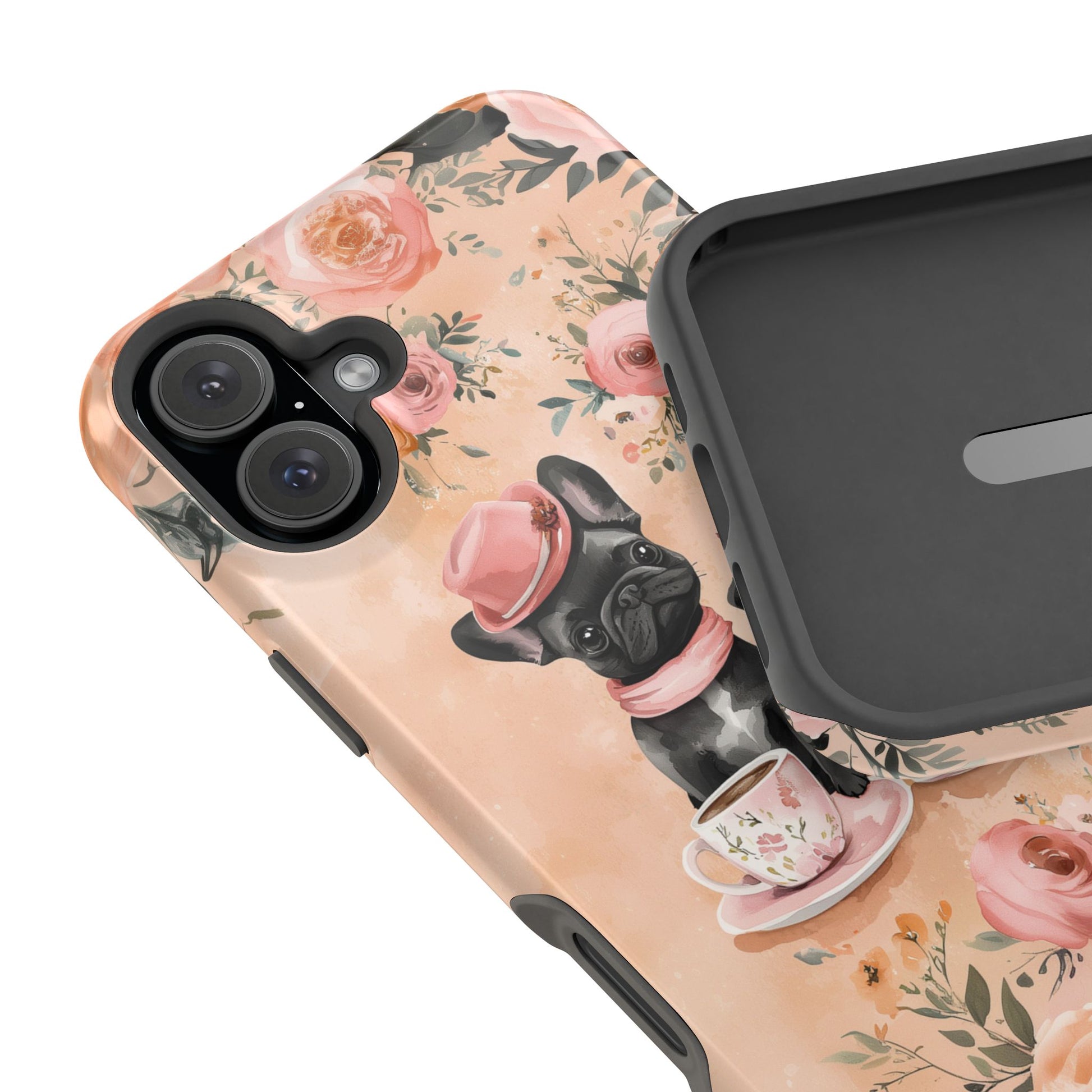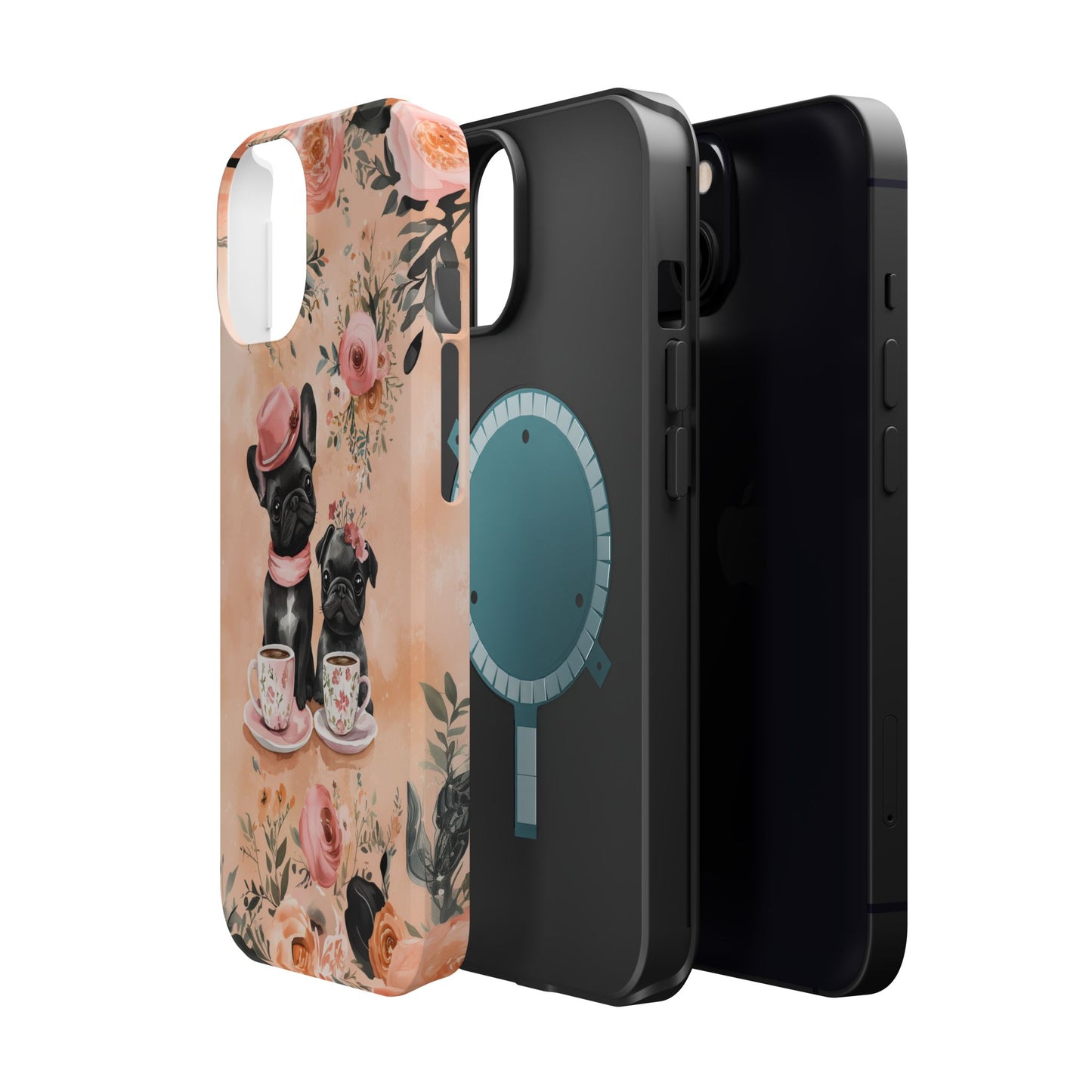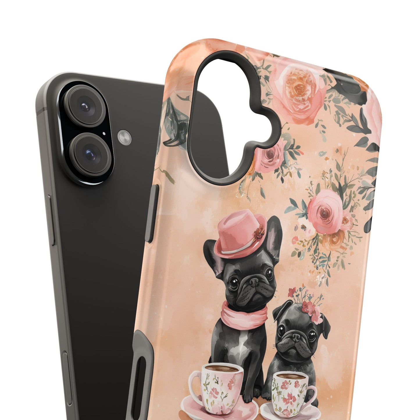 Floral French Bulldogs MagSafe iPhone Case – Elegant Dog Design with Tea Cups & Roses, Shockproof Protection