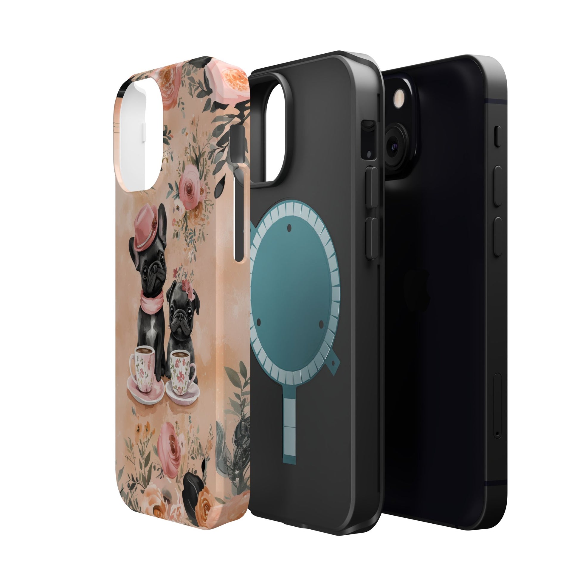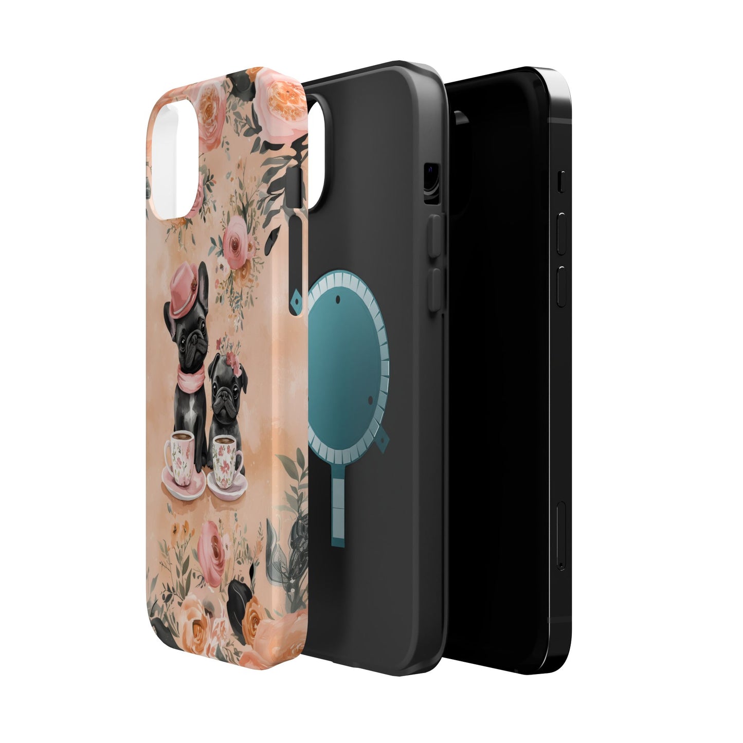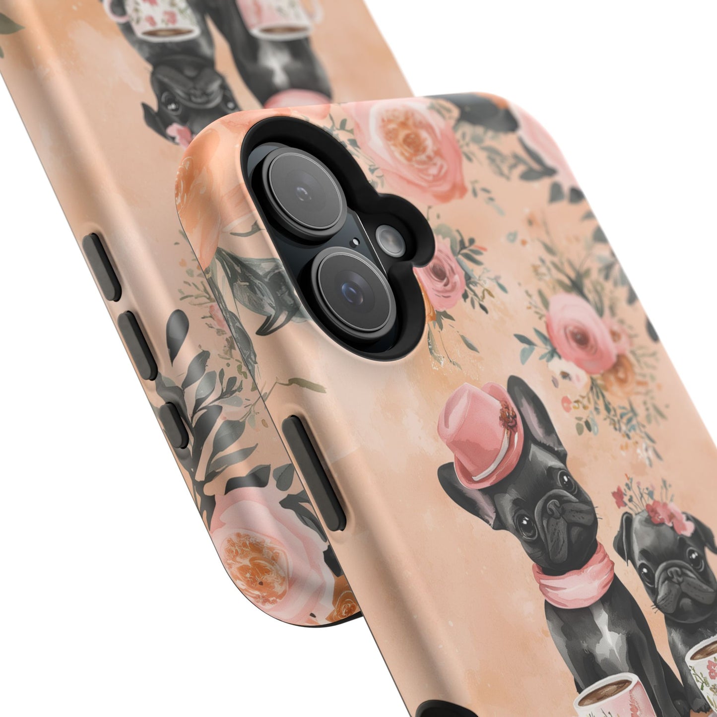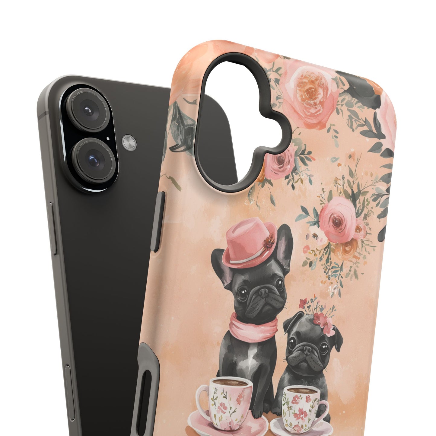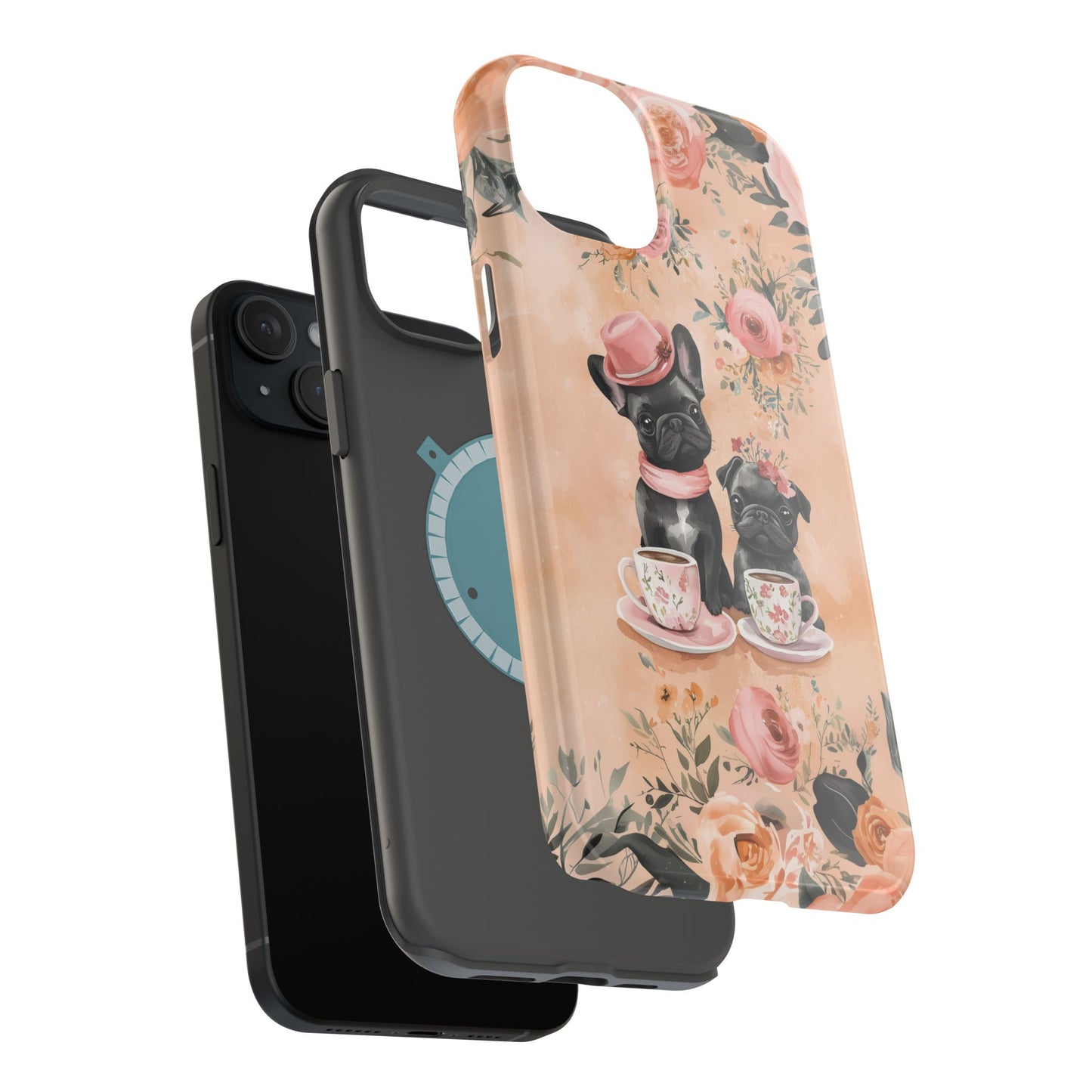 Floral French Bulldogs MagSafe iPhone Case – Elegant Dog Design with Tea Cups & Roses, Shockproof Protection