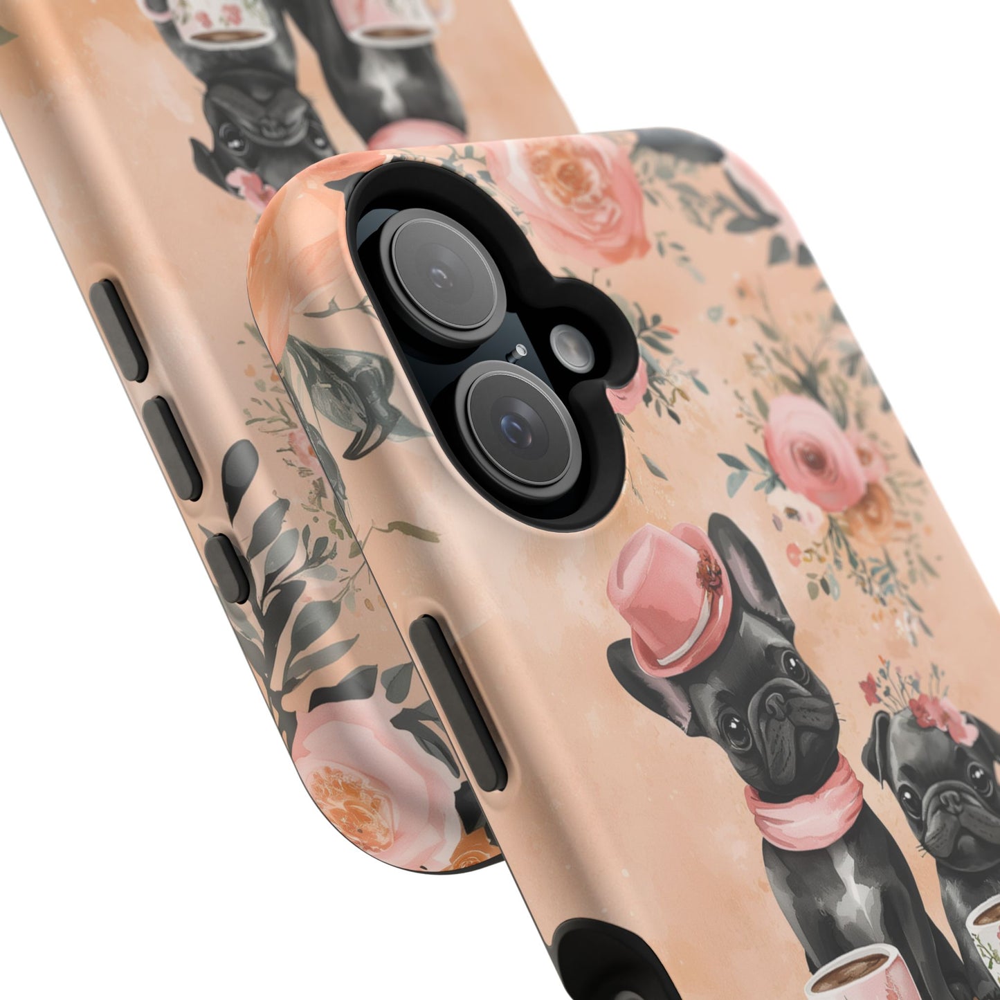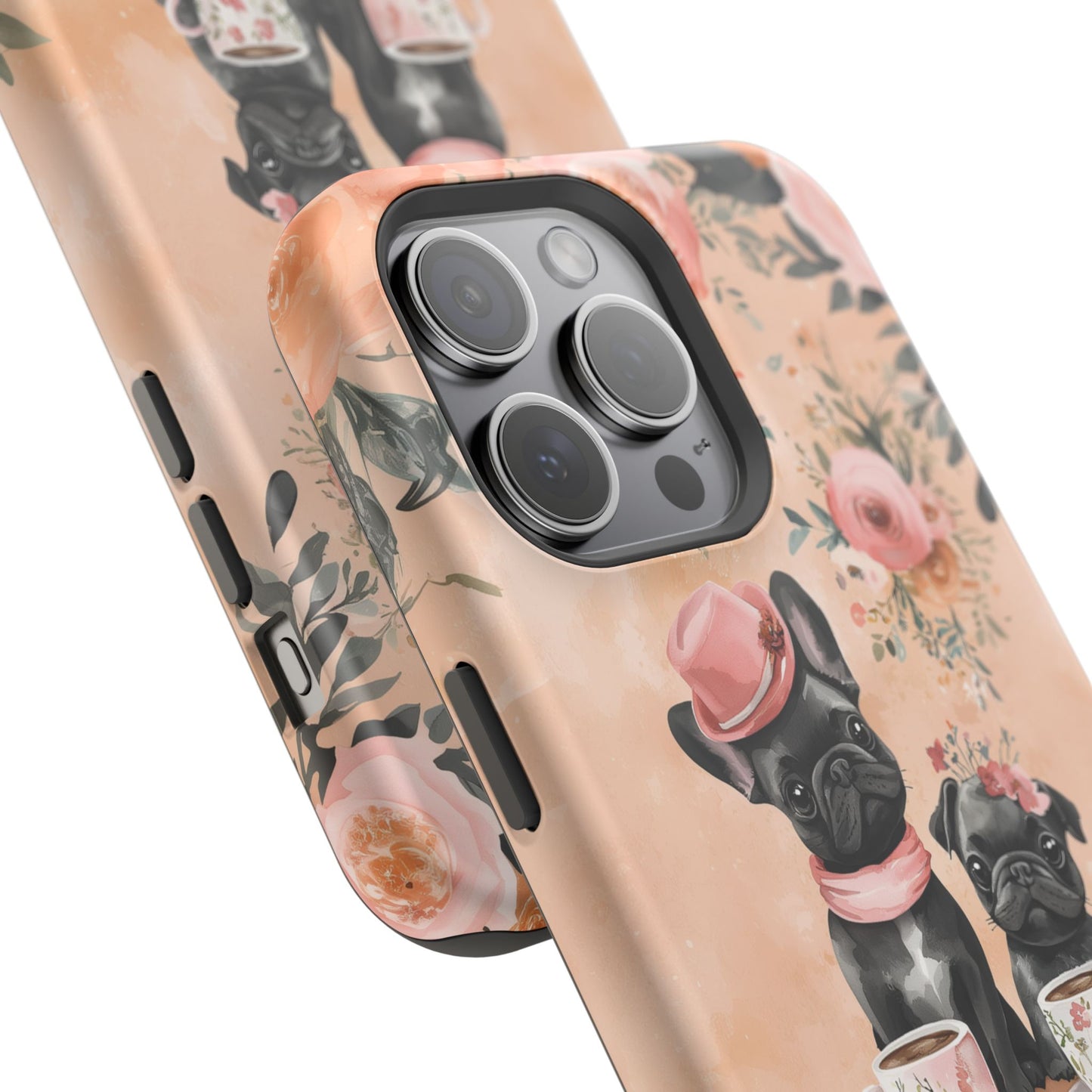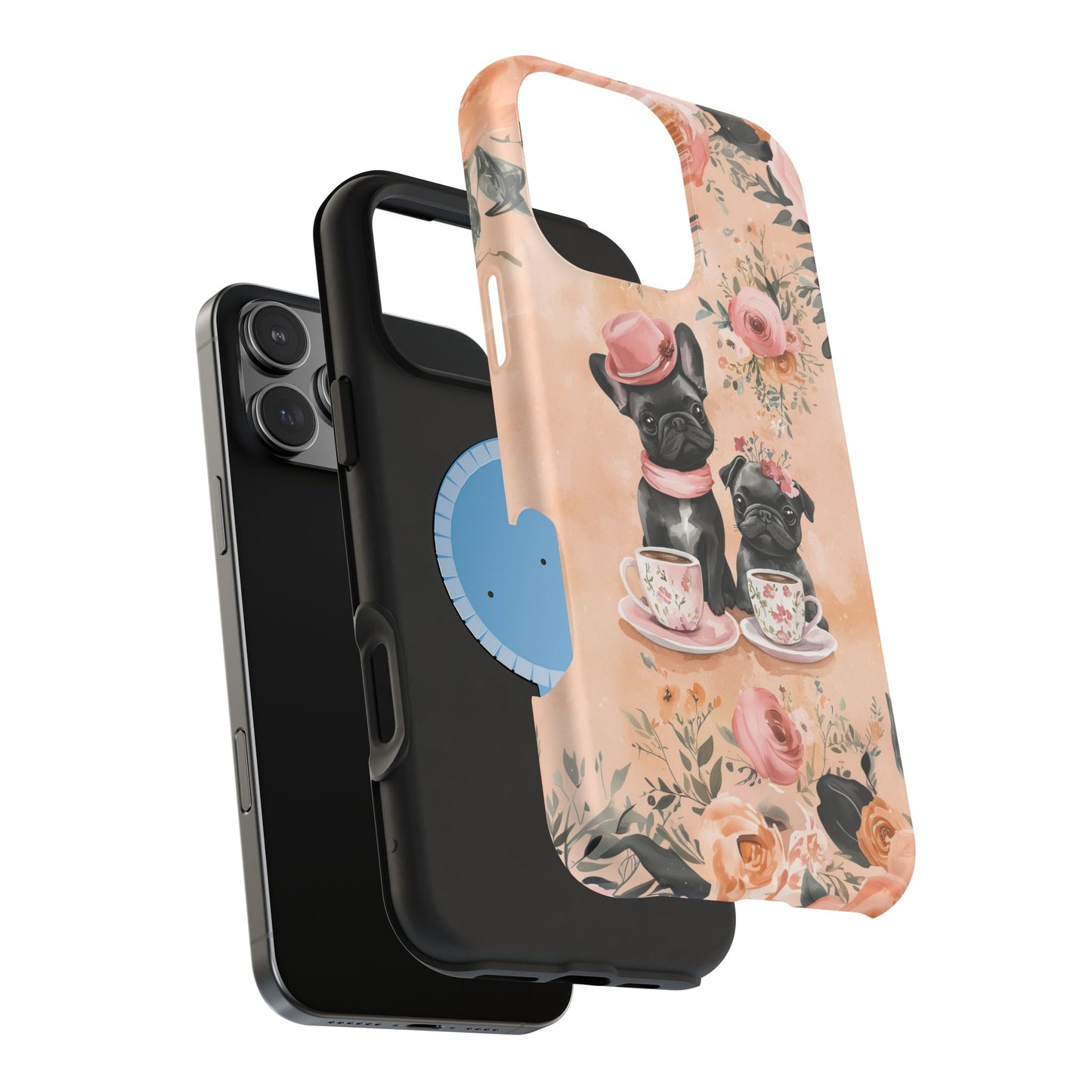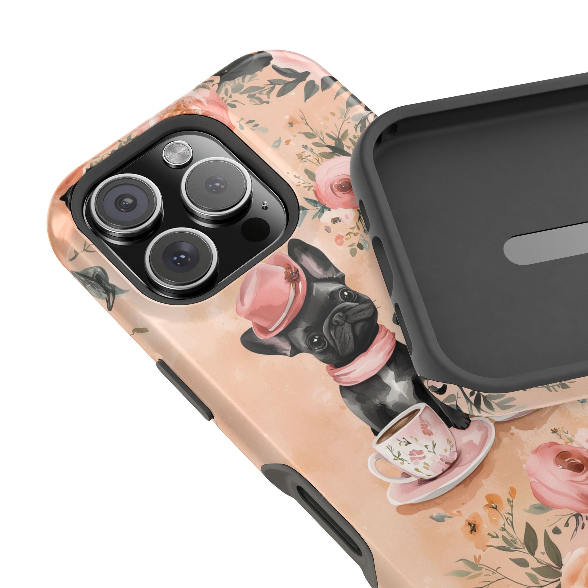 Floral French Bulldogs MagSafe iPhone Case – Elegant Dog Design with Tea Cups & Roses, Shockproof Protection