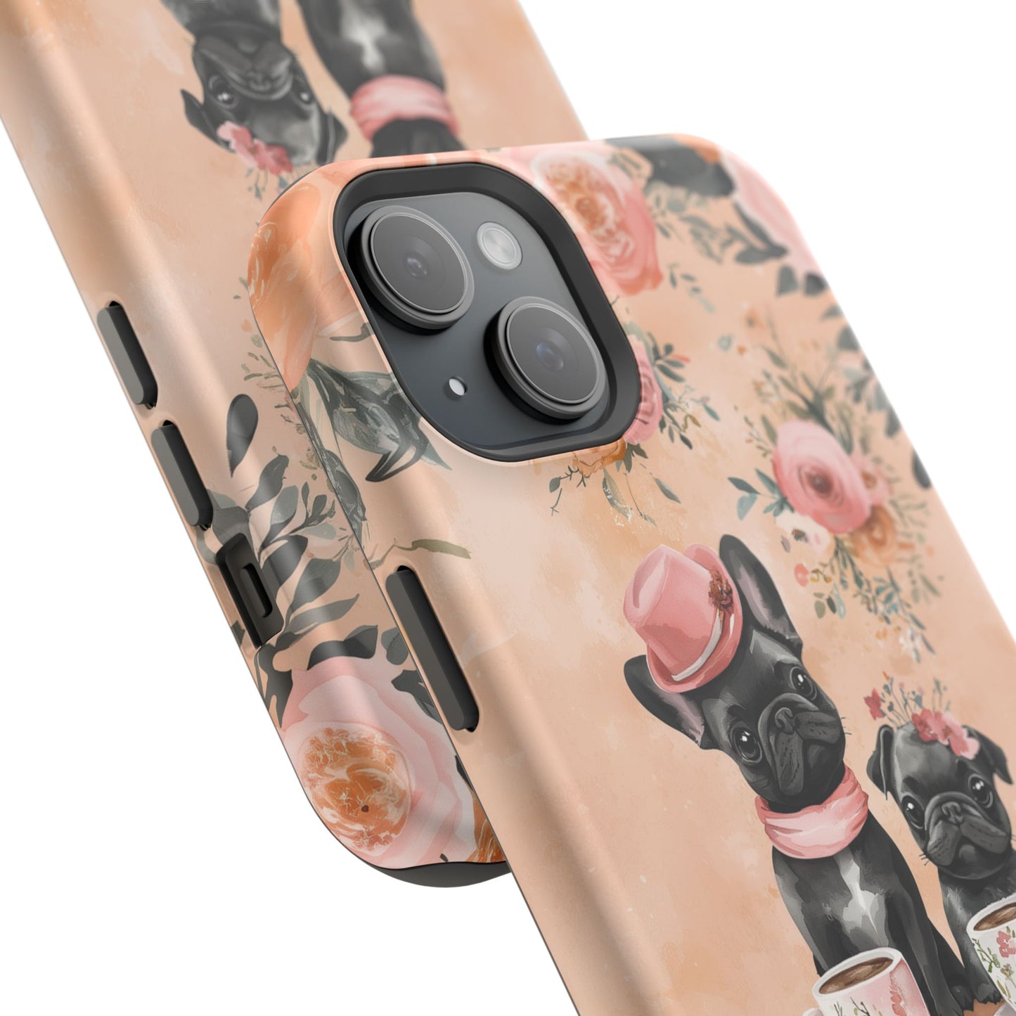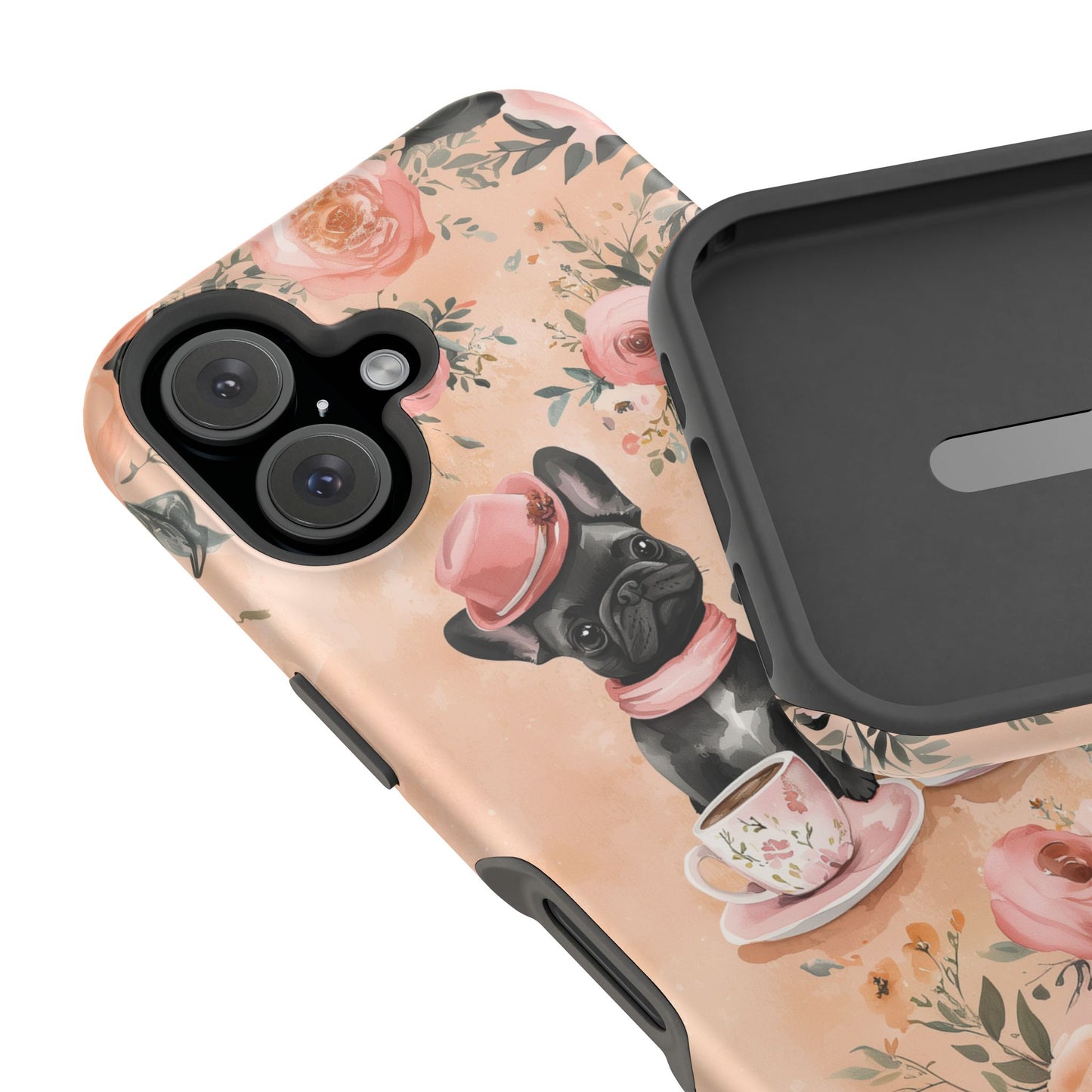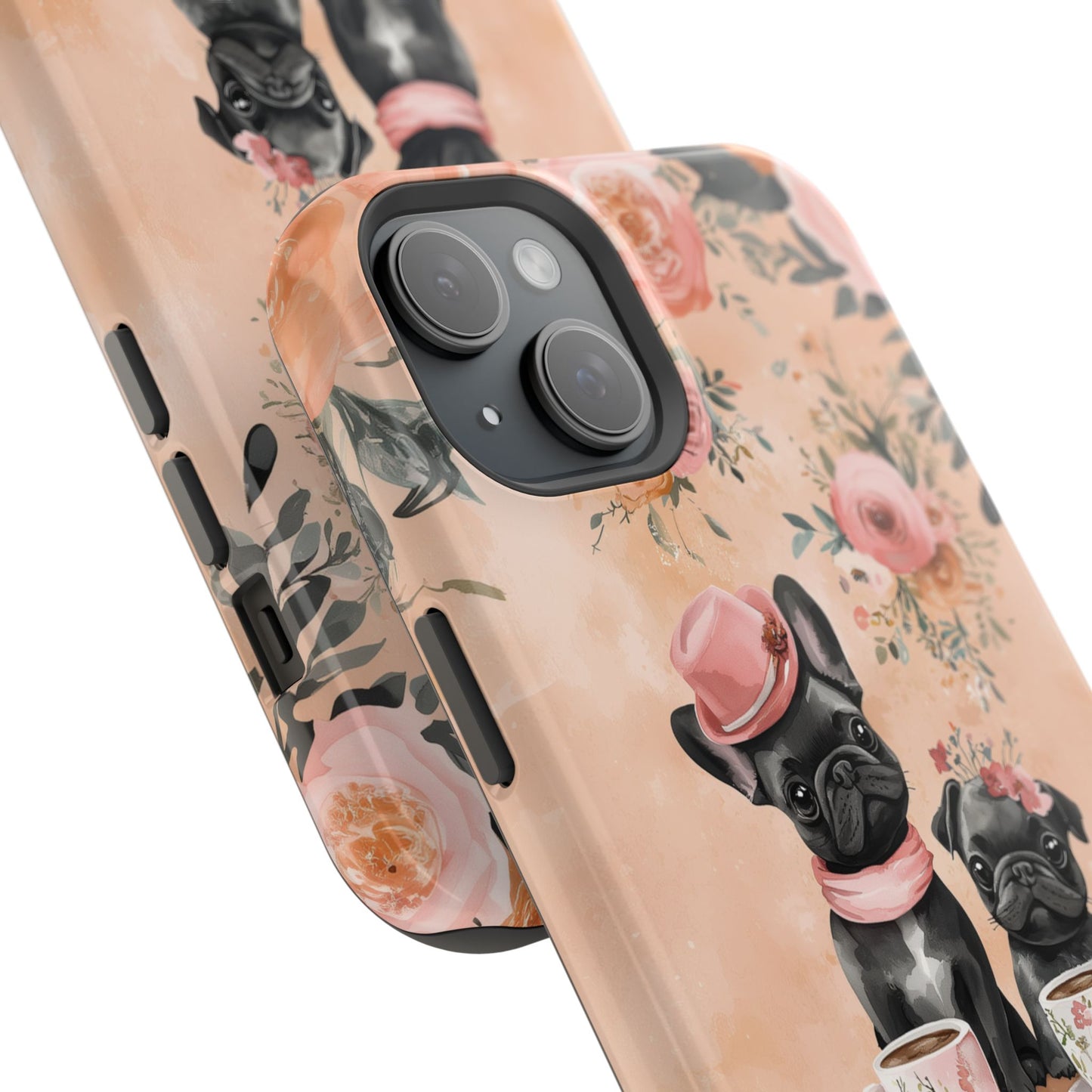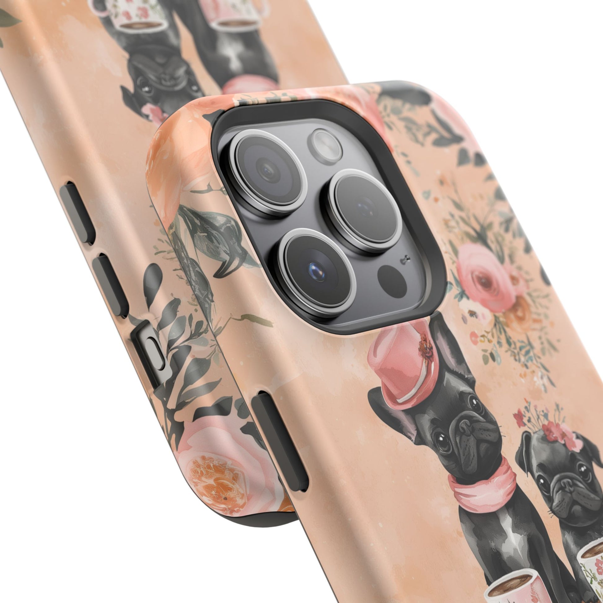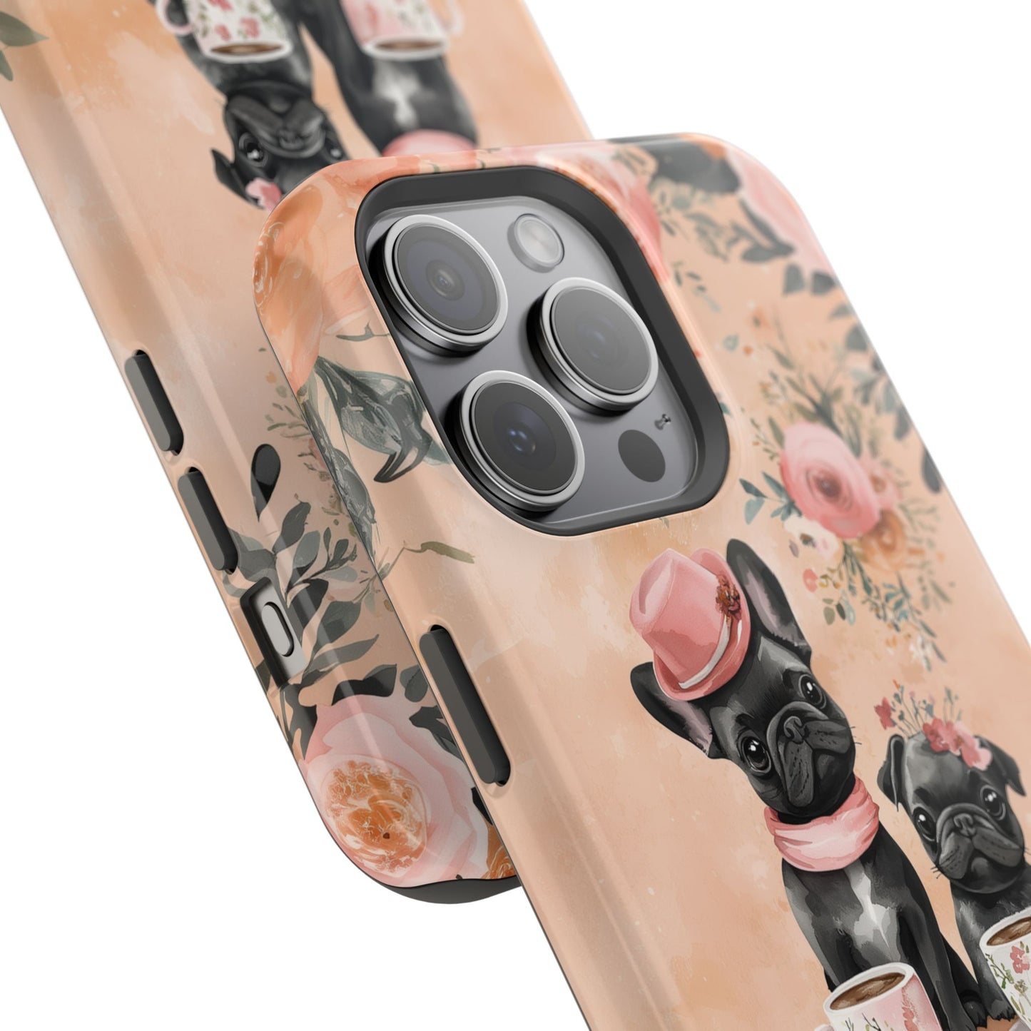 Floral French Bulldogs MagSafe iPhone Case – Elegant Dog Design with Tea Cups & Roses, Shockproof Protection