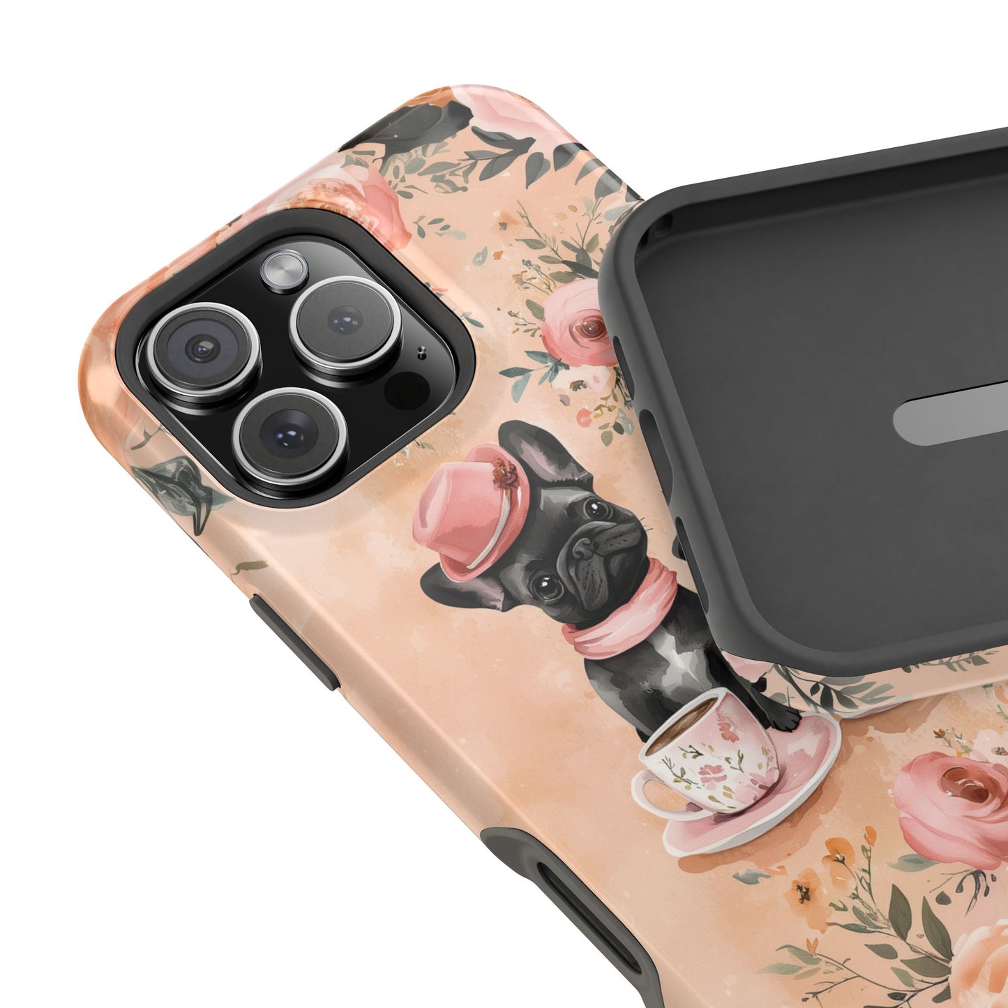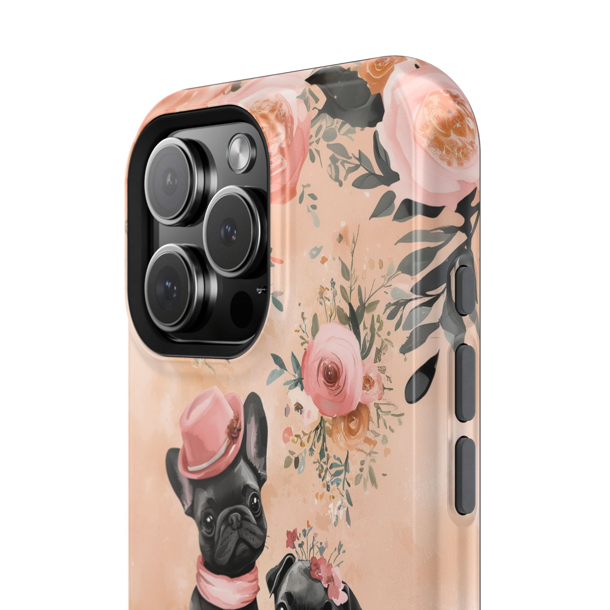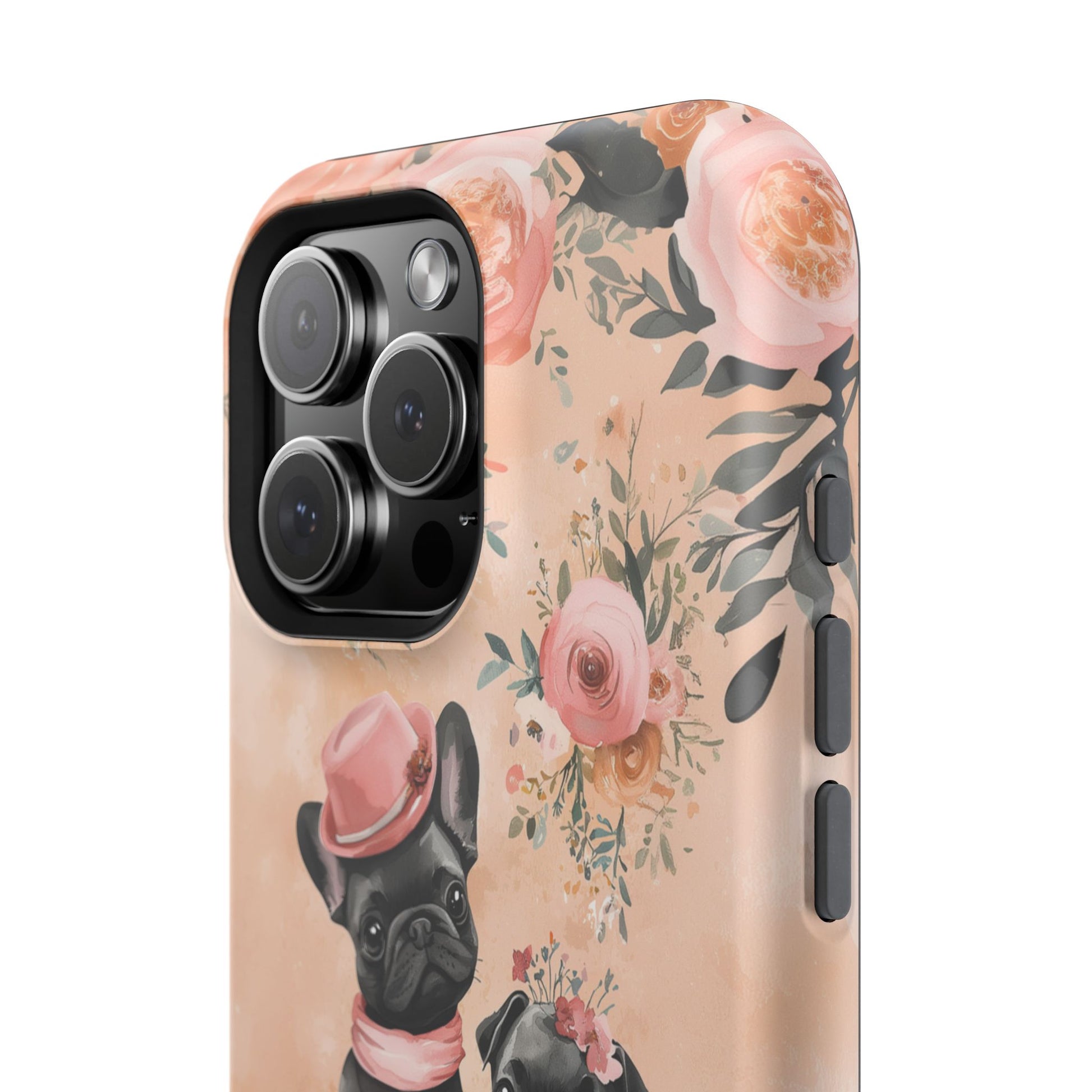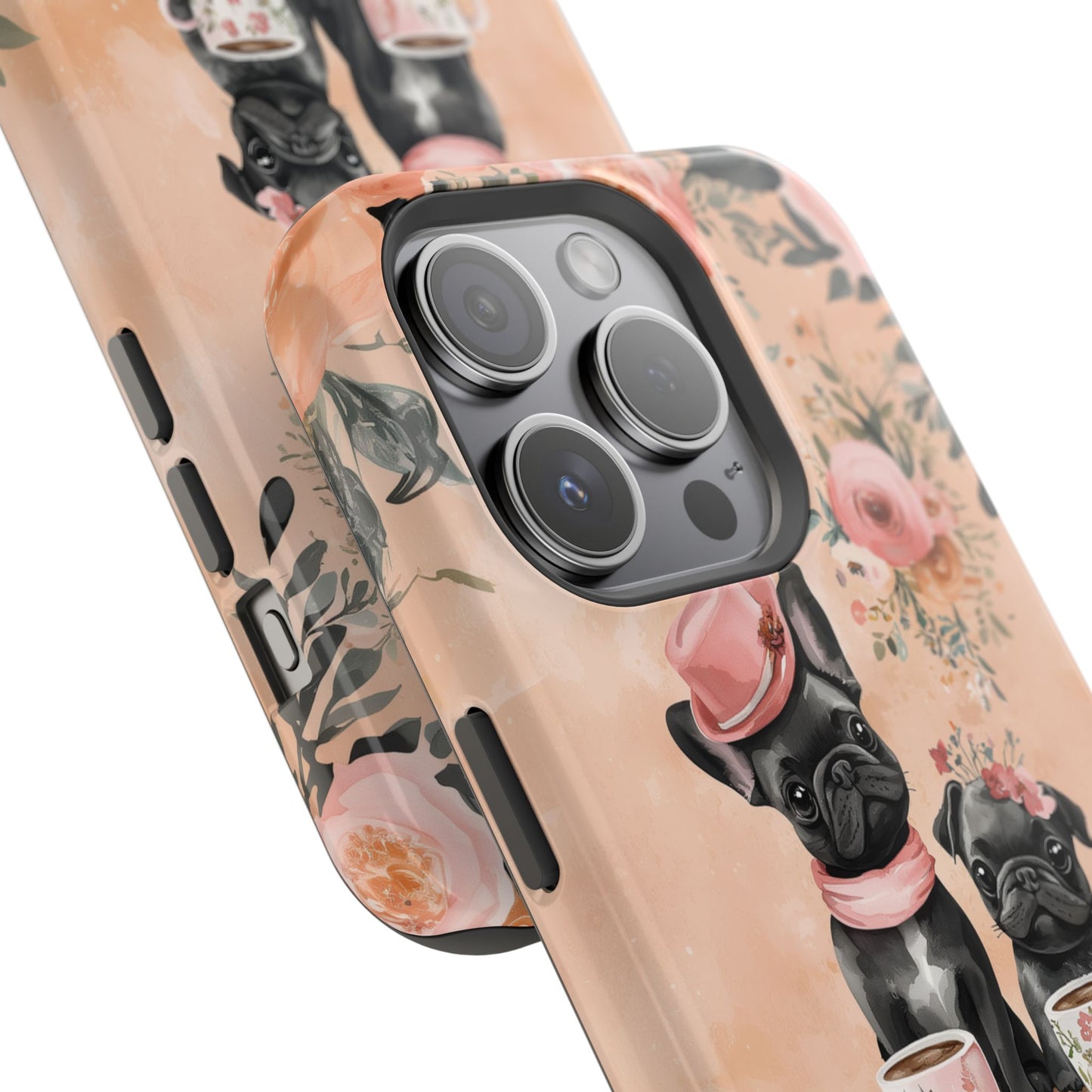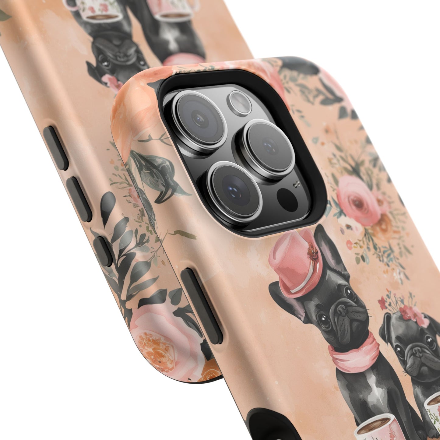 Floral French Bulldogs MagSafe iPhone Case – Elegant Dog Design with Tea Cups & Roses, Shockproof Protection