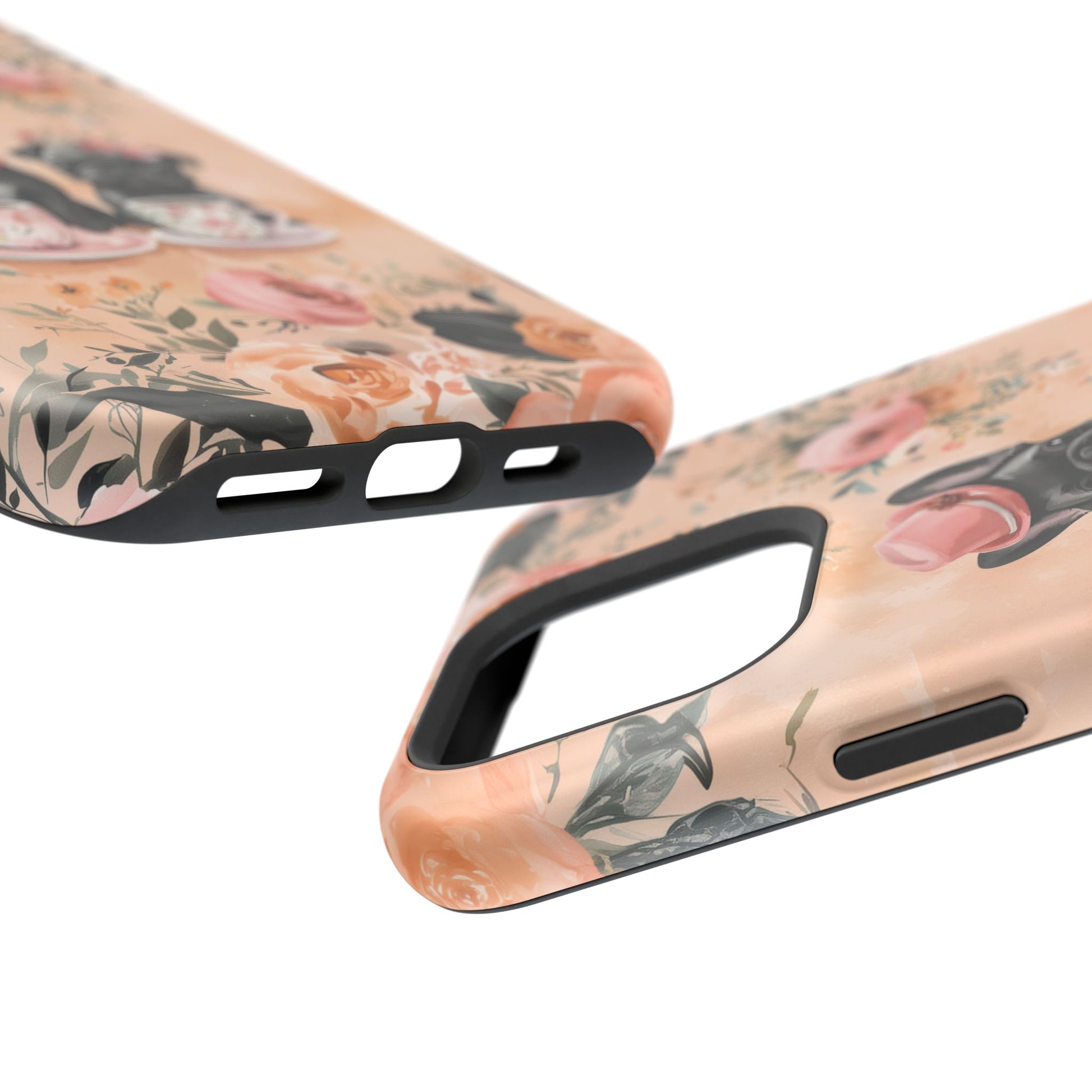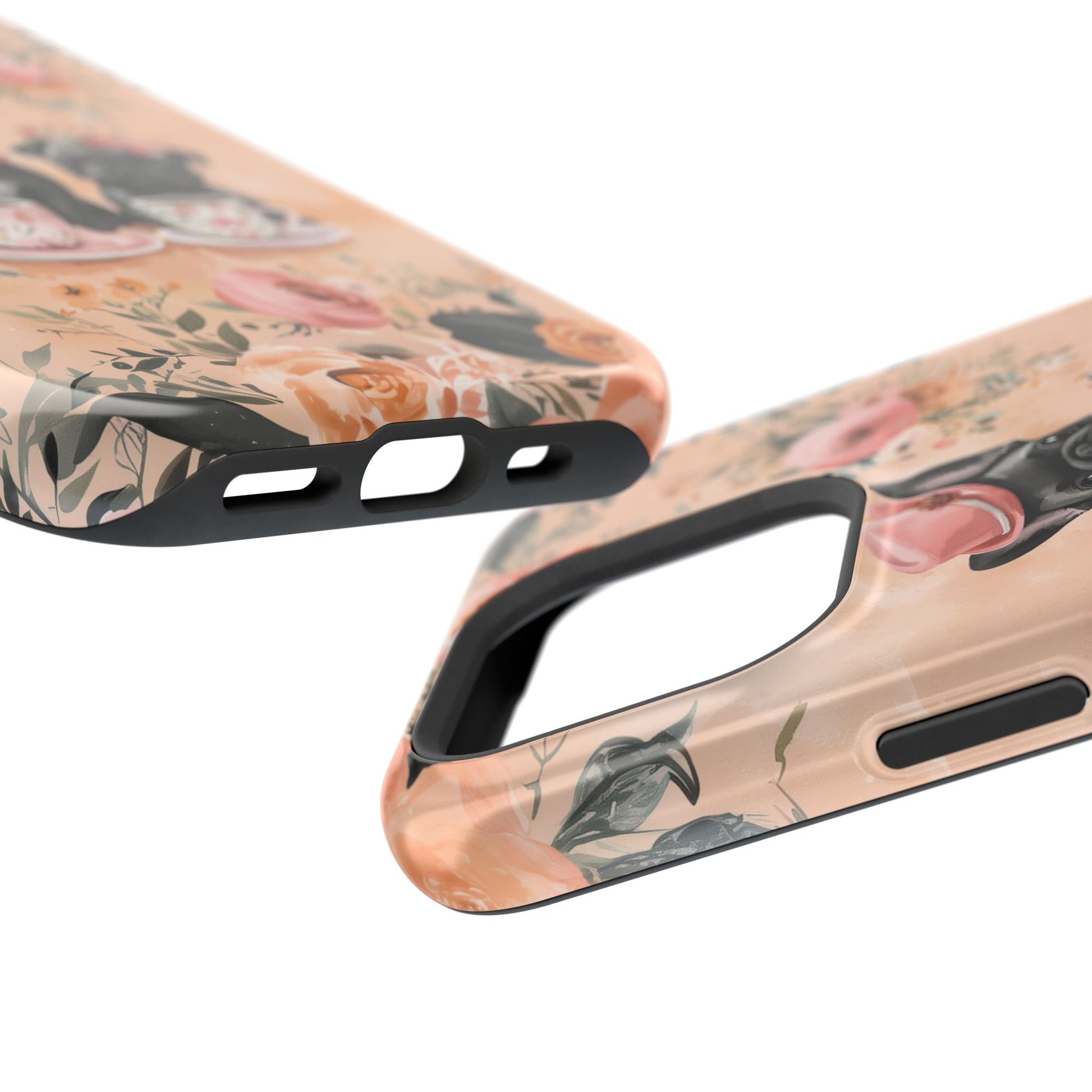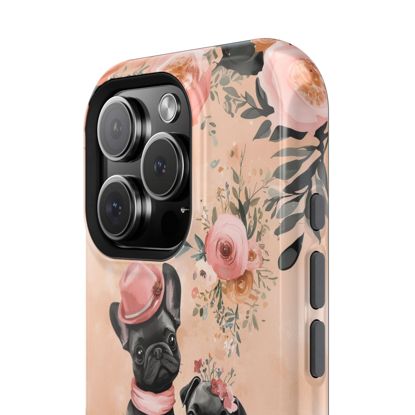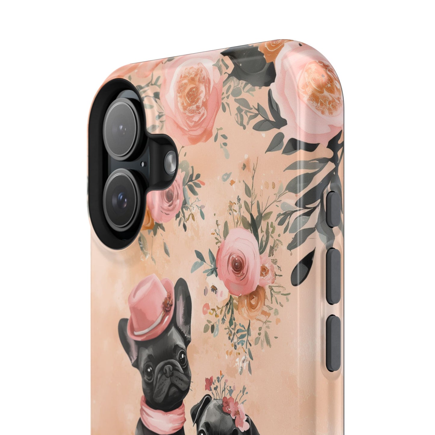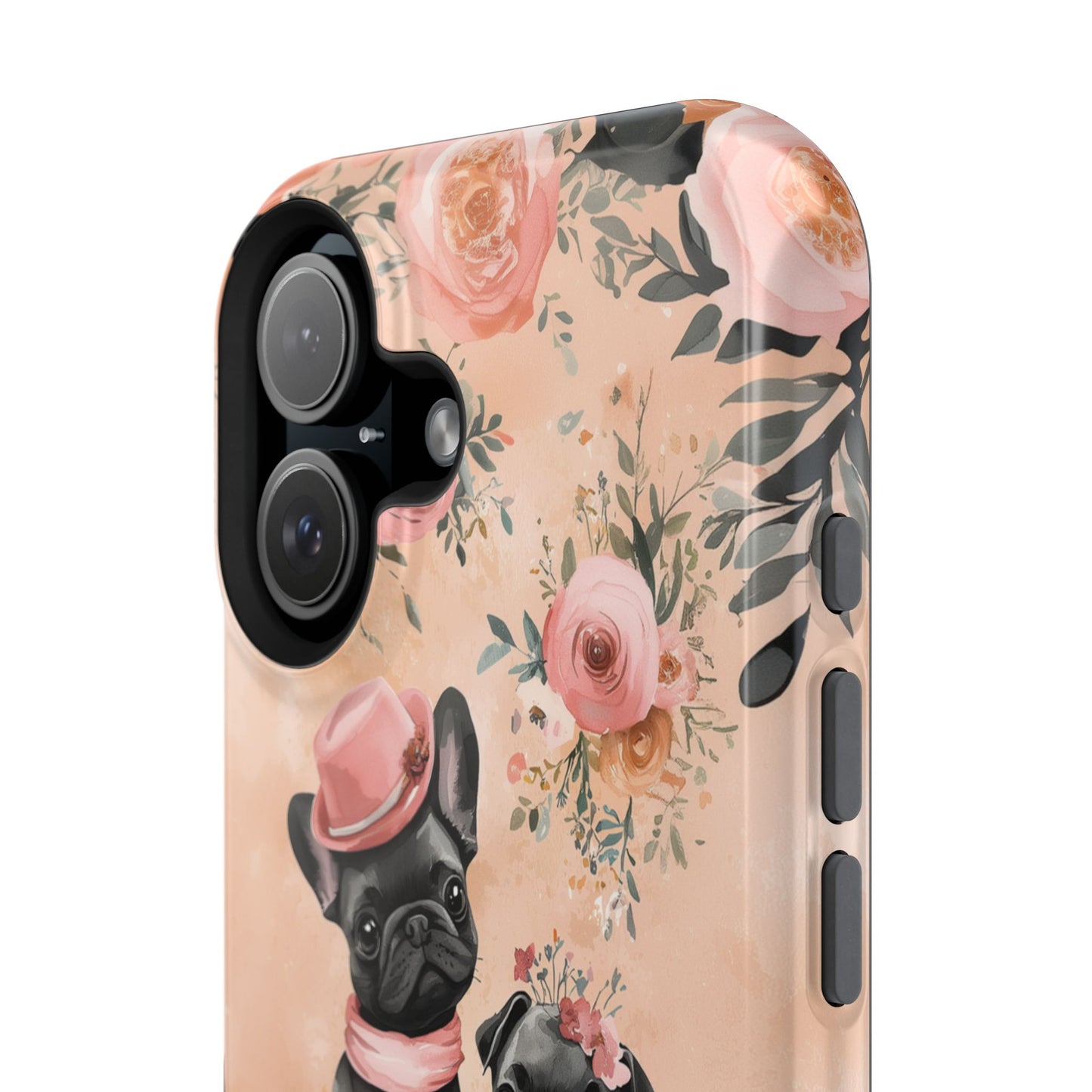 Floral French Bulldogs MagSafe iPhone Case – Elegant Dog Design with Tea Cups & Roses, Shockproof Protection