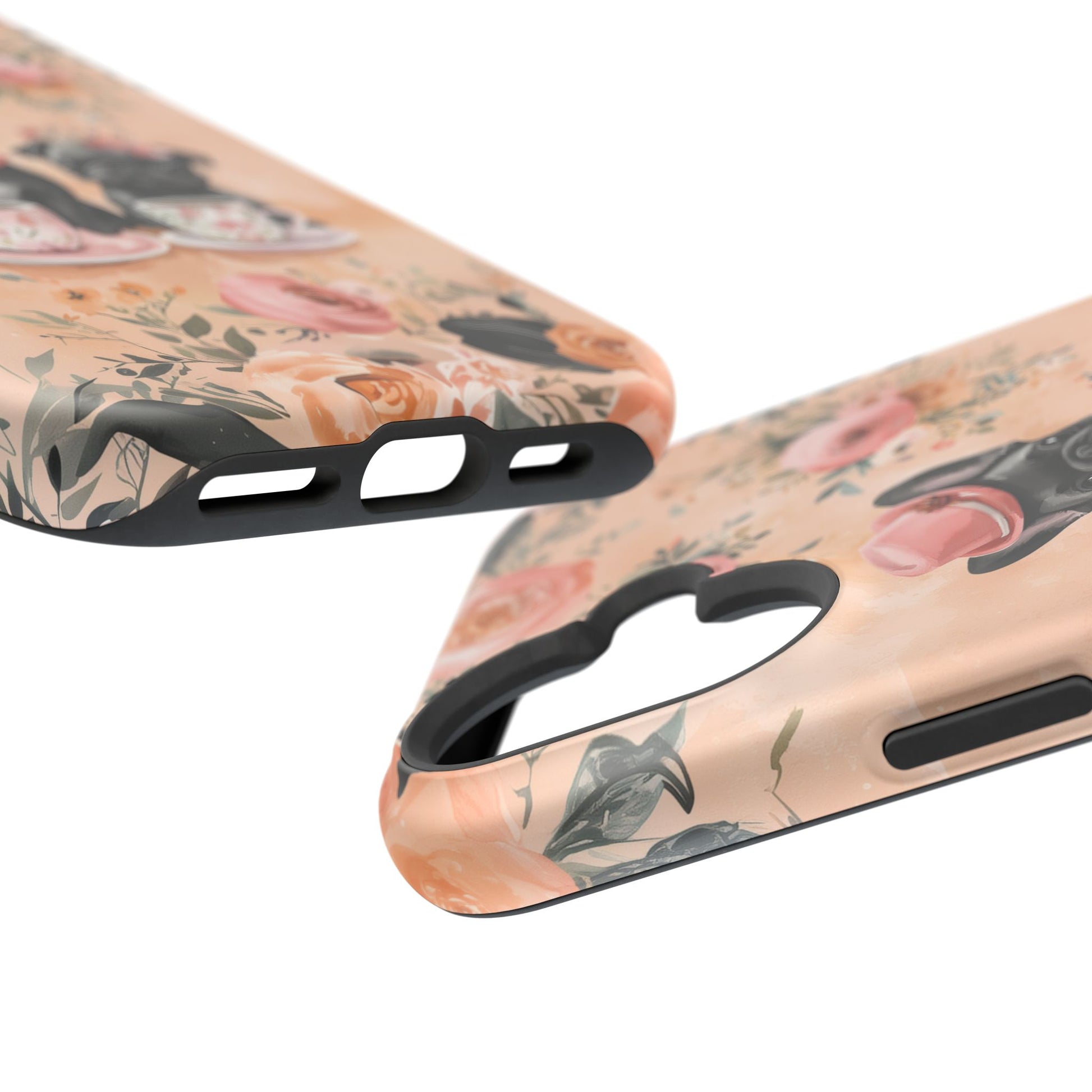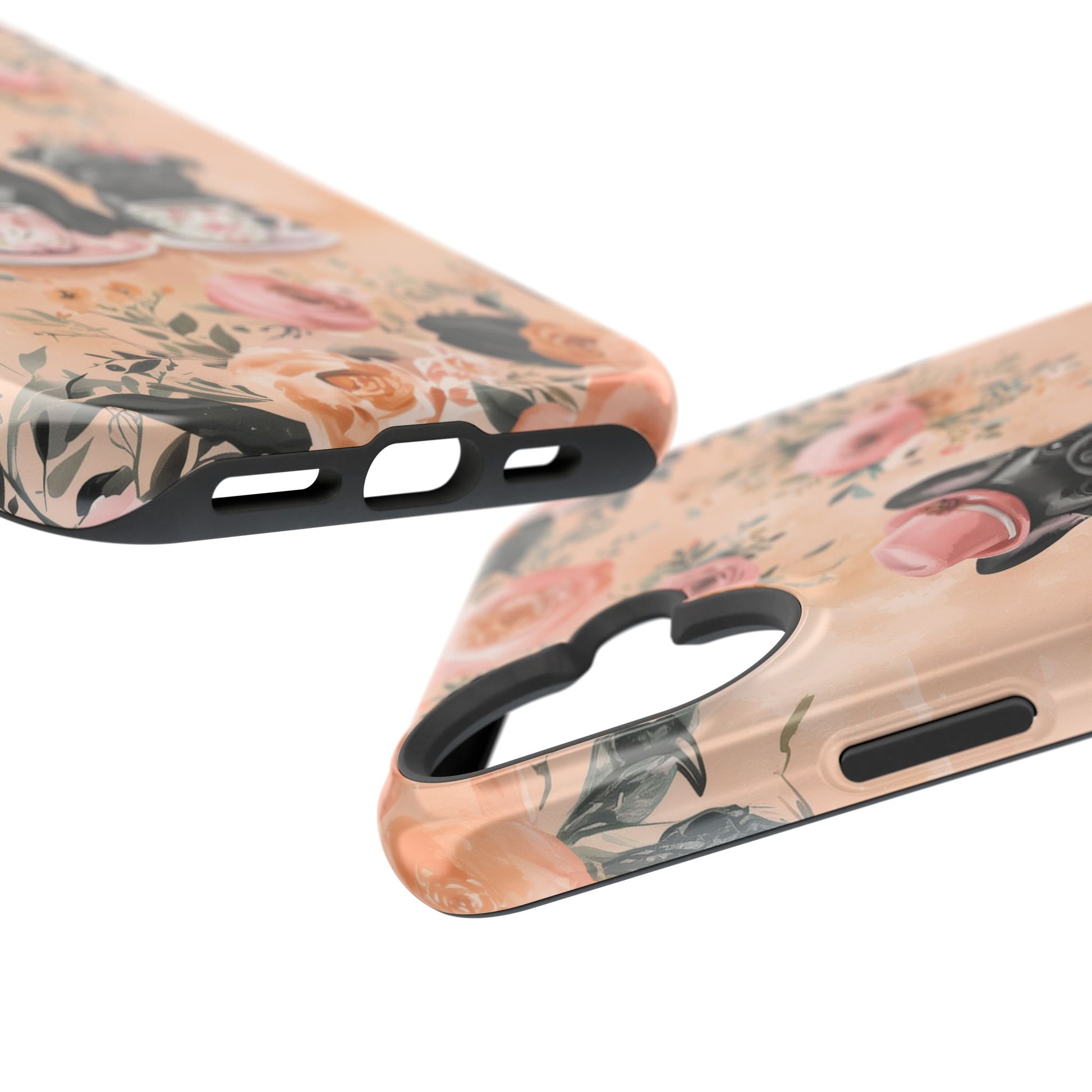 Elevate your phone's style with this delightful Floral French Bulldogs iPhone case! Featuring two sophisticated French Bulldogs, one in a stylish hat and scarf, sipping from floral teacups amidst a gorgeous backdrop of soft blush roses and greenery. The warm peachy tones and vintage-inspired design create a romantic, whimsical vibe that's perfect for dog lovers with an eye for elegance. With its shockproof protection and slim fit, this case combines beauty and practicality, making it the perfect accessory to keep your phone both safe and chic.