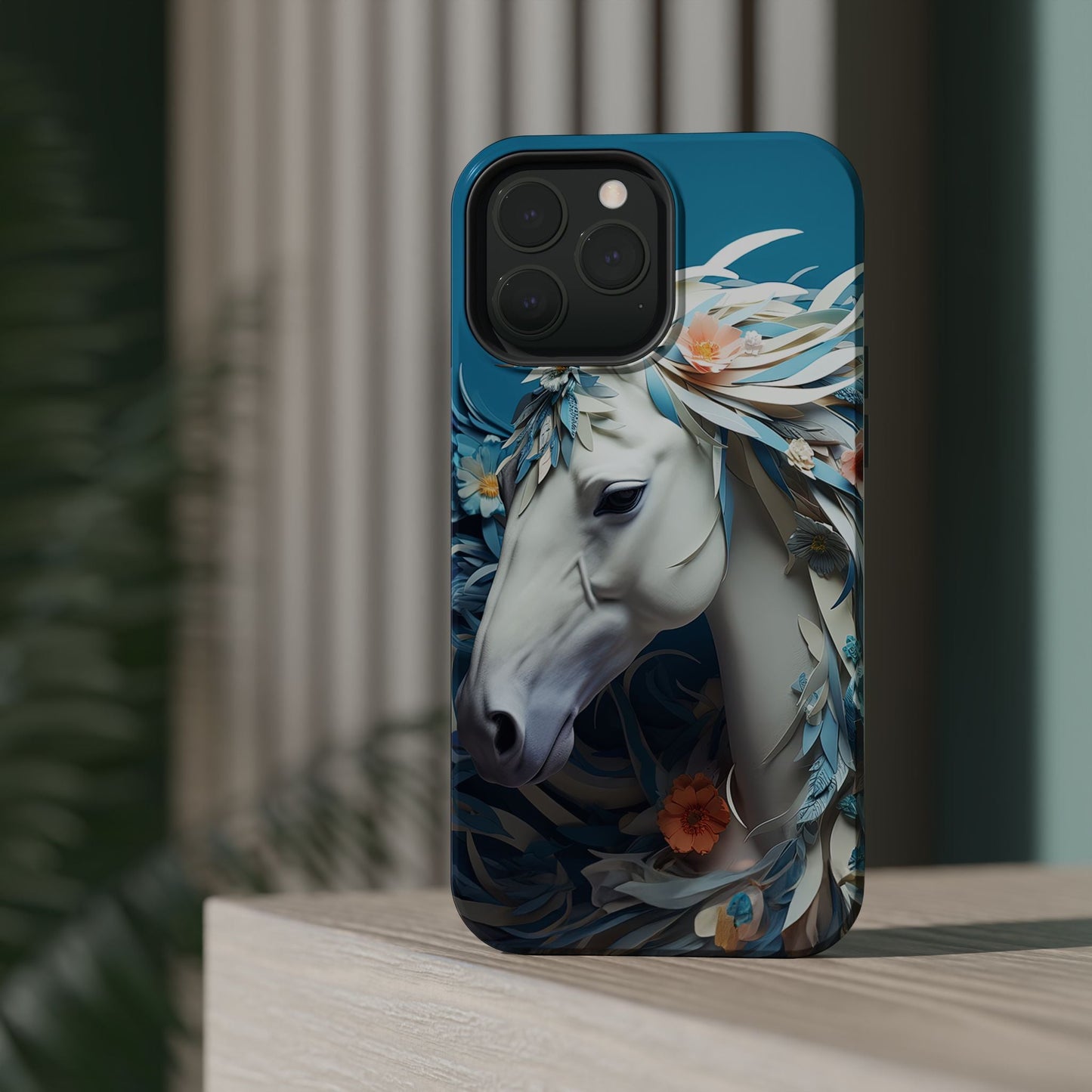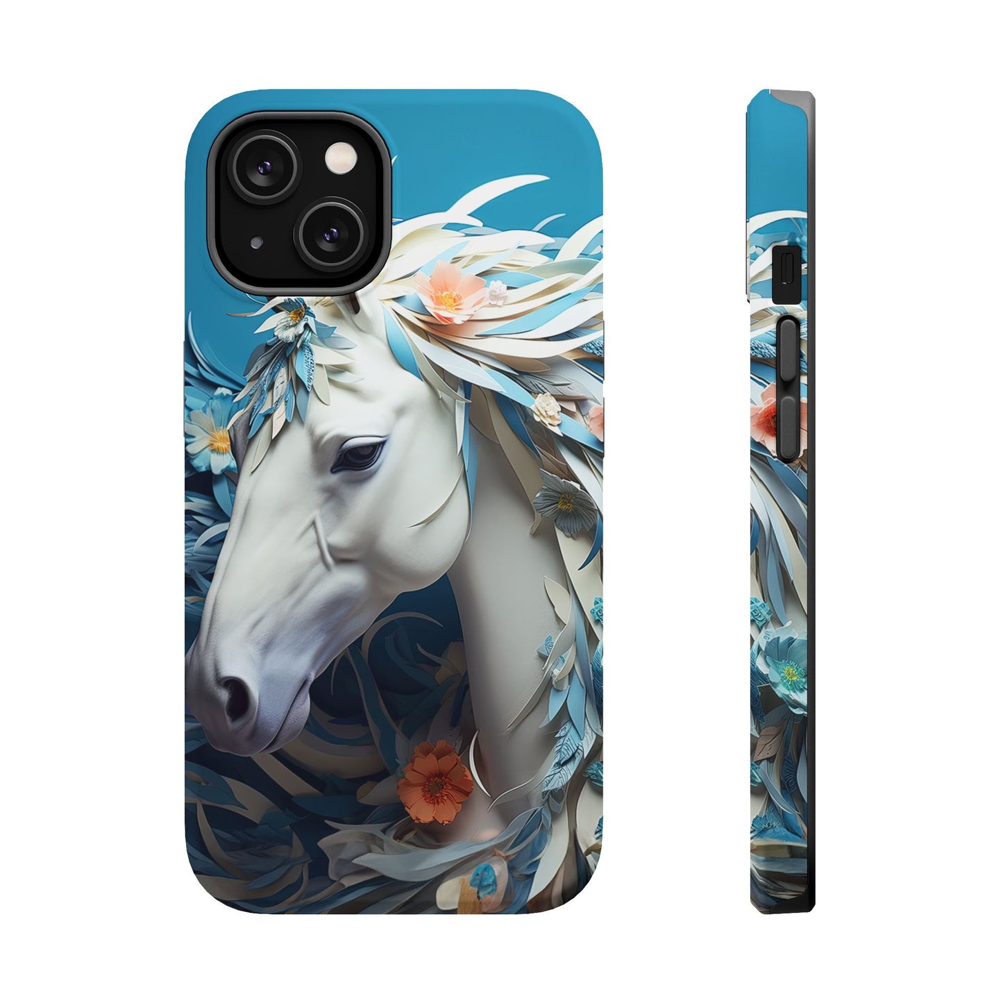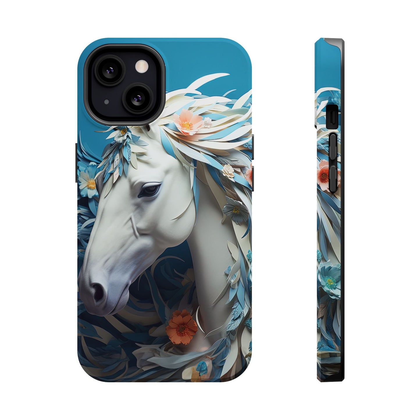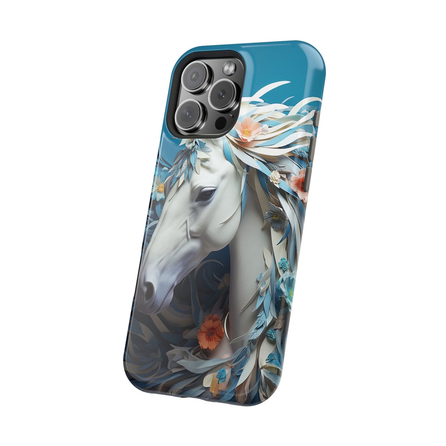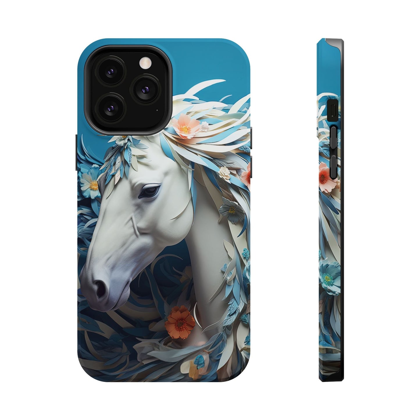 Embrace the beauty of nature with our Floral Horse MagSafe iPhone Case! This enchanting design features a graceful white horse adorned with a vibrant mane of paper flowers, set against a serene blue backdrop. It's a captivating scene that brings a touch of eleganc...