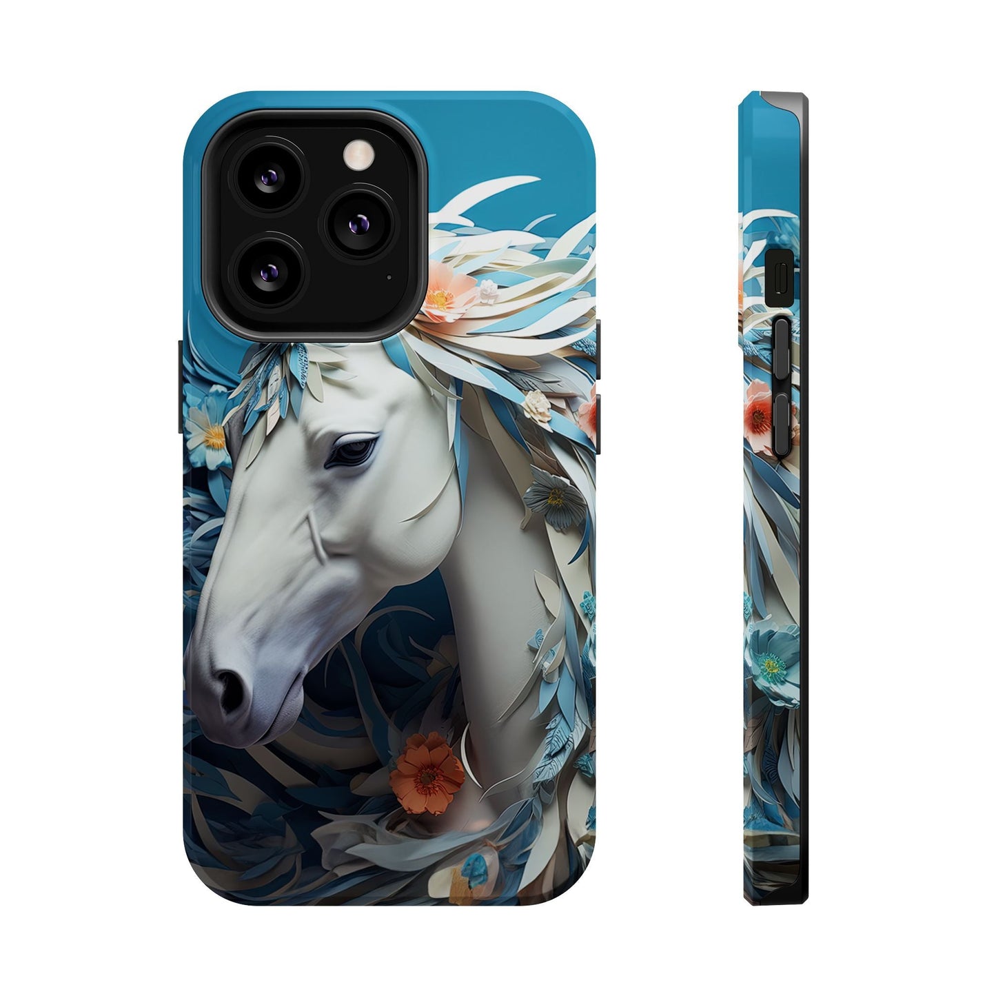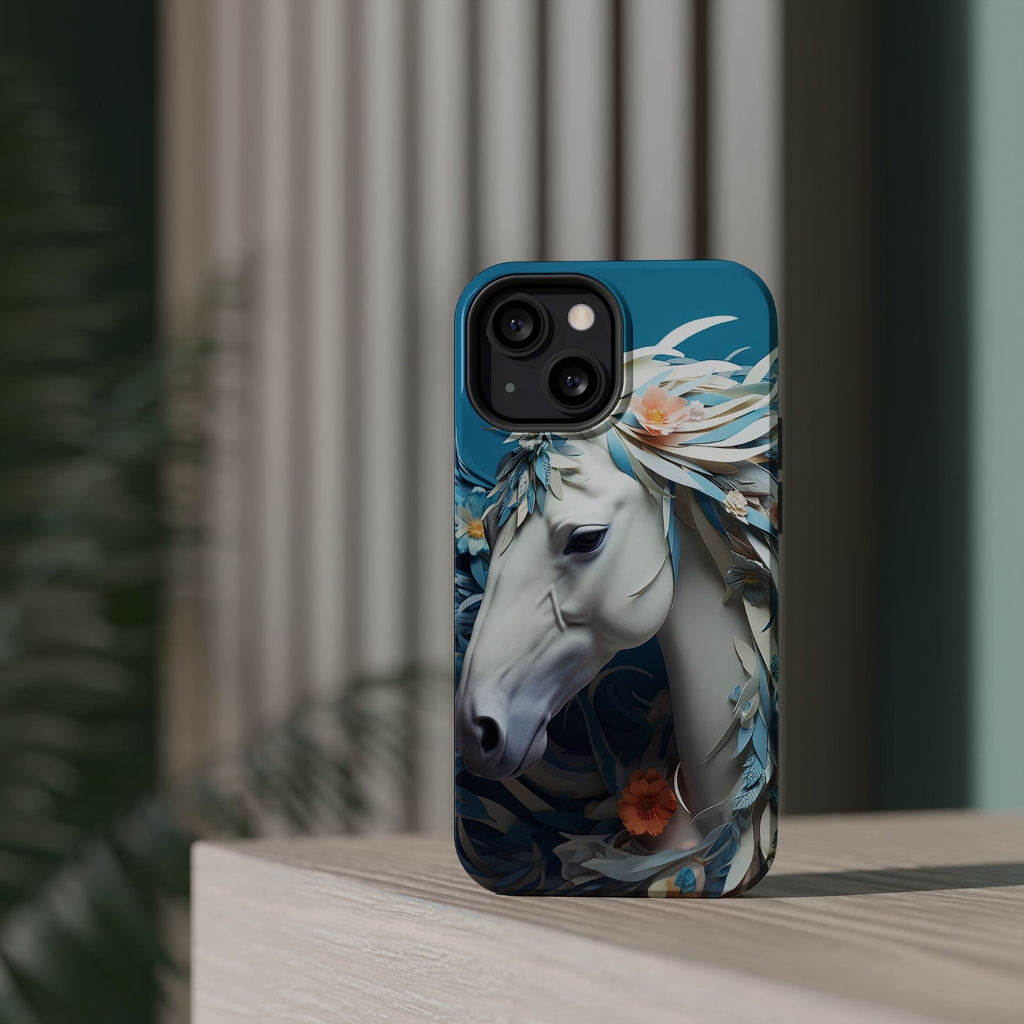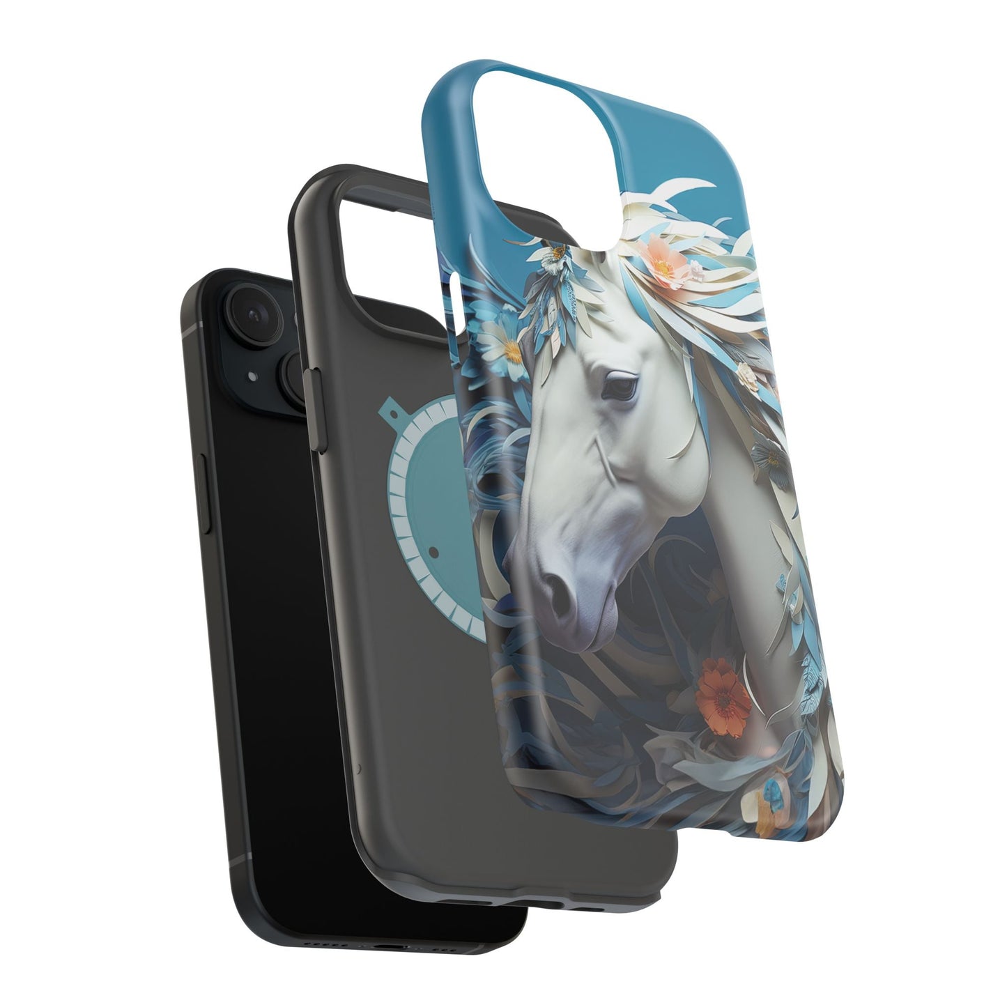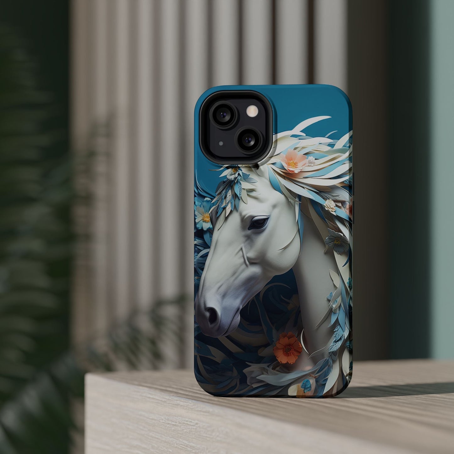 Embrace the beauty of nature with our Floral Horse MagSafe iPhone Case! This enchanting design features a graceful white horse adorned with a vibrant mane of paper flowers, set against a serene blue backdrop. It's a captivating scene that brings a touch of eleganc...