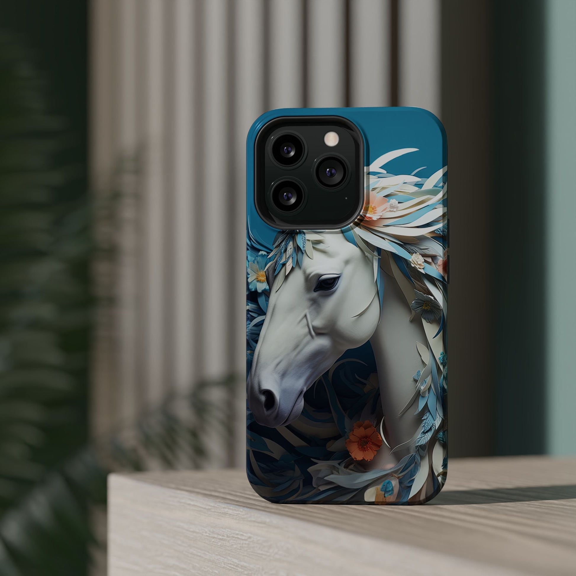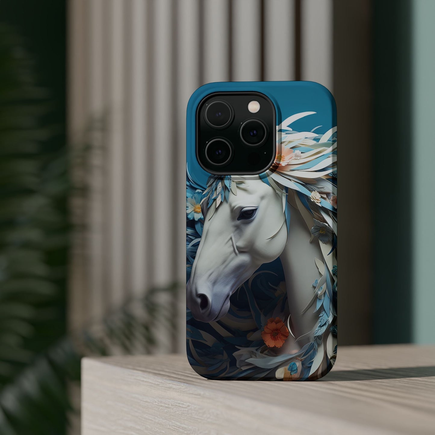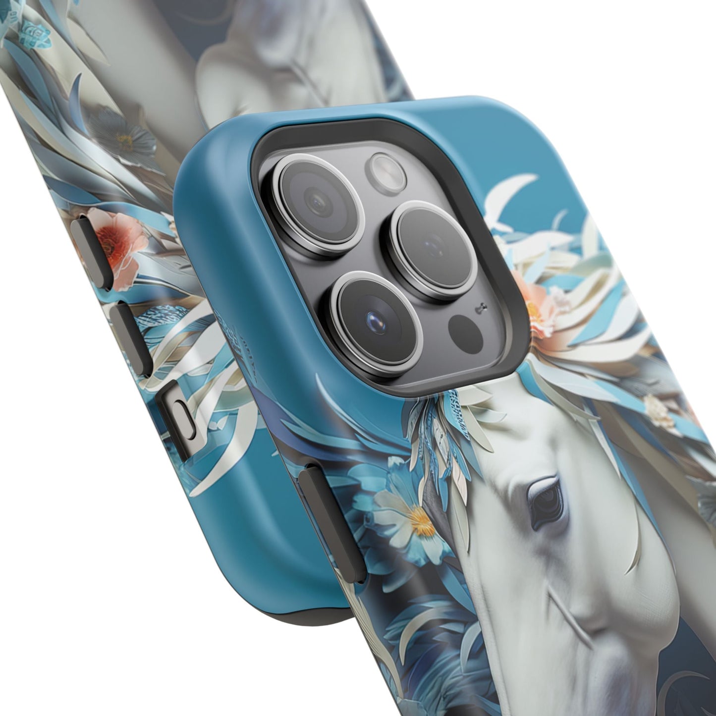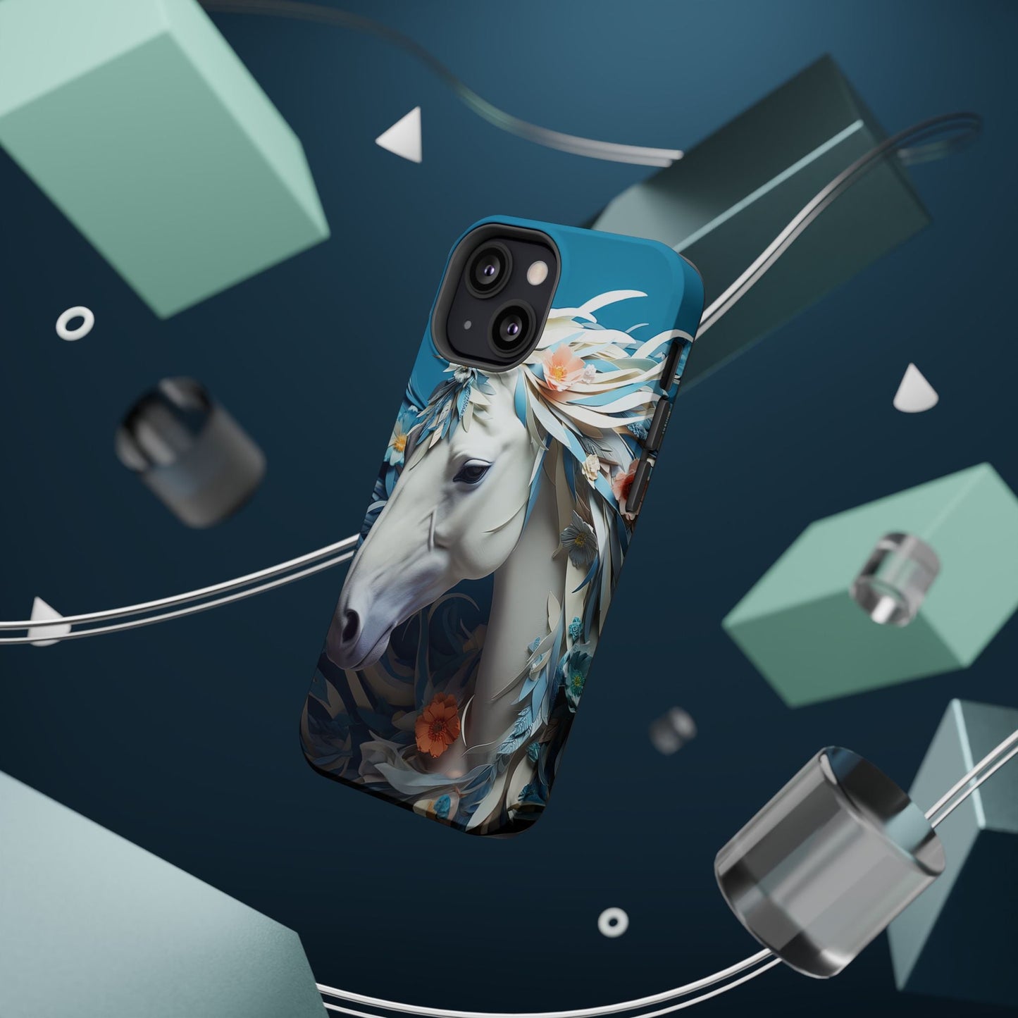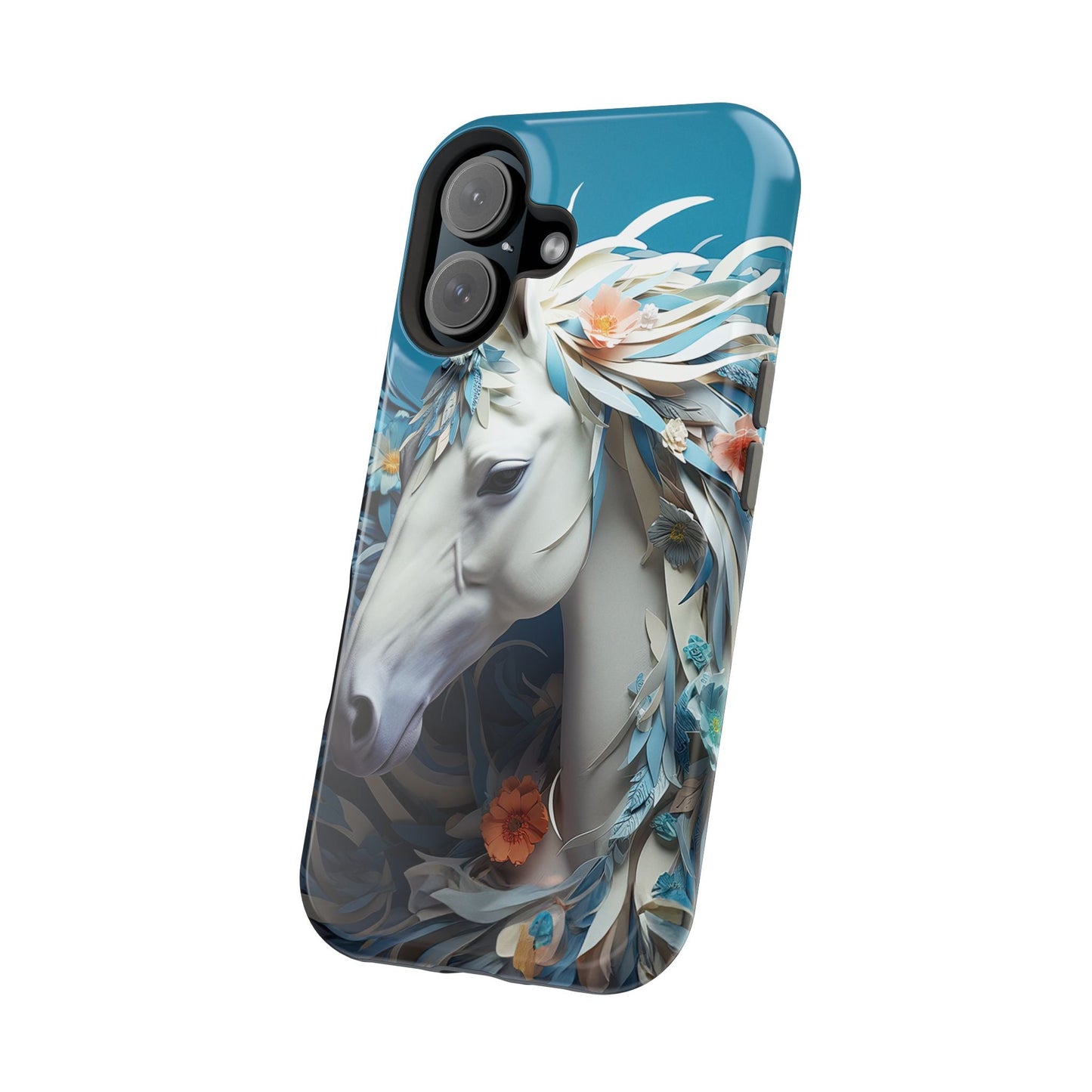 Embrace the beauty of nature with our Floral Horse MagSafe iPhone Case! This enchanting design features a graceful white horse adorned with a vibrant mane of paper flowers, set against a serene blue backdrop. It's a captivating scene that brings a touch of eleganc...