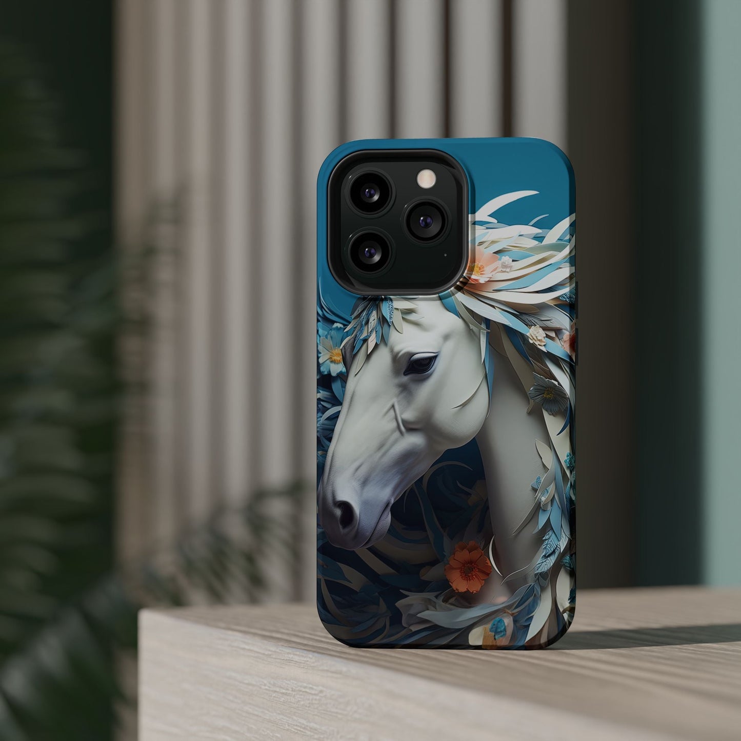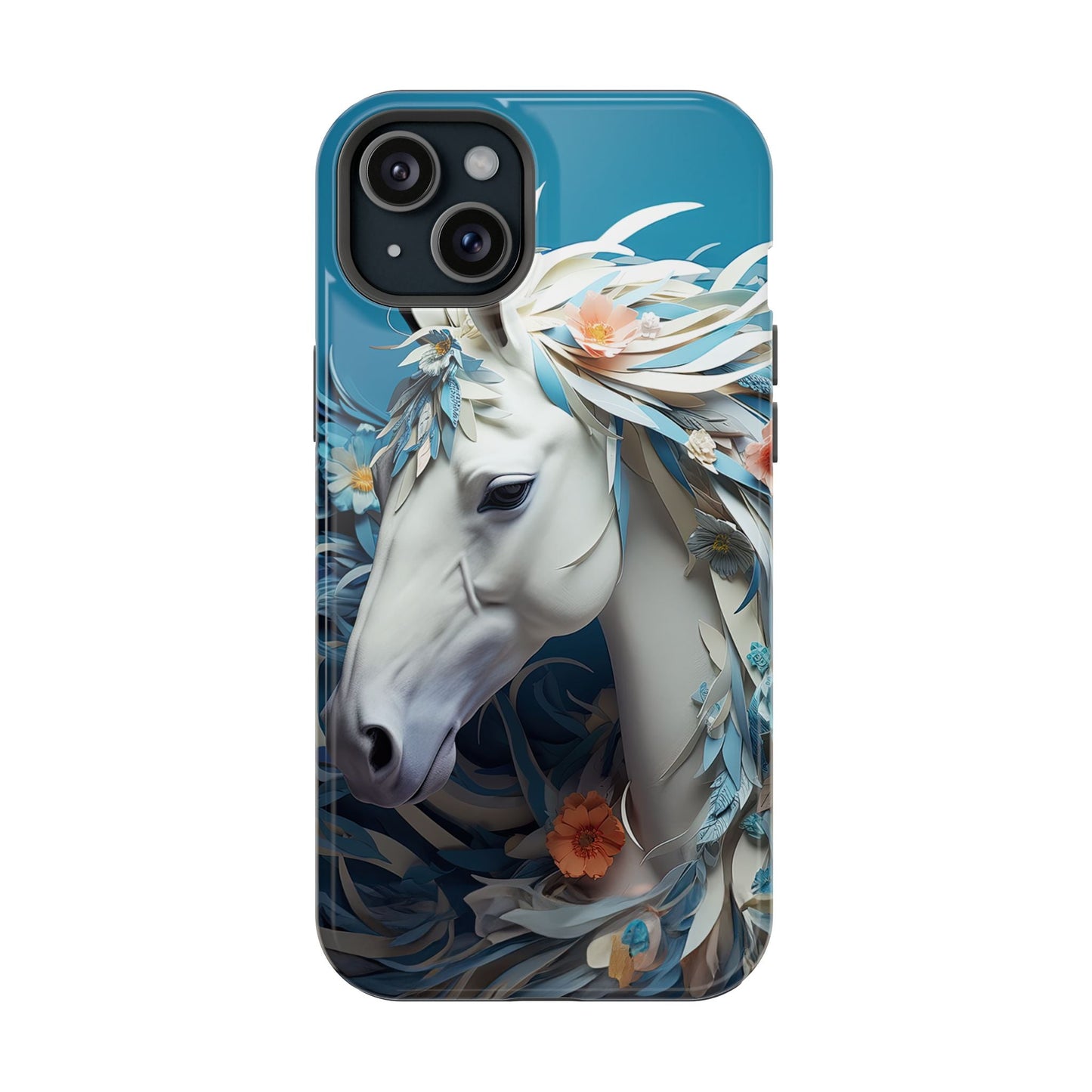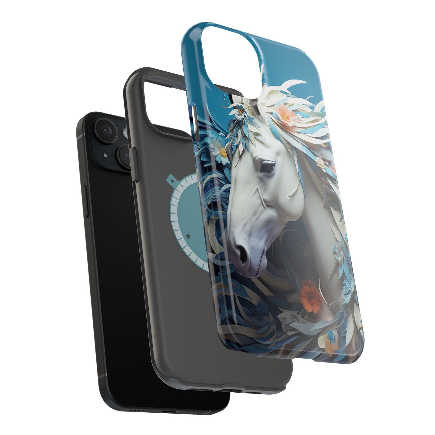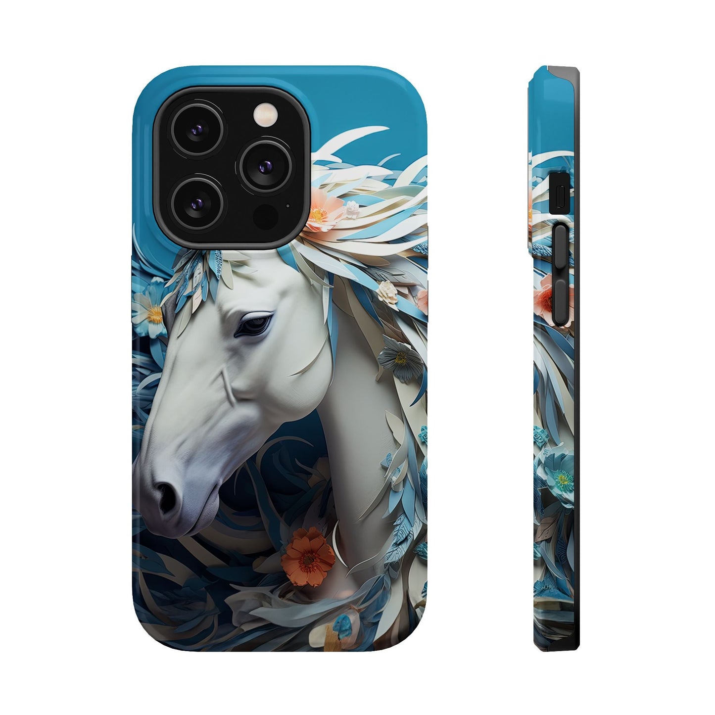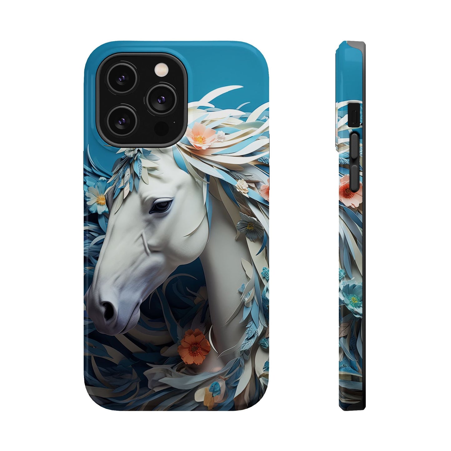 Embrace the beauty of nature with our Floral Horse MagSafe iPhone Case! This enchanting design features a graceful white horse adorned with a vibrant mane of paper flowers, set against a serene blue backdrop. It's a captivating scene that brings a touch of eleganc...