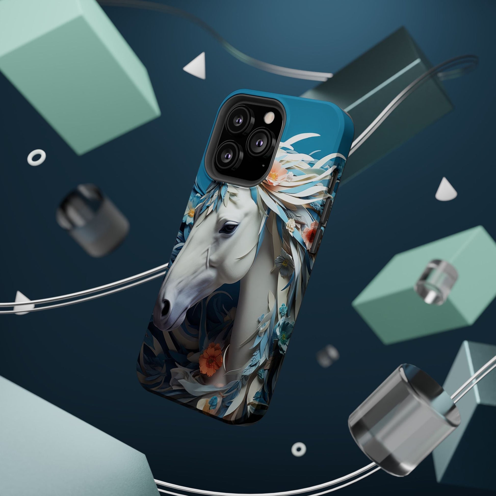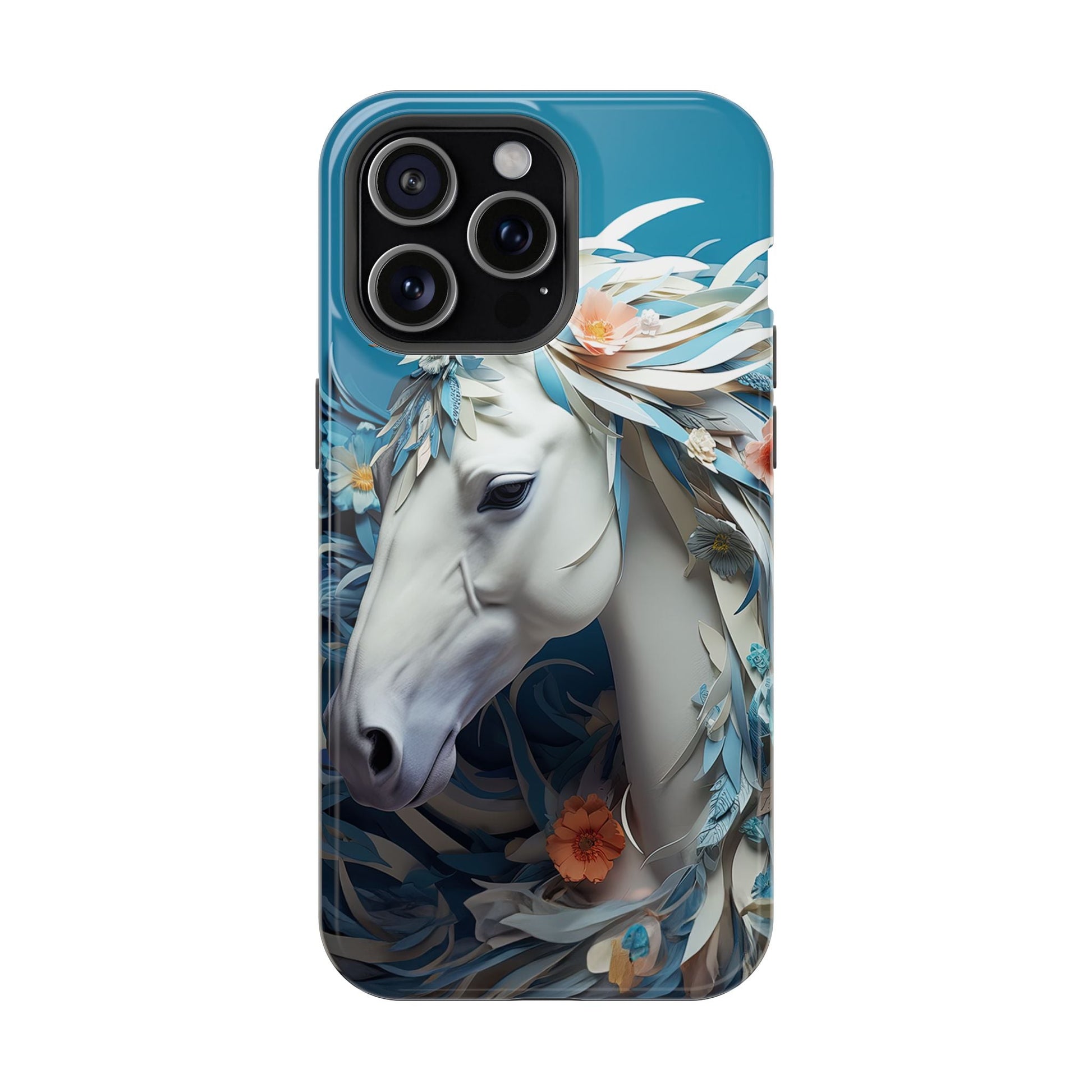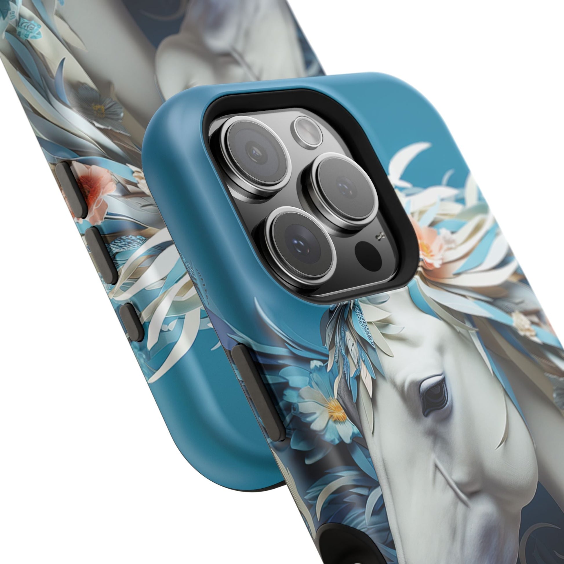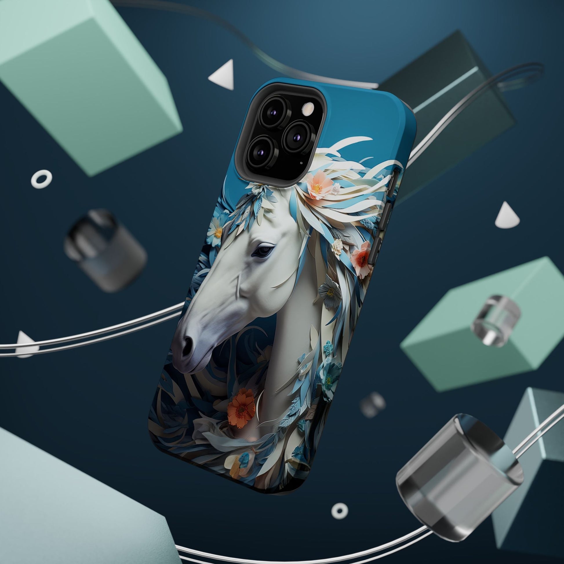 Embrace the beauty of nature with our Floral Horse MagSafe iPhone Case! This enchanting design features a graceful white horse adorned with a vibrant mane of paper flowers, set against a serene blue backdrop. It's a captivating scene that brings a touch of eleganc...
