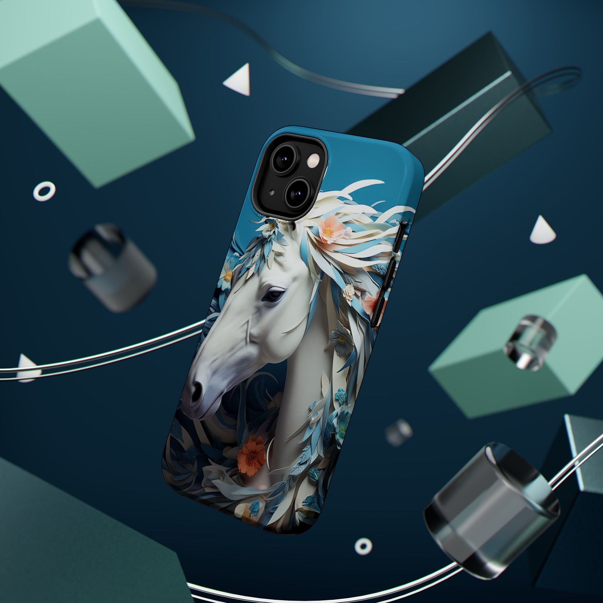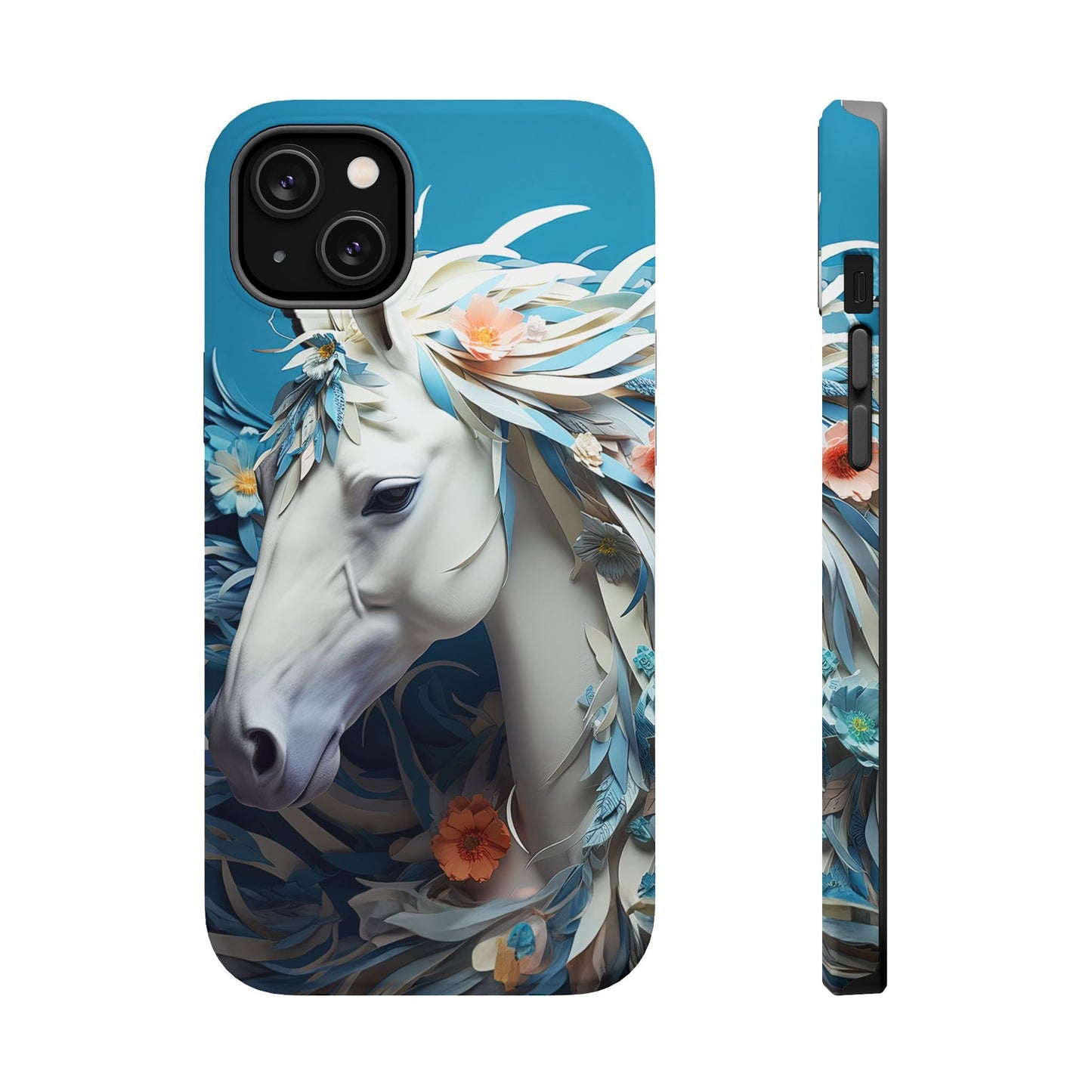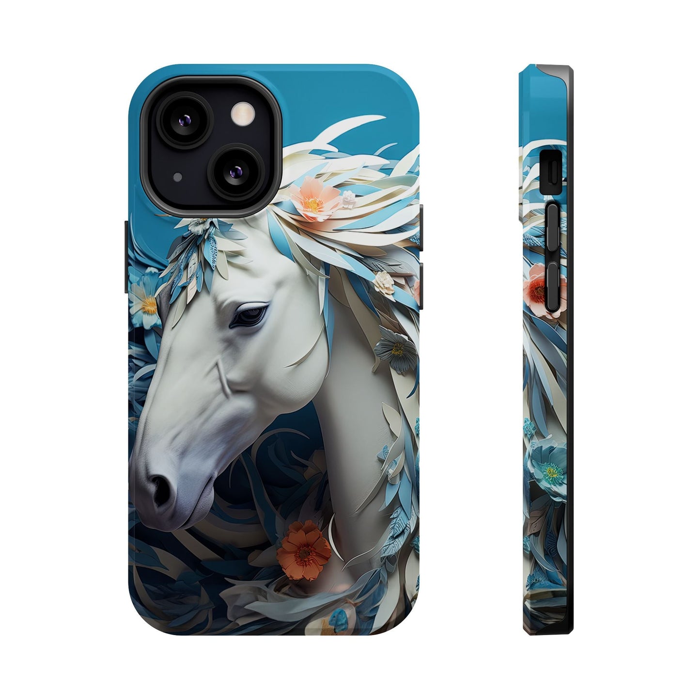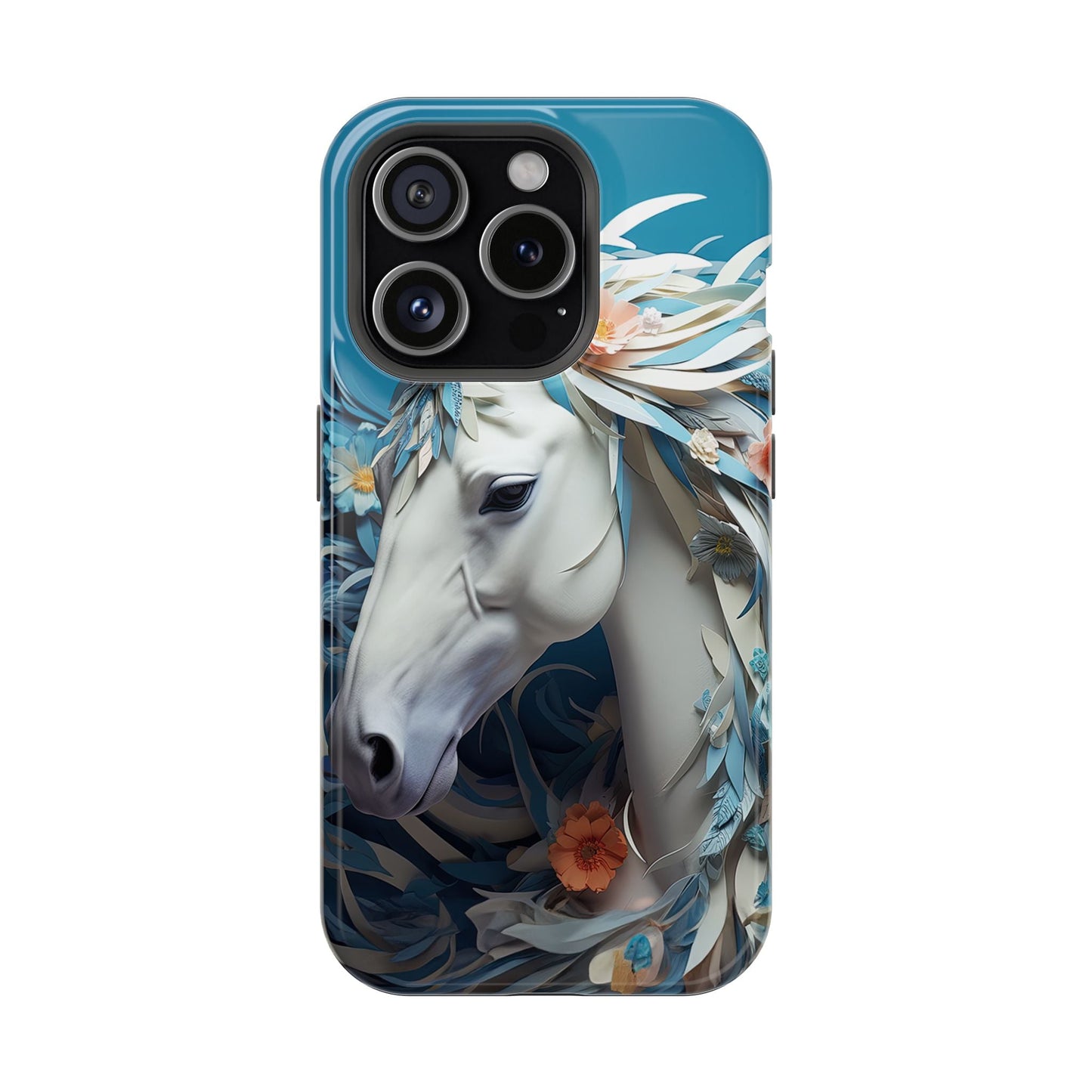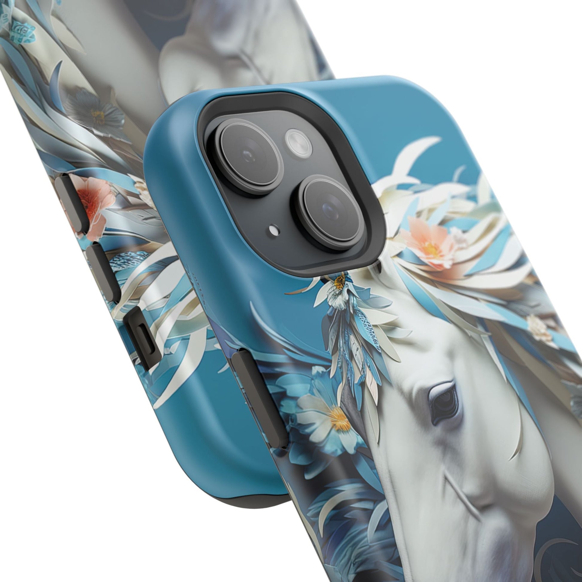 Embrace the beauty of nature with our Floral Horse MagSafe iPhone Case! This enchanting design features a graceful white horse adorned with a vibrant mane of paper flowers, set against a serene blue backdrop. It's a captivating scene that brings a touch of eleganc...