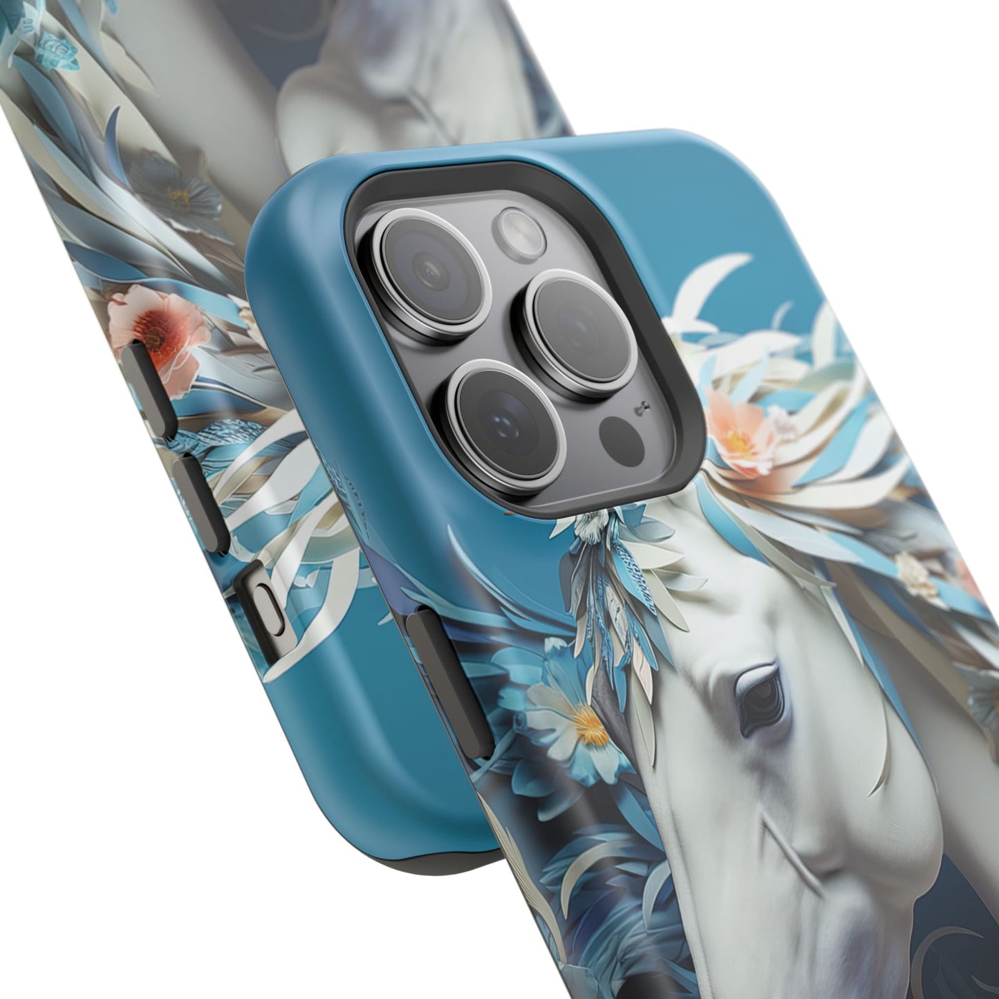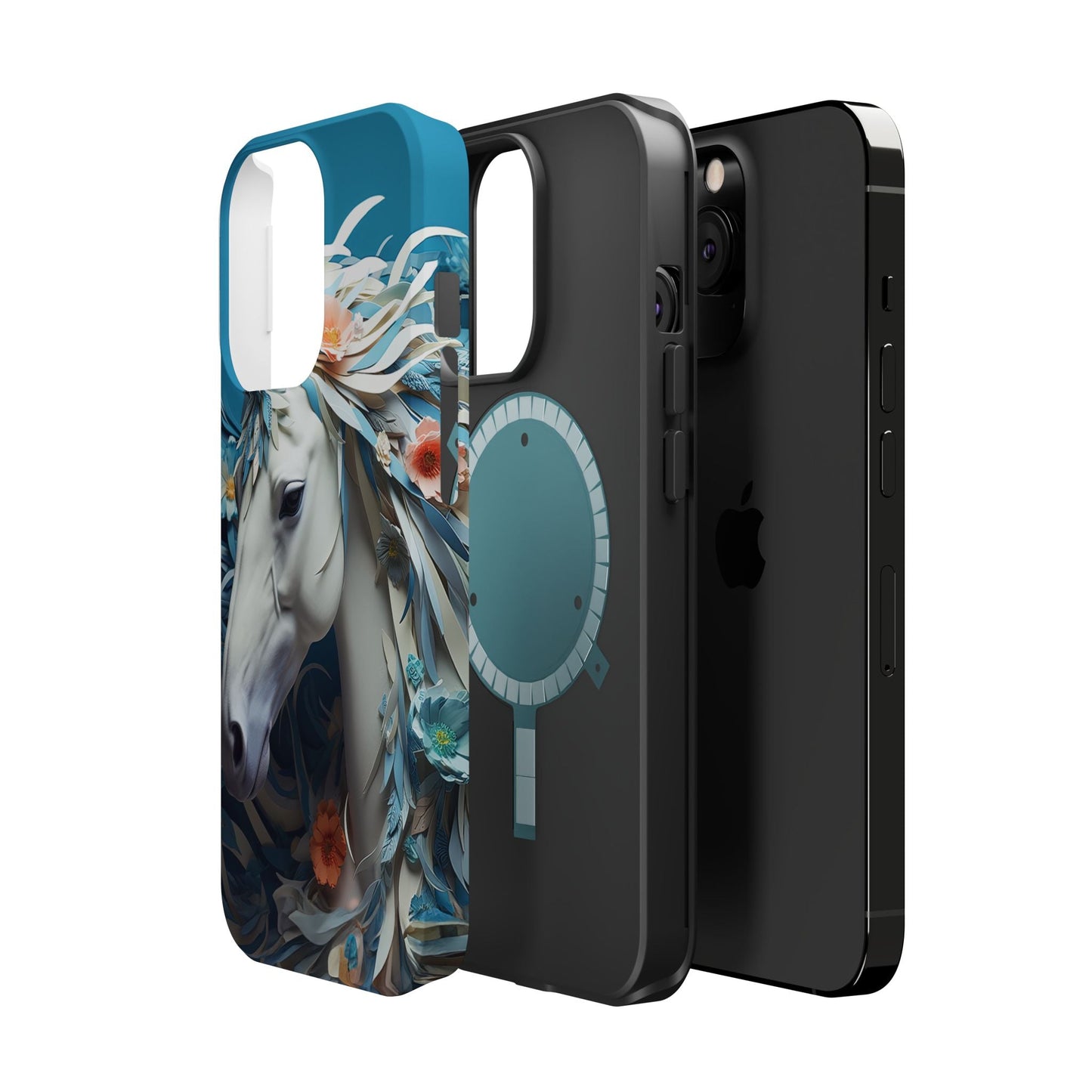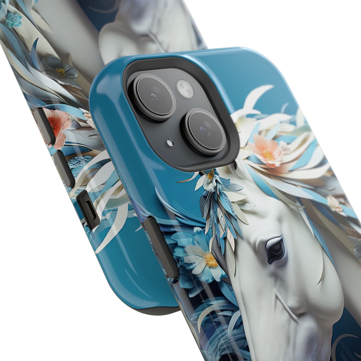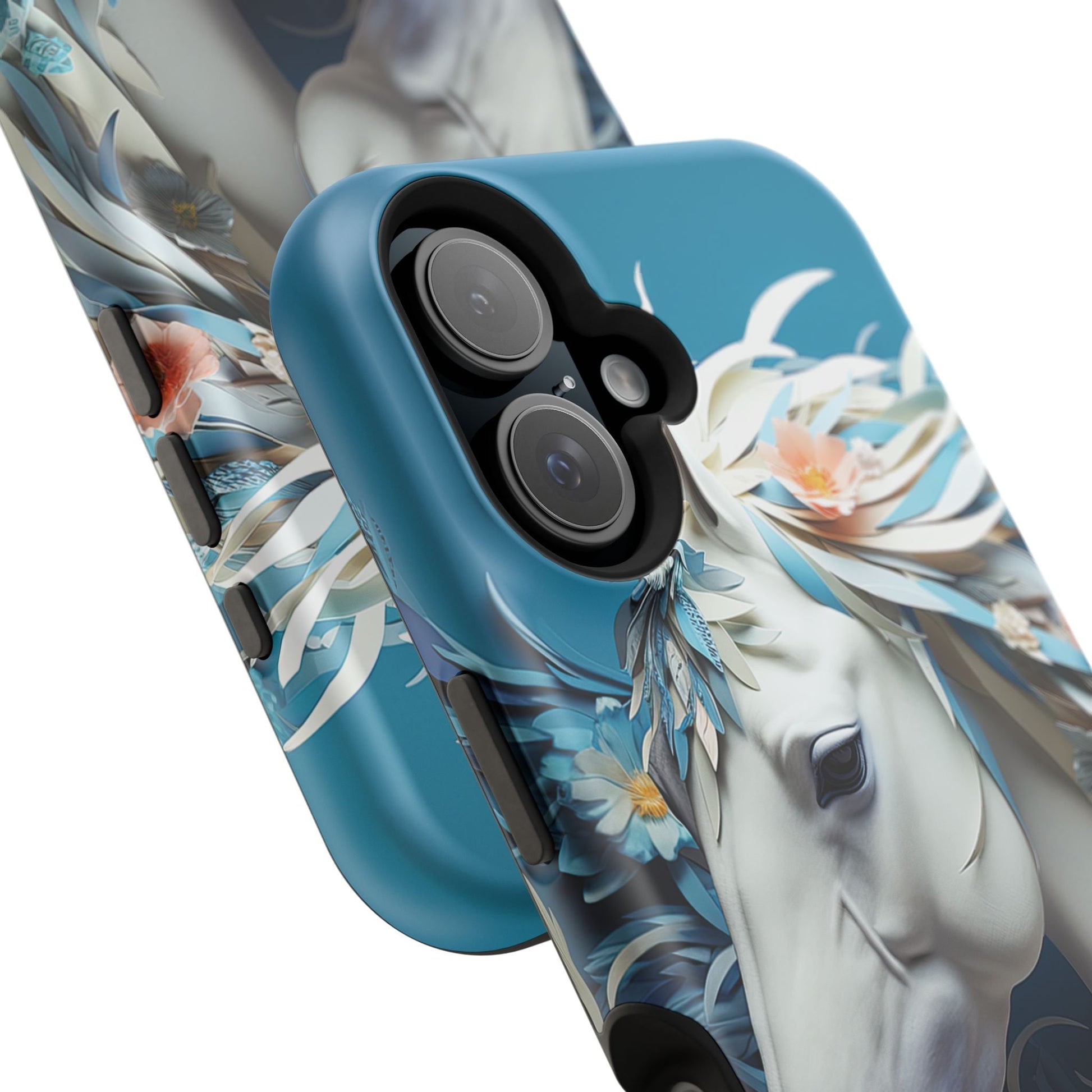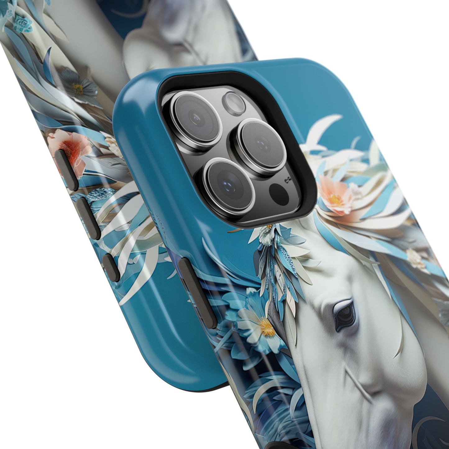 Embrace the beauty of nature with our Floral Horse MagSafe iPhone Case! This enchanting design features a graceful white horse adorned with a vibrant mane of paper flowers, set against a serene blue backdrop. It's a captivating scene that brings a touch of eleganc...