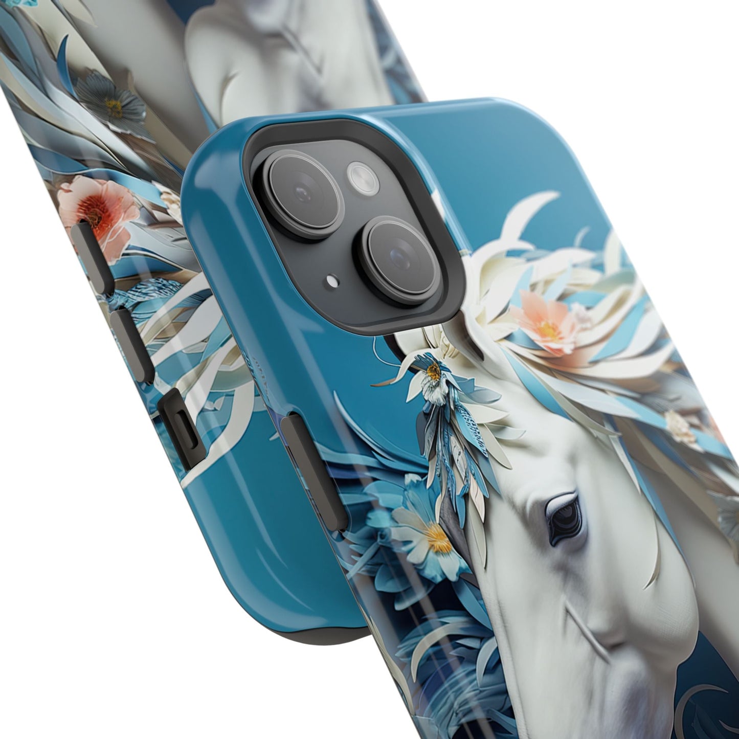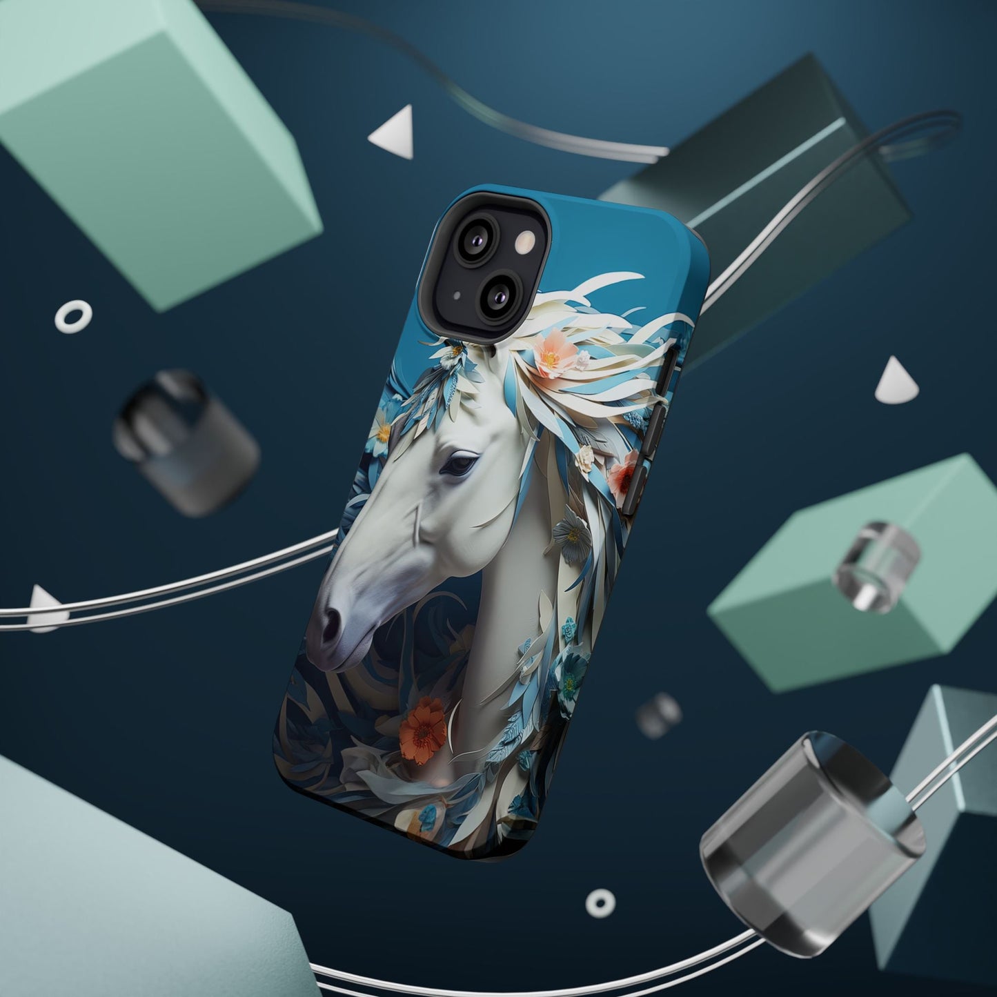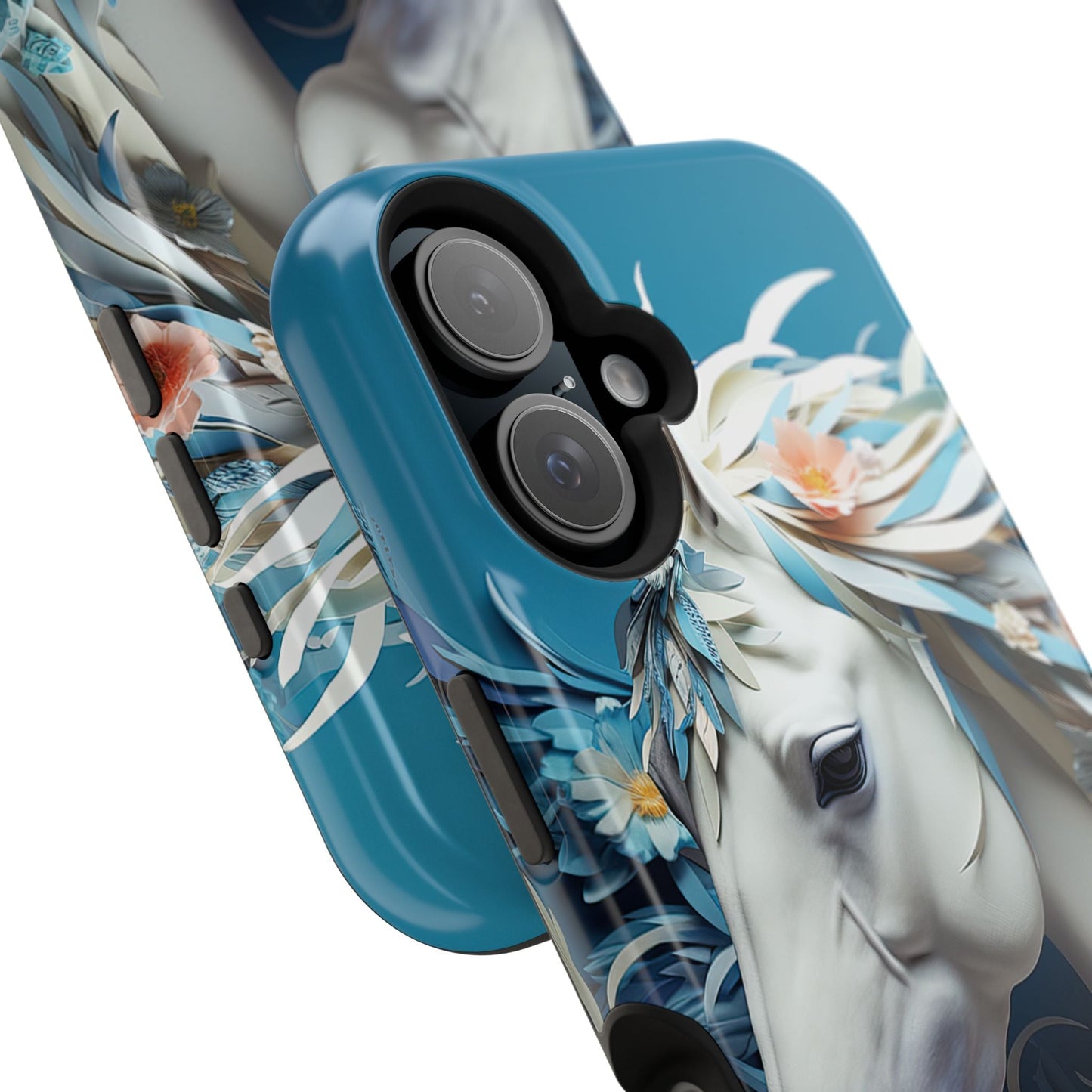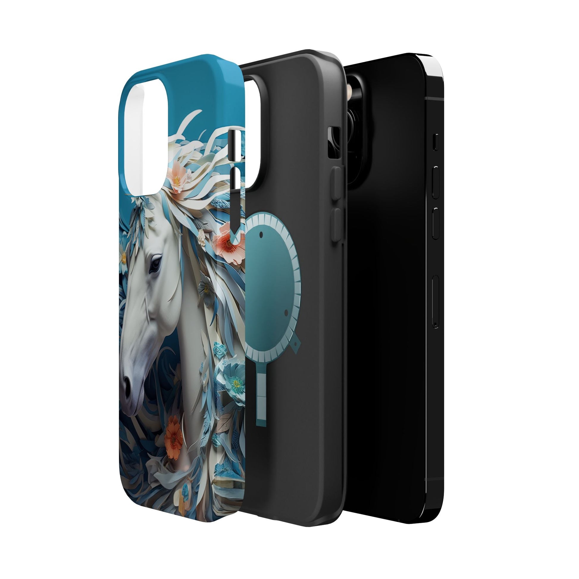 Embrace the beauty of nature with our Floral Horse MagSafe iPhone Case! This enchanting design features a graceful white horse adorned with a vibrant mane of paper flowers, set against a serene blue backdrop. It's a captivating scene that brings a touch of eleganc...